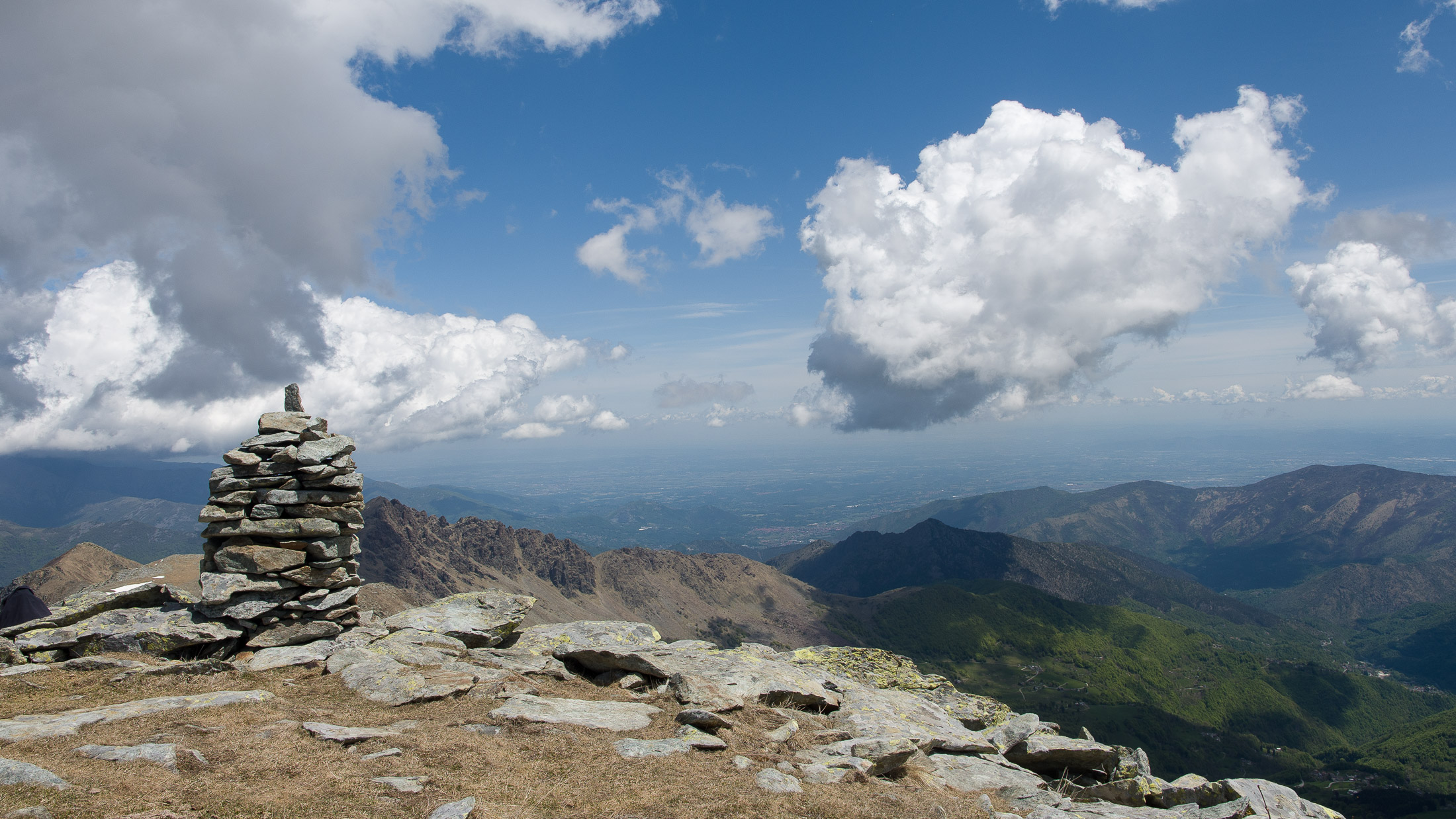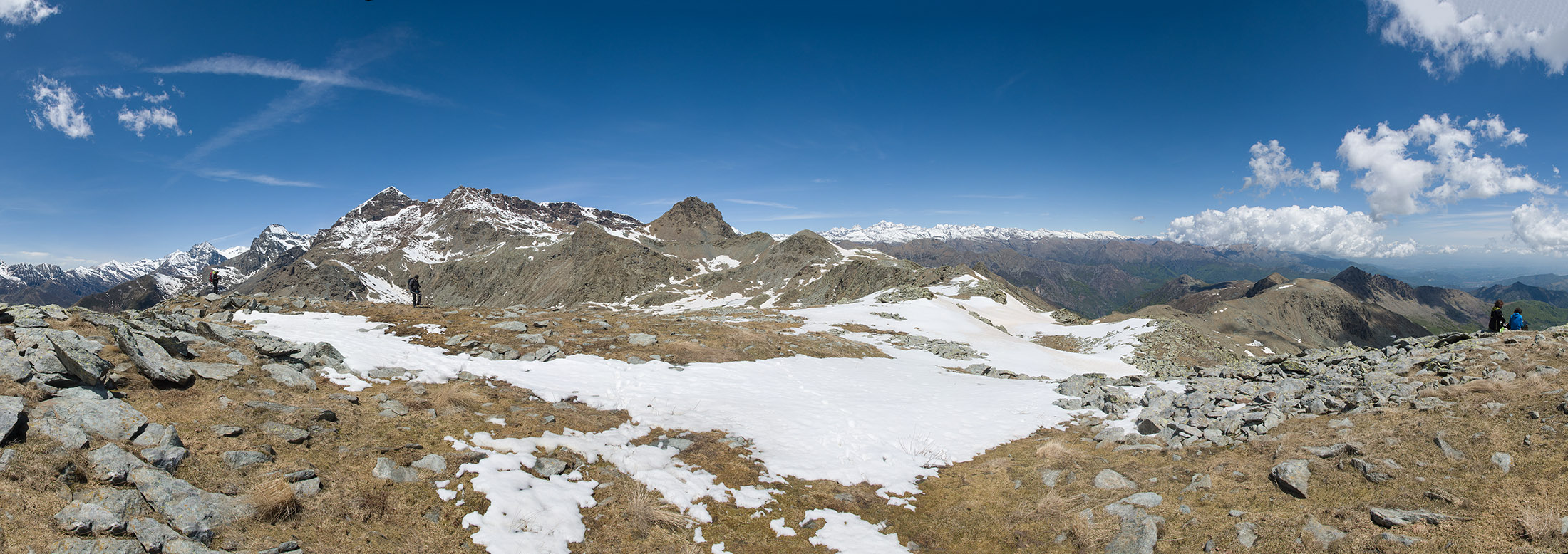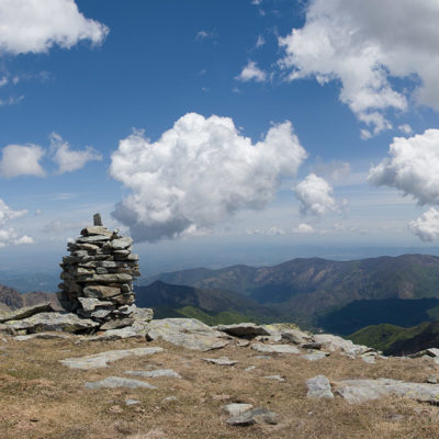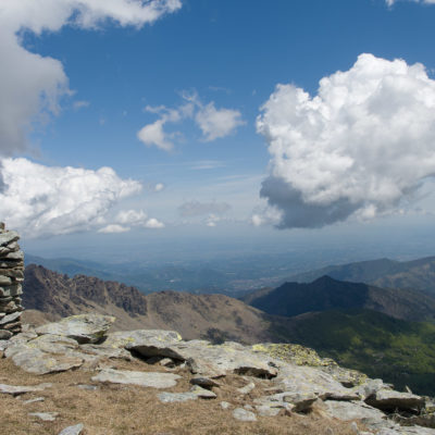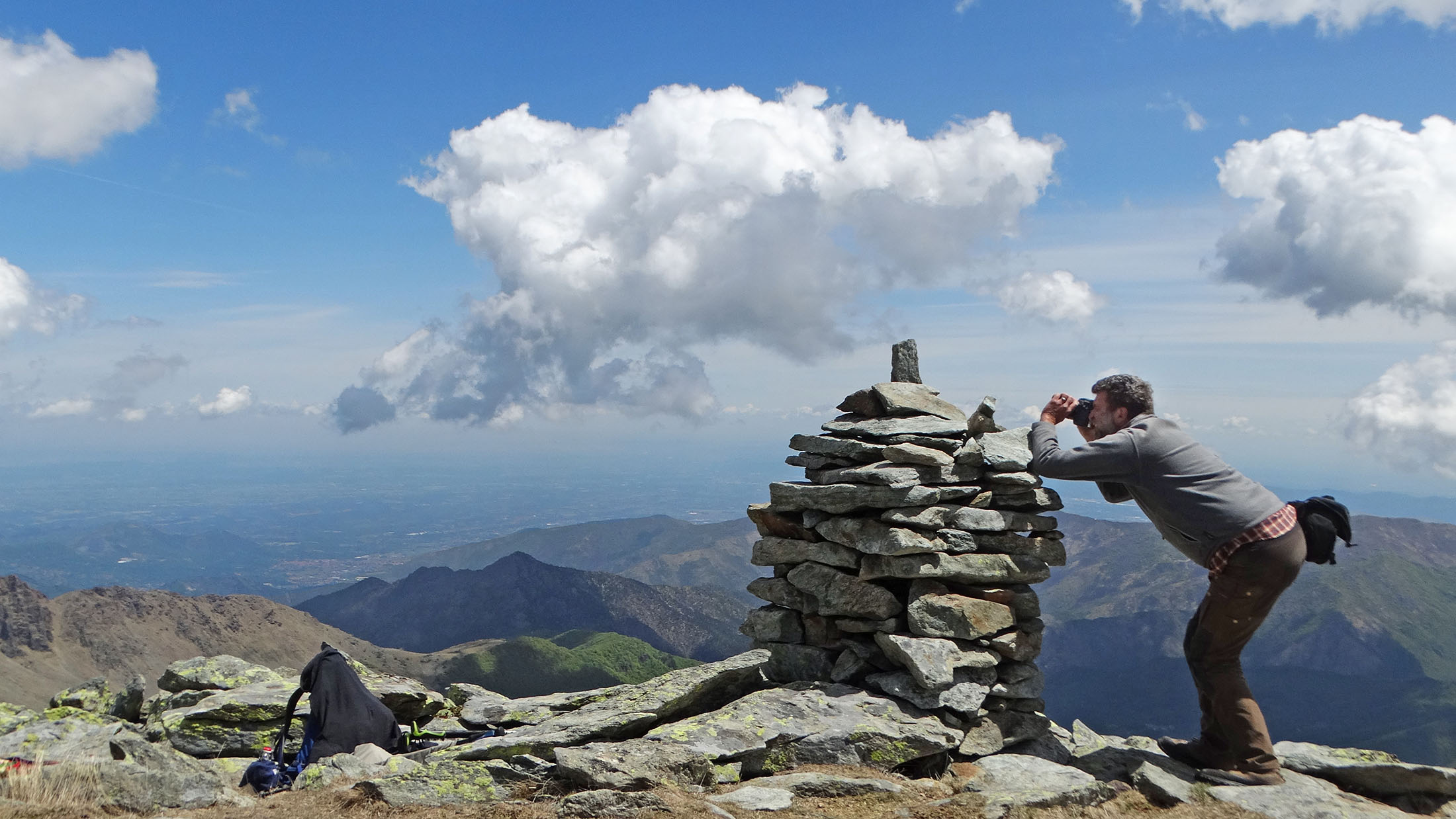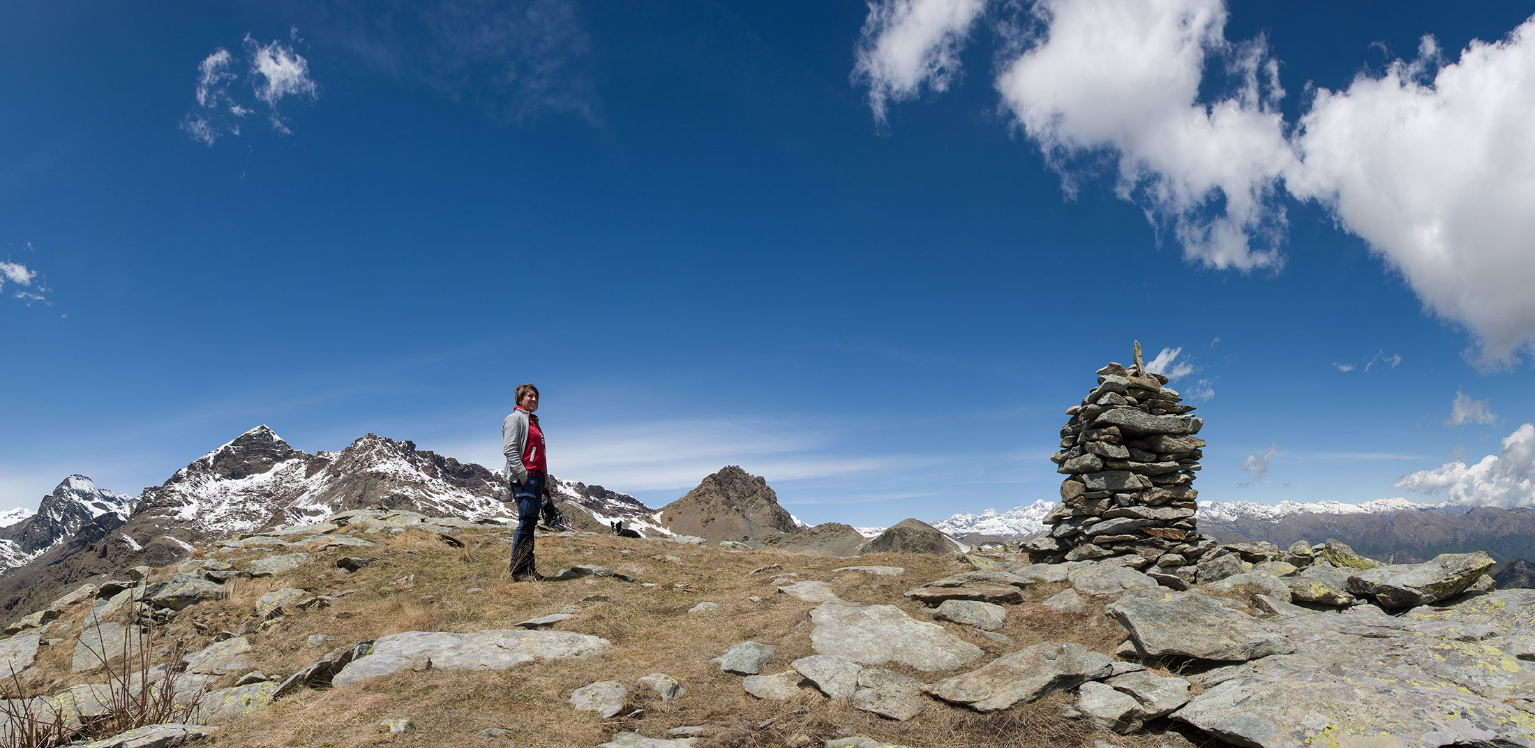 Die Wanderung beginnt zunächst gemütlich. Unterhalb der Hütten der Alpe Bianca (1420 m) folgt man den rot-weissen Markierungen und wandert zunächst über Wiesen und Weiden, nach wenigen Minuten mündet der Weg in eine unbefestigte und für den öffentlichen Verkehr gesperrte Alpstrasse, der man nun in der nächsten Stunde folgt. Nach einer Weile verlässt man den breiten Fahrweg und geht Richtung Westen auf einem deutlichen Pfad ein baumloses Hochtälchen hinauf, am Wegesrand ein kleiner namenloser See. Nach einer weiteren Stunde kommt man zum herrlich gelegenen Lago Vailet (2065 m), der zu einer gemütlichen Rast einlädt. Vom See steigt man in Kürze zum nahen Passo Vailet (2113 m), ein kaum begangener Übergang zwischen dem Vallone dei Tornetti und dem westlich gelegenen Vallone d‘Ovarda. Vom Passo Vailet geht es nun in weiteren 45 Minuten über den Südgrat des bereits weithin sichtbaren Gipfels auf steiler werdendem Pfad stramm bergauf. Auf den letzten Metern führt der Weg durch ein Geröllfeld, schliesslich erreicht man den grossen Steinmann auf dem weitläufigen Gipfelplateau des Ciarm del Prete (2389 m). Das Panorama ist umfassend und spektakulär, im Süden grüsst der Monviso (3841 m), im Westen die Berge des Valle di Viù, die dominierendsten sind die charakteristische Pyramide des Rocciamelone (3538 m), der Monte Lera (3358 m) und die markante Felsgestalt des Torre d‘Ovarda (3069 m). Im Norden zeigt sich bei klarer Sicht das Gran Paradiso-Massiv (4061 m) mit all seinen Trabanten, im Nordosten die Monte Rosa-Gruppe (4634 m), Richtung Osten blickt man bis in die piemontesische Tiefebene.