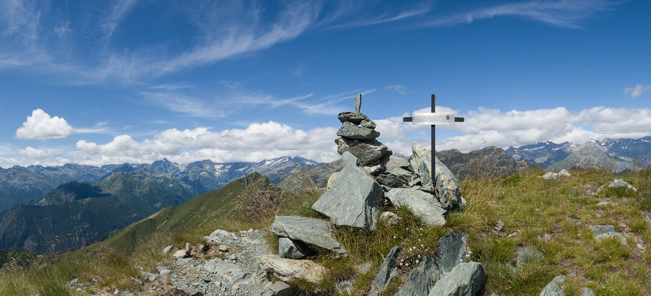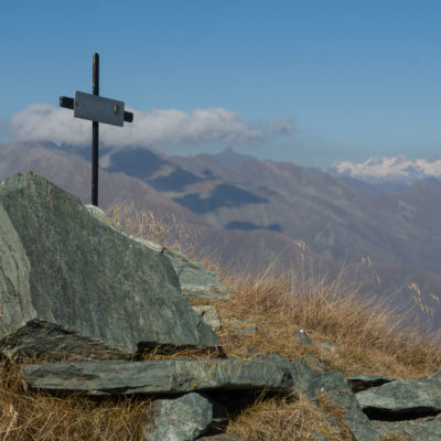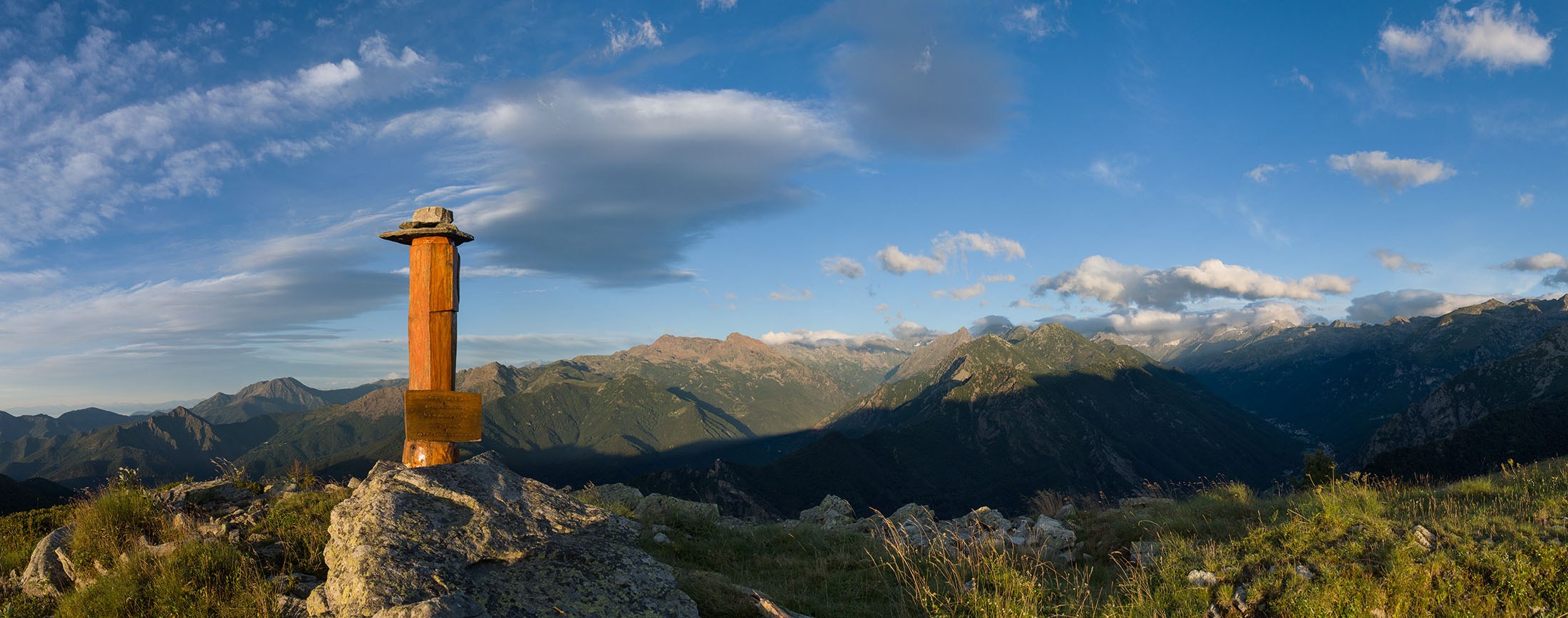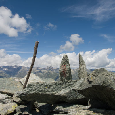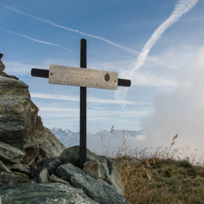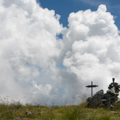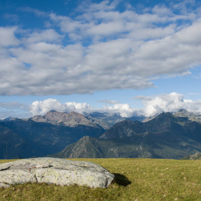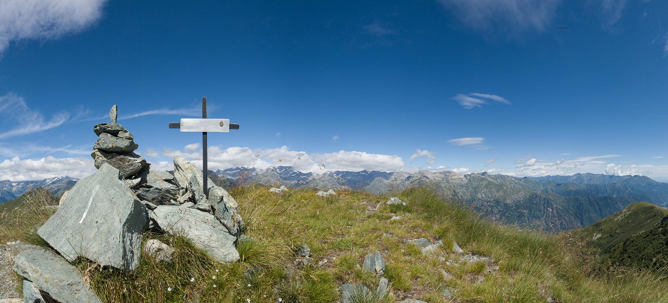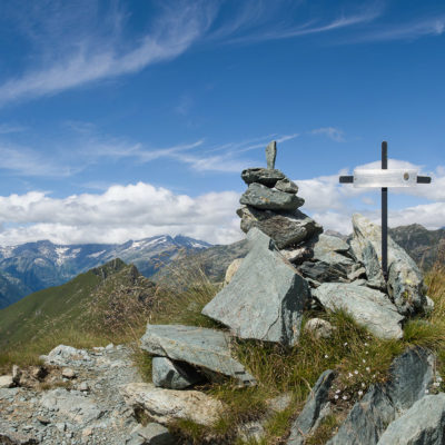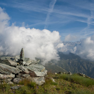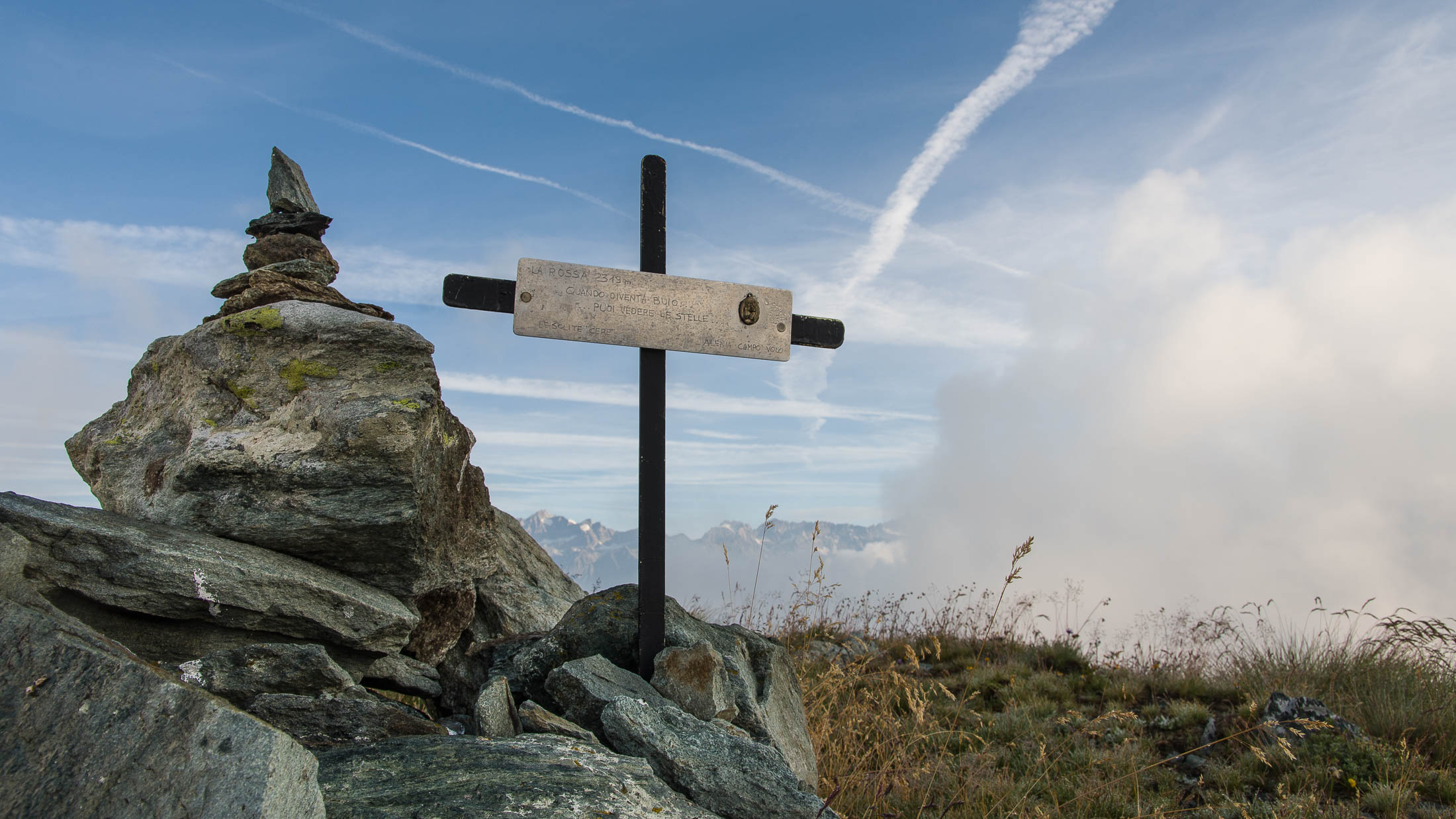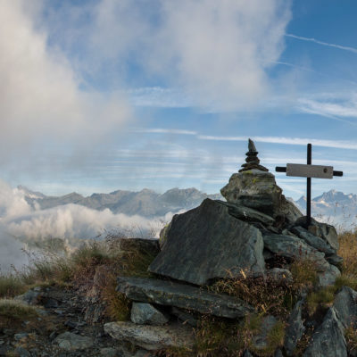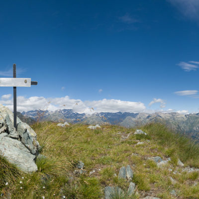 Vom Lago di Monastero sind es nur wenige Schritte bis zur im Sommer bewirtschafteten Alpe di Coassolo (2026 m). Der verbleibende Aufstieg zur Cima La Rossa ist nicht markiert und mehr oder weniger weglos, aber völlig unschwierig, hier und da helfen vereinzelte Steinmännchen bei der Orientierung. Bei dem hier im Sommer oft vorkommenden Nebel sollte man allerdings aufpassen, dass man den Weg nicht verliert. Bei der Alpe di Coassolo verlässt man die Alpstrasse und steigt einfach über die Weiden auf einen nordwestlich gelegenen grasigen Geländerücken, dort trifft man auf einen Viehsteig, der irgendwann ostwärts abknickt. Die spärliche Pfadspur führt zu einer kleinen Verebnungsfläche mit einem riesigen Steinmann, von dort weglos und schwitzend durch hohes Gras weiter bis zu einem von weitem erkennbaren Holzpflock am Ostgrat des Berges, von dort in wenigen Schritten hinauf zum Gipfelkreuz der Cima La Rossa (2319 m). Hier liegt einem die Welt zu Füssen, Johann Wolfgang von Goethe dichtete einst: „Berge sind stille Meister und machen schweigsame Schüler“. Poetisch ist auch das Panorama von hier oben. Im Norden zeigt sich der Gran Paradiso (4061 m) mit all seinen Trabanten, östlich davon der Monte Rosa (4634 m), das zweithöchste Bergmassiv der Alpen, im Westen die Gruppe der Levanne (3619 m) und viele andere namhafte Erhebungen der Valli di Lanzo. Im Osten verliert sich Po-Ebene im immerwährenden Dunst, im Süden grüsst der Monviso (3841 m), bei klarer Sicht blickt man bis in die Seealpen. Auf dem kleinen Gipfelkreuz steht geschrieben: „Quando diventa buio, puoi vedere le stelle – wenn es dunkel wird, kannst du die Sterne sehen“. Dem gibt es nichts hinzuzufügen.