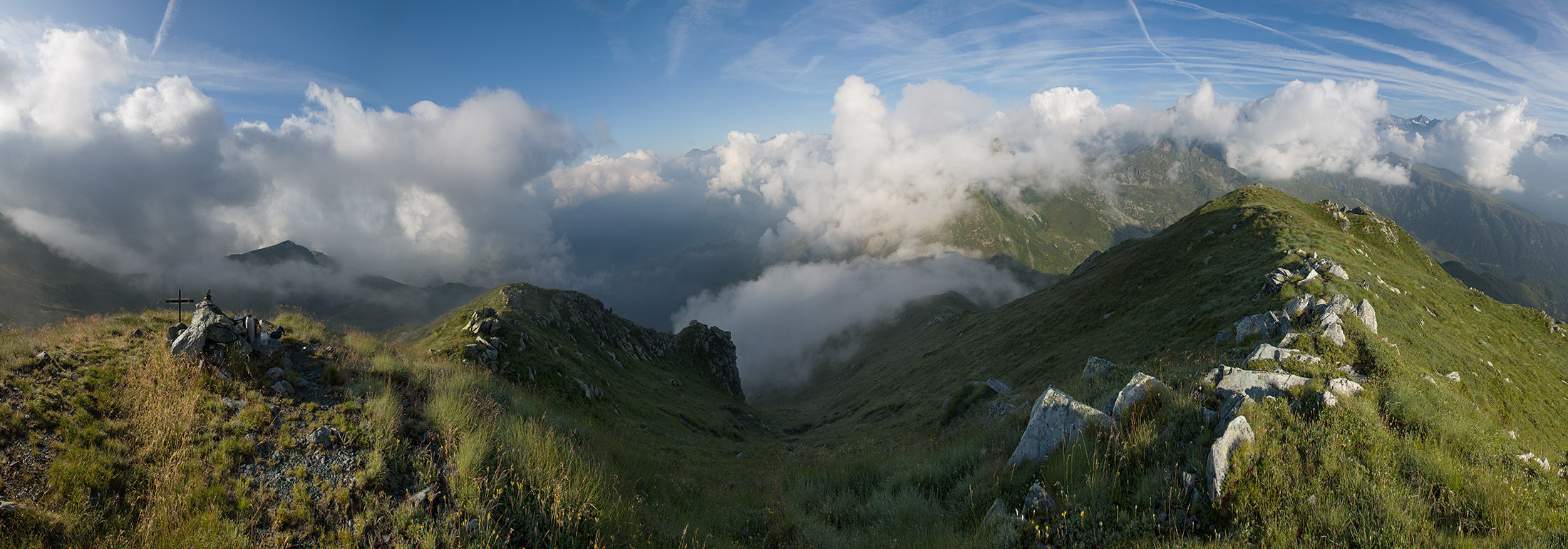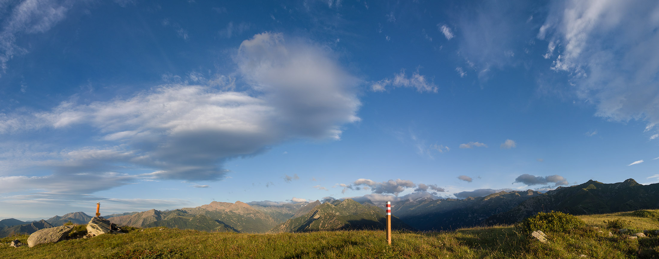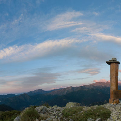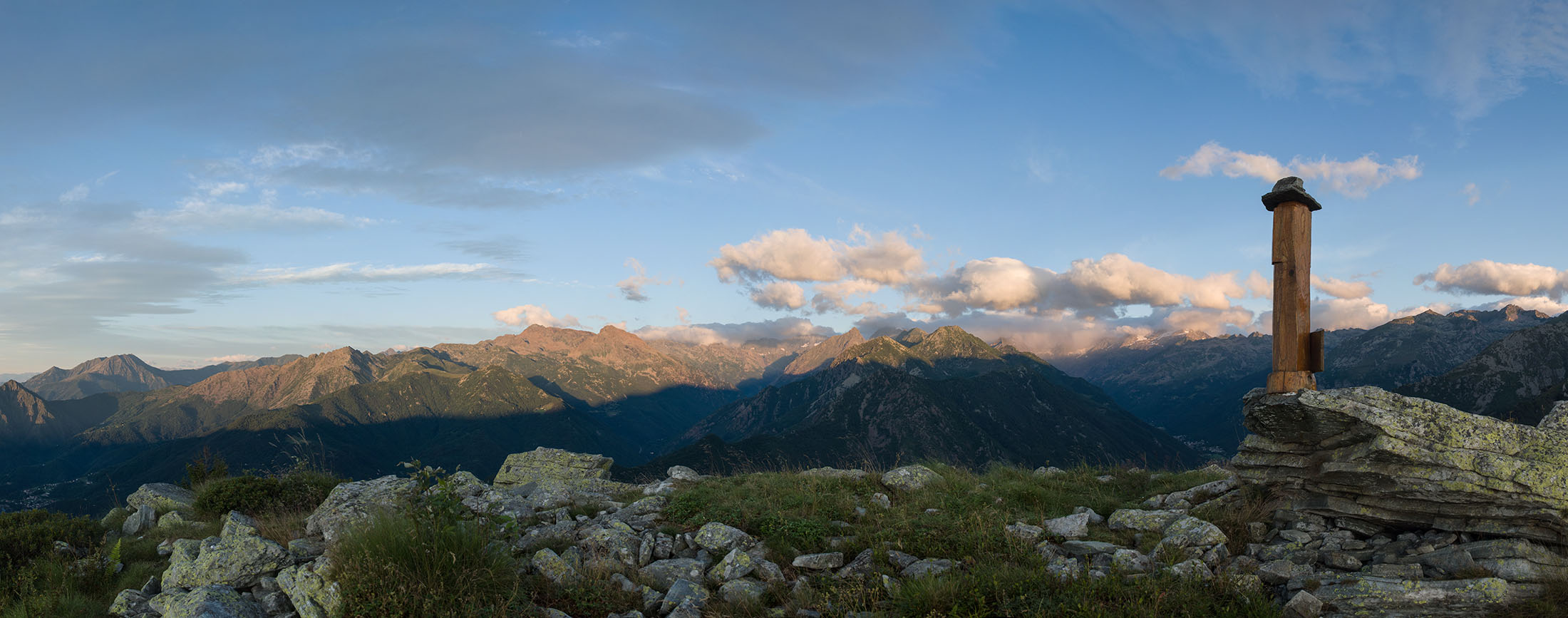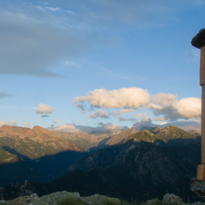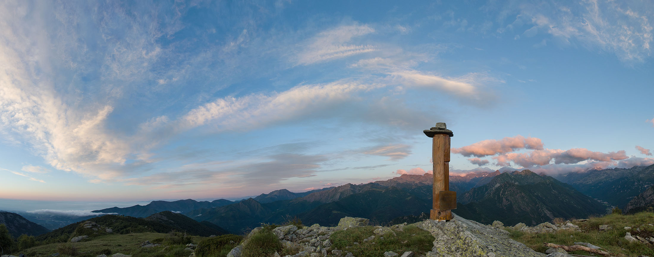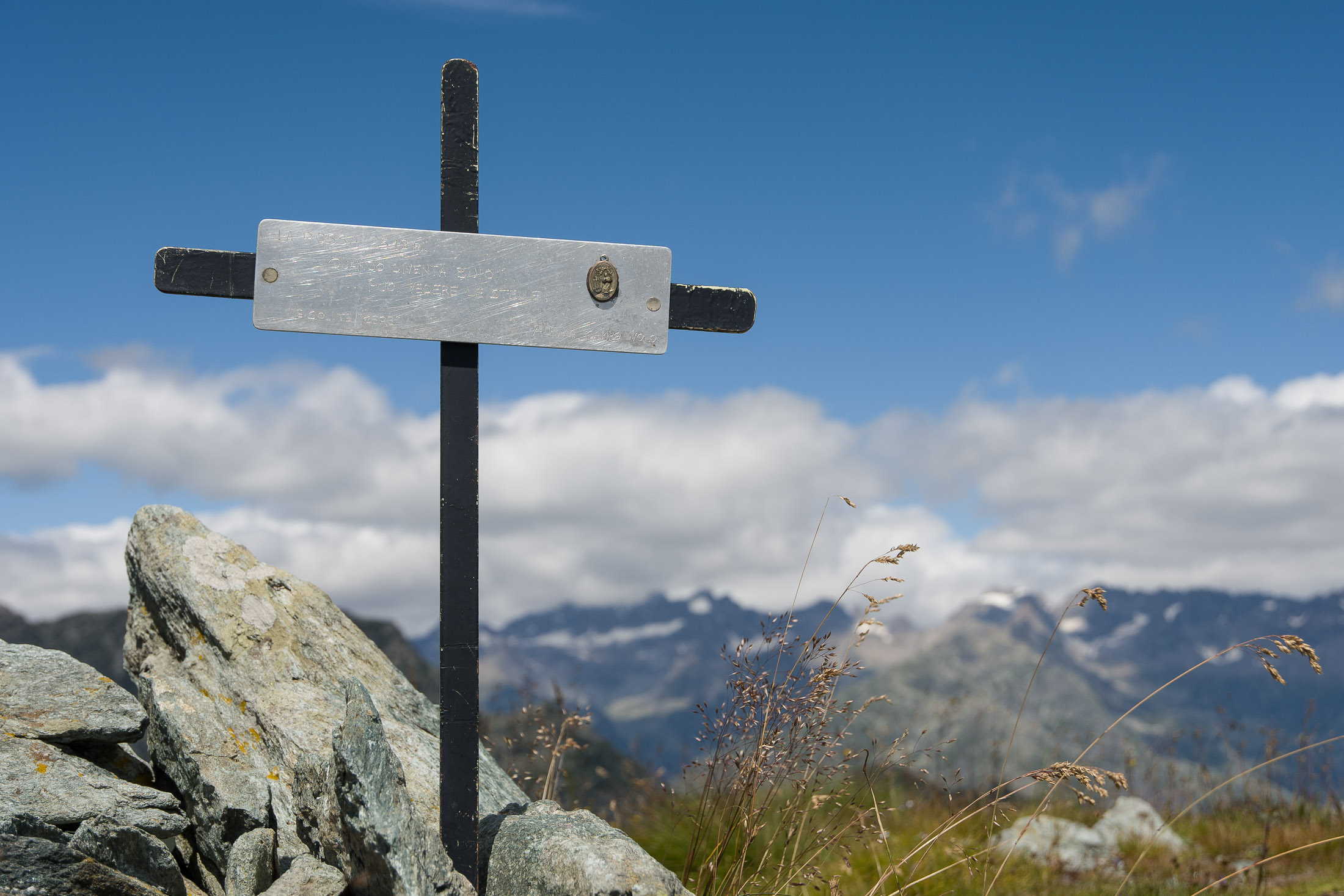 Vom Lago di Monastero sind es nur wenige Schritte bis zur im Sommer bewirtschafteten Alpe di Coassolo (2026 m). Der verbleibende Aufstieg zur Cima La Rossa ist nicht markiert und mehr oder weniger weglos, aber völlig unschwierig, hier und da helfen vereinzelte Steinmännchen bei der Orientierung. Bei dem hier im Sommer oft vorkommenden Nebel sollte man allerdings aufpassen, dass man den Weg nicht verliert. Bei der Alpe di Coassolo verlässt man die Alpstrasse und steigt einfach über die Weiden auf einen nordwestlich gelegenen grasigen Geländerücken, dort trifft man auf einen Viehsteig, der irgendwann ostwärts abknickt. Die spärliche Pfadspur führt zu einer kleinen Verebnungsfläche mit einem riesigen Steinmann, von dort weglos und schwitzend durch hohes Gras weiter bis zu einem von weitem erkennbaren Holzpflock am Ostgrat des Berges, von dort in wenigen Schritten hinauf zum Gipfelkreuz der Cima La Rossa (2319 m). Hier liegt einem die Welt zu Füssen, Johann Wolfgang von Goethe dichtete einst: „Berge sind stille Meister und machen schweigsame Schüler“. Poetisch ist auch das Panorama von hier oben. Im Norden zeigt sich der Gran Paradiso (4061 m) mit all seinen Trabanten, östlich davon der Monte Rosa (4634 m), das zweithöchste Bergmassiv der Alpen, im Westen die Gruppe der Levanne (3619 m) und viele andere namhafte Erhebungen der Valli di Lanzo. Im Osten verliert sich Po-Ebene im immerwährenden Dunst, im Süden grüsst der Monviso (3841 m), bei klarer Sicht blickt man bis in die Seealpen. Auf dem kleinen Gipfelkreuz steht geschrieben: „Quando diventa buio, puoi vedere le stelle – wenn es dunkel wird, kannst du die Sterne sehen“. Dem gibt es nichts hinzuzufügen.