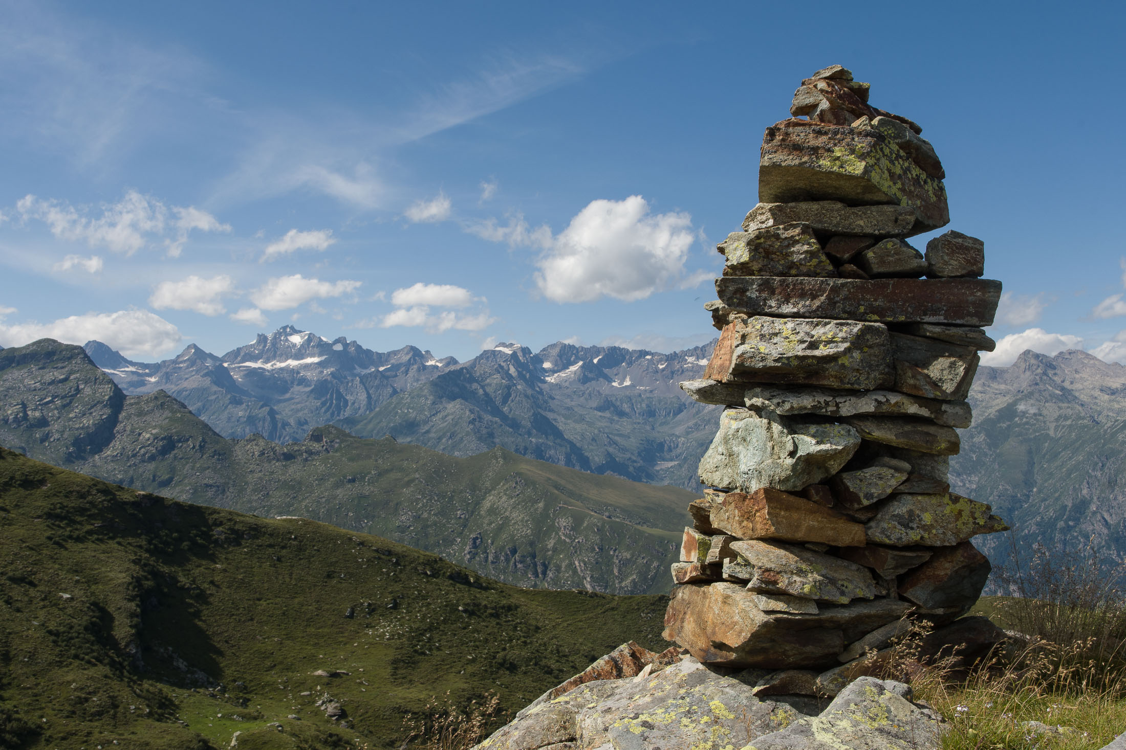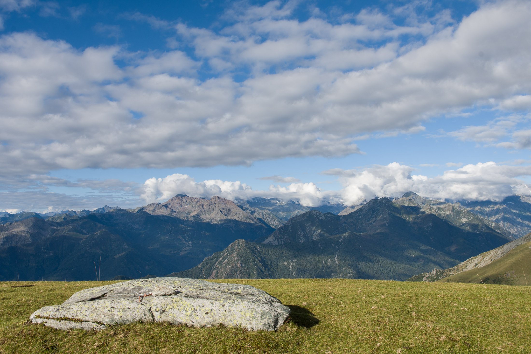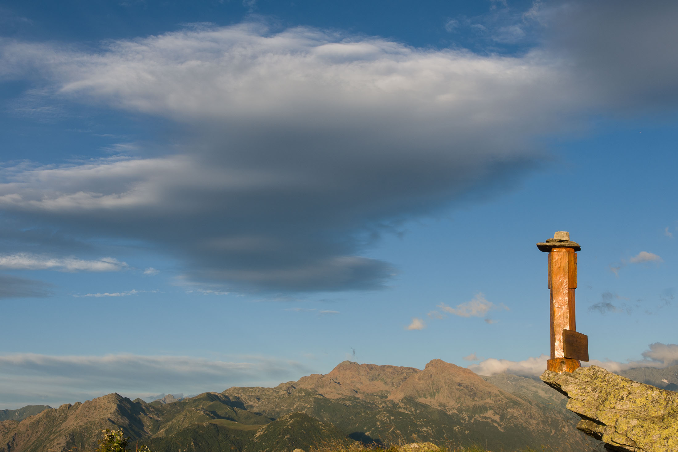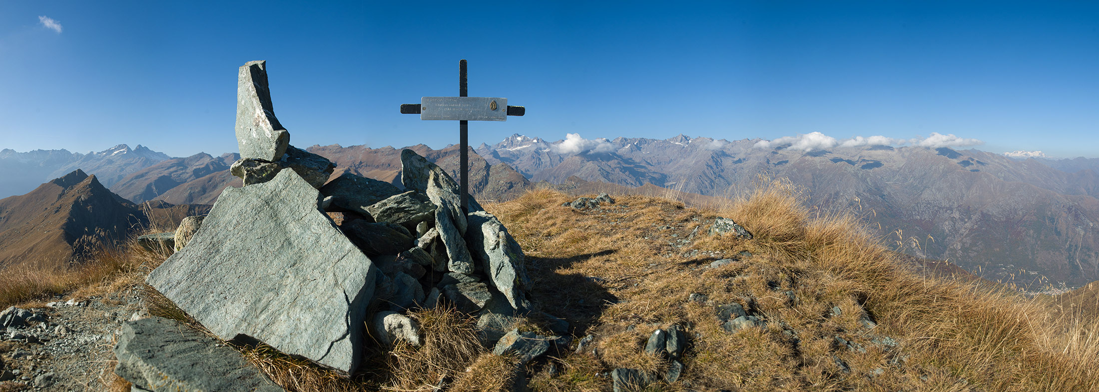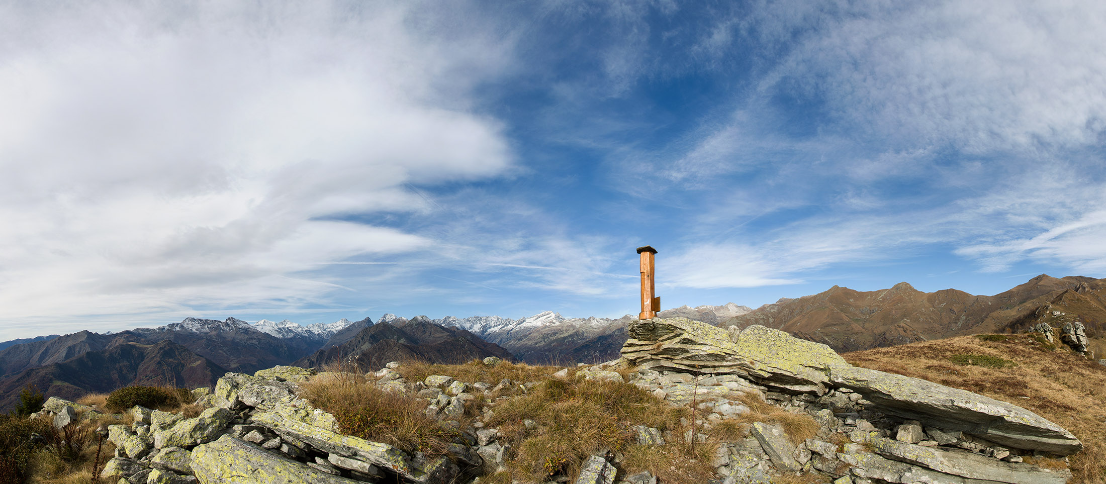 Vom Lago di Monastero sind es nur wenige Schritte bis zur im Sommer bewirtschafteten Alpe di Coassolo (2026 m). Der verbleibende Aufstieg zur Cima La Rossa ist nicht markiert und mehr oder weniger weglos, aber völlig unschwierig, hier und da helfen vereinzelte Steinmännchen bei der Orientierung. Bei dem hier im Sommer oft vorkommenden Nebel sollte man allerdings aufpassen, dass man den Weg nicht verliert. Bei der Alpe di Coassolo verlässt man die Alpstrasse und steigt einfach über die Weiden auf einen nordwestlich gelegenen grasigen Geländerücken, dort trifft man auf einen Viehsteig, der irgendwann ostwärts abknickt. Die spärliche Pfadspur führt zu einer kleinen Verebnungsfläche mit einem riesigen Steinmann, von dort weglos und schwitzend durch hohes Gras weiter bis zu einem von weitem erkennbaren Holzpflock am Ostgrat des Berges, von dort in wenigen Schritten hinauf zum Gipfelkreuz der Cima La Rossa (2319 m). Hier liegt einem die Welt zu Füssen, Johann Wolfgang von Goethe dichtete einst: „Berge sind stille Meister und machen schweigsame Schüler“. Poetisch ist auch das Panorama von hier oben. Im Norden zeigt sich der Gran Paradiso (4061 m) mit all seinen Trabanten, östlich davon der Monte Rosa (4634 m), das zweithöchste Bergmassiv der Alpen, im Westen die Gruppe der Levanne (3619 m) und viele andere namhafte Erhebungen der Valli di Lanzo. Im Osten verliert sich Po-Ebene im immerwährenden Dunst, im Süden grüsst der Monviso (3841 m), bei klarer Sicht blickt man bis in die Seealpen. Auf dem kleinen Gipfelkreuz steht geschrieben: „Quando diventa buio, puoi vedere le stelle – wenn es dunkel wird, kannst du die Sterne sehen“. Dem gibt es nichts hinzuzufügen.