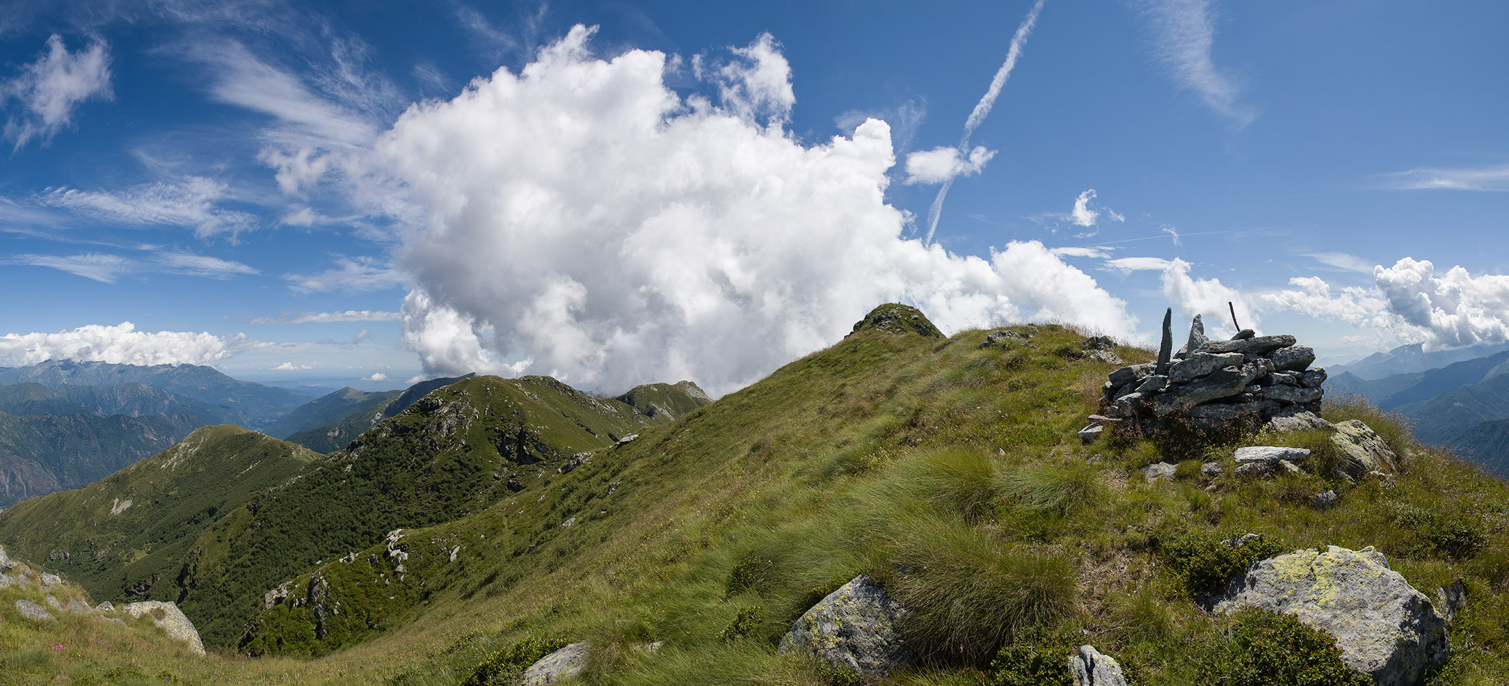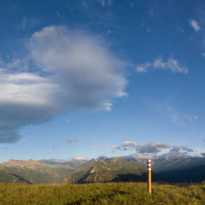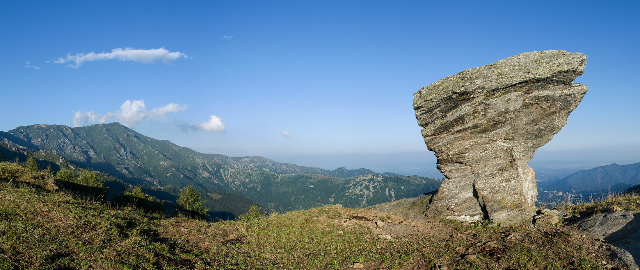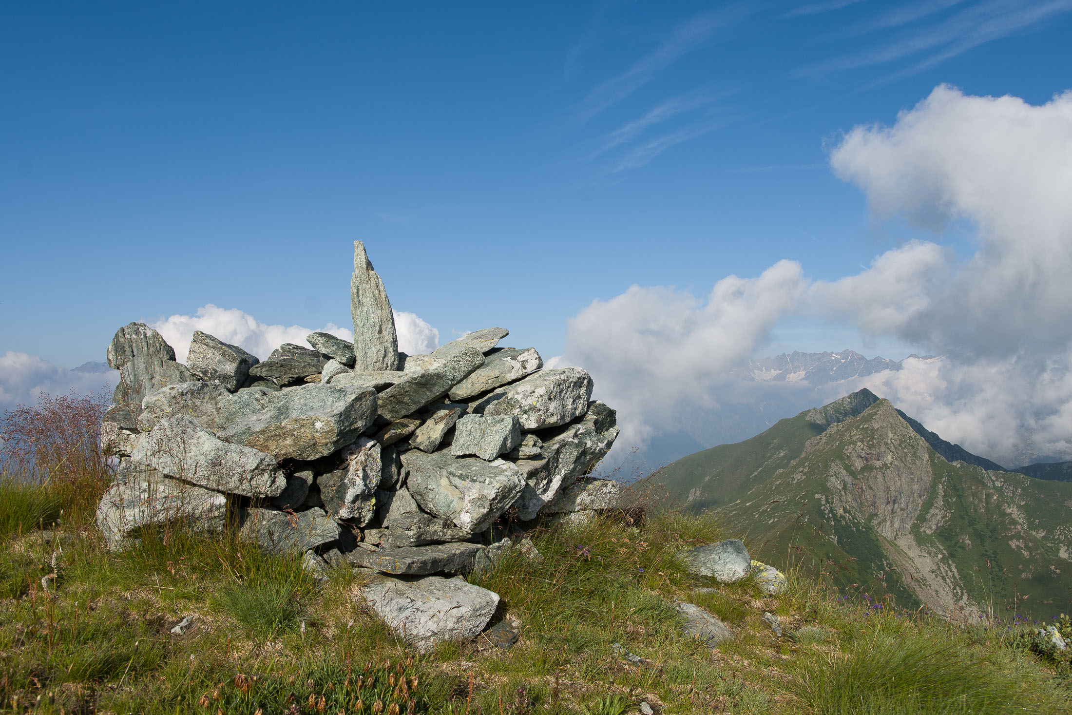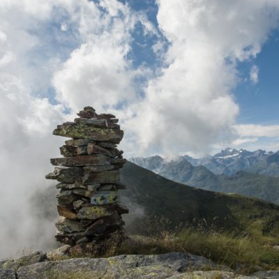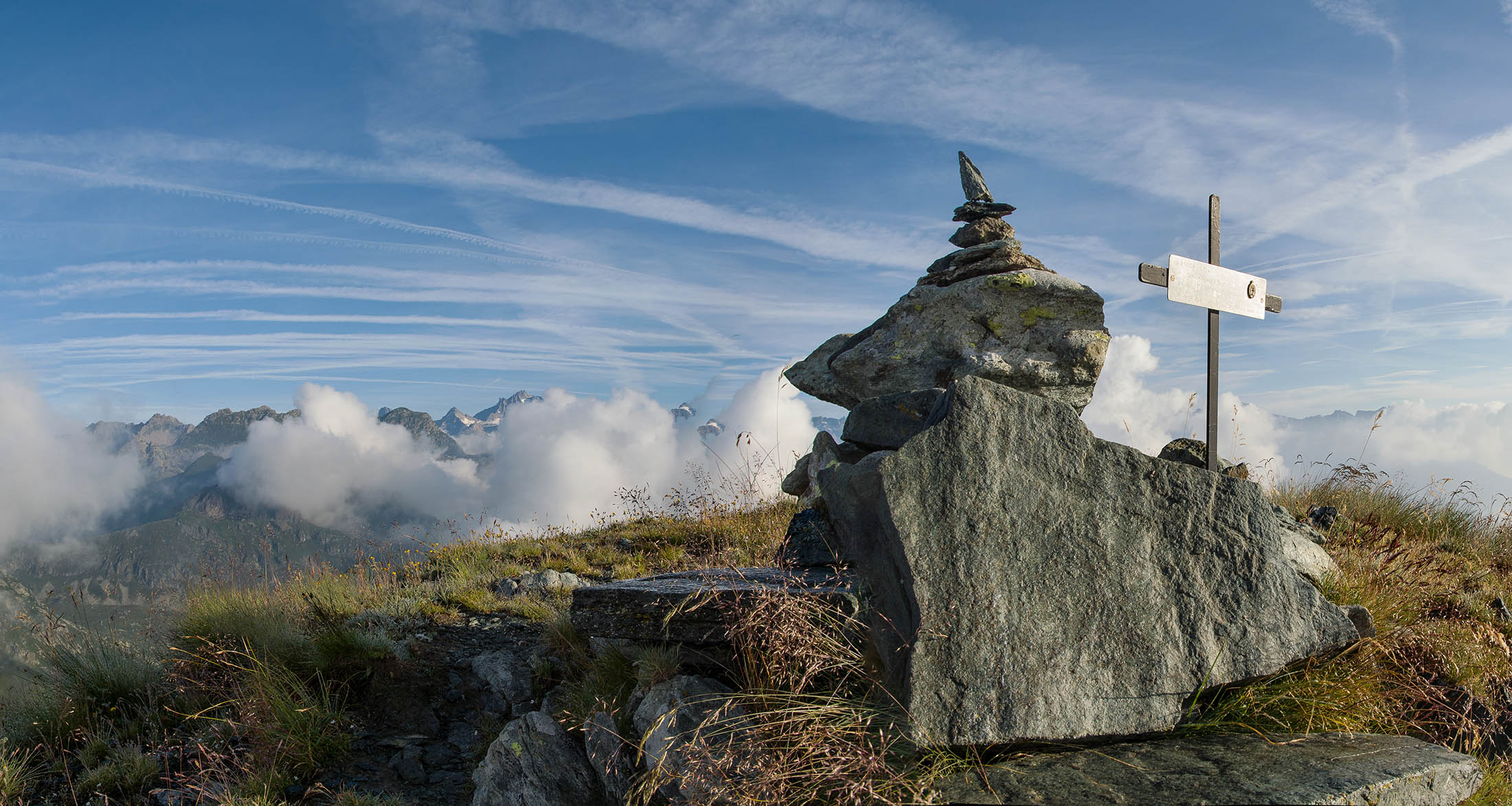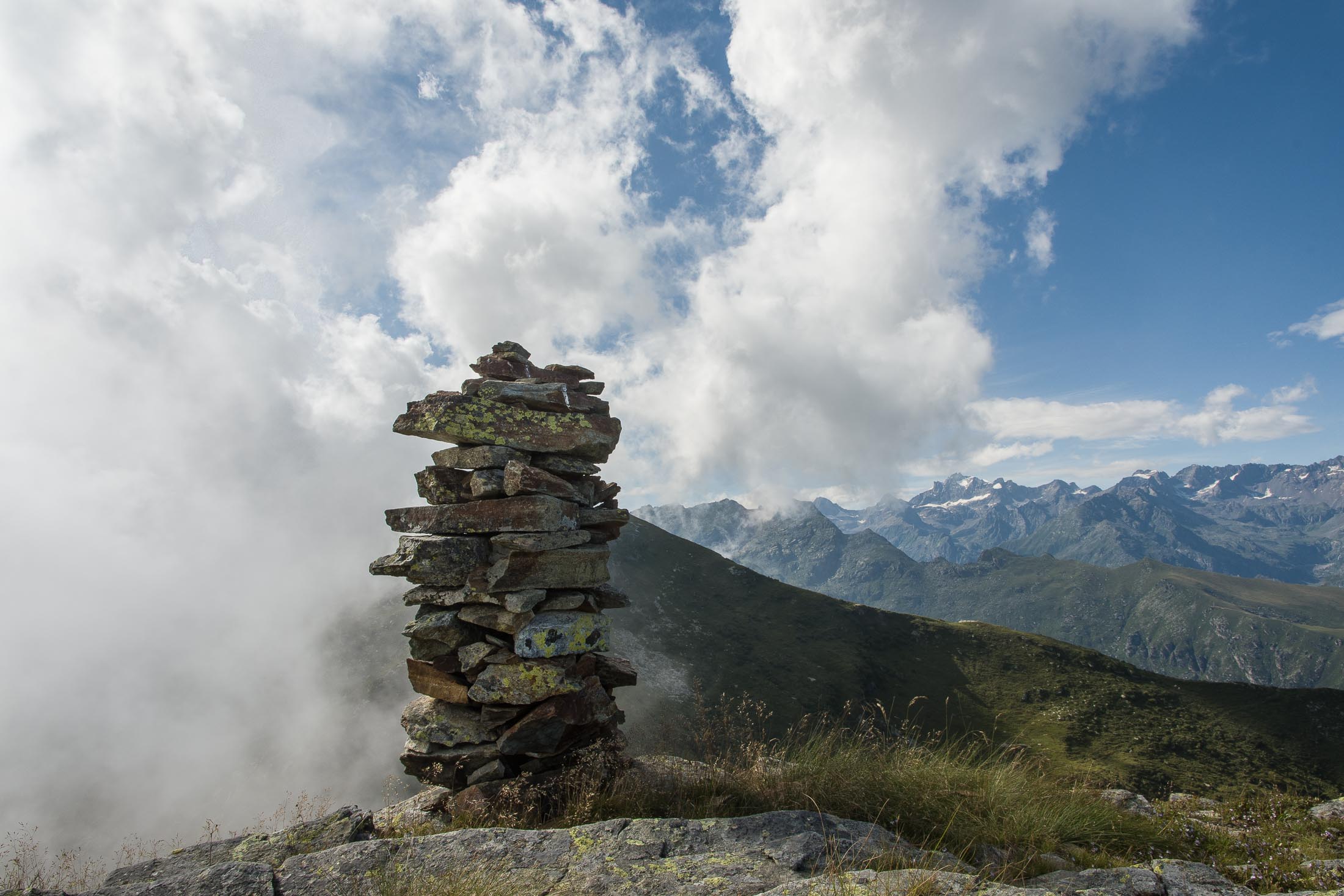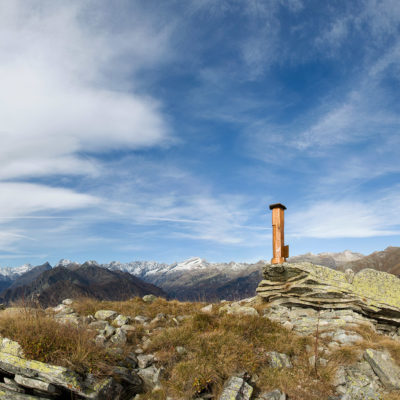 Vom Lago di Monastero sind es nur wenige Schritte bis zur im Sommer bewirtschafteten Alpe di Coassolo (2026 m). Der verbleibende Aufstieg zur Cima La Rossa ist nicht markiert und mehr oder weniger weglos, aber völlig unschwierig, hier und da helfen vereinzelte Steinmännchen bei der Orientierung. Bei dem hier im Sommer oft vorkommenden Nebel sollte man allerdings aufpassen, dass man den Weg nicht verliert. Bei der Alpe di Coassolo verlässt man die Alpstrasse und steigt einfach über die Weiden auf einen nordwestlich gelegenen grasigen Geländerücken, dort trifft man auf einen Viehsteig, der irgendwann ostwärts abknickt. Die spärliche Pfadspur führt zu einer kleinen Verebnungsfläche mit einem riesigen Steinmann, von dort weglos und schwitzend durch hohes Gras weiter bis zu einem von weitem erkennbaren Holzpflock am Ostgrat des Berges, von dort in wenigen Schritten hinauf zum Gipfelkreuz der Cima La Rossa (2319 m). Hier liegt einem die Welt zu Füssen, Johann Wolfgang von Goethe dichtete einst: „Berge sind stille Meister und machen schweigsame Schüler“. Poetisch ist auch das Panorama von hier oben. Im Norden zeigt sich der Gran Paradiso (4061 m) mit all seinen Trabanten, östlich davon der Monte Rosa (4634 m), das zweithöchste Bergmassiv der Alpen, im Westen die Gruppe der Levanne (3619 m) und viele andere namhafte Erhebungen der Valli di Lanzo. Im Osten verliert sich Po-Ebene im immerwährenden Dunst, im Süden grüsst der Monviso (3841 m), bei klarer Sicht blickt man bis in die Seealpen. Auf dem kleinen Gipfelkreuz steht geschrieben: „Quando diventa buio, puoi vedere le stelle – wenn es dunkel wird, kannst du die Sterne sehen“. Dem gibt es nichts hinzuzufügen.