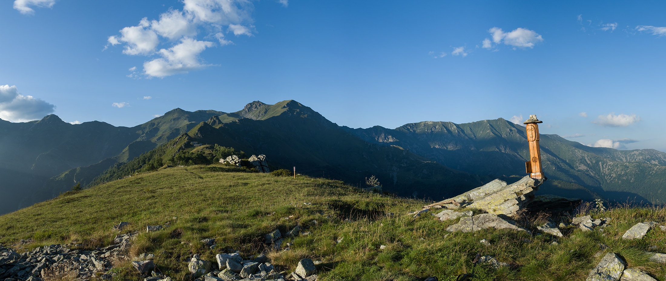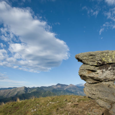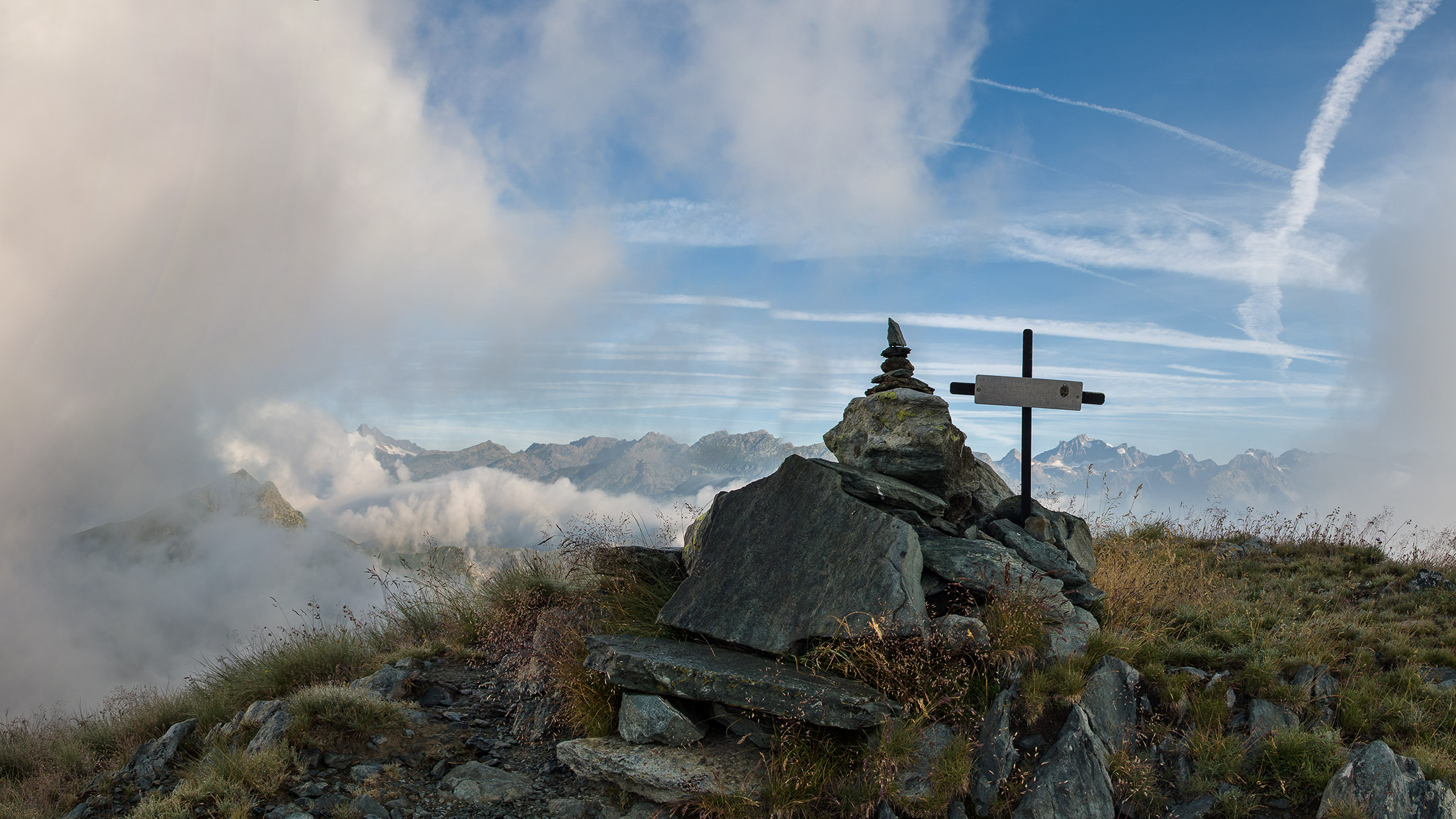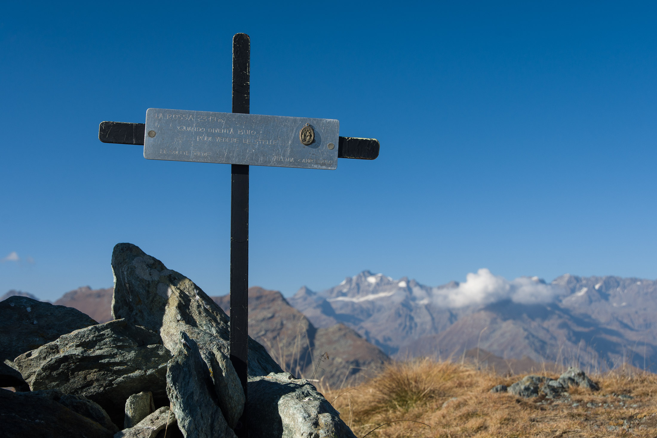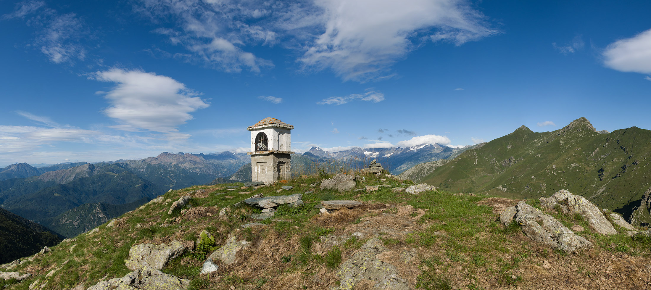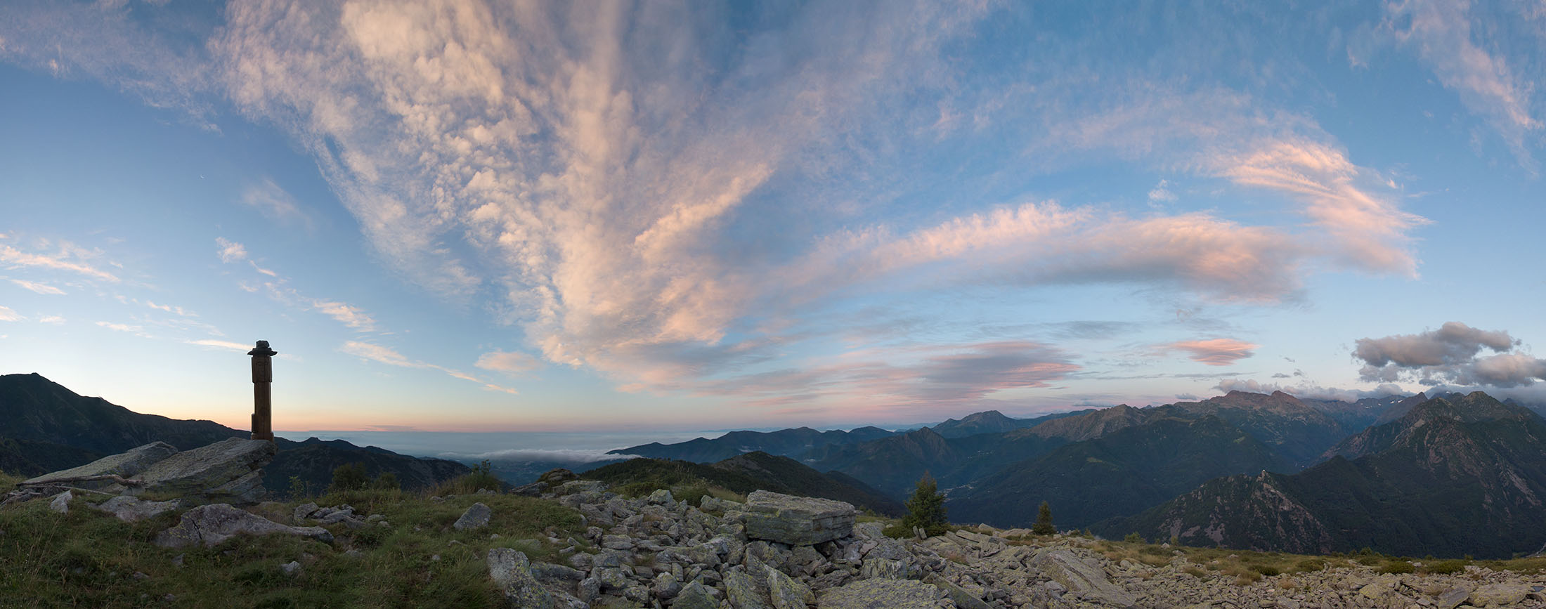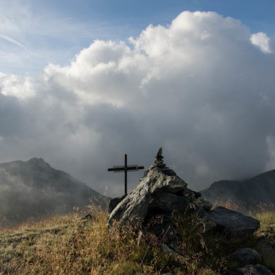 Vom Lago di Monastero sind es nur wenige Schritte bis zur im Sommer bewirtschafteten Alpe di Coassolo (2026 m). Der verbleibende Aufstieg zur Cima La Rossa ist nicht markiert und mehr oder weniger weglos, aber völlig unschwierig, hier und da helfen vereinzelte Steinmännchen bei der Orientierung. Bei dem hier im Sommer oft vorkommenden Nebel sollte man allerdings aufpassen, dass man den Weg nicht verliert. Bei der Alpe di Coassolo verlässt man die Alpstrasse und steigt einfach über die Weiden auf einen nordwestlich gelegenen grasigen Geländerücken, dort trifft man auf einen Viehsteig, der irgendwann ostwärts abknickt. Die spärliche Pfadspur führt zu einer kleinen Verebnungsfläche mit einem riesigen Steinmann, von dort weglos und schwitzend durch hohes Gras weiter bis zu einem von weitem erkennbaren Holzpflock am Ostgrat des Berges, von dort in wenigen Schritten hinauf zum Gipfelkreuz der Cima La Rossa (2319 m). Hier liegt einem die Welt zu Füssen, Johann Wolfgang von Goethe dichtete einst: „Berge sind stille Meister und machen schweigsame Schüler“. Poetisch ist auch das Panorama von hier oben. Im Norden zeigt sich der Gran Paradiso (4061 m) mit all seinen Trabanten, östlich davon der Monte Rosa (4634 m), das zweithöchste Bergmassiv der Alpen, im Westen die Gruppe der Levanne (3619 m) und viele andere namhafte Erhebungen der Valli di Lanzo. Im Osten verliert sich Po-Ebene im immerwährenden Dunst, im Süden grüsst der Monviso (3841 m), bei klarer Sicht blickt man bis in die Seealpen. Auf dem kleinen Gipfelkreuz steht geschrieben: „Quando diventa buio, puoi vedere le stelle – wenn es dunkel wird, kannst du die Sterne sehen“. Dem gibt es nichts hinzuzufügen.