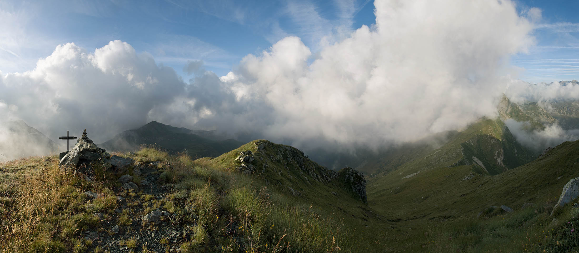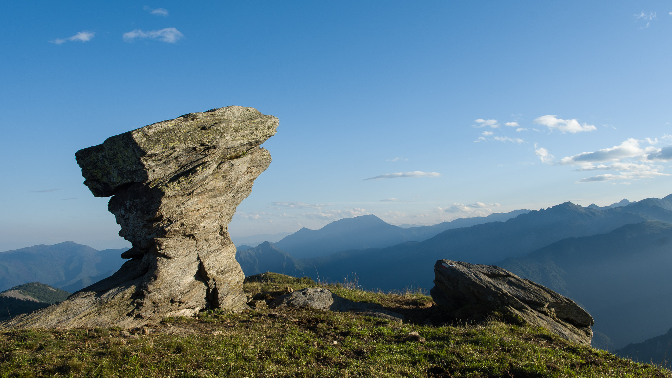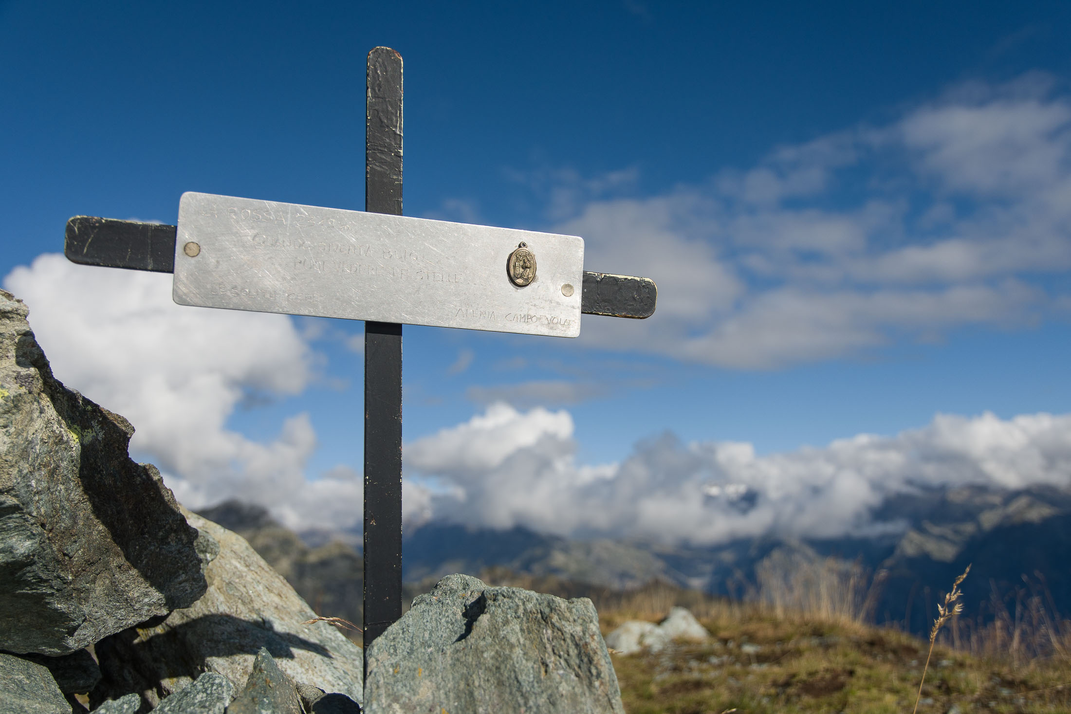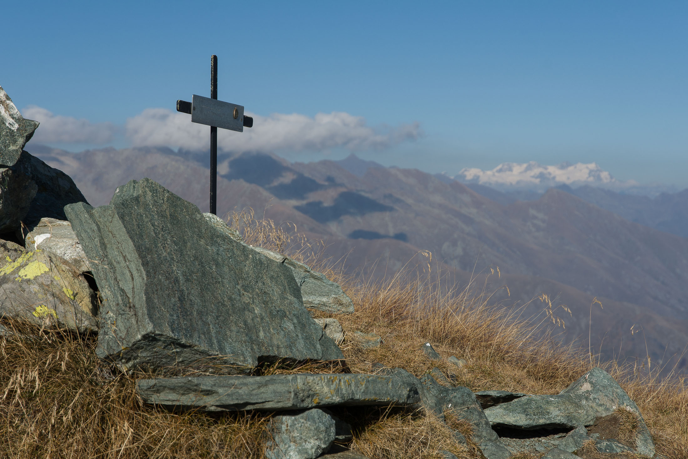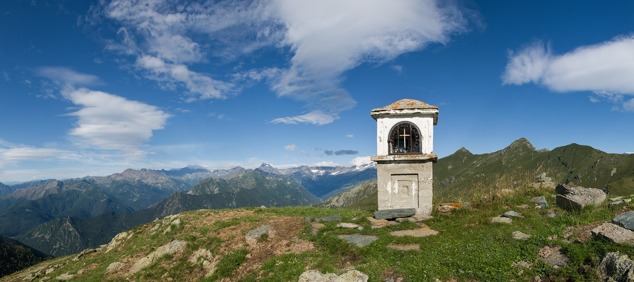 Vom Lago di Monastero sind es nur wenige Schritte bis zur im Sommer bewirtschafteten Alpe di Coassolo (2026 m). Der verbleibende Aufstieg zur Cima La Rossa ist nicht markiert und mehr oder weniger weglos, aber völlig unschwierig, hier und da helfen vereinzelte Steinmännchen bei der Orientierung. Bei dem hier im Sommer oft vorkommenden Nebel sollte man allerdings aufpassen, dass man den Weg nicht verliert. Bei der Alpe di Coassolo verlässt man die Alpstrasse und steigt einfach über die Weiden auf einen nordwestlich gelegenen grasigen Geländerücken, dort trifft man auf einen Viehsteig, der irgendwann ostwärts abknickt. Die spärliche Pfadspur führt zu einer kleinen Verebnungsfläche mit einem riesigen Steinmann, von dort weglos und schwitzend durch hohes Gras weiter bis zu einem von weitem erkennbaren Holzpflock am Ostgrat des Berges, von dort in wenigen Schritten hinauf zum Gipfelkreuz der Cima La Rossa (2319 m). Hier liegt einem die Welt zu Füssen, Johann Wolfgang von Goethe dichtete einst: „Berge sind stille Meister und machen schweigsame Schüler“. Poetisch ist auch das Panorama von hier oben. Im Norden zeigt sich der Gran Paradiso (4061 m) mit all seinen Trabanten, östlich davon der Monte Rosa (4634 m), das zweithöchste Bergmassiv der Alpen, im Westen die Gruppe der Levanne (3619 m) und viele andere namhafte Erhebungen der Valli di Lanzo. Im Osten verliert sich Po-Ebene im immerwährenden Dunst, im Süden grüsst der Monviso (3841 m), bei klarer Sicht blickt man bis in die Seealpen. Auf dem kleinen Gipfelkreuz steht geschrieben: „Quando diventa buio, puoi vedere le stelle – wenn es dunkel wird, kannst du die Sterne sehen“. Dem gibt es nichts hinzuzufügen.