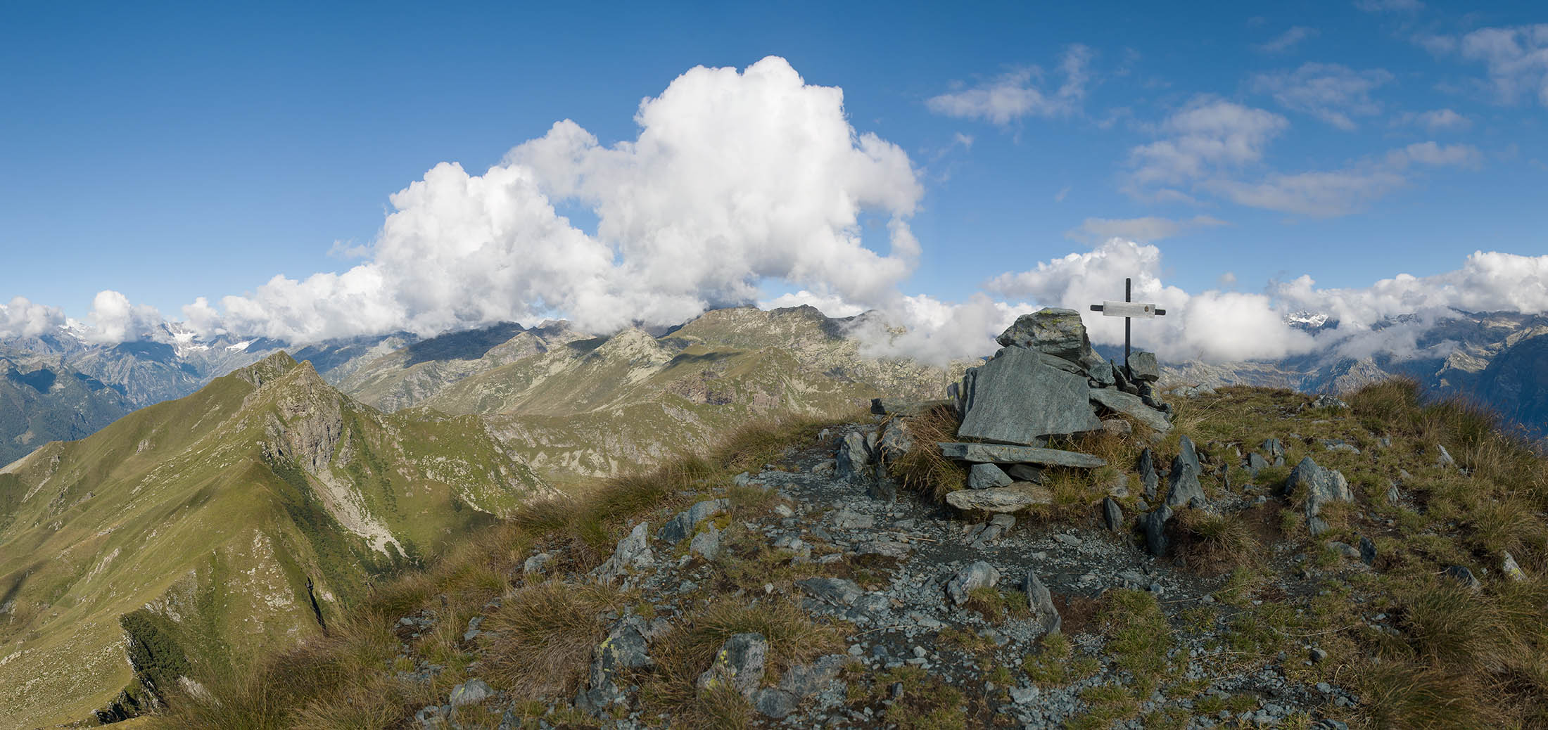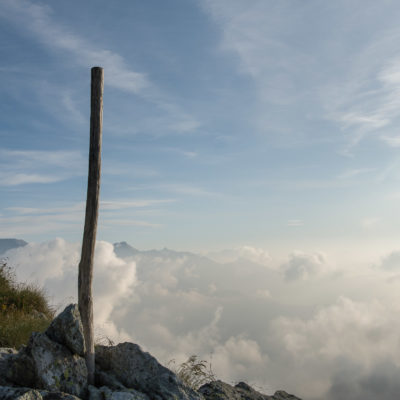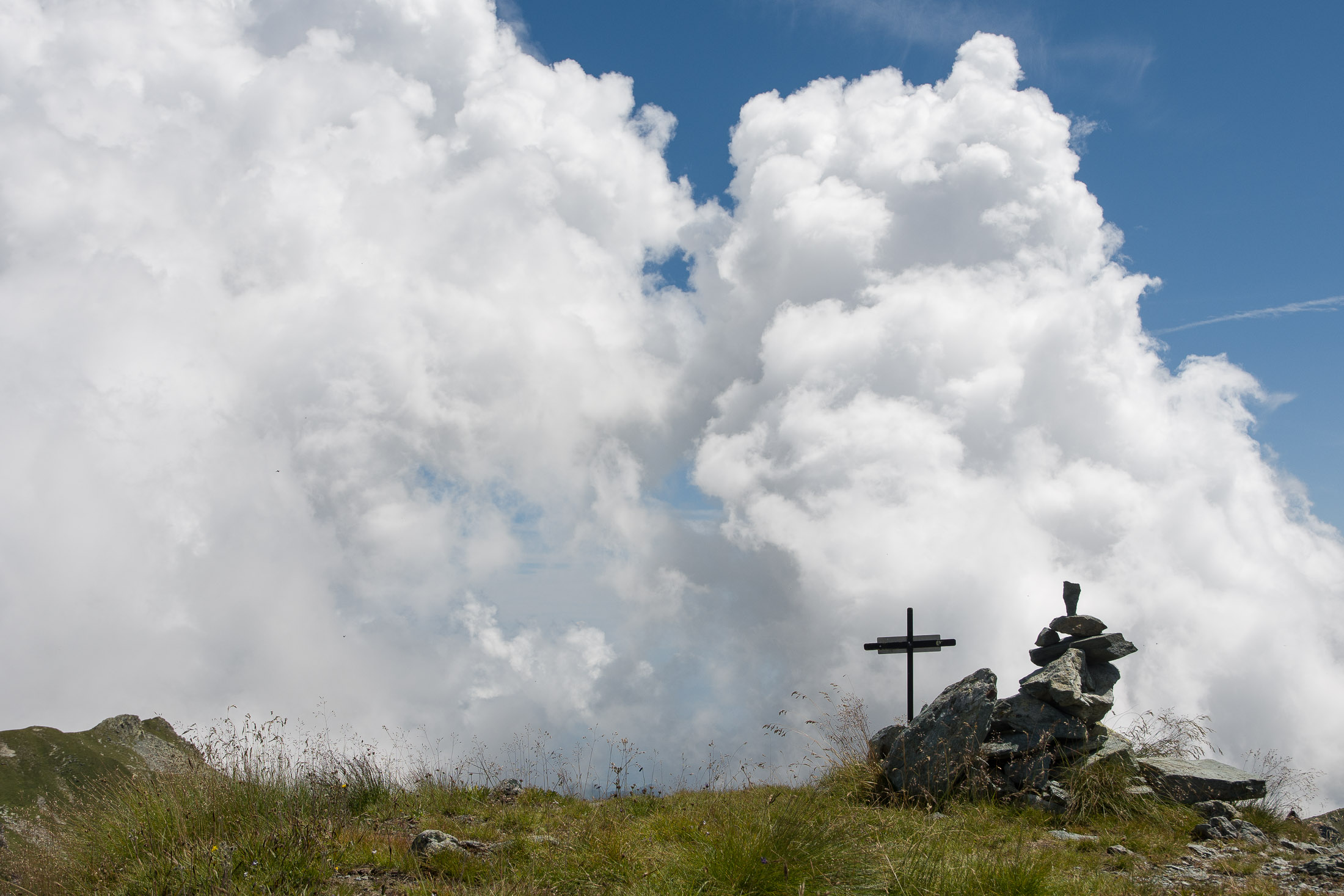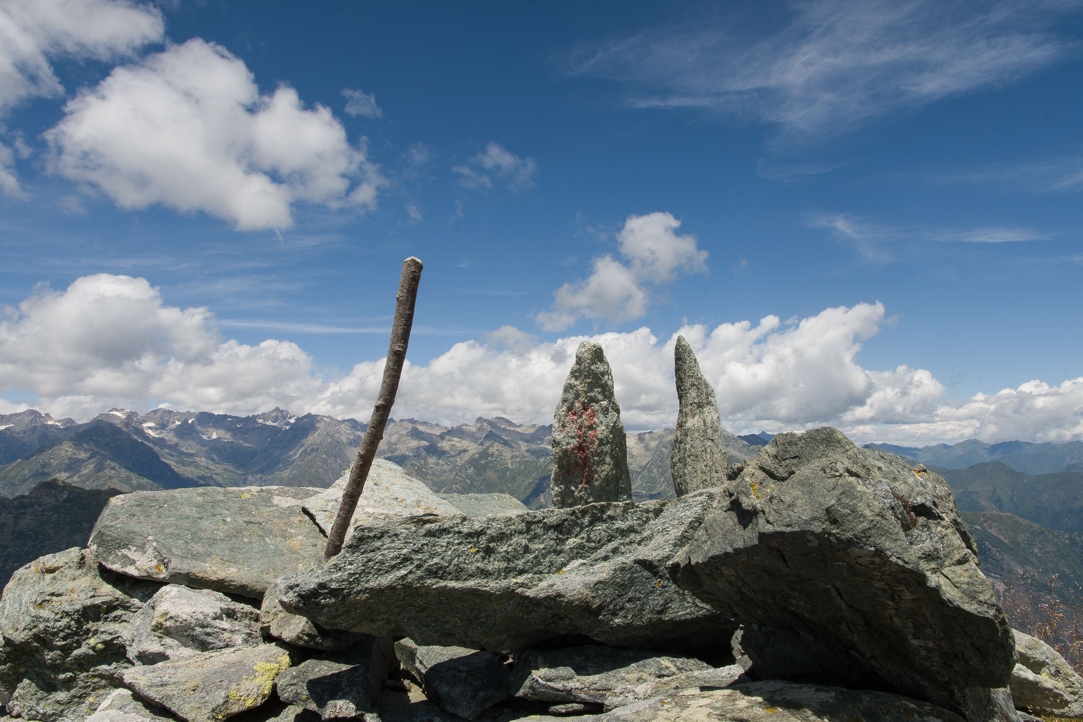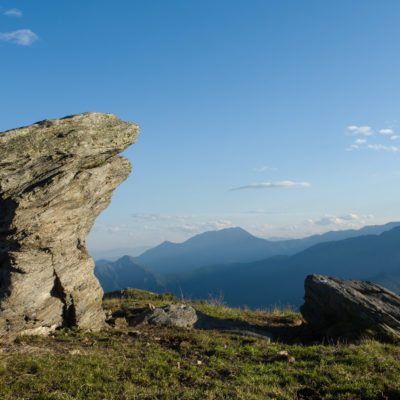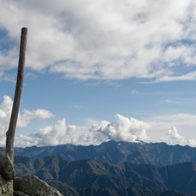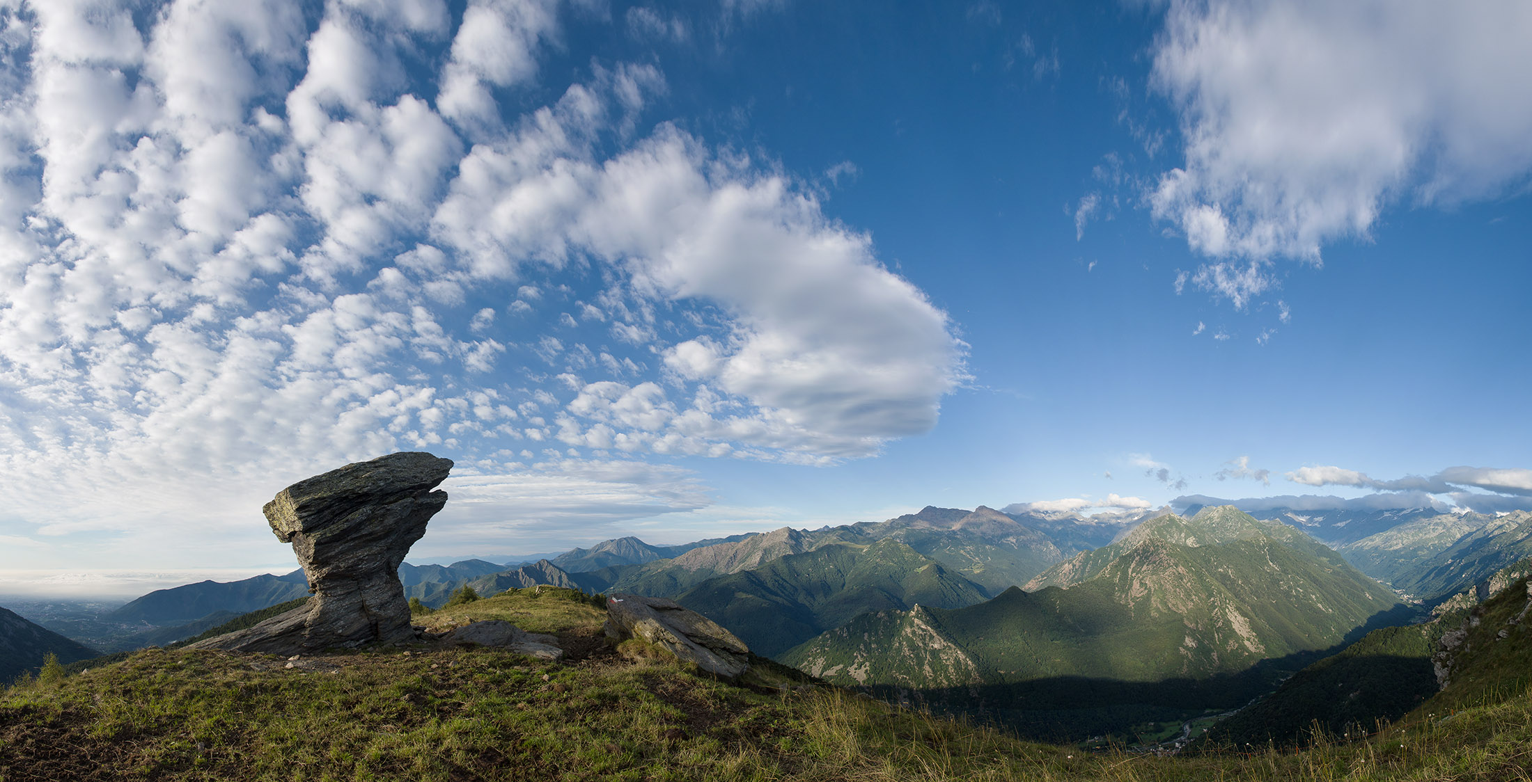 Vom Lago di Monastero sind es nur wenige Schritte bis zur im Sommer bewirtschafteten Alpe di Coassolo (2026 m). Der verbleibende Aufstieg zur Cima La Rossa ist nicht markiert und mehr oder weniger weglos, aber völlig unschwierig, hier und da helfen vereinzelte Steinmännchen bei der Orientierung. Bei dem hier im Sommer oft vorkommenden Nebel sollte man allerdings aufpassen, dass man den Weg nicht verliert. Bei der Alpe di Coassolo verlässt man die Alpstrasse und steigt einfach über die Weiden auf einen nordwestlich gelegenen grasigen Geländerücken, dort trifft man auf einen Viehsteig, der irgendwann ostwärts abknickt. Die spärliche Pfadspur führt zu einer kleinen Verebnungsfläche mit einem riesigen Steinmann, von dort weglos und schwitzend durch hohes Gras weiter bis zu einem von weitem erkennbaren Holzpflock am Ostgrat des Berges, von dort in wenigen Schritten hinauf zum Gipfelkreuz der Cima La Rossa (2319 m). Hier liegt einem die Welt zu Füssen, Johann Wolfgang von Goethe dichtete einst: „Berge sind stille Meister und machen schweigsame Schüler“. Poetisch ist auch das Panorama von hier oben. Im Norden zeigt sich der Gran Paradiso (4061 m) mit all seinen Trabanten, östlich davon der Monte Rosa (4634 m), das zweithöchste Bergmassiv der Alpen, im Westen die Gruppe der Levanne (3619 m) und viele andere namhafte Erhebungen der Valli di Lanzo. Im Osten verliert sich Po-Ebene im immerwährenden Dunst, im Süden grüsst der Monviso (3841 m), bei klarer Sicht blickt man bis in die Seealpen. Auf dem kleinen Gipfelkreuz steht geschrieben: „Quando diventa buio, puoi vedere le stelle – wenn es dunkel wird, kannst du die Sterne sehen“. Dem gibt es nichts hinzuzufügen.