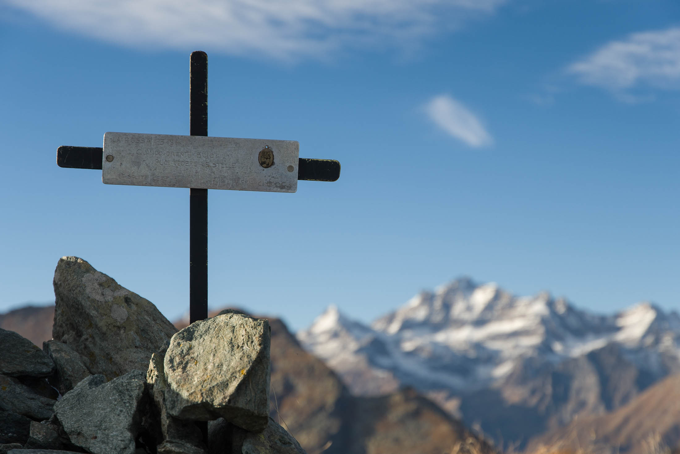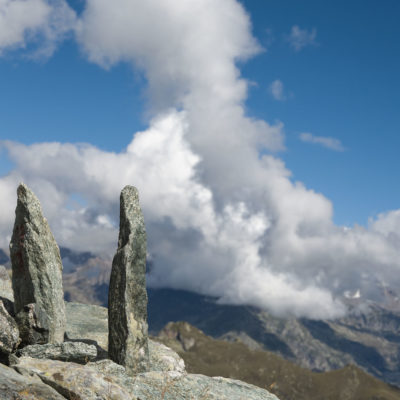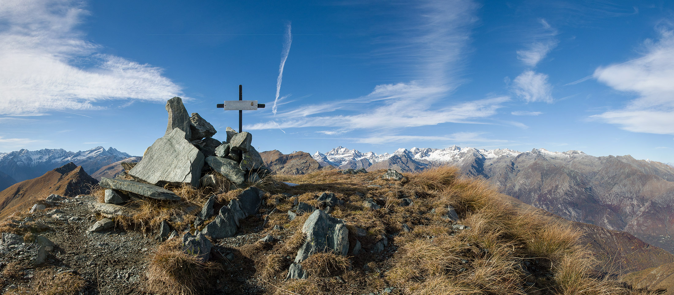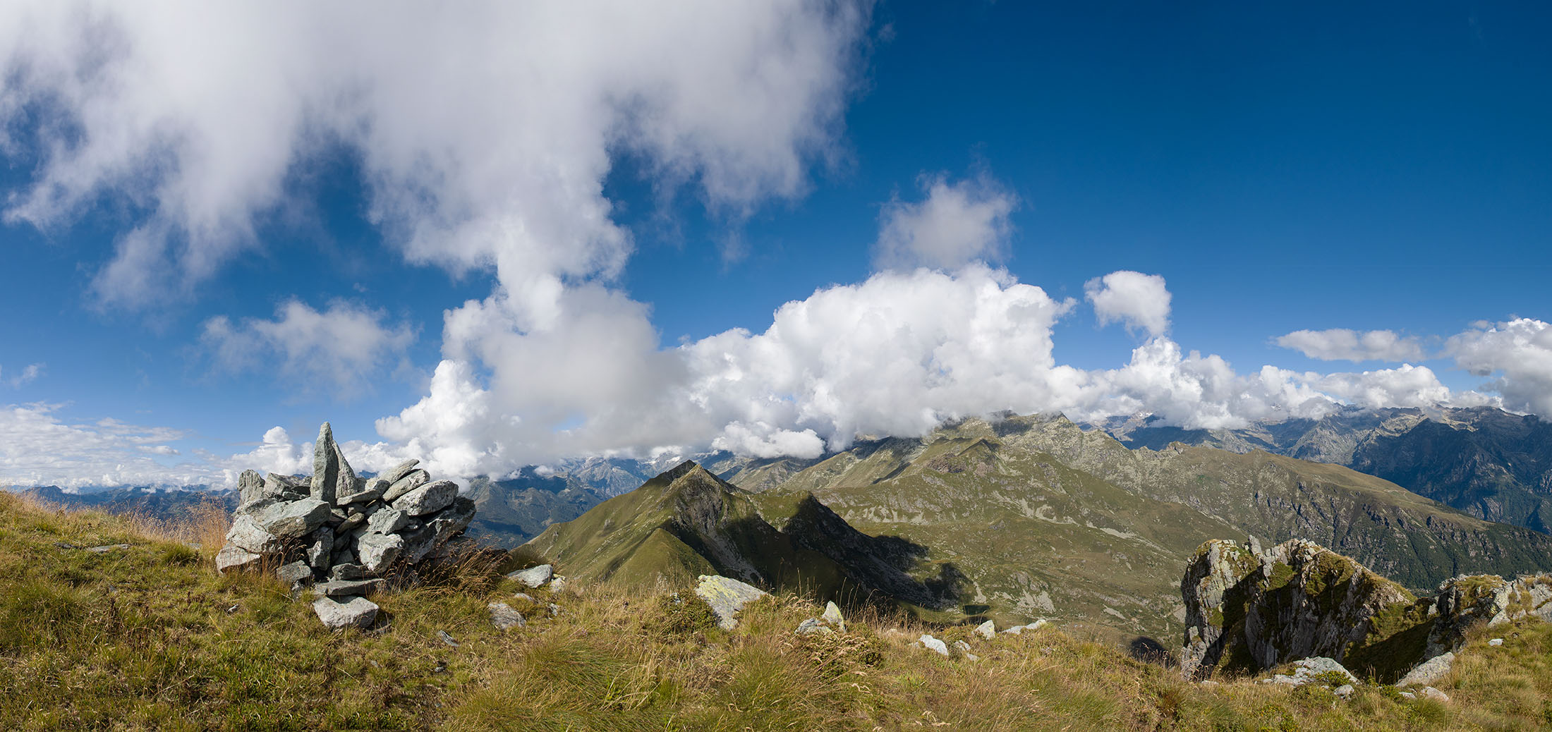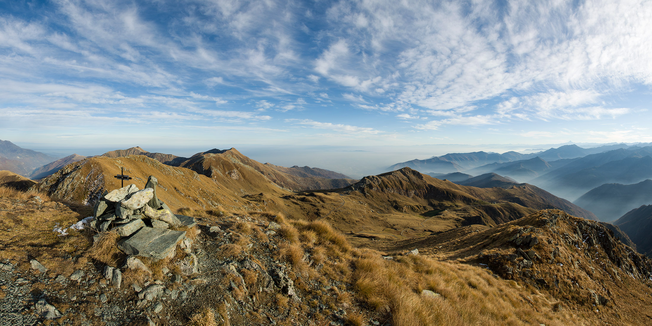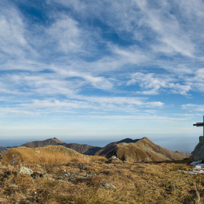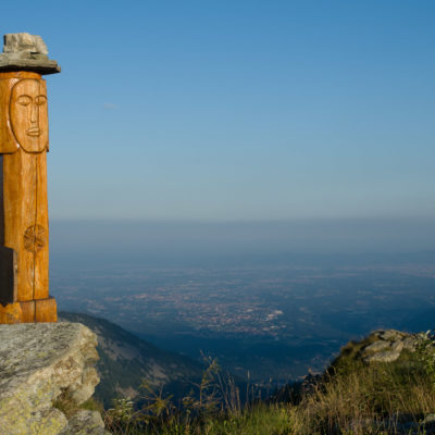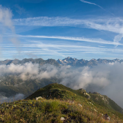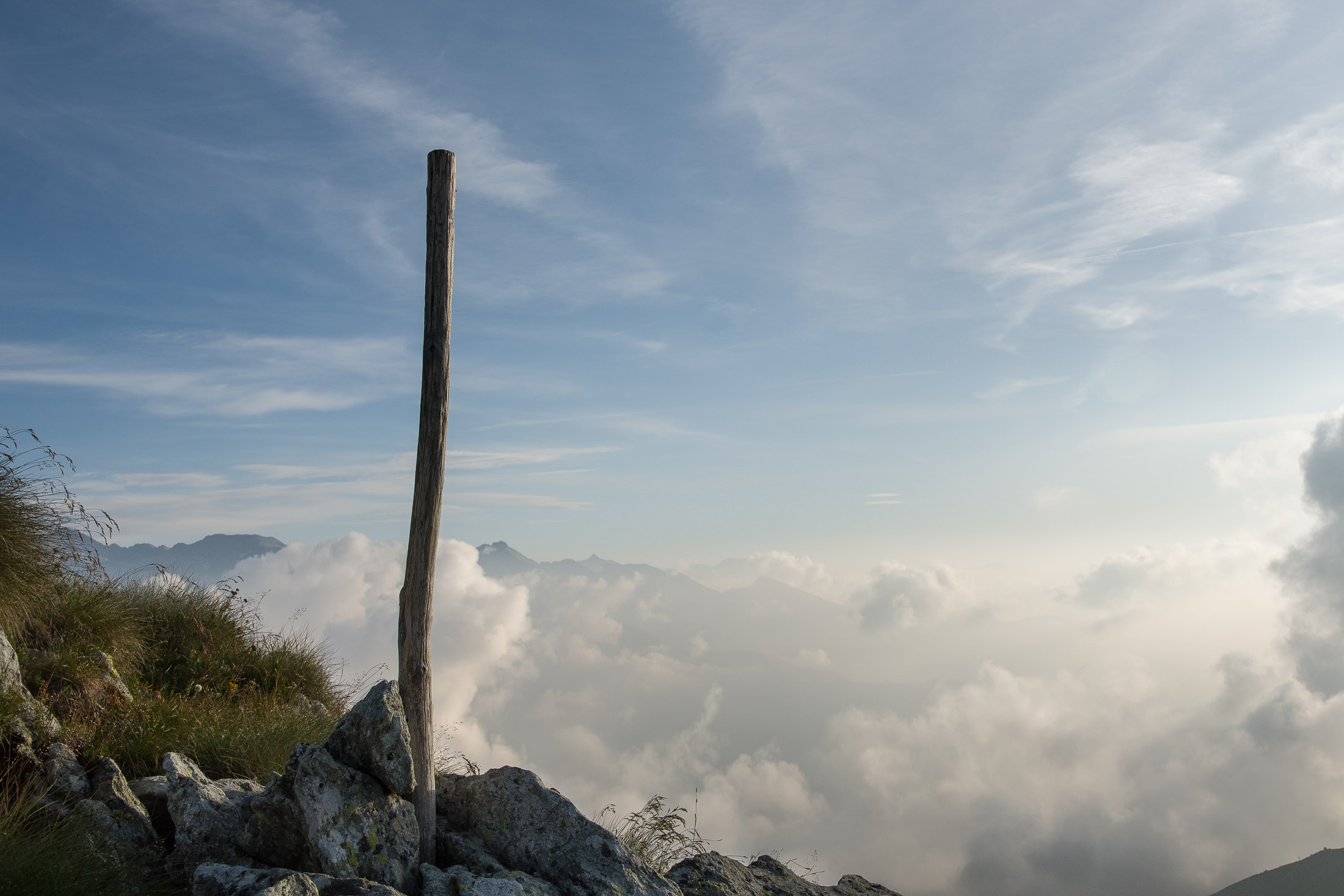 Vom Lago di Monastero sind es nur wenige Schritte bis zur im Sommer bewirtschafteten Alpe di Coassolo (2026 m). Der verbleibende Aufstieg zur Cima La Rossa ist nicht markiert und mehr oder weniger weglos, aber völlig unschwierig, hier und da helfen vereinzelte Steinmännchen bei der Orientierung. Bei dem hier im Sommer oft vorkommenden Nebel sollte man allerdings aufpassen, dass man den Weg nicht verliert. Bei der Alpe di Coassolo verlässt man die Alpstrasse und steigt einfach über die Weiden auf einen nordwestlich gelegenen grasigen Geländerücken, dort trifft man auf einen Viehsteig, der irgendwann ostwärts abknickt. Die spärliche Pfadspur führt zu einer kleinen Verebnungsfläche mit einem riesigen Steinmann, von dort weglos und schwitzend durch hohes Gras weiter bis zu einem von weitem erkennbaren Holzpflock am Ostgrat des Berges, von dort in wenigen Schritten hinauf zum Gipfelkreuz der Cima La Rossa (2319 m). Hier liegt einem die Welt zu Füssen, Johann Wolfgang von Goethe dichtete einst: „Berge sind stille Meister und machen schweigsame Schüler“. Poetisch ist auch das Panorama von hier oben. Im Norden zeigt sich der Gran Paradiso (4061 m) mit all seinen Trabanten, östlich davon der Monte Rosa (4634 m), das zweithöchste Bergmassiv der Alpen, im Westen die Gruppe der Levanne (3619 m) und viele andere namhafte Erhebungen der Valli di Lanzo. Im Osten verliert sich Po-Ebene im immerwährenden Dunst, im Süden grüsst der Monviso (3841 m), bei klarer Sicht blickt man bis in die Seealpen. Auf dem kleinen Gipfelkreuz steht geschrieben: „Quando diventa buio, puoi vedere le stelle – wenn es dunkel wird, kannst du die Sterne sehen“. Dem gibt es nichts hinzuzufügen.