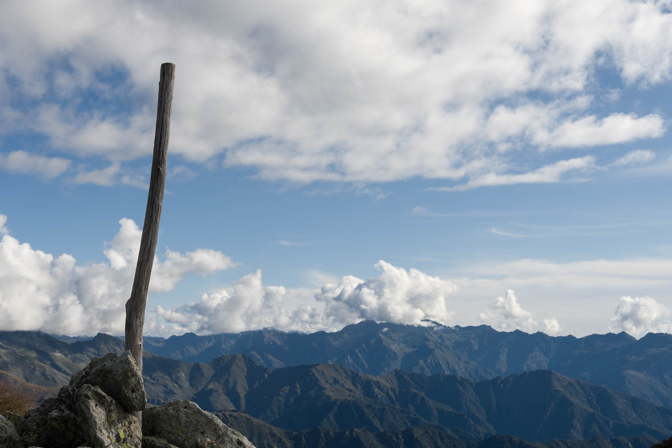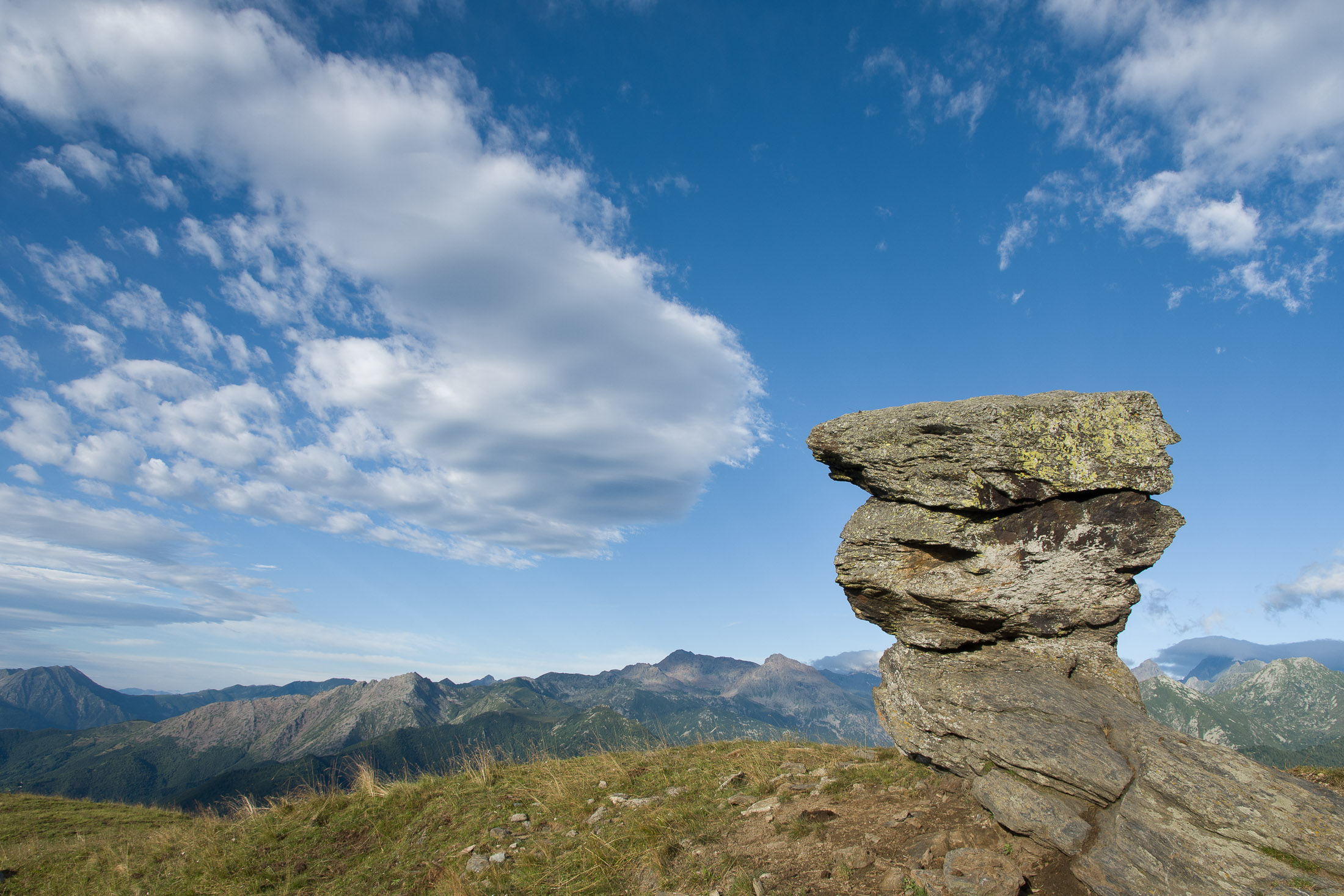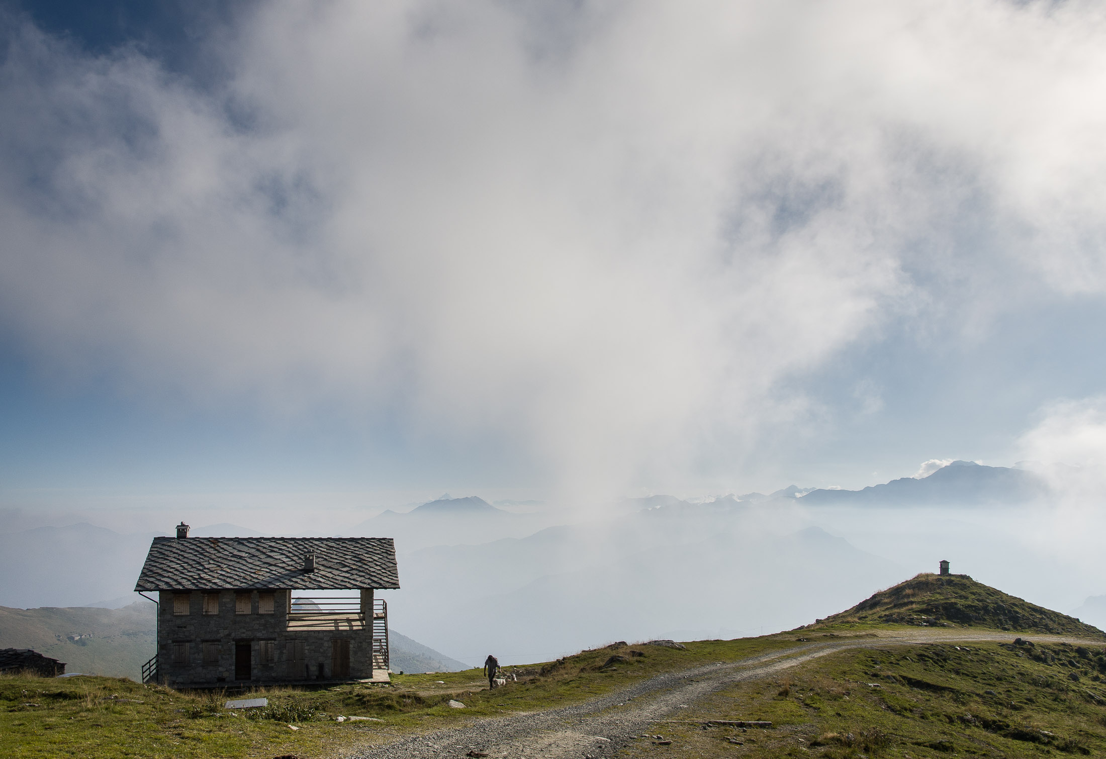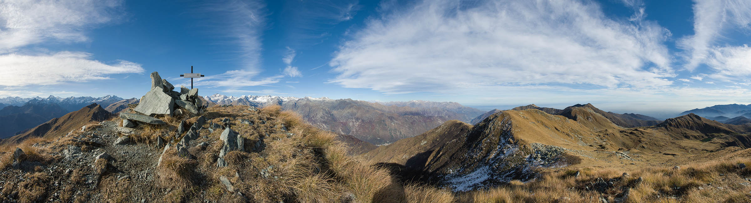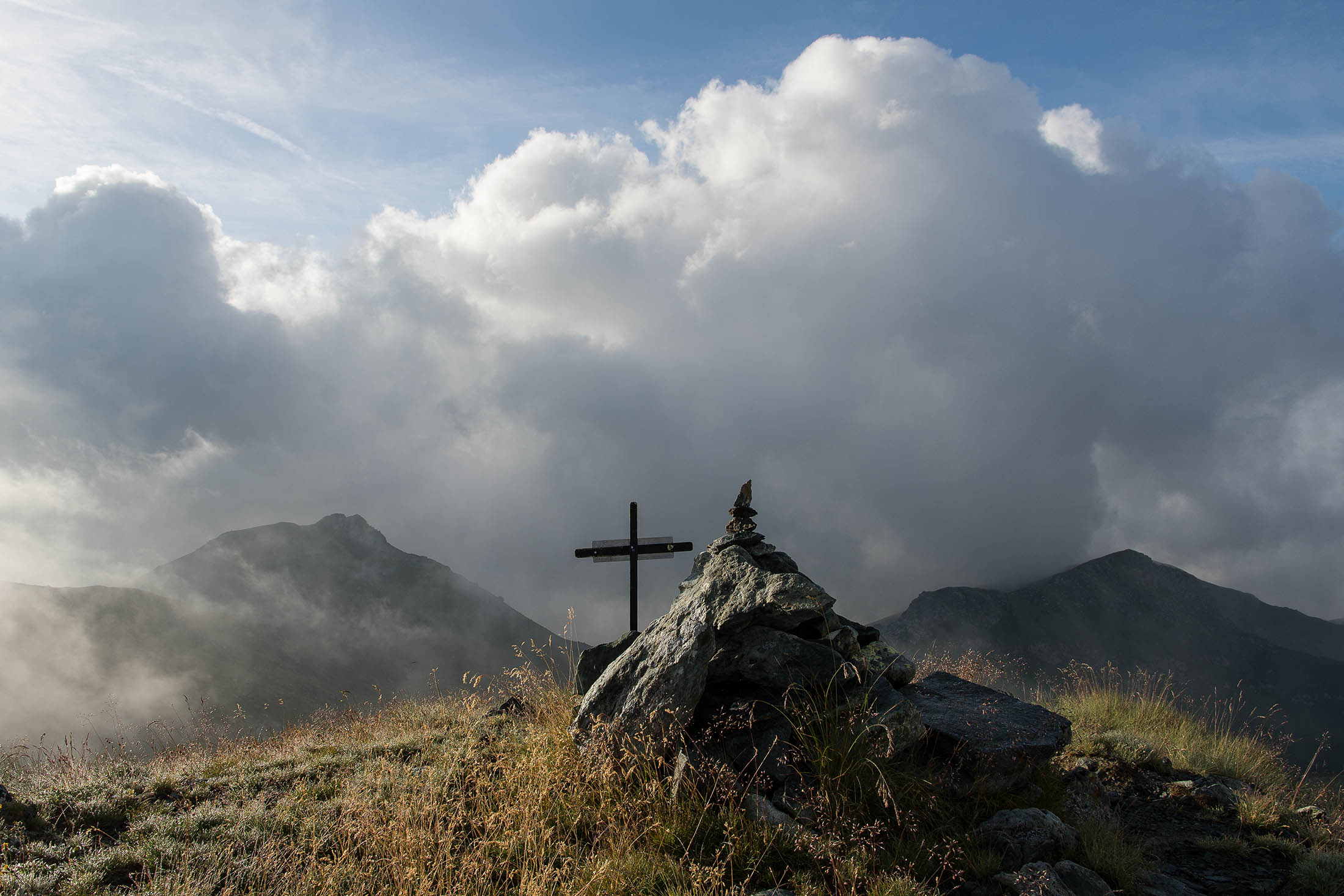 Vom Lago di Monastero sind es nur wenige Schritte bis zur im Sommer bewirtschafteten Alpe di Coassolo (2026 m). Der verbleibende Aufstieg zur Cima La Rossa ist nicht markiert und mehr oder weniger weglos, aber völlig unschwierig, hier und da helfen vereinzelte Steinmännchen bei der Orientierung. Bei dem hier im Sommer oft vorkommenden Nebel sollte man allerdings aufpassen, dass man den Weg nicht verliert. Bei der Alpe di Coassolo verlässt man die Alpstrasse und steigt einfach über die Weiden auf einen nordwestlich gelegenen grasigen Geländerücken, dort trifft man auf einen Viehsteig, der irgendwann ostwärts abknickt. Die spärliche Pfadspur führt zu einer kleinen Verebnungsfläche mit einem riesigen Steinmann, von dort weglos und schwitzend durch hohes Gras weiter bis zu einem von weitem erkennbaren Holzpflock am Ostgrat des Berges, von dort in wenigen Schritten hinauf zum Gipfelkreuz der Cima La Rossa (2319 m). Hier liegt einem die Welt zu Füssen, Johann Wolfgang von Goethe dichtete einst: „Berge sind stille Meister und machen schweigsame Schüler“. Poetisch ist auch das Panorama von hier oben. Im Norden zeigt sich der Gran Paradiso (4061 m) mit all seinen Trabanten, östlich davon der Monte Rosa (4634 m), das zweithöchste Bergmassiv der Alpen, im Westen die Gruppe der Levanne (3619 m) und viele andere namhafte Erhebungen der Valli di Lanzo. Im Osten verliert sich Po-Ebene im immerwährenden Dunst, im Süden grüsst der Monviso (3841 m), bei klarer Sicht blickt man bis in die Seealpen. Auf dem kleinen Gipfelkreuz steht geschrieben: „Quando diventa buio, puoi vedere le stelle – wenn es dunkel wird, kannst du die Sterne sehen“. Dem gibt es nichts hinzuzufügen.