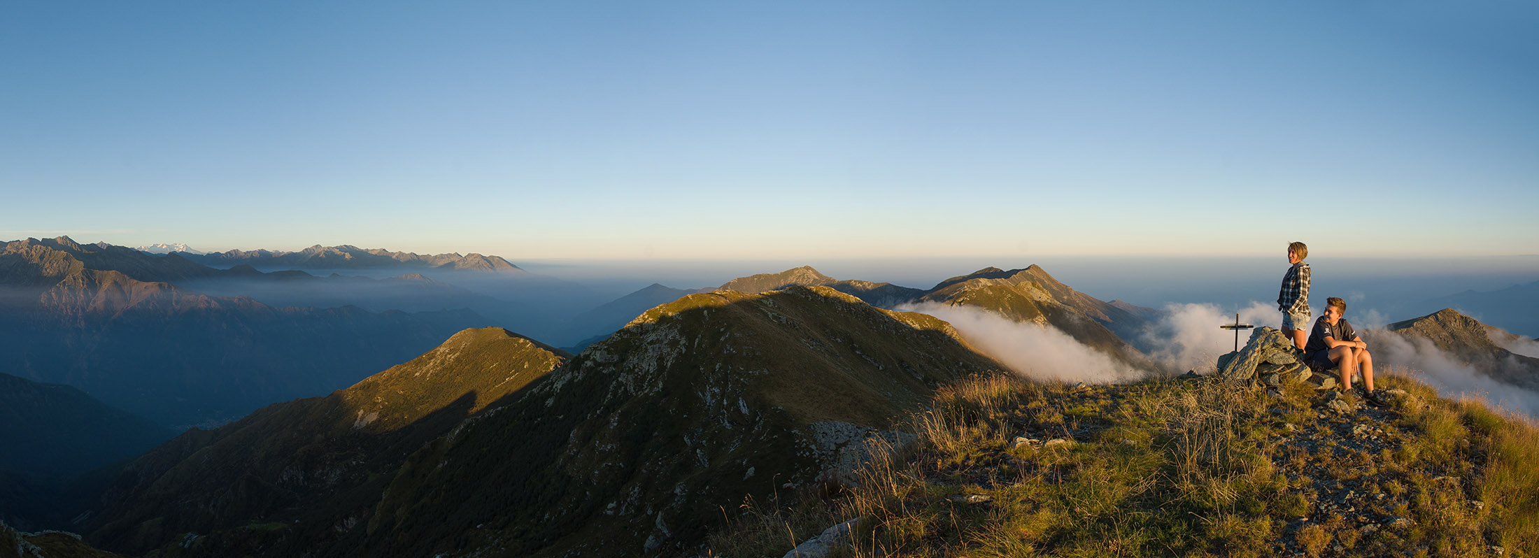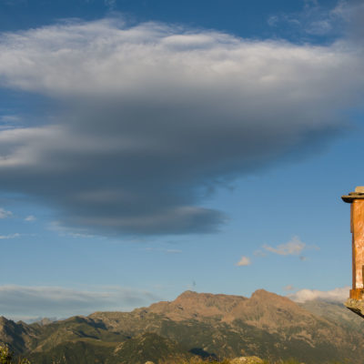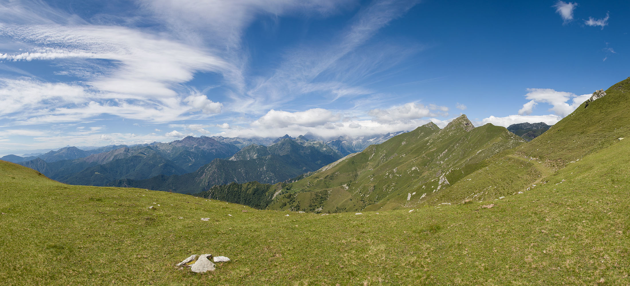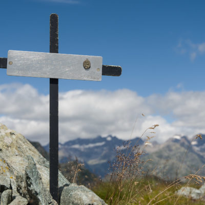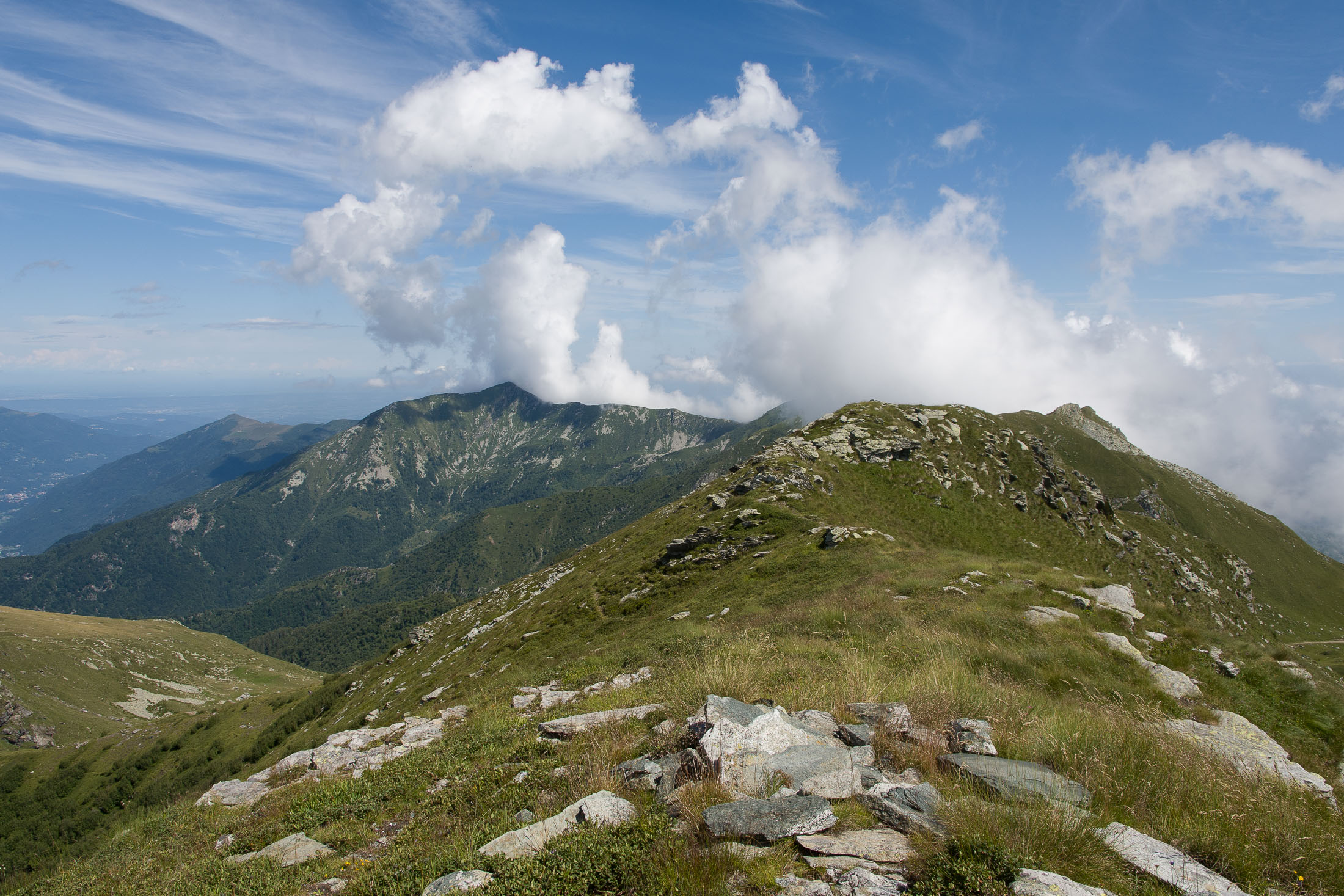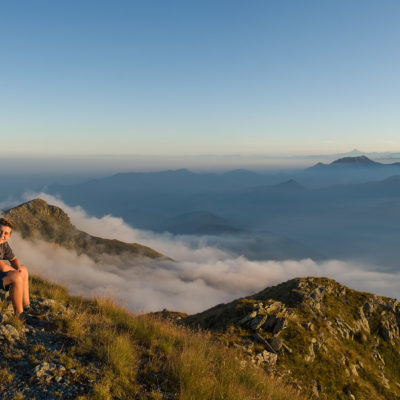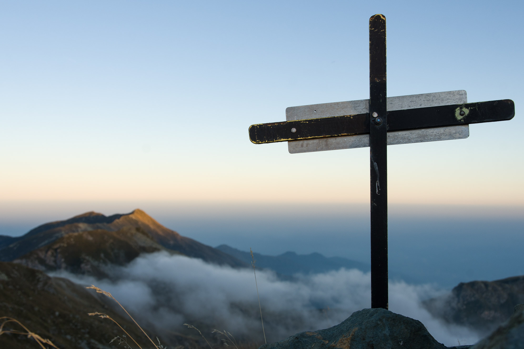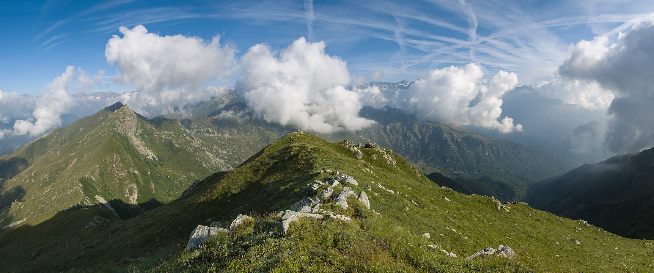 Vom Lago di Monastero sind es nur wenige Schritte bis zur im Sommer bewirtschafteten Alpe di Coassolo (2026 m). Der verbleibende Aufstieg zur Cima La Rossa ist nicht markiert und mehr oder weniger weglos, aber völlig unschwierig, hier und da helfen vereinzelte Steinmännchen bei der Orientierung. Bei dem hier im Sommer oft vorkommenden Nebel sollte man allerdings aufpassen, dass man den Weg nicht verliert. Bei der Alpe di Coassolo verlässt man die Alpstrasse und steigt einfach über die Weiden auf einen nordwestlich gelegenen grasigen Geländerücken, dort trifft man auf einen Viehsteig, der irgendwann ostwärts abknickt. Die spärliche Pfadspur führt zu einer kleinen Verebnungsfläche mit einem riesigen Steinmann, von dort weglos und schwitzend durch hohes Gras weiter bis zu einem von weitem erkennbaren Holzpflock am Ostgrat des Berges, von dort in wenigen Schritten hinauf zum Gipfelkreuz der Cima La Rossa (2319 m). Hier liegt einem die Welt zu Füssen, Johann Wolfgang von Goethe dichtete einst: „Berge sind stille Meister und machen schweigsame Schüler“. Poetisch ist auch das Panorama von hier oben. Im Norden zeigt sich der Gran Paradiso (4061 m) mit all seinen Trabanten, östlich davon der Monte Rosa (4634 m), das zweithöchste Bergmassiv der Alpen, im Westen die Gruppe der Levanne (3619 m) und viele andere namhafte Erhebungen der Valli di Lanzo. Im Osten verliert sich Po-Ebene im immerwährenden Dunst, im Süden grüsst der Monviso (3841 m), bei klarer Sicht blickt man bis in die Seealpen. Auf dem kleinen Gipfelkreuz steht geschrieben: „Quando diventa buio, puoi vedere le stelle – wenn es dunkel wird, kannst du die Sterne sehen“. Dem gibt es nichts hinzuzufügen.