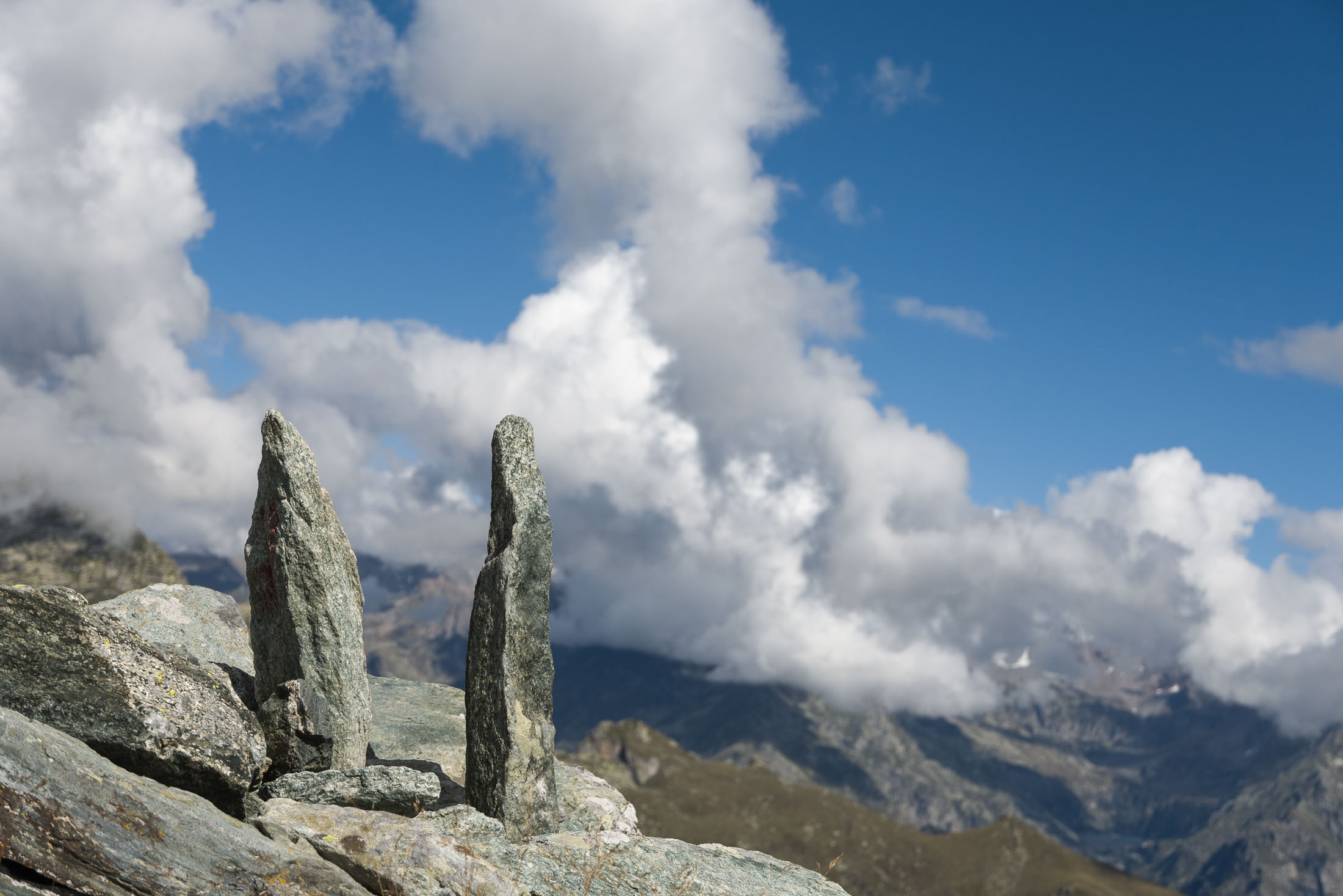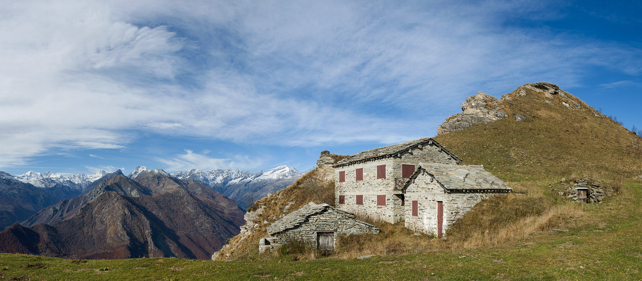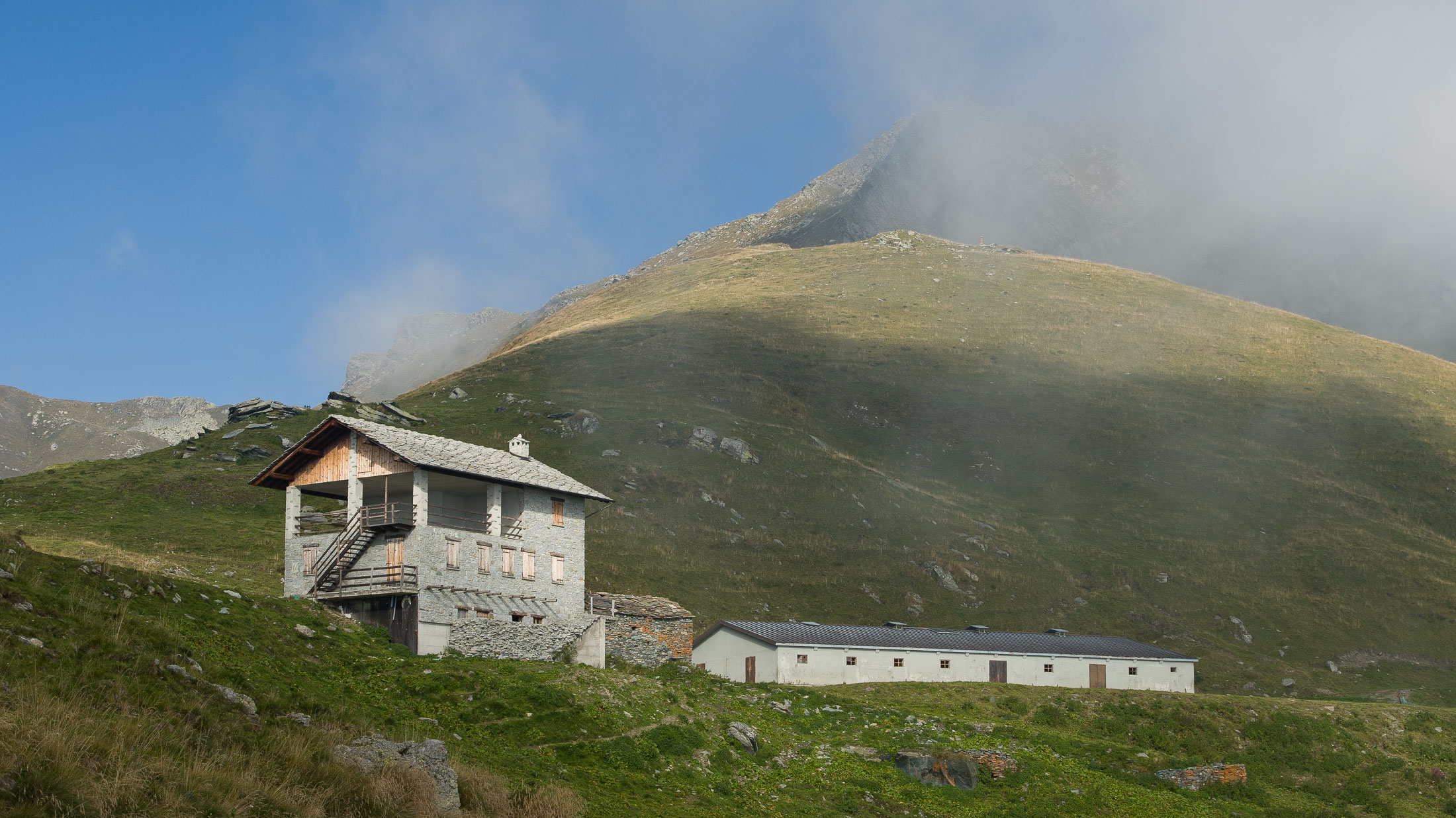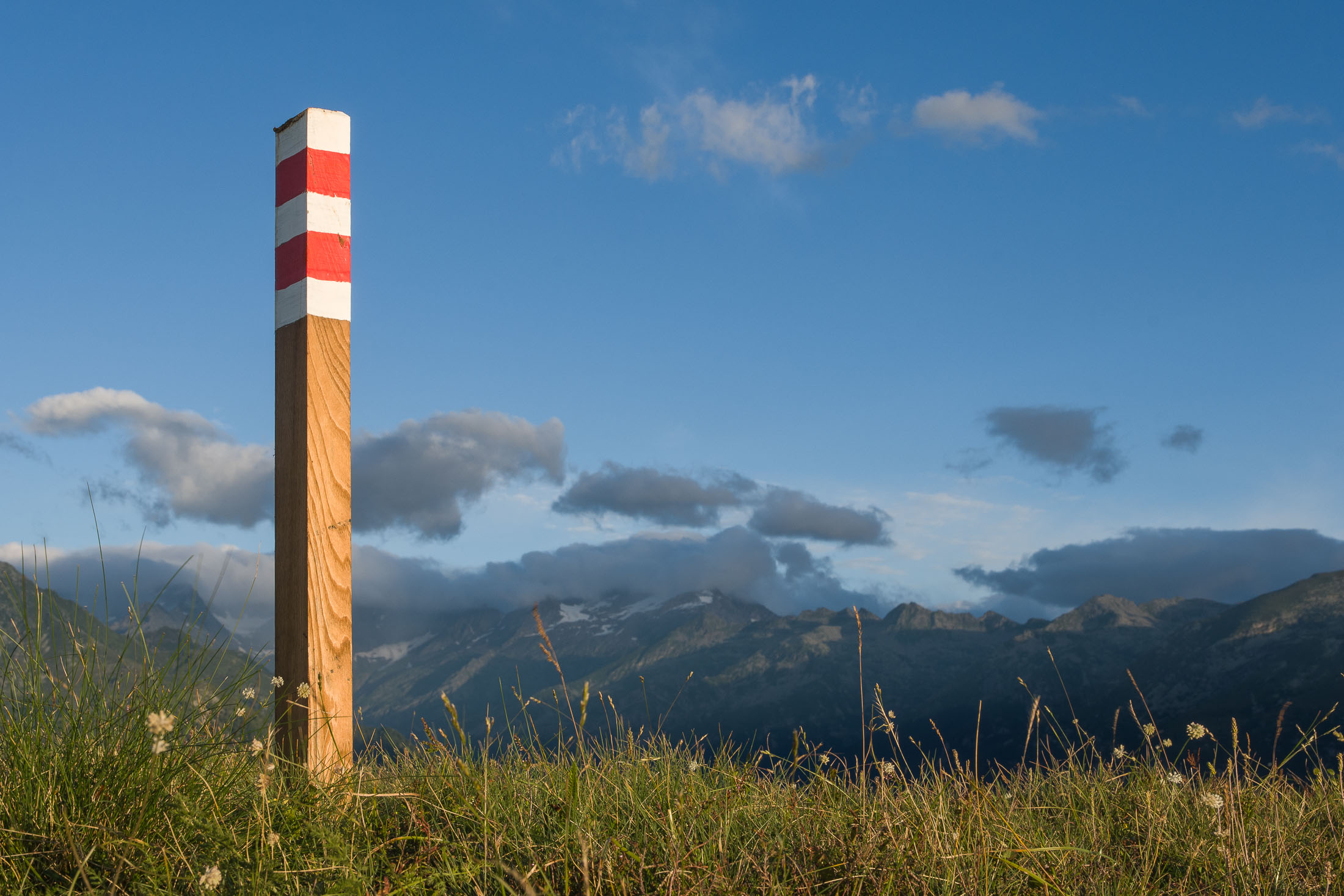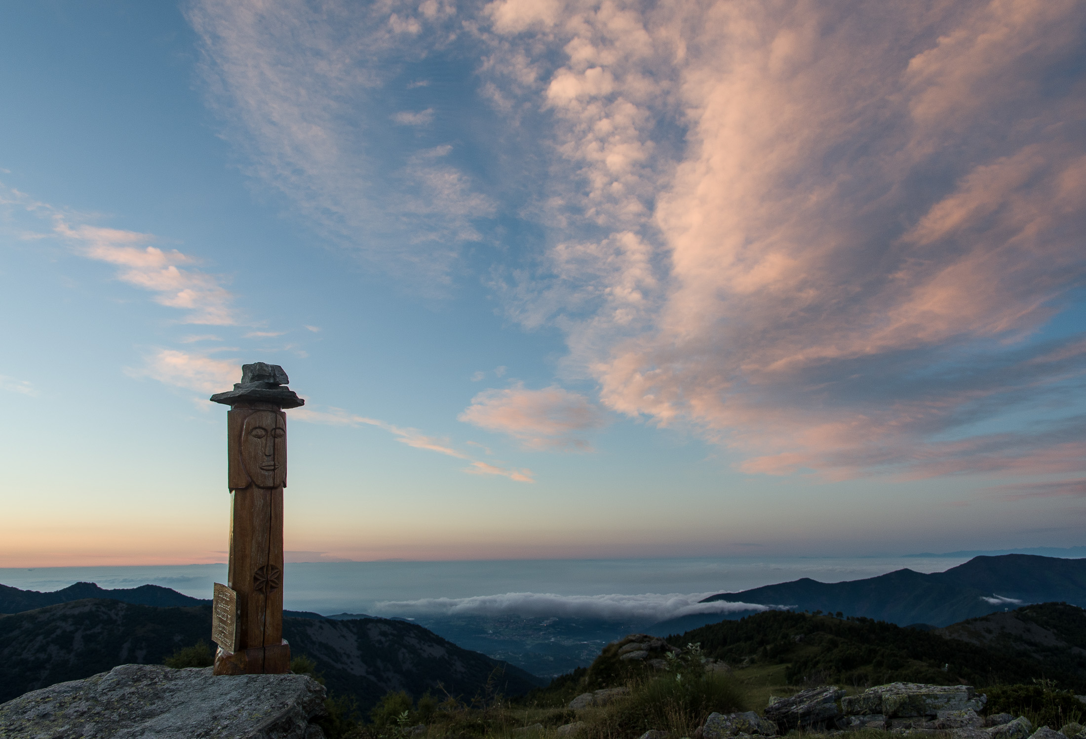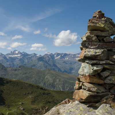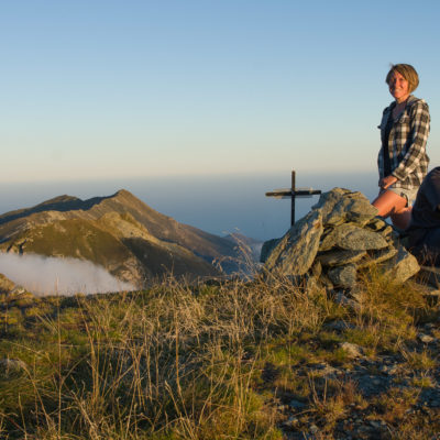 Vom Lago di Monastero sind es nur wenige Schritte bis zur im Sommer bewirtschafteten Alpe di Coassolo (2026 m). Der verbleibende Aufstieg zur Cima La Rossa ist nicht markiert und mehr oder weniger weglos, aber völlig unschwierig, hier und da helfen vereinzelte Steinmännchen bei der Orientierung. Bei dem hier im Sommer oft vorkommenden Nebel sollte man allerdings aufpassen, dass man den Weg nicht verliert. Bei der Alpe di Coassolo verlässt man die Alpstrasse und steigt einfach über die Weiden auf einen nordwestlich gelegenen grasigen Geländerücken, dort trifft man auf einen Viehsteig, der irgendwann ostwärts abknickt. Die spärliche Pfadspur führt zu einer kleinen Verebnungsfläche mit einem riesigen Steinmann, von dort weglos und schwitzend durch hohes Gras weiter bis zu einem von weitem erkennbaren Holzpflock am Ostgrat des Berges, von dort in wenigen Schritten hinauf zum Gipfelkreuz der Cima La Rossa (2319 m). Hier liegt einem die Welt zu Füssen, Johann Wolfgang von Goethe dichtete einst: „Berge sind stille Meister und machen schweigsame Schüler“. Poetisch ist auch das Panorama von hier oben. Im Norden zeigt sich der Gran Paradiso (4061 m) mit all seinen Trabanten, östlich davon der Monte Rosa (4634 m), das zweithöchste Bergmassiv der Alpen, im Westen die Gruppe der Levanne (3619 m) und viele andere namhafte Erhebungen der Valli di Lanzo. Im Osten verliert sich Po-Ebene im immerwährenden Dunst, im Süden grüsst der Monviso (3841 m), bei klarer Sicht blickt man bis in die Seealpen. Auf dem kleinen Gipfelkreuz steht geschrieben: „Quando diventa buio, puoi vedere le stelle – wenn es dunkel wird, kannst du die Sterne sehen“. Dem gibt es nichts hinzuzufügen.