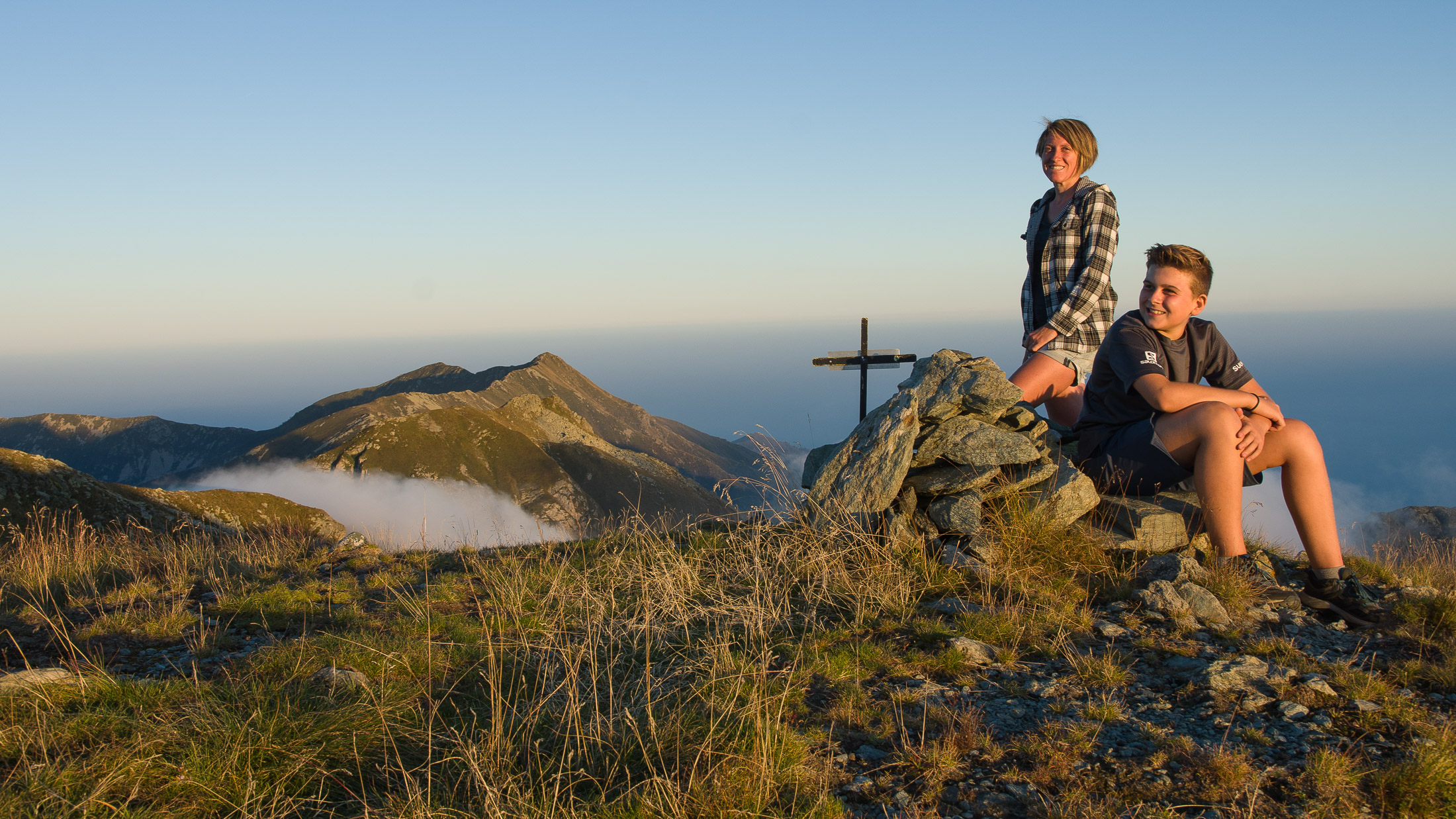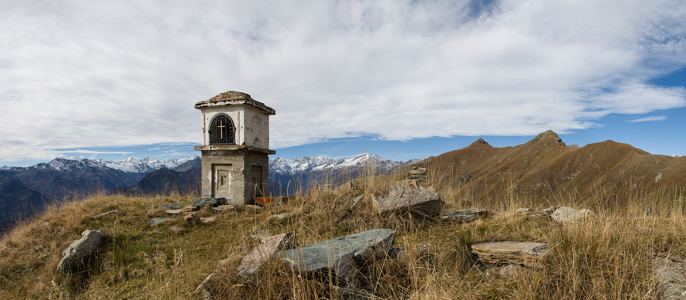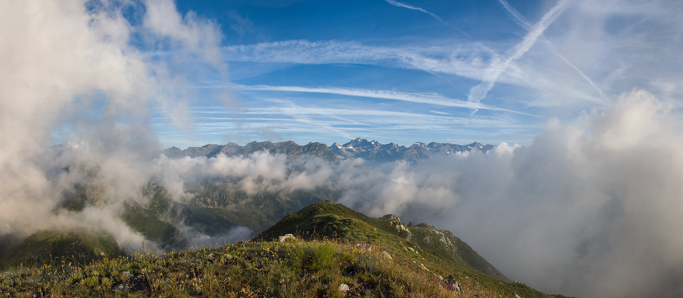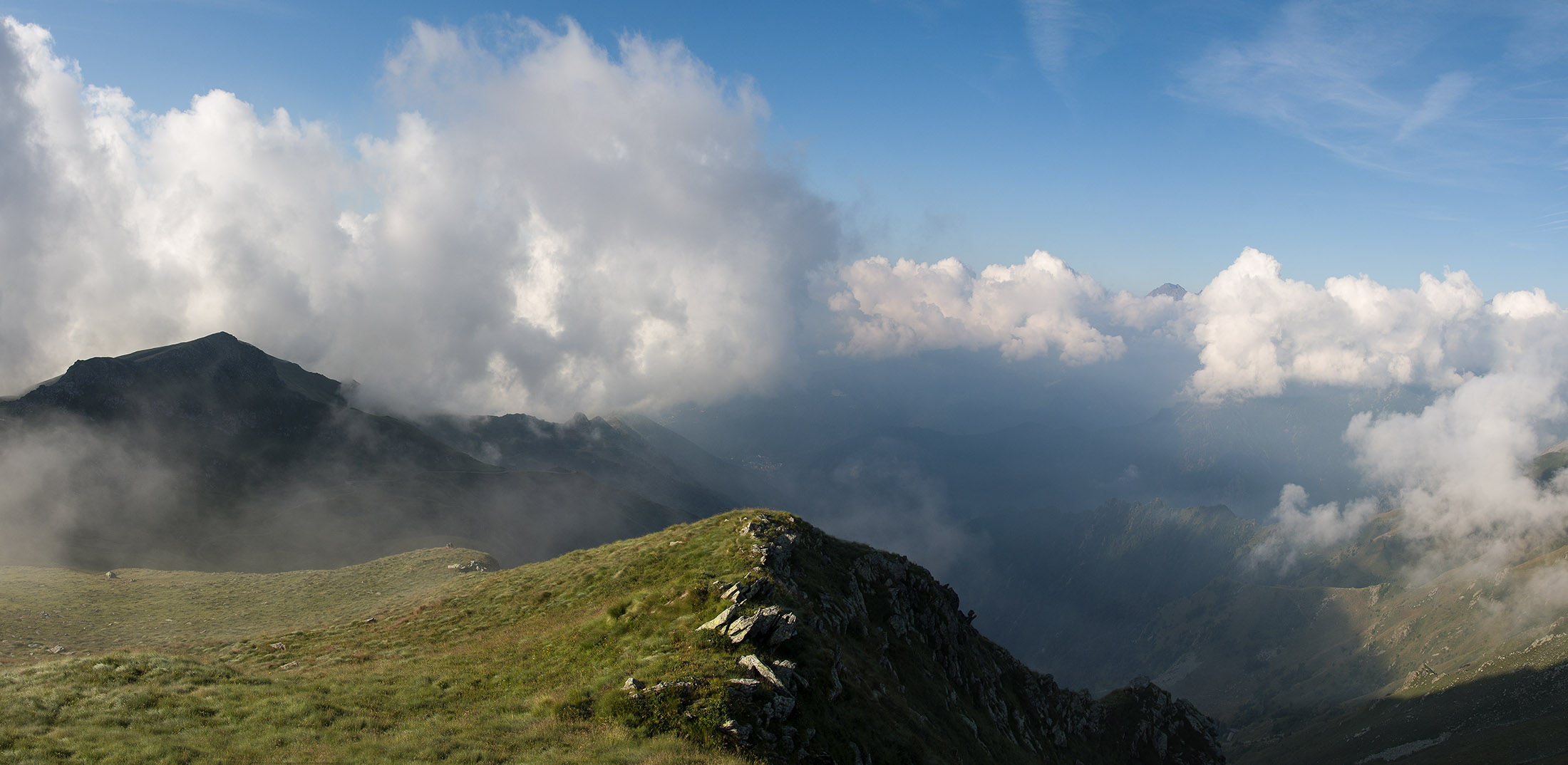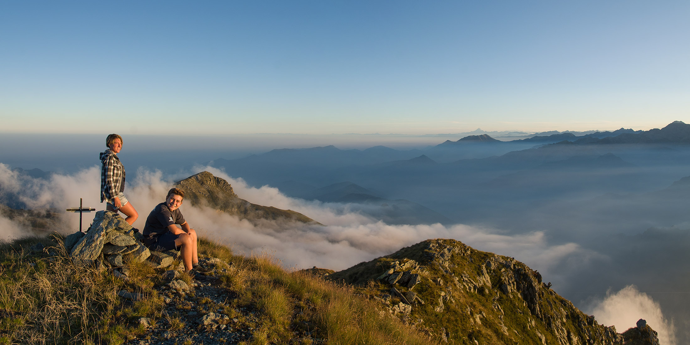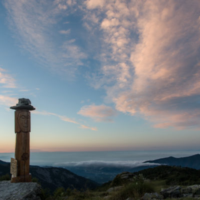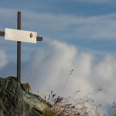 Vom Lago di Monastero sind es nur wenige Schritte bis zur im Sommer bewirtschafteten Alpe di Coassolo (2026 m). Der verbleibende Aufstieg zur Cima La Rossa ist nicht markiert und mehr oder weniger weglos, aber völlig unschwierig, hier und da helfen vereinzelte Steinmännchen bei der Orientierung. Bei dem hier im Sommer oft vorkommenden Nebel sollte man allerdings aufpassen, dass man den Weg nicht verliert. Bei der Alpe di Coassolo verlässt man die Alpstrasse und steigt einfach über die Weiden auf einen nordwestlich gelegenen grasigen Geländerücken, dort trifft man auf einen Viehsteig, der irgendwann ostwärts abknickt. Die spärliche Pfadspur führt zu einer kleinen Verebnungsfläche mit einem riesigen Steinmann, von dort weglos und schwitzend durch hohes Gras weiter bis zu einem von weitem erkennbaren Holzpflock am Ostgrat des Berges, von dort in wenigen Schritten hinauf zum Gipfelkreuz der Cima La Rossa (2319 m). Hier liegt einem die Welt zu Füssen, Johann Wolfgang von Goethe dichtete einst: „Berge sind stille Meister und machen schweigsame Schüler“. Poetisch ist auch das Panorama von hier oben. Im Norden zeigt sich der Gran Paradiso (4061 m) mit all seinen Trabanten, östlich davon der Monte Rosa (4634 m), das zweithöchste Bergmassiv der Alpen, im Westen die Gruppe der Levanne (3619 m) und viele andere namhafte Erhebungen der Valli di Lanzo. Im Osten verliert sich Po-Ebene im immerwährenden Dunst, im Süden grüsst der Monviso (3841 m), bei klarer Sicht blickt man bis in die Seealpen. Auf dem kleinen Gipfelkreuz steht geschrieben: „Quando diventa buio, puoi vedere le stelle – wenn es dunkel wird, kannst du die Sterne sehen“. Dem gibt es nichts hinzuzufügen.