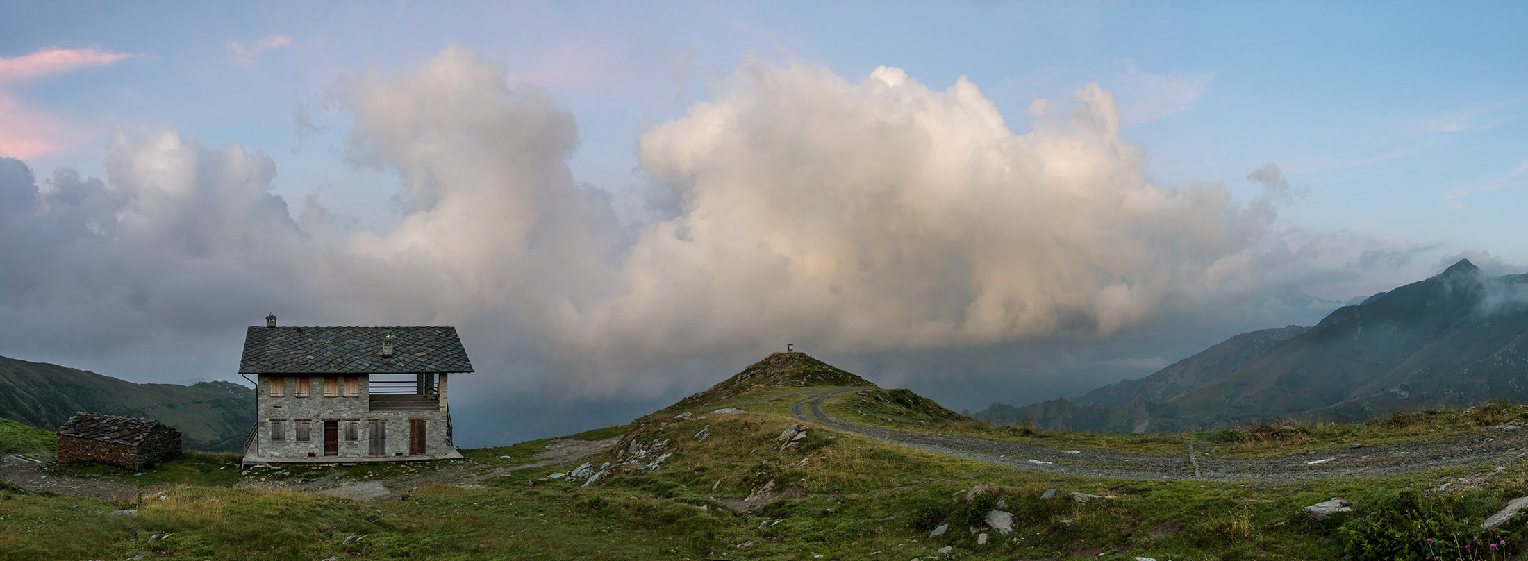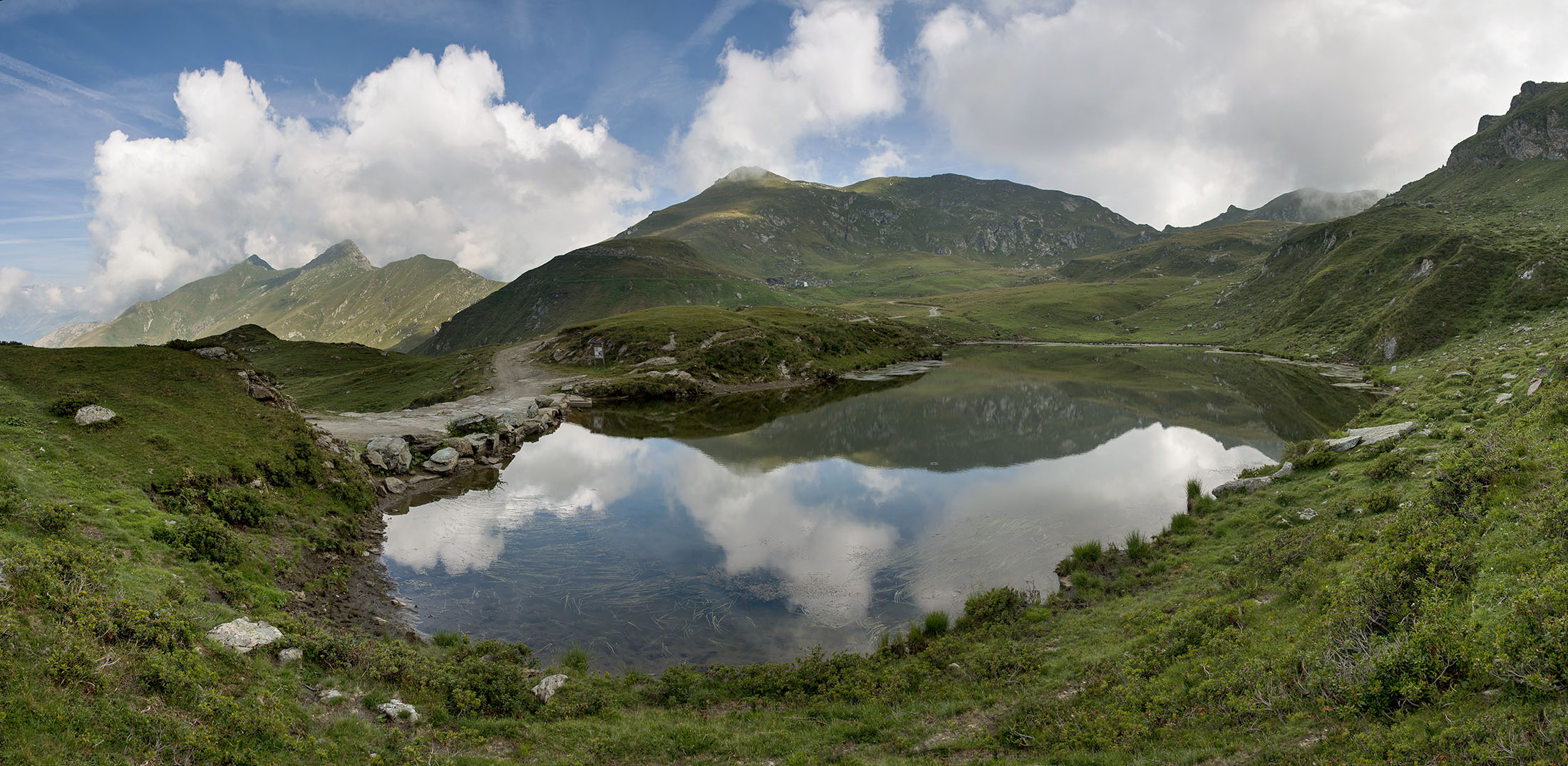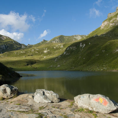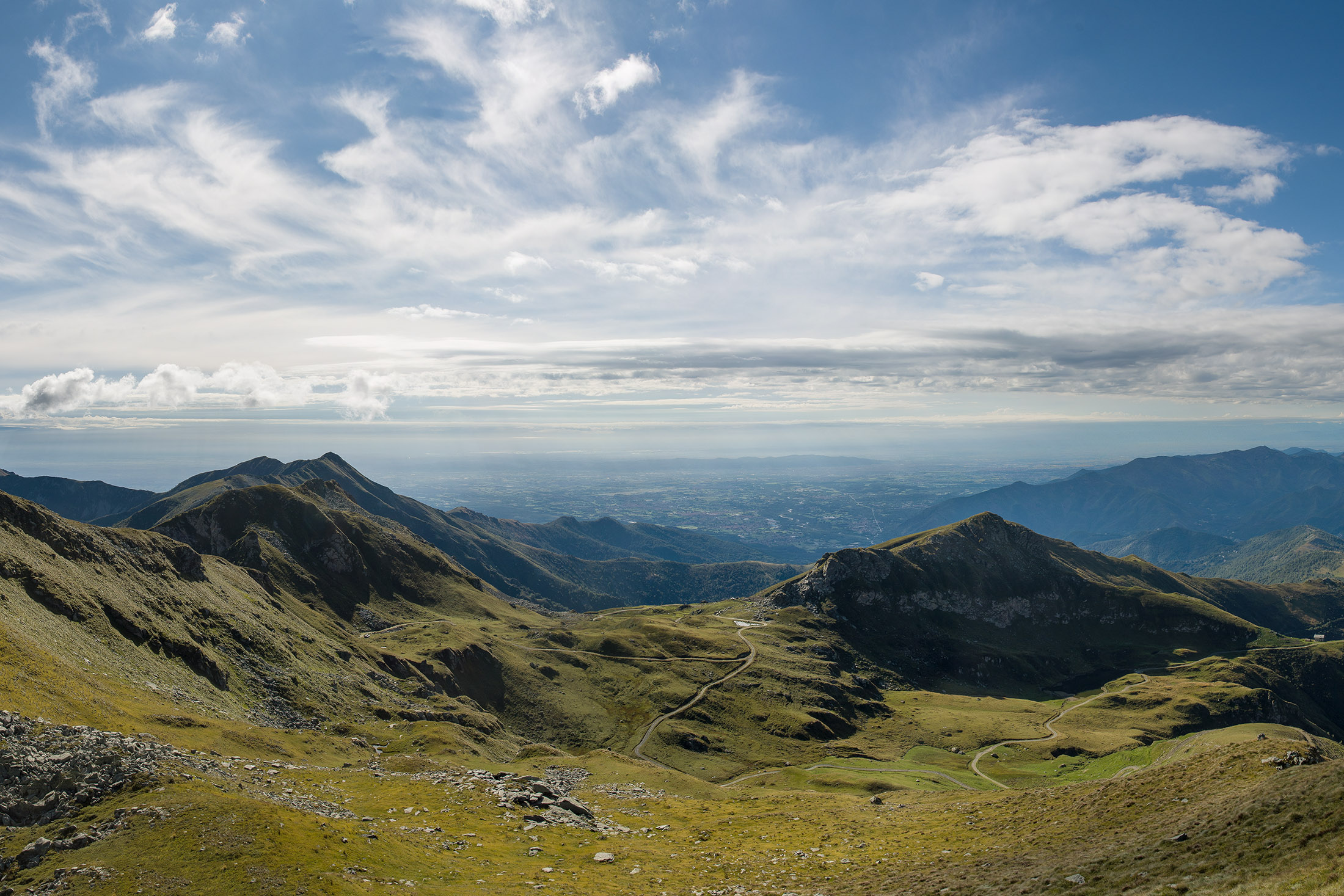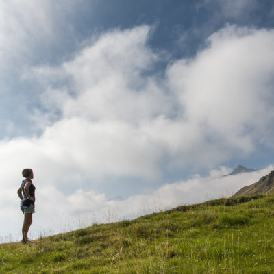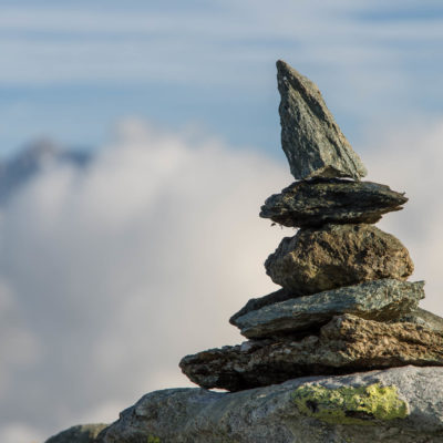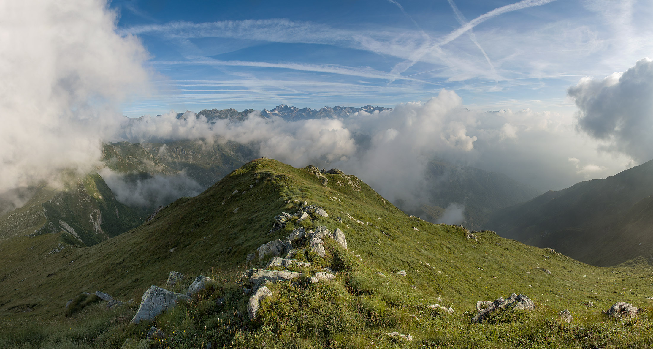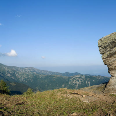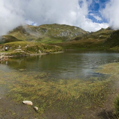 Vom Lago di Monastero sind es nur wenige Schritte bis zur im Sommer bewirtschafteten Alpe di Coassolo (2026 m). Der verbleibende Aufstieg zur Cima La Rossa ist nicht markiert und mehr oder weniger weglos, aber völlig unschwierig, hier und da helfen vereinzelte Steinmännchen bei der Orientierung. Bei dem hier im Sommer oft vorkommenden Nebel sollte man allerdings aufpassen, dass man den Weg nicht verliert. Bei der Alpe di Coassolo verlässt man die Alpstrasse und steigt einfach über die Weiden auf einen nordwestlich gelegenen grasigen Geländerücken, dort trifft man auf einen Viehsteig, der irgendwann ostwärts abknickt. Die spärliche Pfadspur führt zu einer kleinen Verebnungsfläche mit einem riesigen Steinmann, von dort weglos und schwitzend durch hohes Gras weiter bis zu einem von weitem erkennbaren Holzpflock am Ostgrat des Berges, von dort in wenigen Schritten hinauf zum Gipfelkreuz der Cima La Rossa (2319 m). Hier liegt einem die Welt zu Füssen, Johann Wolfgang von Goethe dichtete einst: „Berge sind stille Meister und machen schweigsame Schüler“. Poetisch ist auch das Panorama von hier oben. Im Norden zeigt sich der Gran Paradiso (4061 m) mit all seinen Trabanten, östlich davon der Monte Rosa (4634 m), das zweithöchste Bergmassiv der Alpen, im Westen die Gruppe der Levanne (3619 m) und viele andere namhafte Erhebungen der Valli di Lanzo. Im Osten verliert sich Po-Ebene im immerwährenden Dunst, im Süden grüsst der Monviso (3841 m), bei klarer Sicht blickt man bis in die Seealpen. Auf dem kleinen Gipfelkreuz steht geschrieben: „Quando diventa buio, puoi vedere le stelle – wenn es dunkel wird, kannst du die Sterne sehen“. Dem gibt es nichts hinzuzufügen.