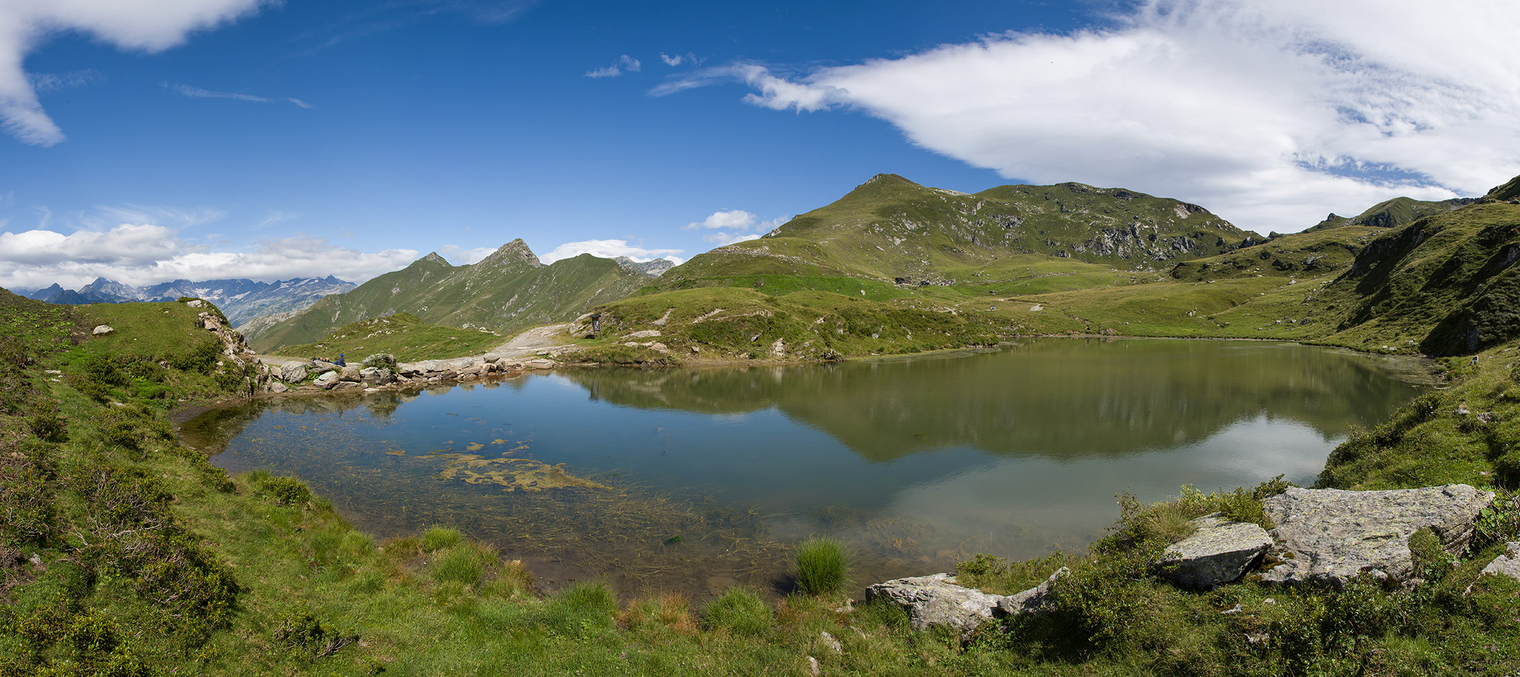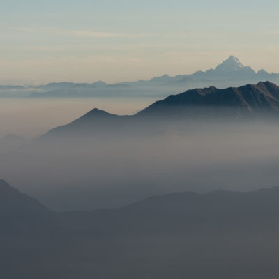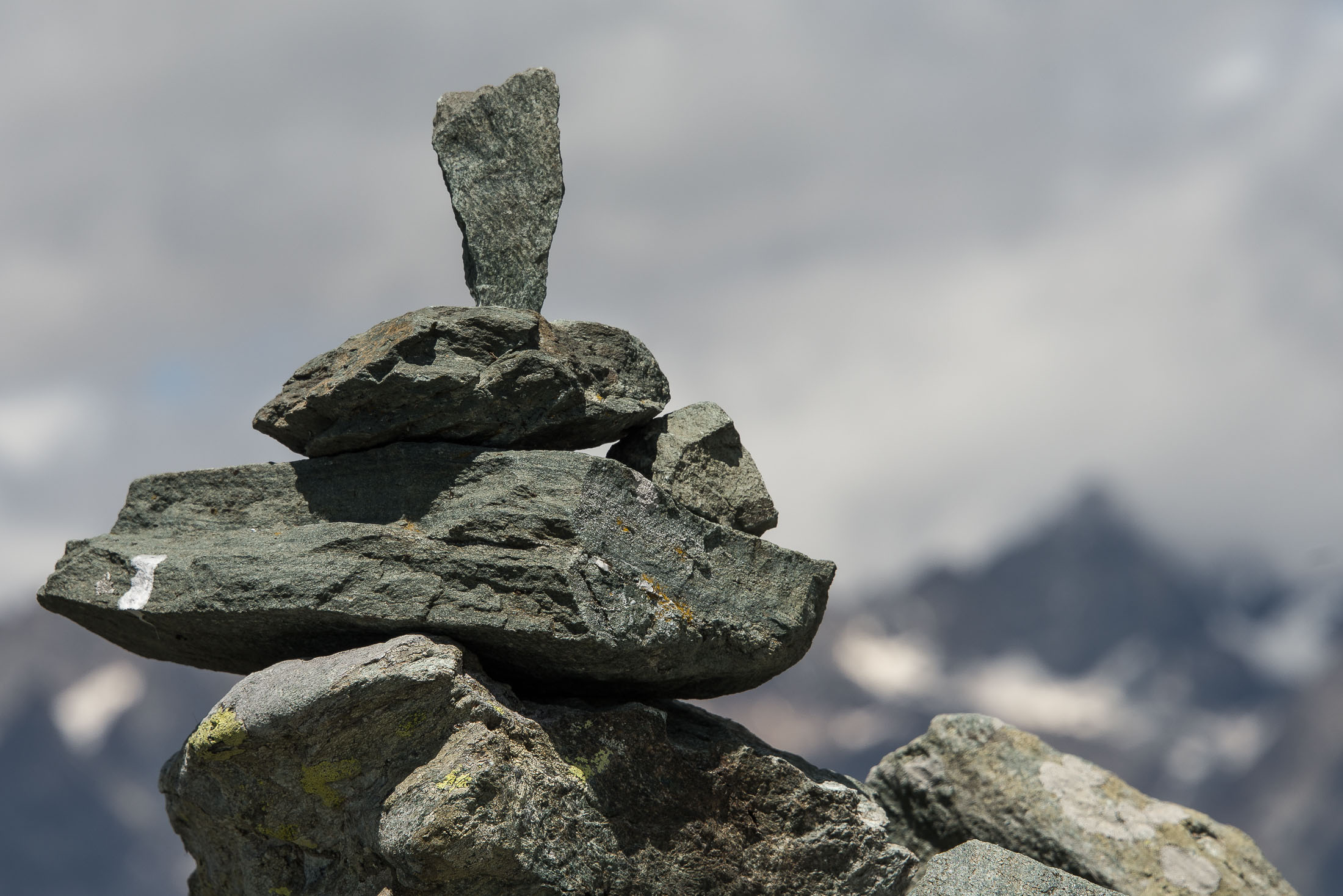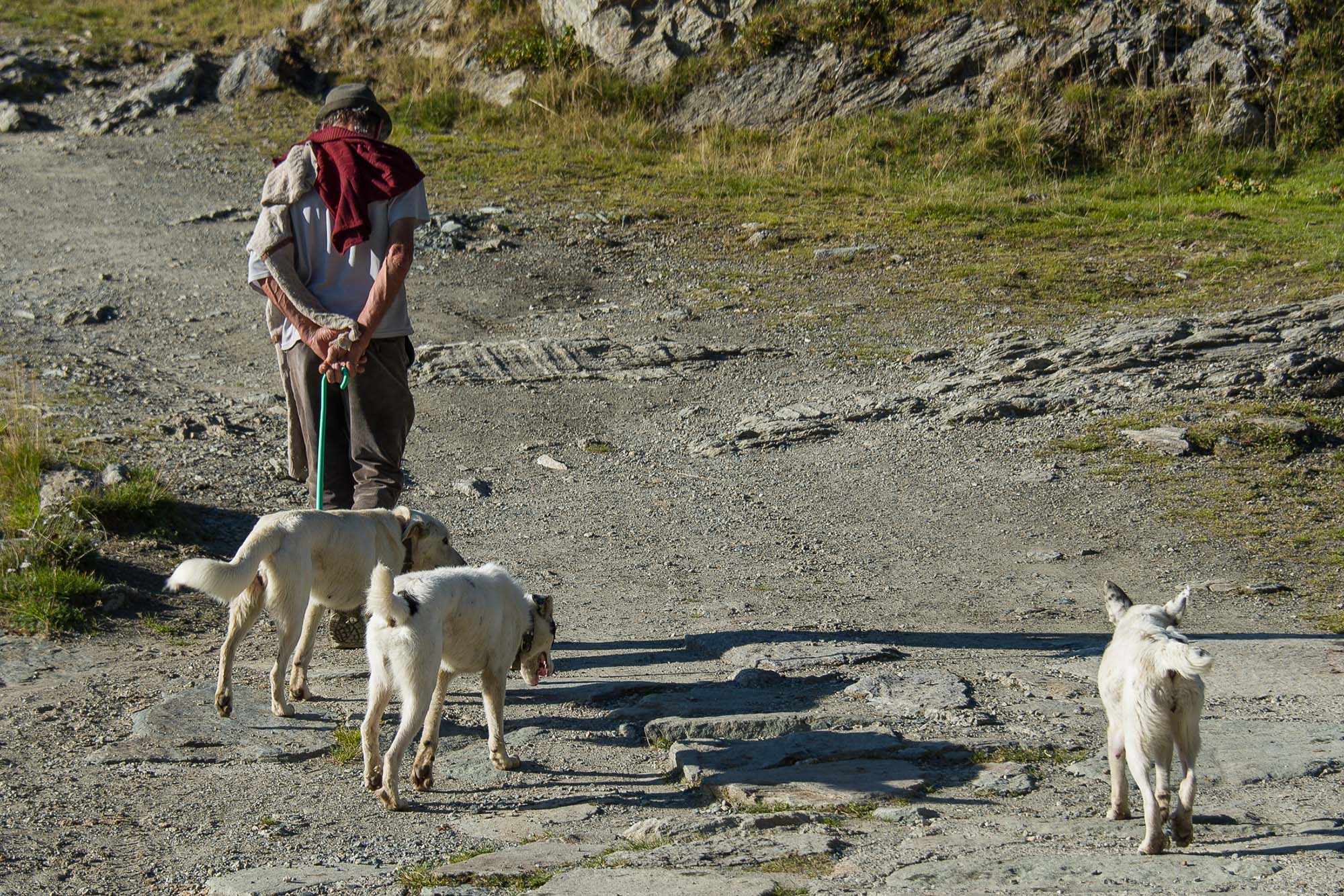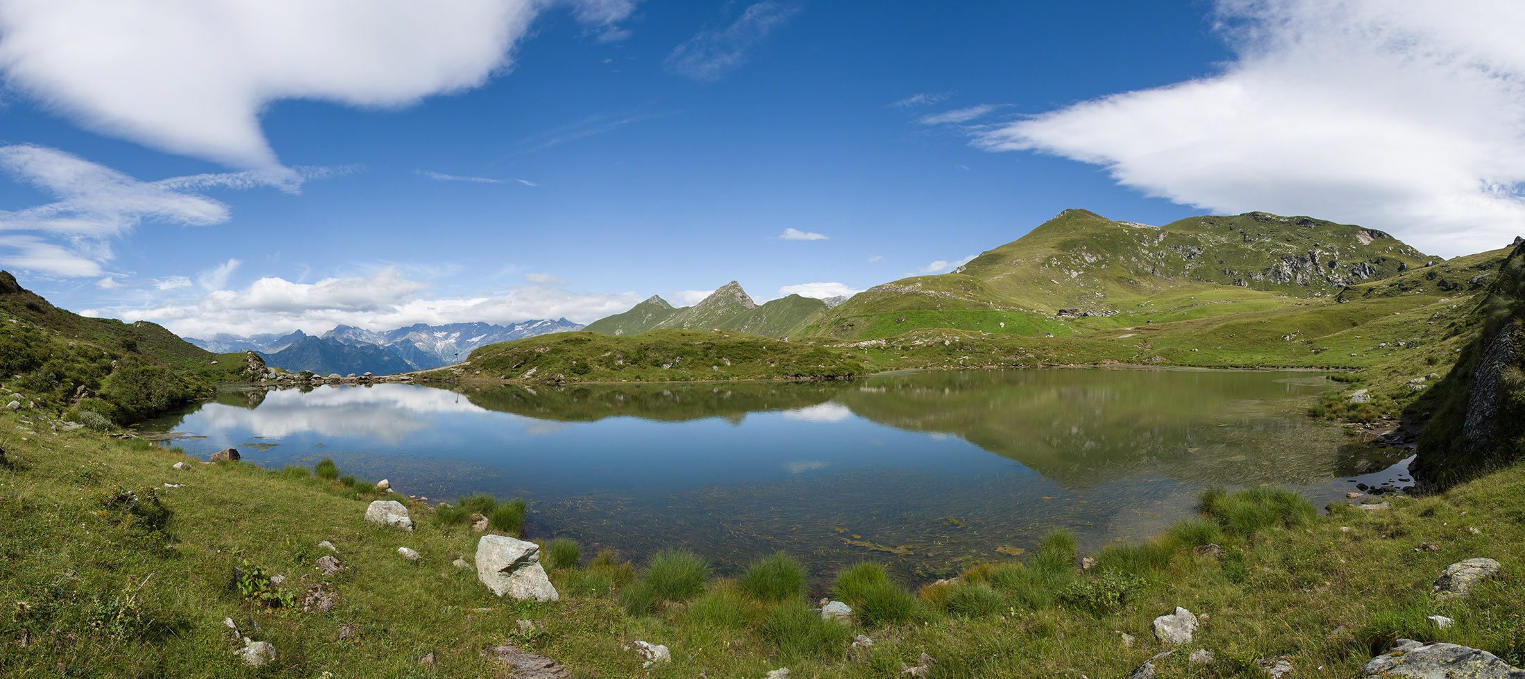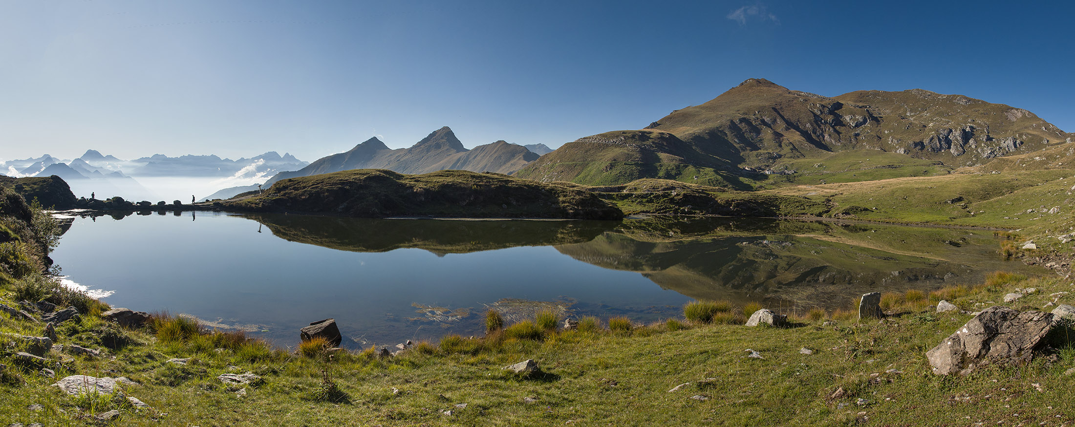 Vom Lago di Monastero sind es nur wenige Schritte bis zur im Sommer bewirtschafteten Alpe di Coassolo (2026 m). Der verbleibende Aufstieg zur Cima La Rossa ist nicht markiert und mehr oder weniger weglos, aber völlig unschwierig, hier und da helfen vereinzelte Steinmännchen bei der Orientierung. Bei dem hier im Sommer oft vorkommenden Nebel sollte man allerdings aufpassen, dass man den Weg nicht verliert. Bei der Alpe di Coassolo verlässt man die Alpstrasse und steigt einfach über die Weiden auf einen nordwestlich gelegenen grasigen Geländerücken, dort trifft man auf einen Viehsteig, der irgendwann ostwärts abknickt. Die spärliche Pfadspur führt zu einer kleinen Verebnungsfläche mit einem riesigen Steinmann, von dort weglos und schwitzend durch hohes Gras weiter bis zu einem von weitem erkennbaren Holzpflock am Ostgrat des Berges, von dort in wenigen Schritten hinauf zum Gipfelkreuz der Cima La Rossa (2319 m). Hier liegt einem die Welt zu Füssen, Johann Wolfgang von Goethe dichtete einst: „Berge sind stille Meister und machen schweigsame Schüler“. Poetisch ist auch das Panorama von hier oben. Im Norden zeigt sich der Gran Paradiso (4061 m) mit all seinen Trabanten, östlich davon der Monte Rosa (4634 m), das zweithöchste Bergmassiv der Alpen, im Westen die Gruppe der Levanne (3619 m) und viele andere namhafte Erhebungen der Valli di Lanzo. Im Osten verliert sich Po-Ebene im immerwährenden Dunst, im Süden grüsst der Monviso (3841 m), bei klarer Sicht blickt man bis in die Seealpen. Auf dem kleinen Gipfelkreuz steht geschrieben: „Quando diventa buio, puoi vedere le stelle – wenn es dunkel wird, kannst du die Sterne sehen“. Dem gibt es nichts hinzuzufügen.