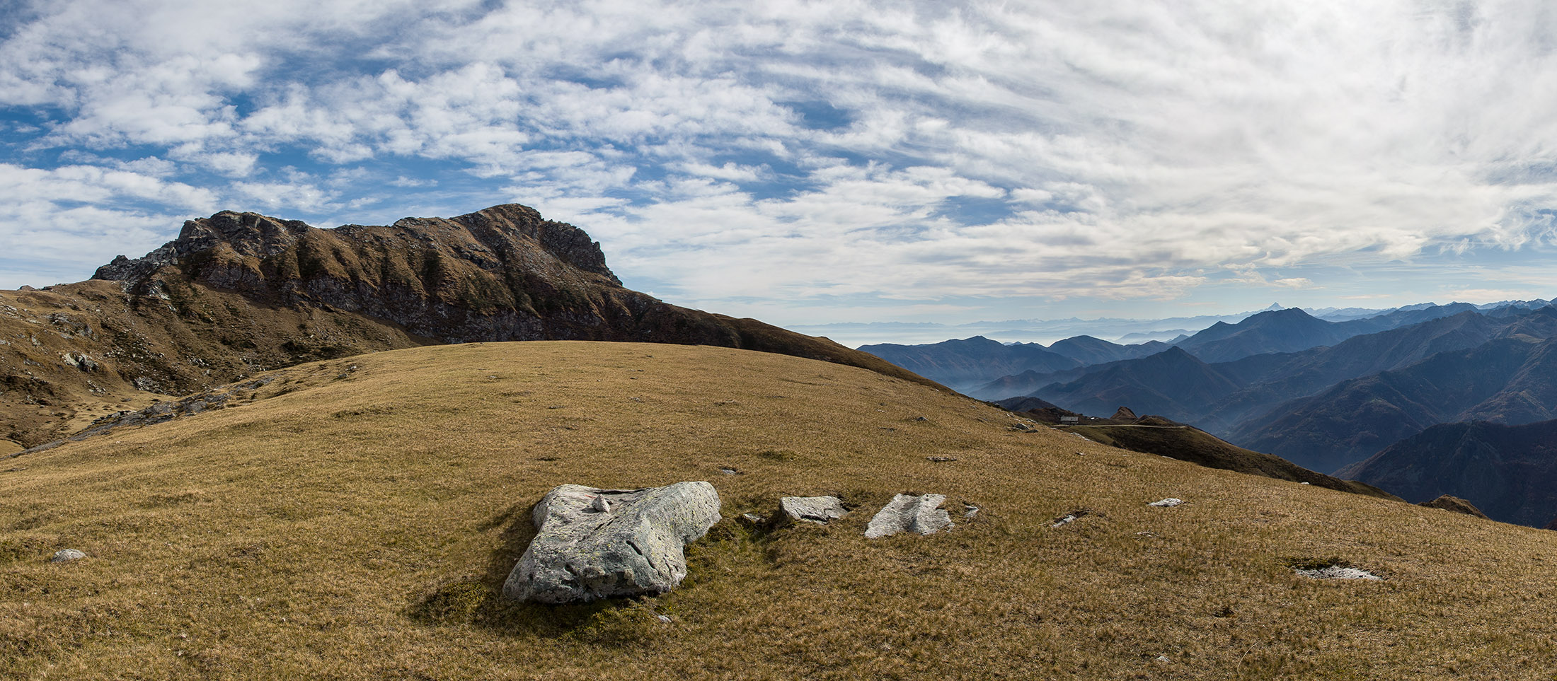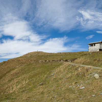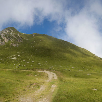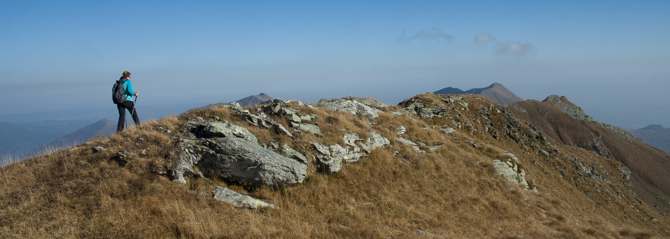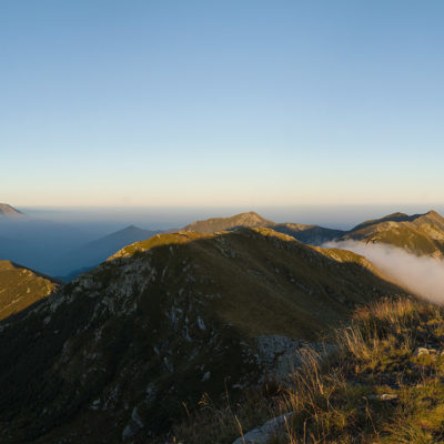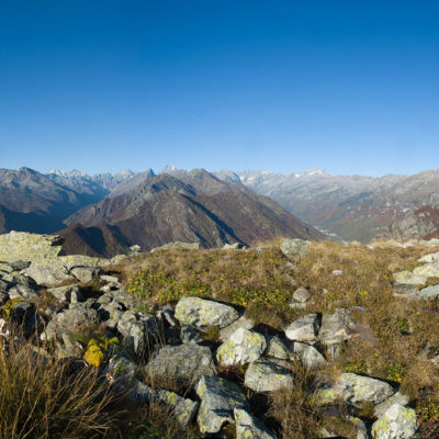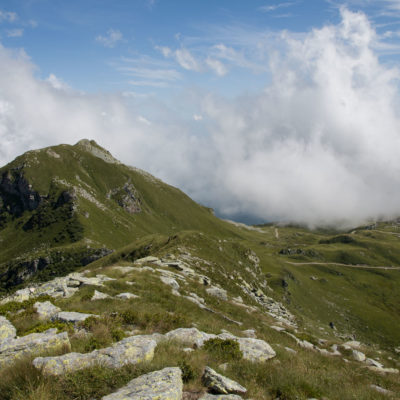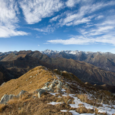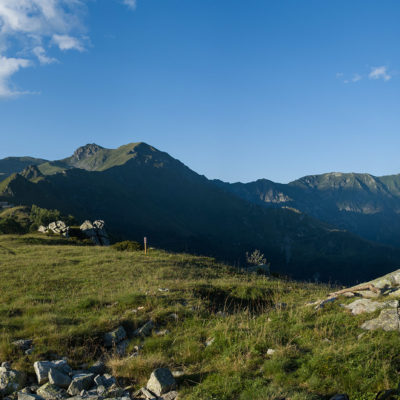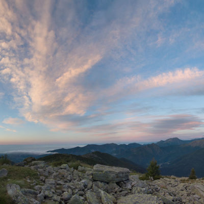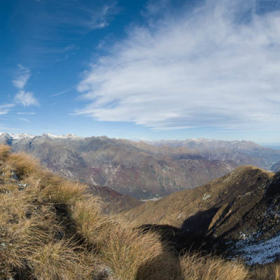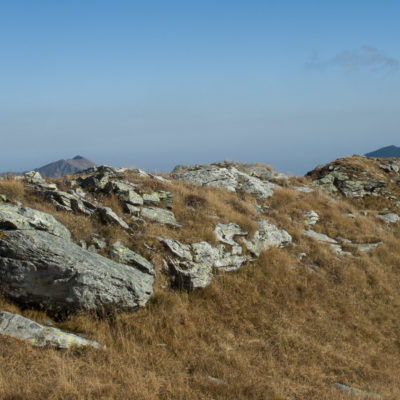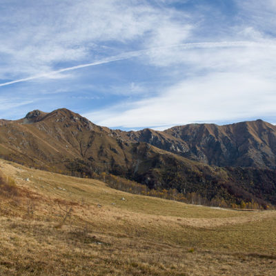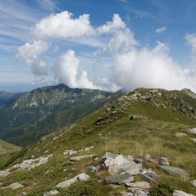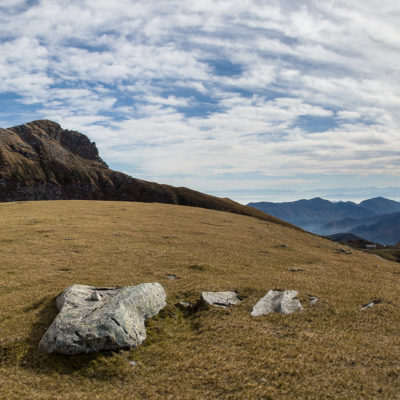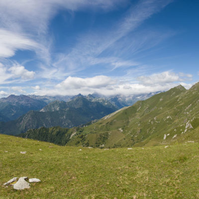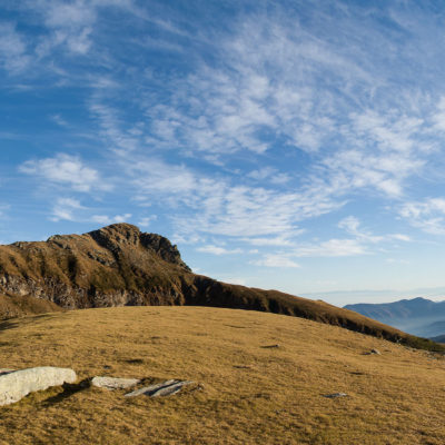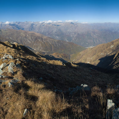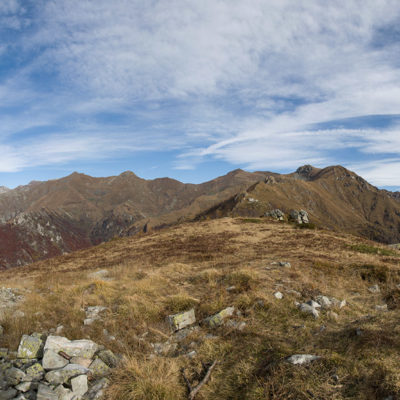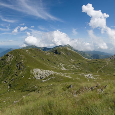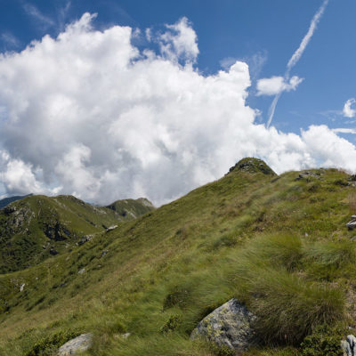 Alternativ bietet sich zuvor noch ein lohnender Schlenker an. Vom Gipfelkreuz steigt man über den Ostgrat etwa 50 Höhenmeter ab bis zu einer grasigen Verebnungsfläche. Von dort steil hinauf auf den östlich gelegenen namenlosen Nebengipfel. Weiter über glattgeschliffene Felsplatten über den breiten und unschwierig zu begehenden Kamm, dann auf spärlichen Wegspuren hinab zu einer grossen Weide nördlich des Colle di Perascritta (2158 m), wo man auf einen markierten Weg trifft. Jenseits des Passes mündet der Weg in einen geschotterten Fahrweg, auf dem man zur Alpe di Coassolo (2026 m) zurückkehrt. Wer noch überschüssige Energie in den Knochen hat kann vom Colle di Perascritta noch einen weiteren Abstecher auf die Punta dell‘Aggia (2254 m) machen, etwa 45 Minuten hin und zurück. Der weglose und nicht markierte Aufstieg durch die steile grasige Westflanke ist bisweilen ein wenig mühsam, aber technisch unschwierig.