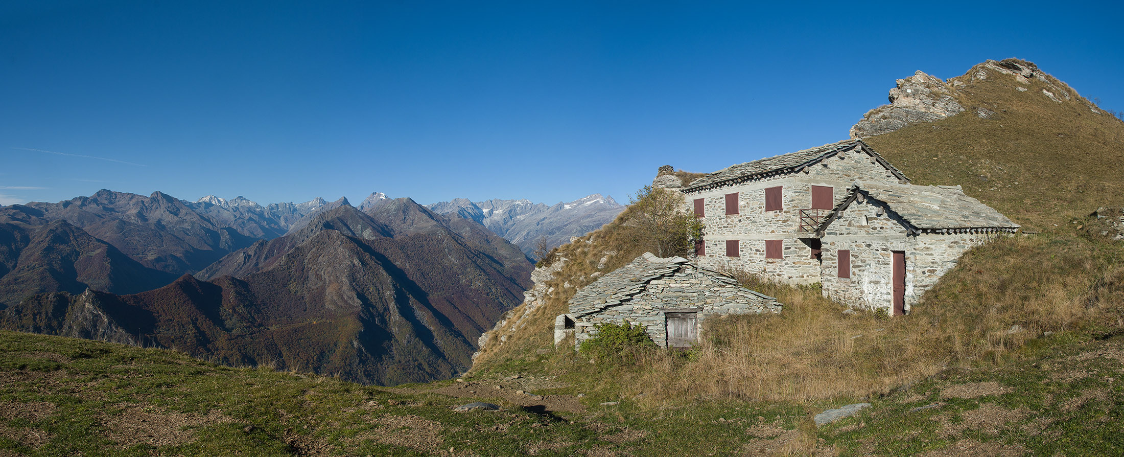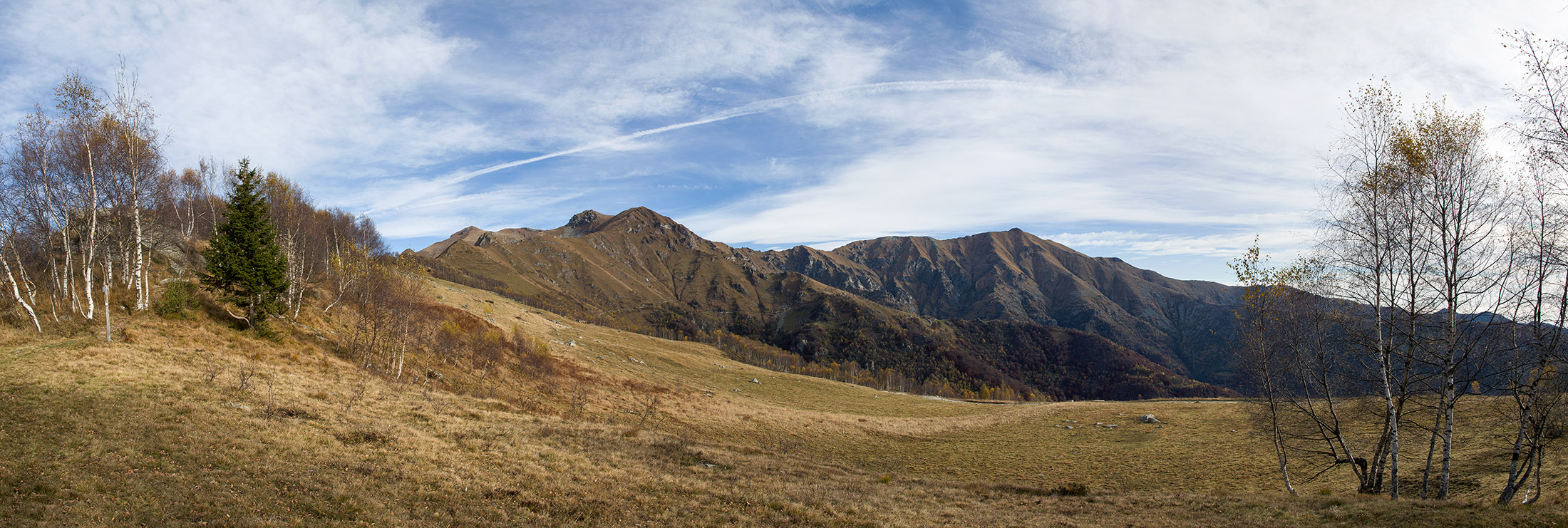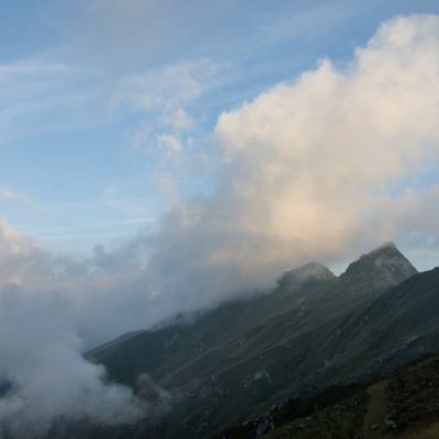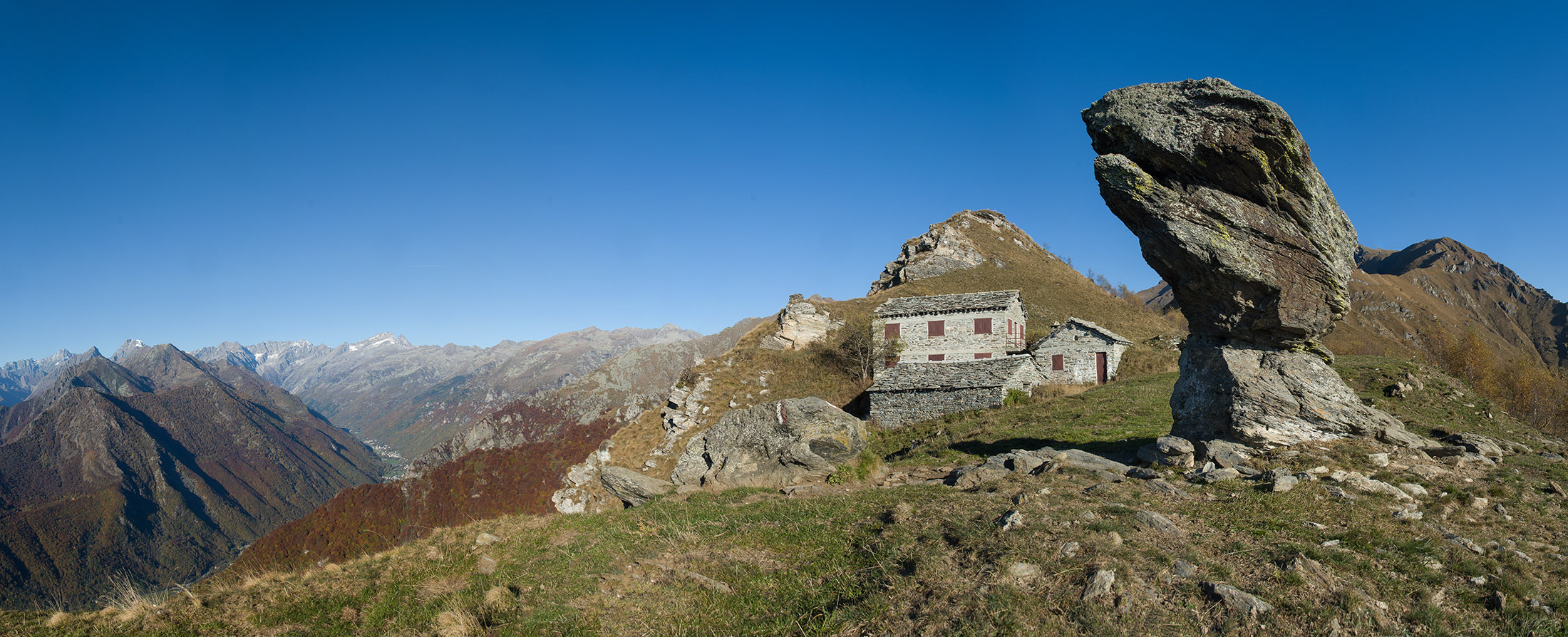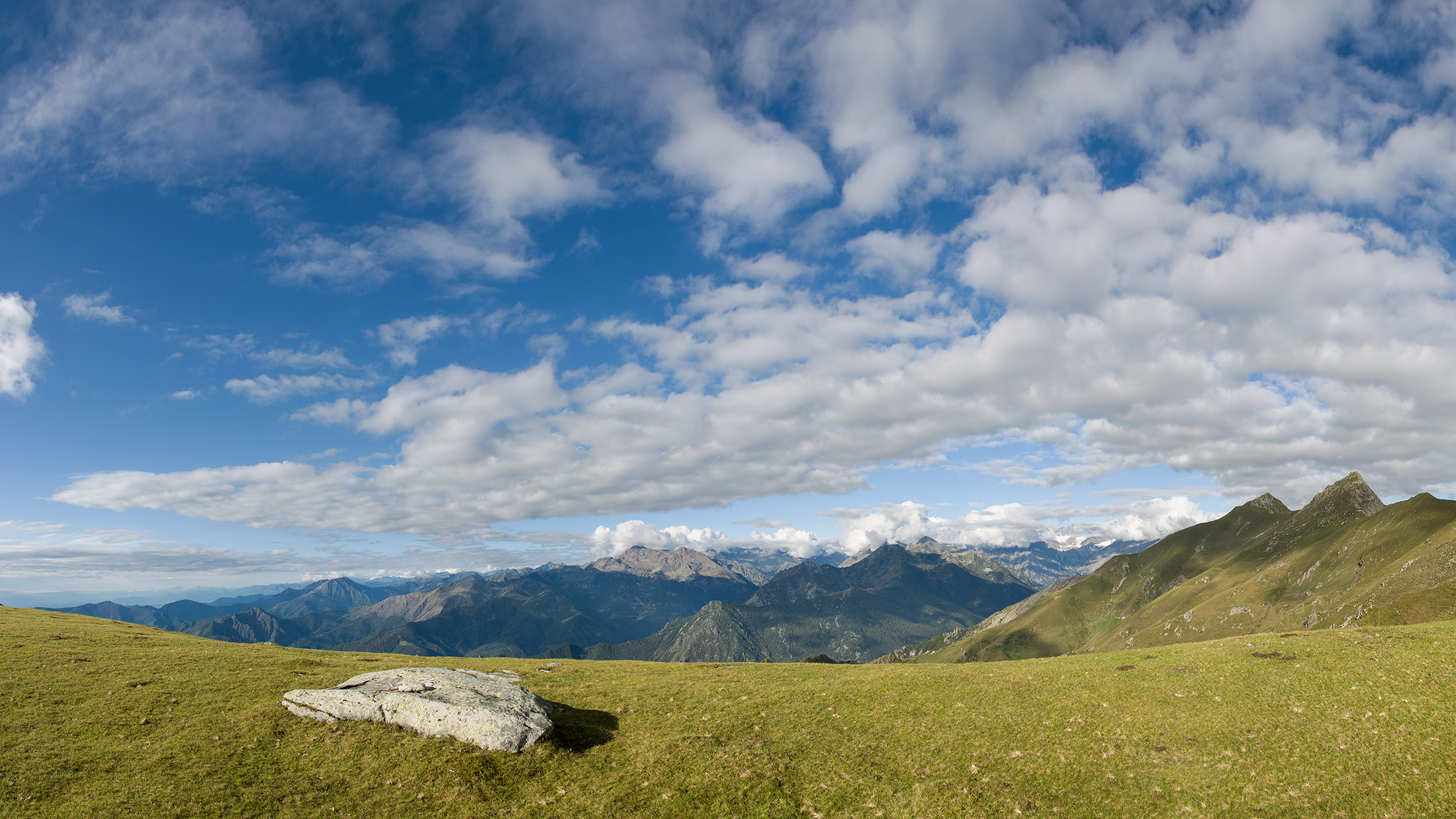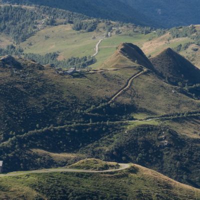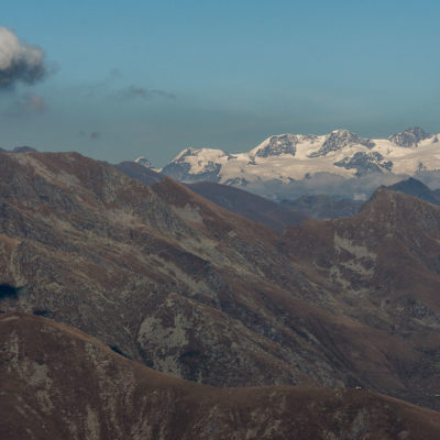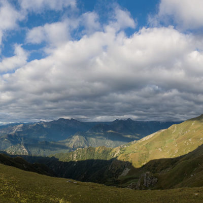 Alternativ bietet sich zuvor noch ein lohnender Schlenker an. Vom Gipfelkreuz steigt man über den Ostgrat etwa 50 Höhenmeter ab bis zu einer grasigen Verebnungsfläche. Von dort steil hinauf auf den östlich gelegenen namenlosen Nebengipfel. Weiter über glattgeschliffene Felsplatten über den breiten und unschwierig zu begehenden Kamm, dann auf spärlichen Wegspuren hinab zu einer grossen Weide nördlich des Colle di Perascritta (2158 m), wo man auf einen markierten Weg trifft. Jenseits des Passes mündet der Weg in einen geschotterten Fahrweg, auf dem man zur Alpe di Coassolo (2026 m) zurückkehrt. Wer noch überschüssige Energie in den Knochen hat kann vom Colle di Perascritta noch einen weiteren Abstecher auf die Punta dell‘Aggia (2254 m) machen, etwa 45 Minuten hin und zurück. Der weglose und nicht markierte Aufstieg durch die steile grasige Westflanke ist bisweilen ein wenig mühsam, aber technisch unschwierig.