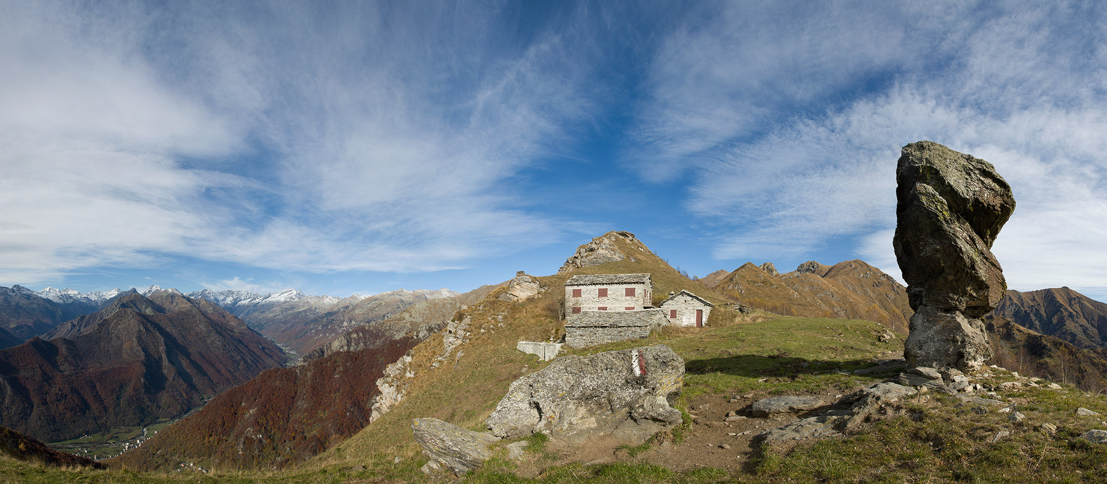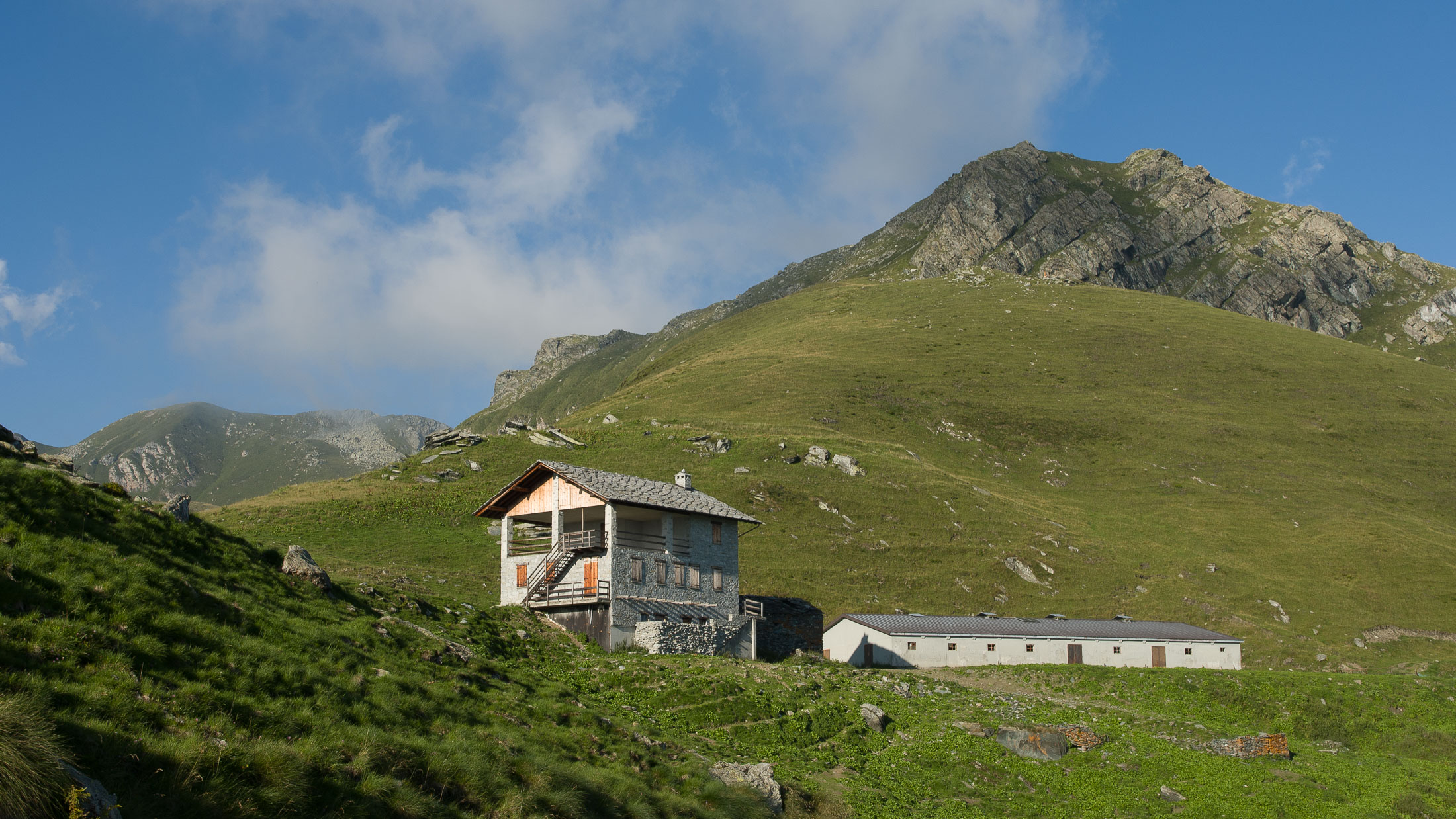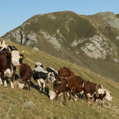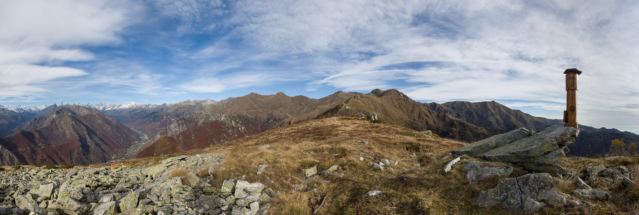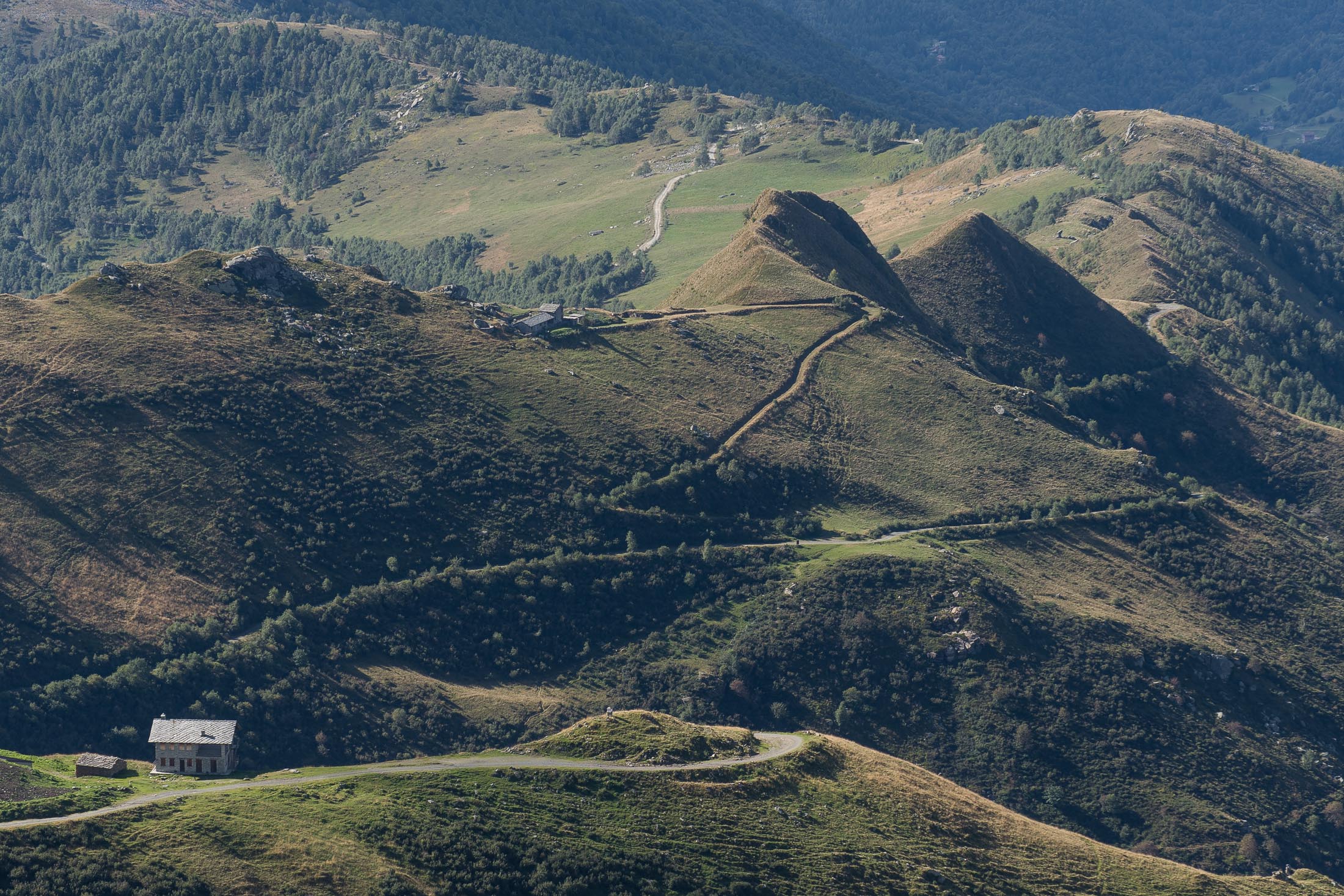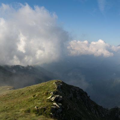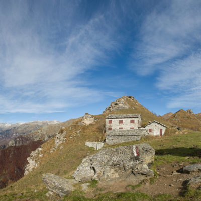 Alternativ bietet sich zuvor noch ein lohnender Schlenker an. Vom Gipfelkreuz steigt man über den Ostgrat etwa 50 Höhenmeter ab bis zu einer grasigen Verebnungsfläche. Von dort steil hinauf auf den östlich gelegenen namenlosen Nebengipfel. Weiter über glattgeschliffene Felsplatten über den breiten und unschwierig zu begehenden Kamm, dann auf spärlichen Wegspuren hinab zu einer grossen Weide nördlich des Colle di Perascritta (2158 m), wo man auf einen markierten Weg trifft. Jenseits des Passes mündet der Weg in einen geschotterten Fahrweg, auf dem man zur Alpe di Coassolo (2026 m) zurückkehrt. Wer noch überschüssige Energie in den Knochen hat kann vom Colle di Perascritta noch einen weiteren Abstecher auf die Punta dell‘Aggia (2254 m) machen, etwa 45 Minuten hin und zurück. Der weglose und nicht markierte Aufstieg durch die steile grasige Westflanke ist bisweilen ein wenig mühsam, aber technisch unschwierig.