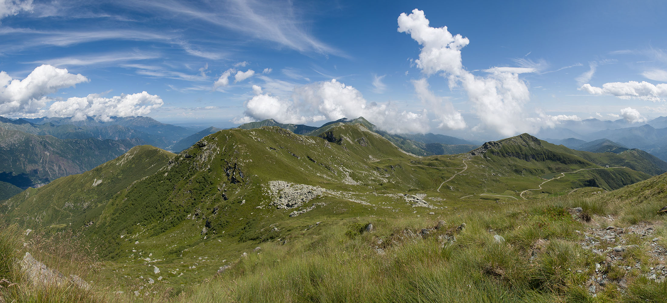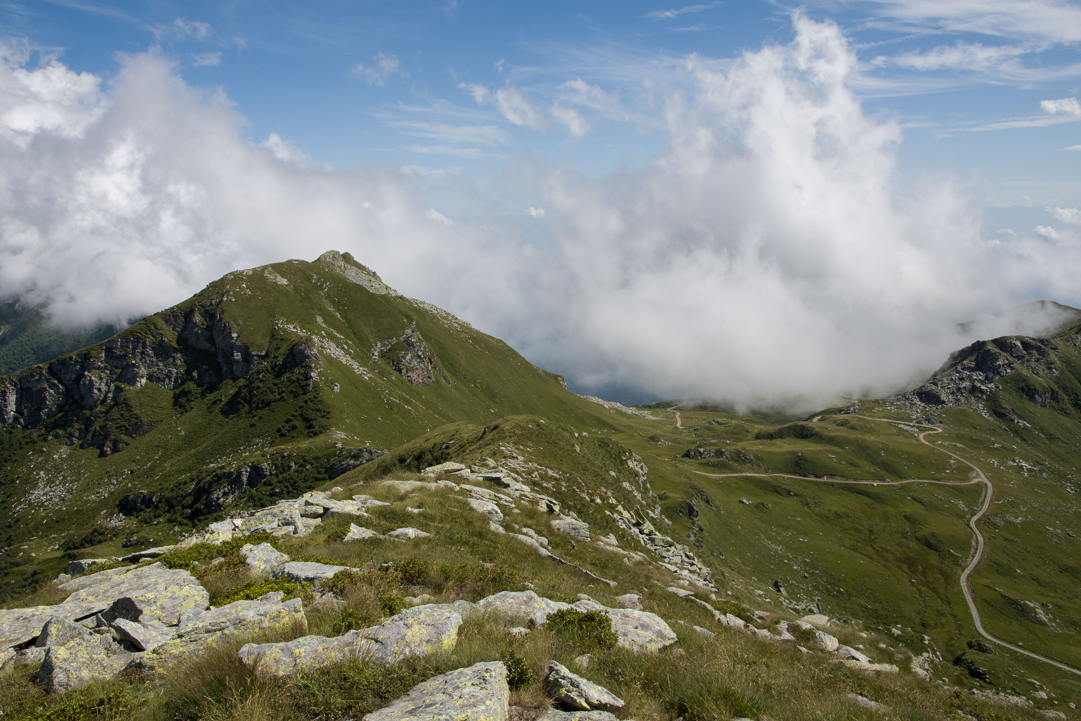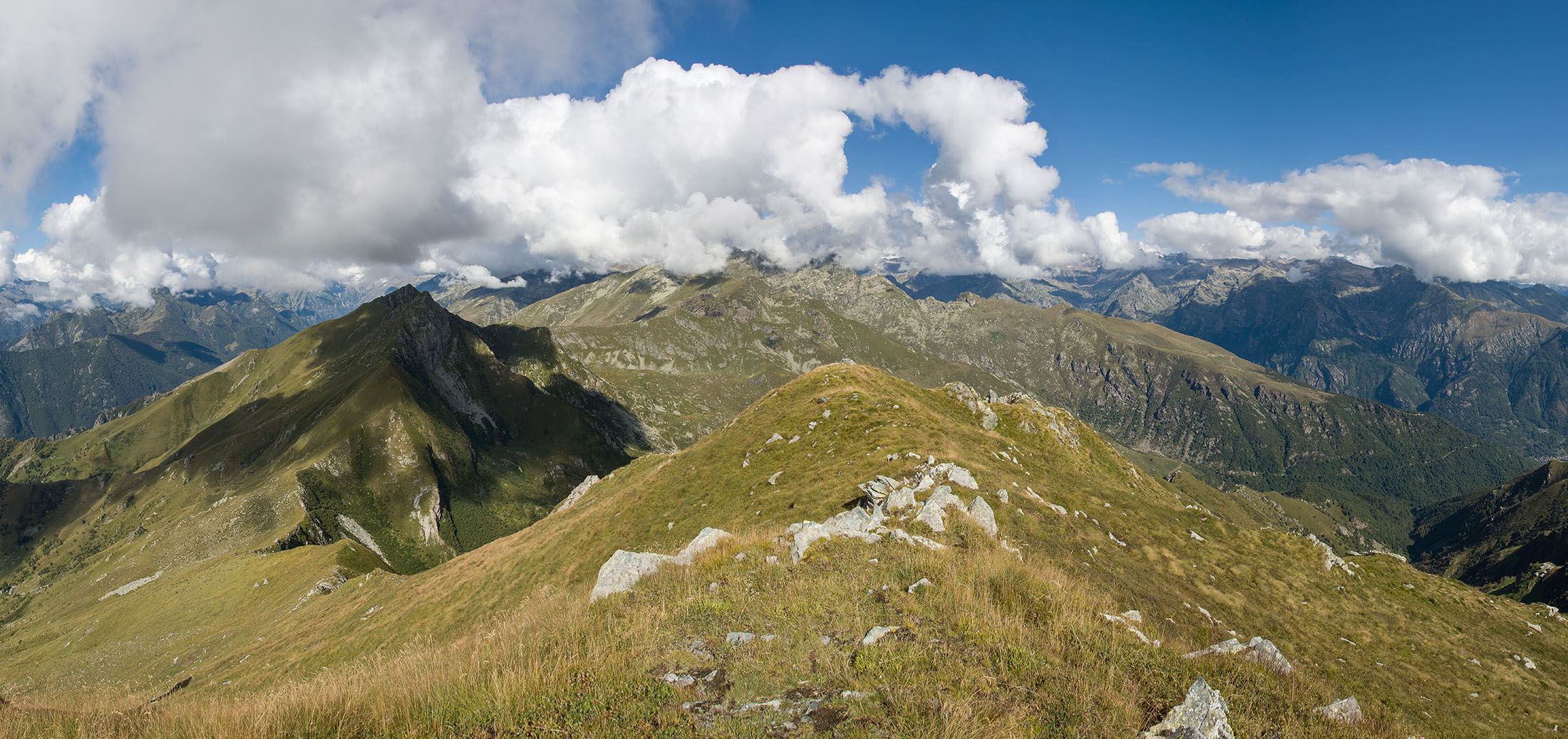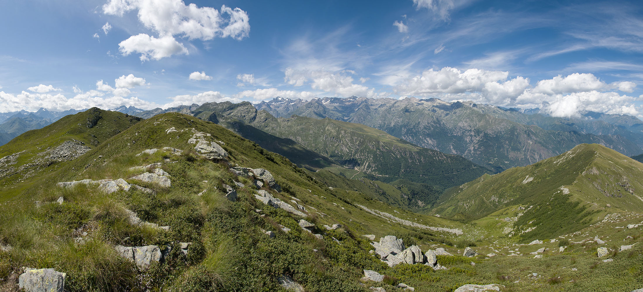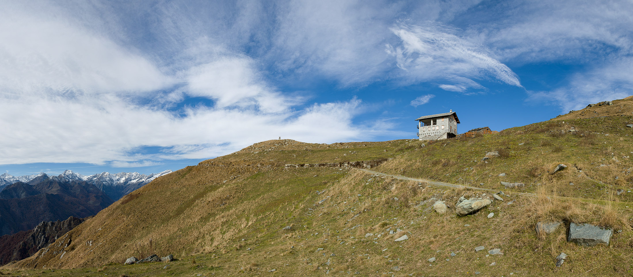 Alternativ bietet sich zuvor noch ein lohnender Schlenker an. Vom Gipfelkreuz steigt man über den Ostgrat etwa 50 Höhenmeter ab bis zu einer grasigen Verebnungsfläche. Von dort steil hinauf auf den östlich gelegenen namenlosen Nebengipfel. Weiter über glattgeschliffene Felsplatten über den breiten und unschwierig zu begehenden Kamm, dann auf spärlichen Wegspuren hinab zu einer grossen Weide nördlich des Colle di Perascritta (2158 m), wo man auf einen markierten Weg trifft. Jenseits des Passes mündet der Weg in einen geschotterten Fahrweg, auf dem man zur Alpe di Coassolo (2026 m) zurückkehrt. Wer noch überschüssige Energie in den Knochen hat kann vom Colle di Perascritta noch einen weiteren Abstecher auf die Punta dell‘Aggia (2254 m) machen, etwa 45 Minuten hin und zurück. Der weglose und nicht markierte Aufstieg durch die steile grasige Westflanke ist bisweilen ein wenig mühsam, aber technisch unschwierig.
