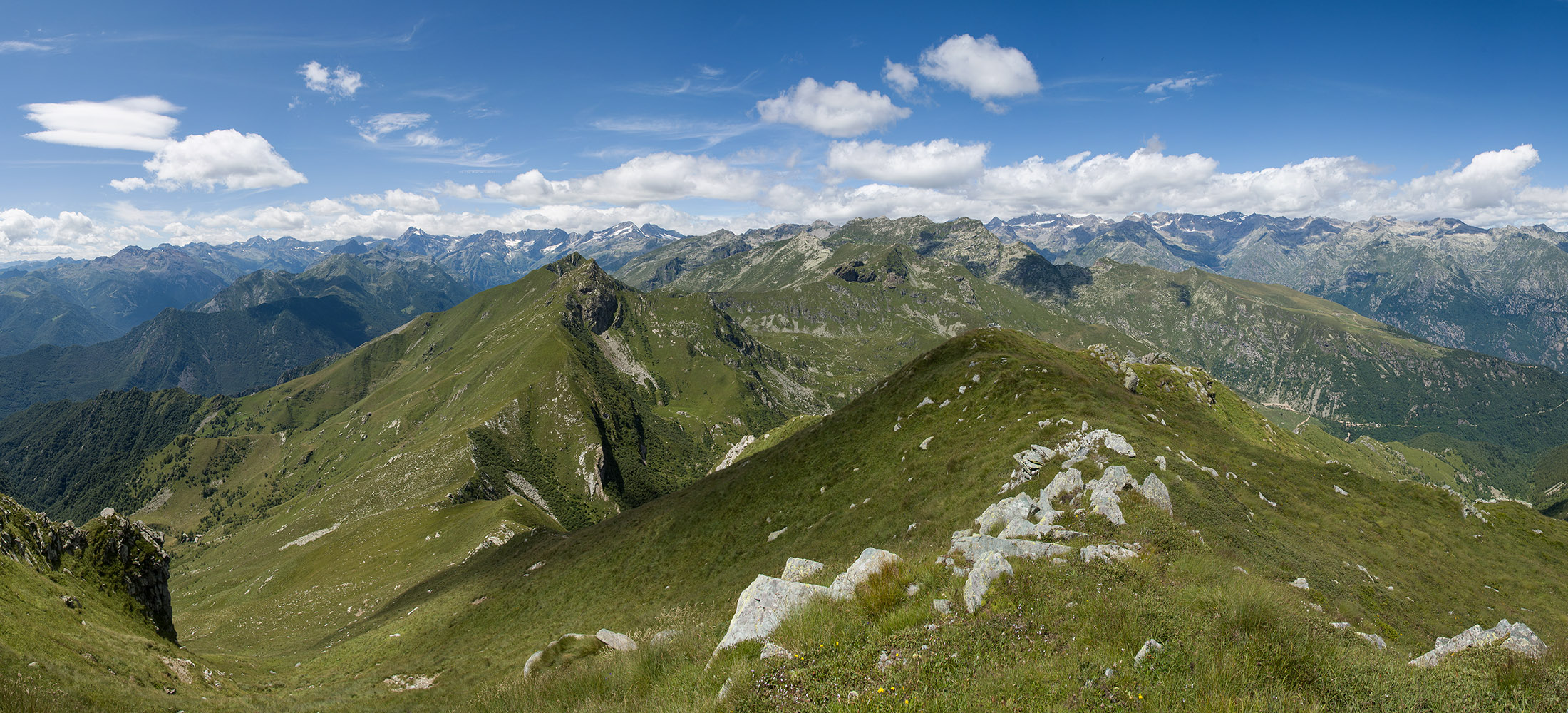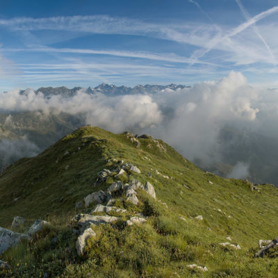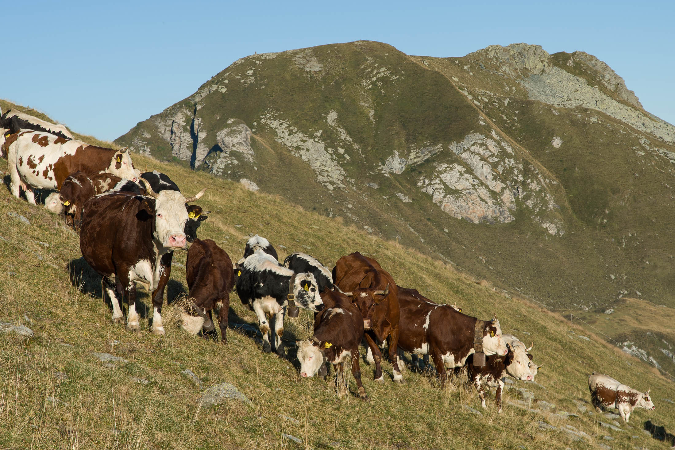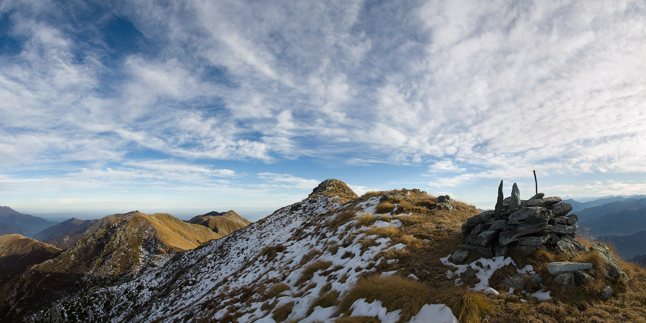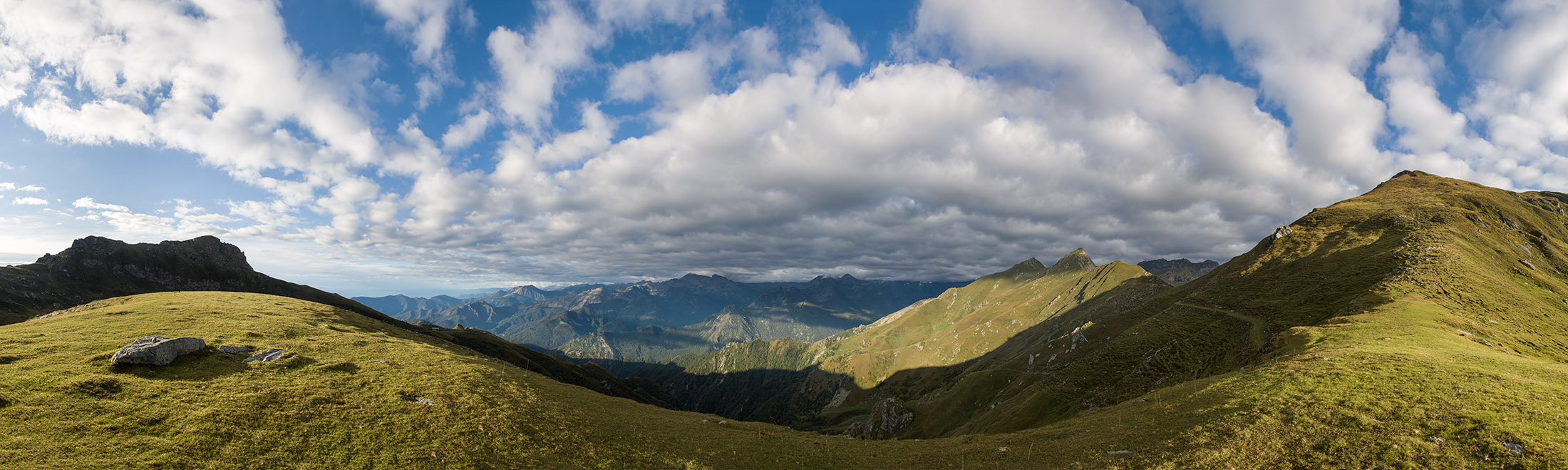 Alternativ bietet sich zuvor noch ein lohnender Schlenker an. Vom Gipfelkreuz steigt man über den Ostgrat etwa 50 Höhenmeter ab bis zu einer grasigen Verebnungsfläche. Von dort steil hinauf auf den östlich gelegenen namenlosen Nebengipfel. Weiter über glattgeschliffene Felsplatten über den breiten und unschwierig zu begehenden Kamm, dann auf spärlichen Wegspuren hinab zu einer grossen Weide nördlich des Colle di Perascritta (2158 m), wo man auf einen markierten Weg trifft. Jenseits des Passes mündet der Weg in einen geschotterten Fahrweg, auf dem man zur Alpe di Coassolo (2026 m) zurückkehrt. Wer noch überschüssige Energie in den Knochen hat kann vom Colle di Perascritta noch einen weiteren Abstecher auf die Punta dell‘Aggia (2254 m) machen, etwa 45 Minuten hin und zurück. Der weglose und nicht markierte Aufstieg durch die steile grasige Westflanke ist bisweilen ein wenig mühsam, aber technisch unschwierig.