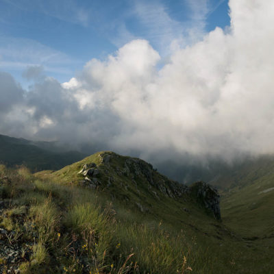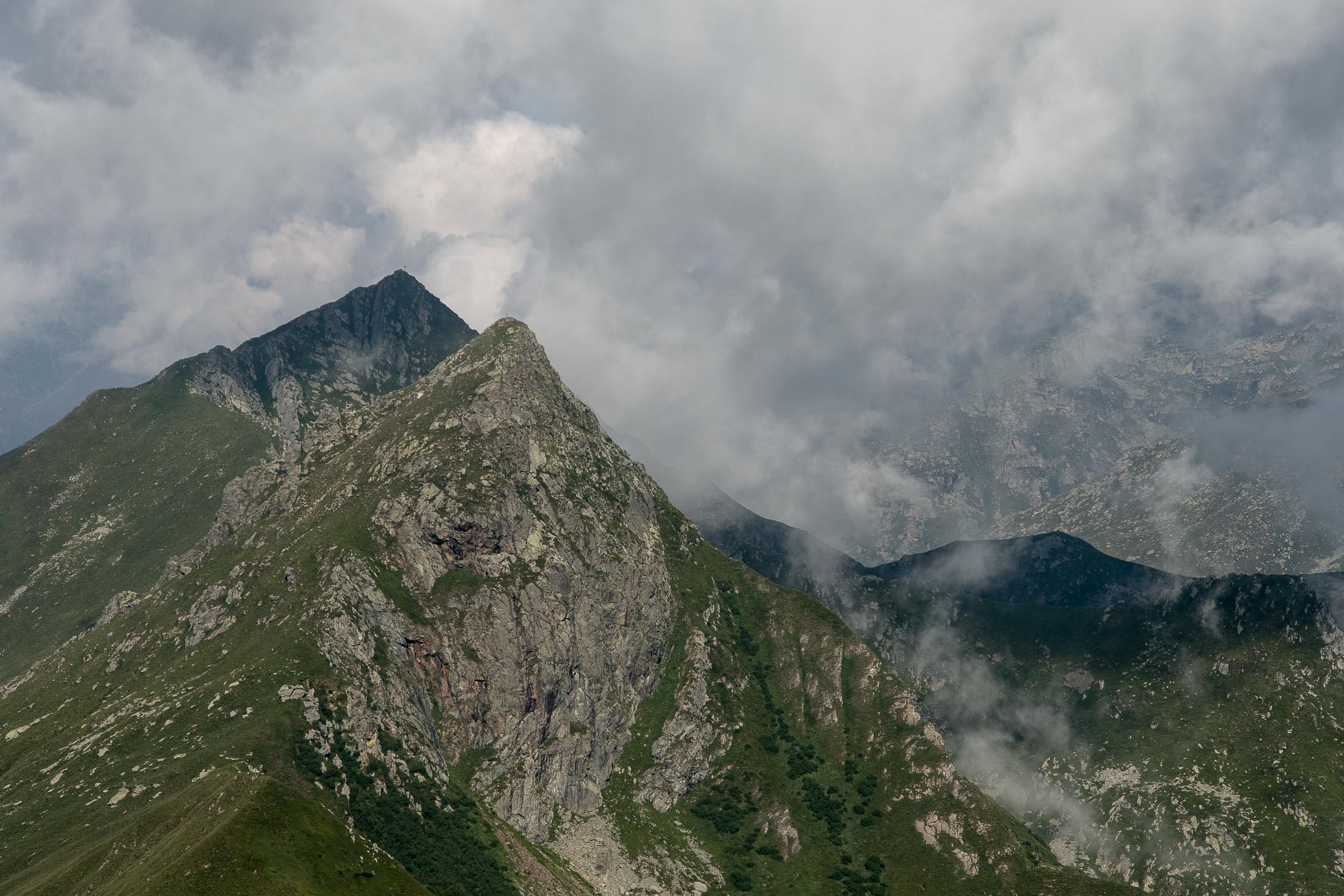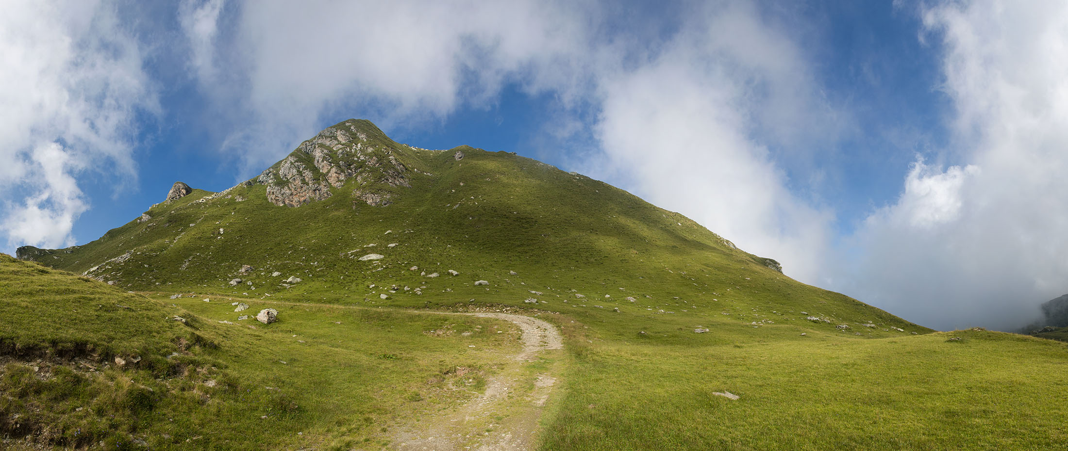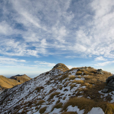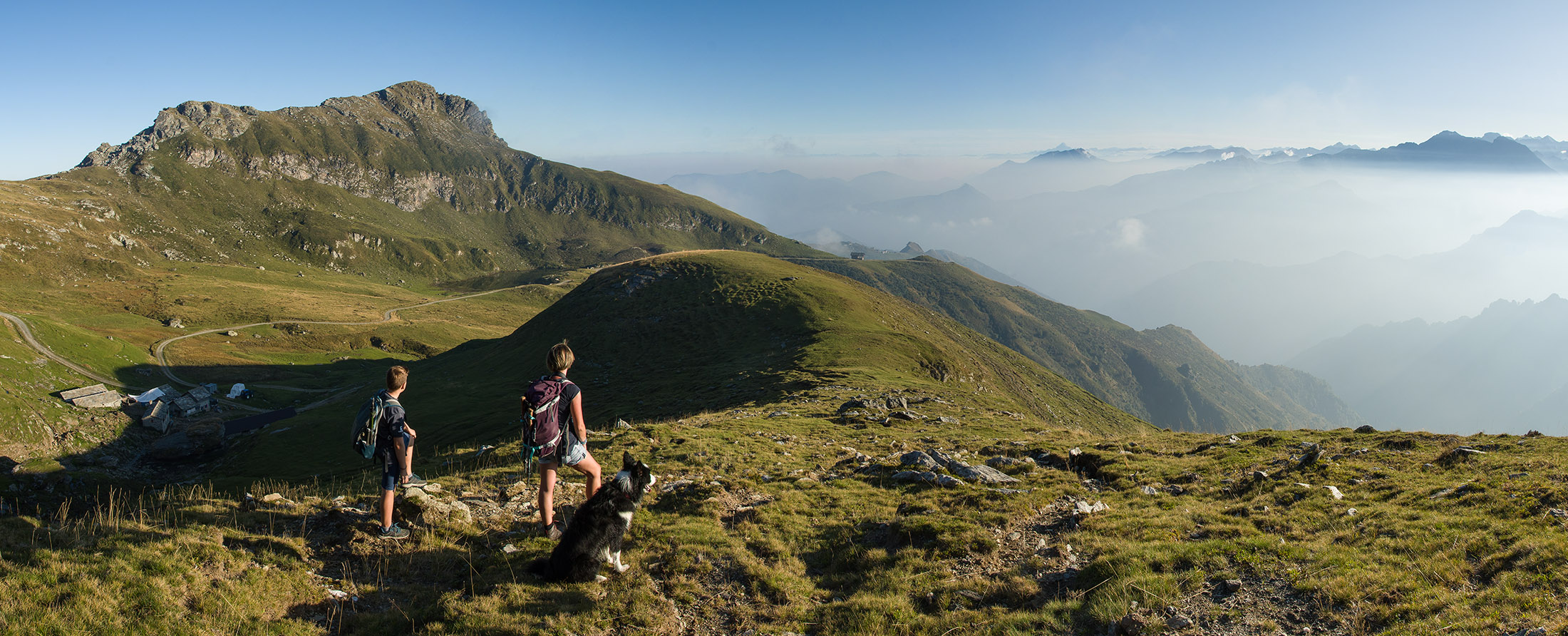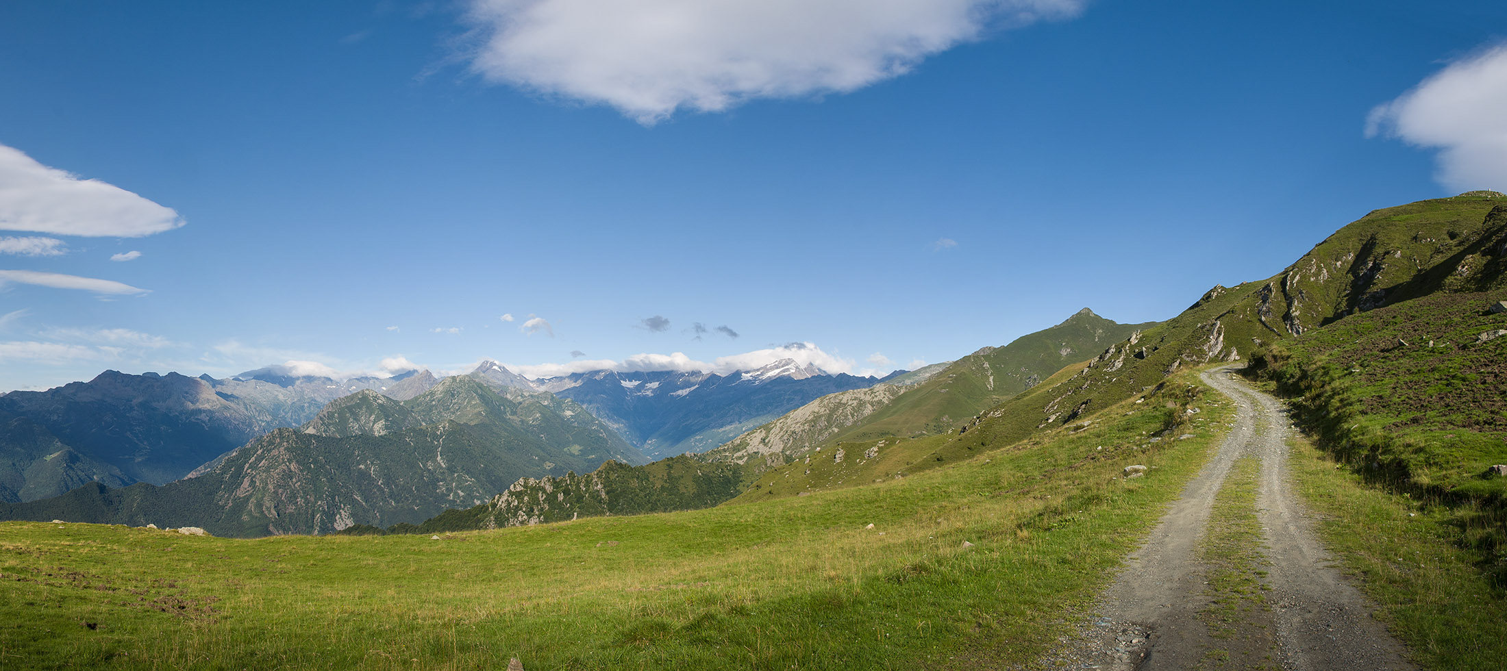 Alternativ bietet sich zuvor noch ein lohnender Schlenker an. Vom Gipfelkreuz steigt man über den Ostgrat etwa 50 Höhenmeter ab bis zu einer grasigen Verebnungsfläche. Von dort steil hinauf auf den östlich gelegenen namenlosen Nebengipfel. Weiter über glattgeschliffene Felsplatten über den breiten und unschwierig zu begehenden Kamm, dann auf spärlichen Wegspuren hinab zu einer grossen Weide nördlich des Colle di Perascritta (2158 m), wo man auf einen markierten Weg trifft. Jenseits des Passes mündet der Weg in einen geschotterten Fahrweg, auf dem man zur Alpe di Coassolo (2026 m) zurückkehrt. Wer noch überschüssige Energie in den Knochen hat kann vom Colle di Perascritta noch einen weiteren Abstecher auf die Punta dell‘Aggia (2254 m) machen, etwa 45 Minuten hin und zurück. Der weglose und nicht markierte Aufstieg durch die steile grasige Westflanke ist bisweilen ein wenig mühsam, aber technisch unschwierig.