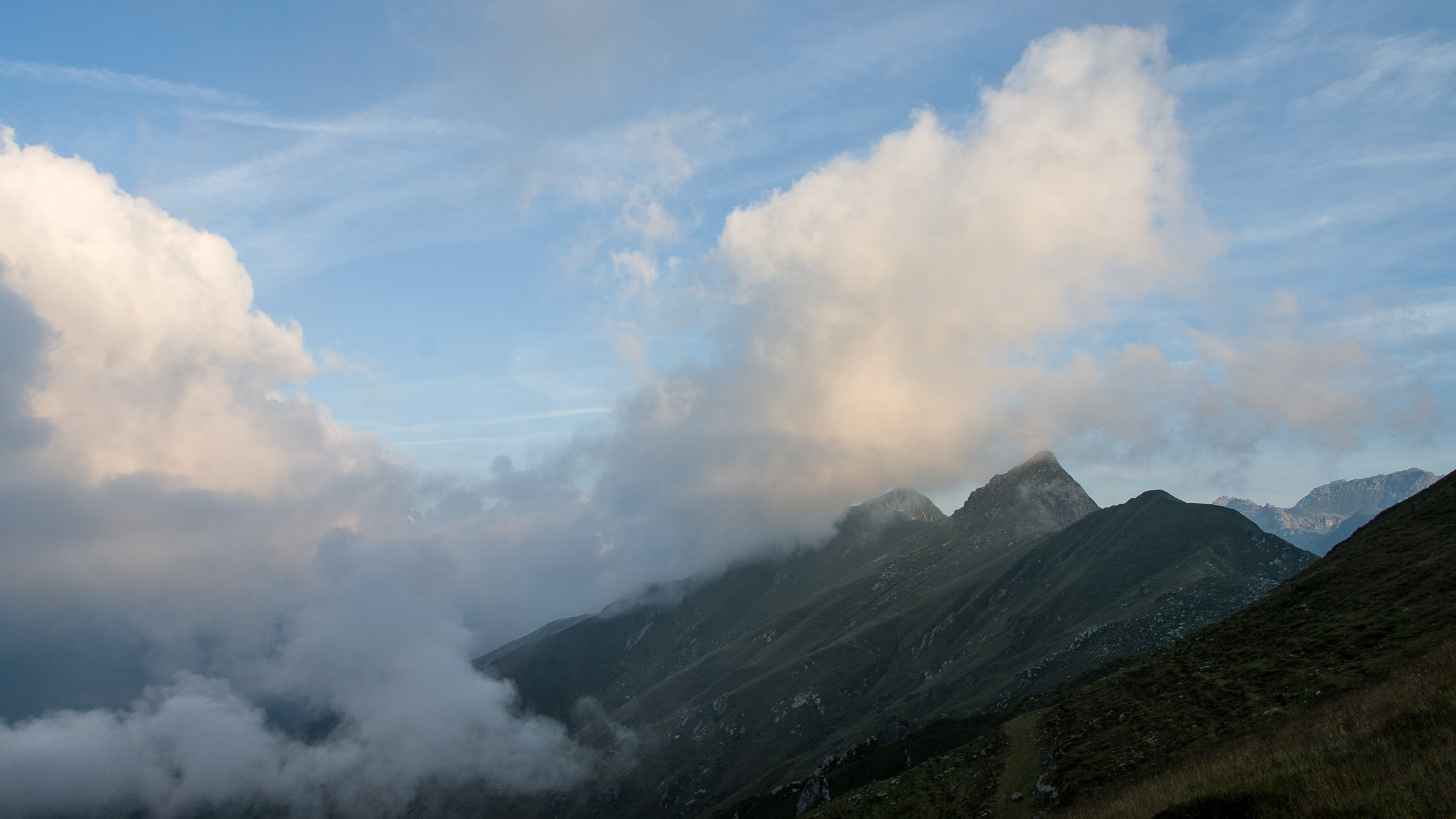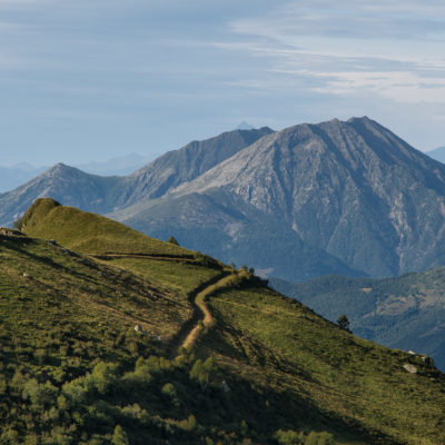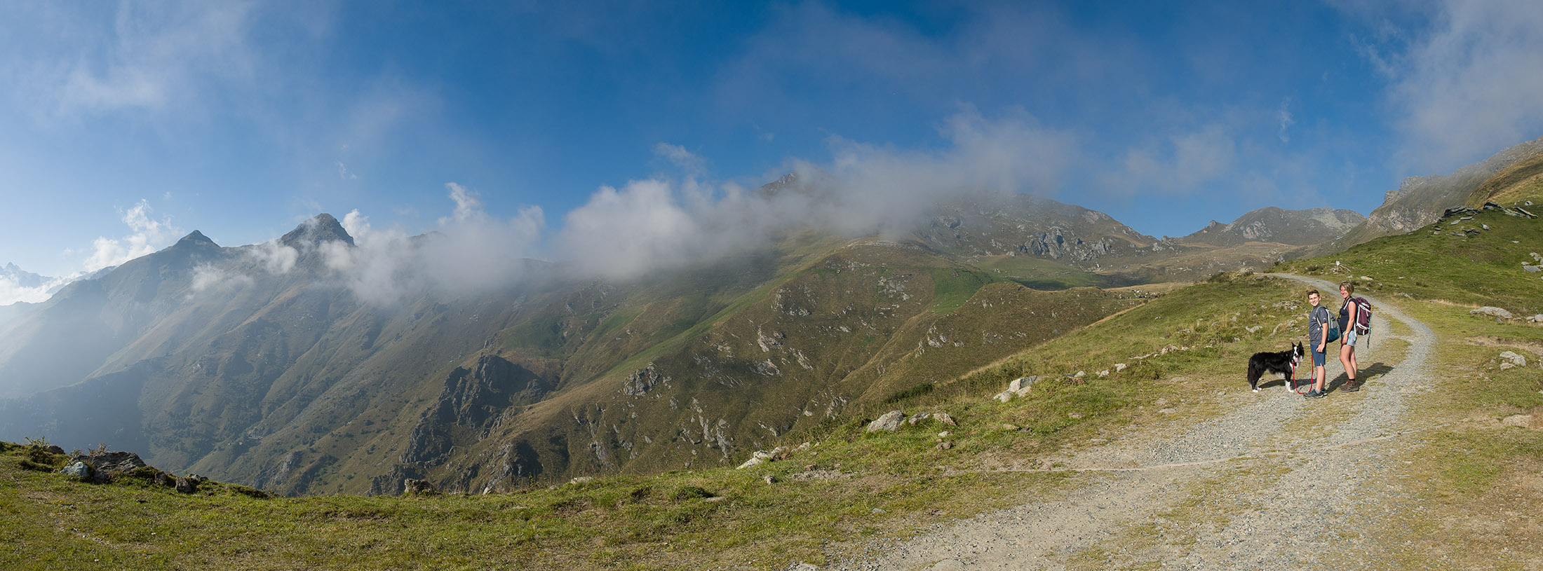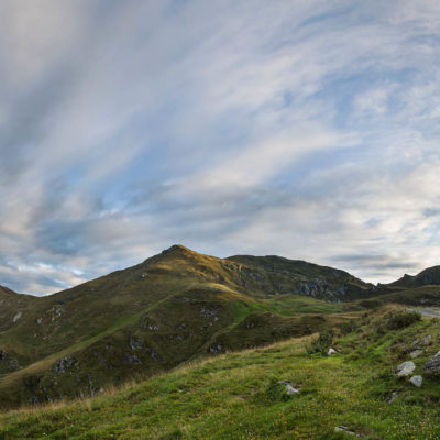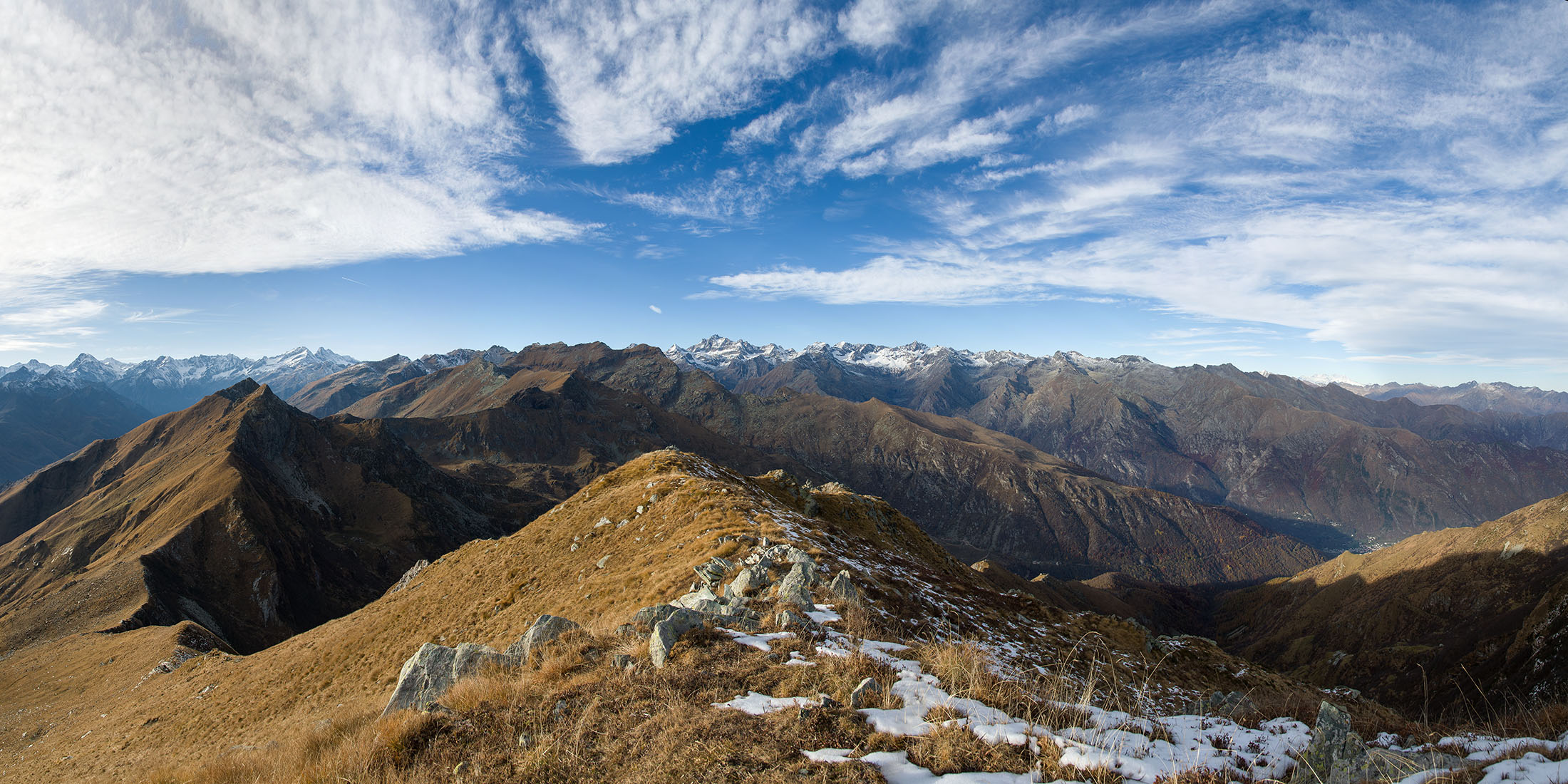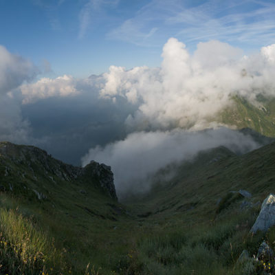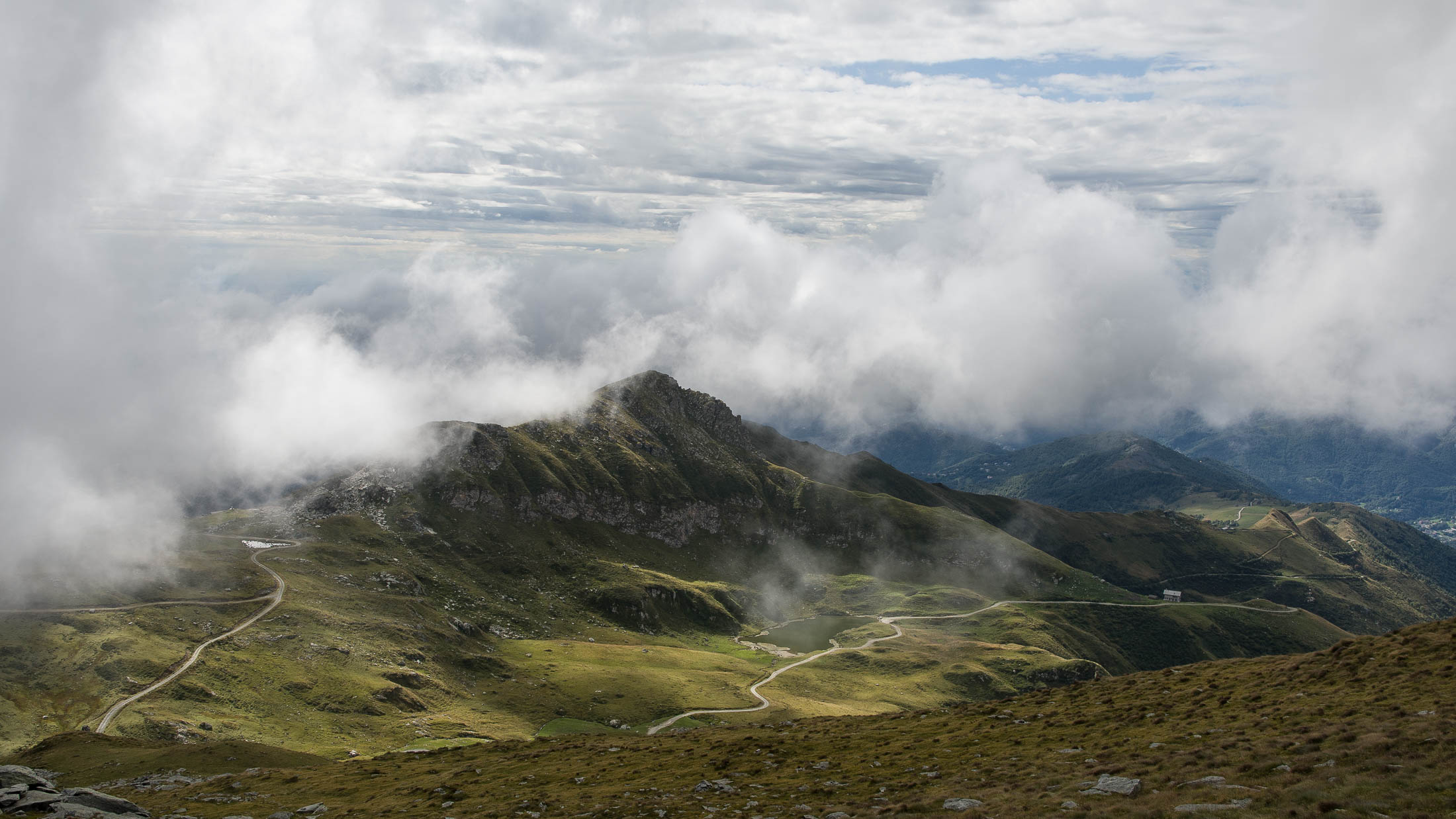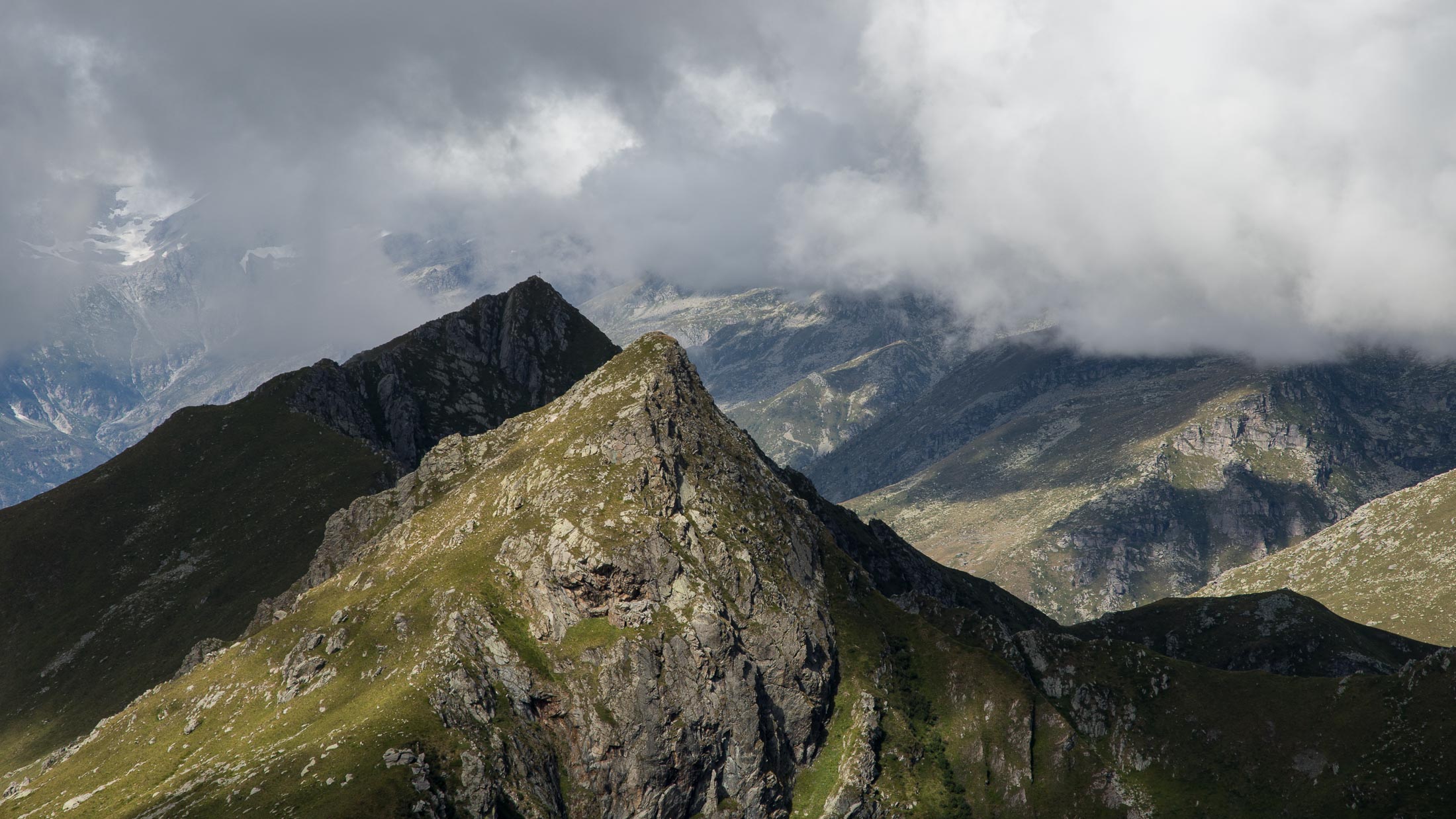 Alternativ bietet sich zuvor noch ein lohnender Schlenker an. Vom Gipfelkreuz steigt man über den Ostgrat etwa 50 Höhenmeter ab bis zu einer grasigen Verebnungsfläche. Von dort steil hinauf auf den östlich gelegenen namenlosen Nebengipfel. Weiter über glattgeschliffene Felsplatten über den breiten und unschwierig zu begehenden Kamm, dann auf spärlichen Wegspuren hinab zu einer grossen Weide nördlich des Colle di Perascritta (2158 m), wo man auf einen markierten Weg trifft. Jenseits des Passes mündet der Weg in einen geschotterten Fahrweg, auf dem man zur Alpe di Coassolo (2026 m) zurückkehrt. Wer noch überschüssige Energie in den Knochen hat kann vom Colle di Perascritta noch einen weiteren Abstecher auf die Punta dell‘Aggia (2254 m) machen, etwa 45 Minuten hin und zurück. Der weglose und nicht markierte Aufstieg durch die steile grasige Westflanke ist bisweilen ein wenig mühsam, aber technisch unschwierig.