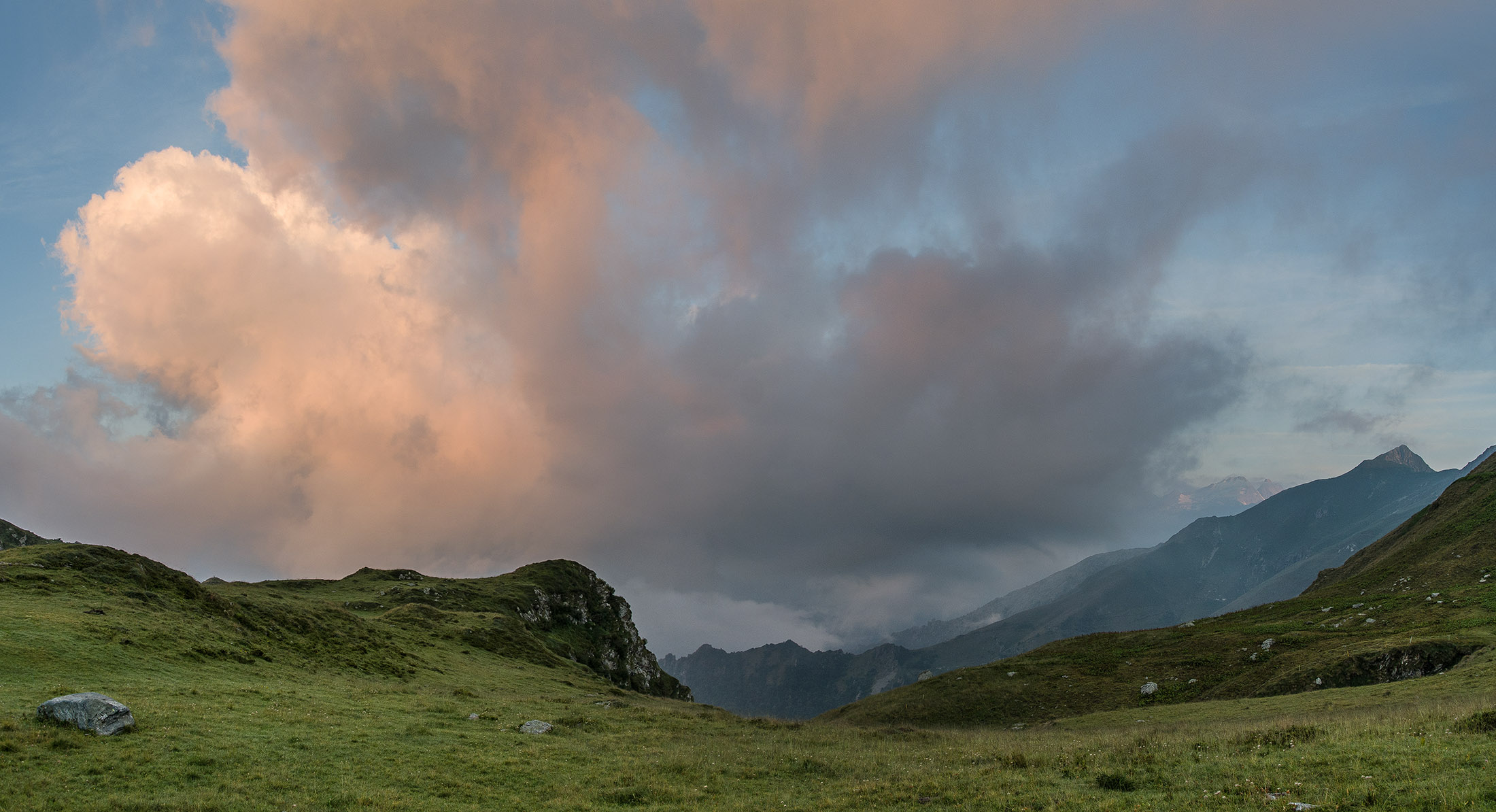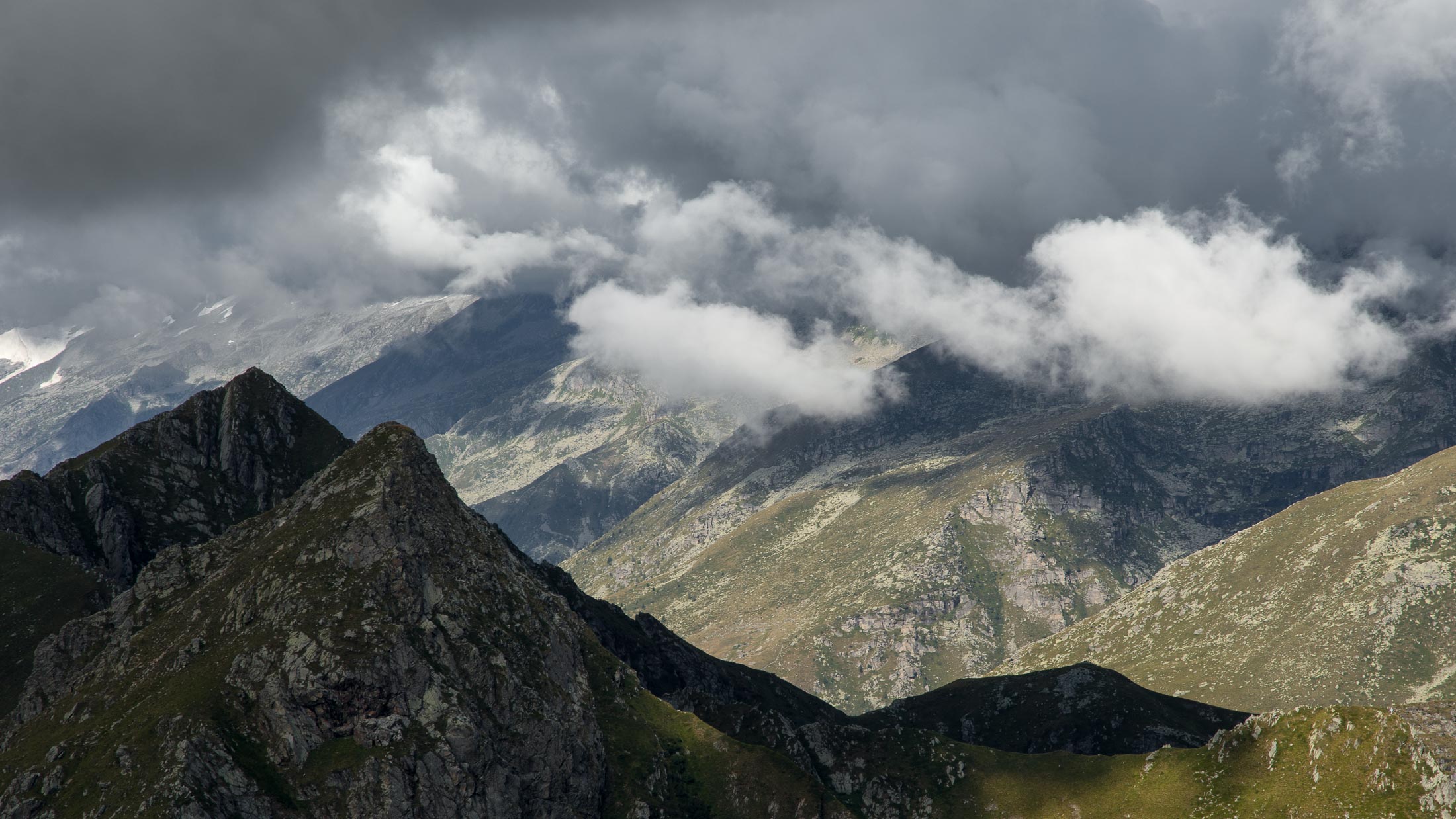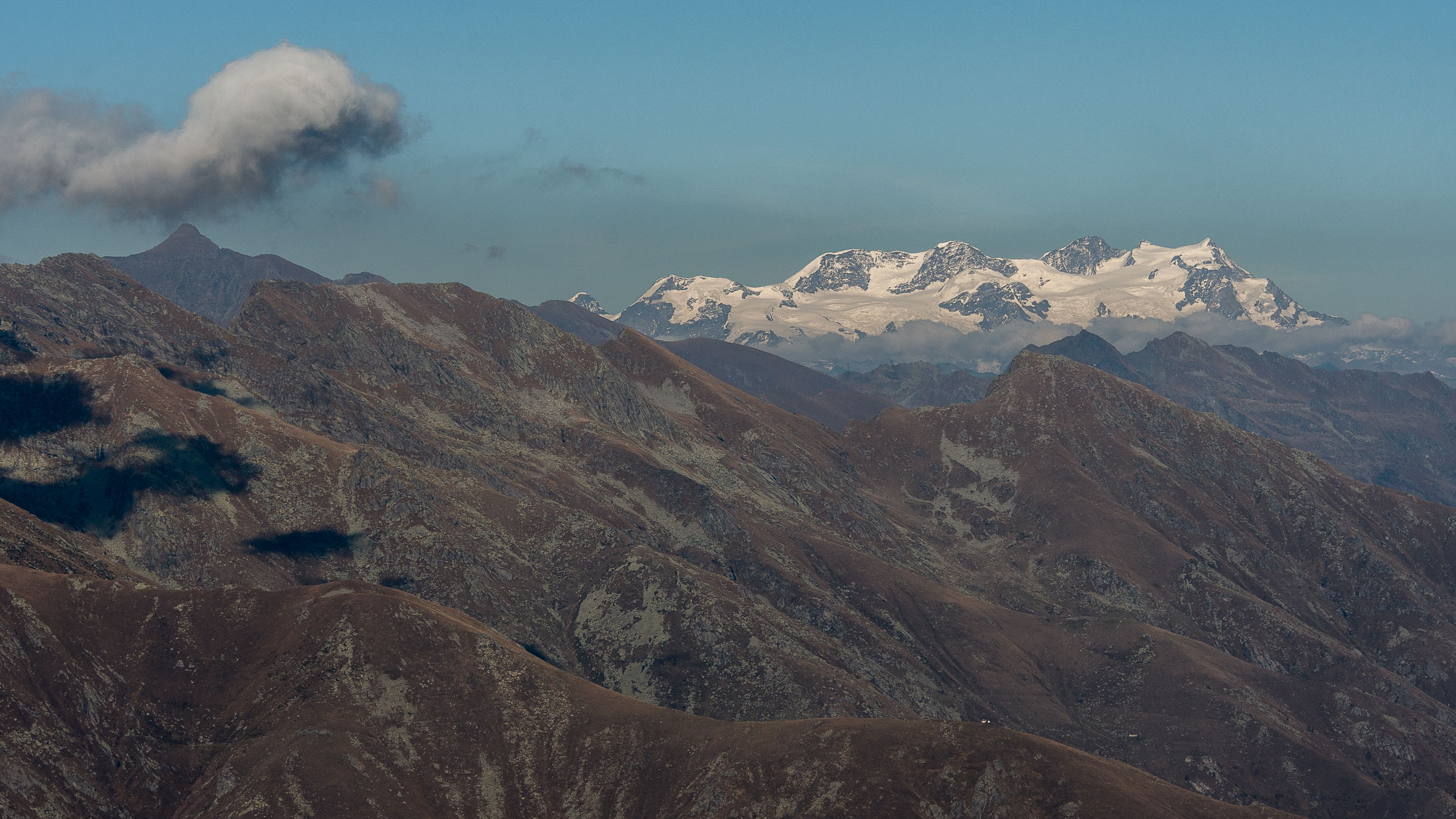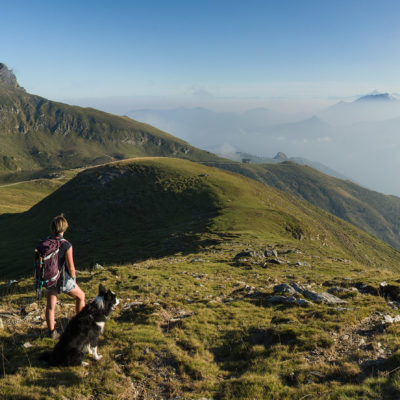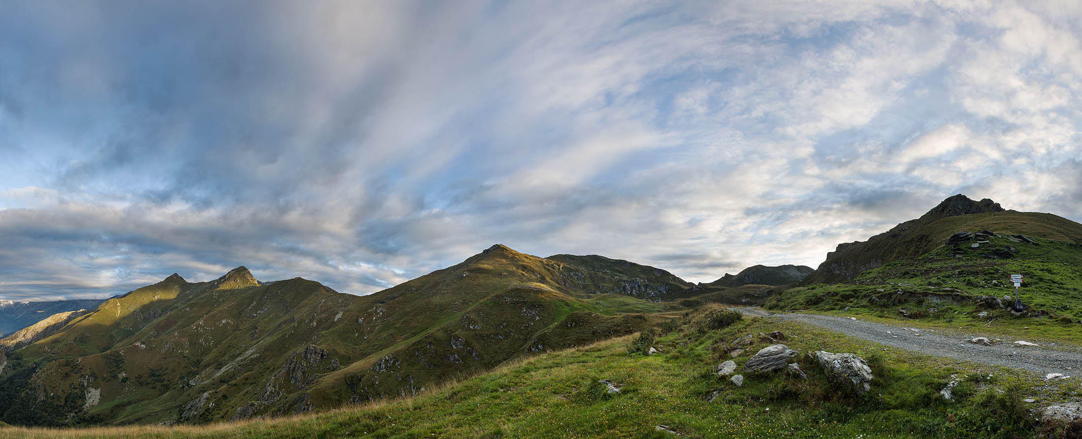 Alternativ bietet sich zuvor noch ein lohnender Schlenker an. Vom Gipfelkreuz steigt man über den Ostgrat etwa 50 Höhenmeter ab bis zu einer grasigen Verebnungsfläche. Von dort steil hinauf auf den östlich gelegenen namenlosen Nebengipfel. Weiter über glattgeschliffene Felsplatten über den breiten und unschwierig zu begehenden Kamm, dann auf spärlichen Wegspuren hinab zu einer grossen Weide nördlich des Colle di Perascritta (2158 m), wo man auf einen markierten Weg trifft. Jenseits des Passes mündet der Weg in einen geschotterten Fahrweg, auf dem man zur Alpe di Coassolo (2026 m) zurückkehrt. Wer noch überschüssige Energie in den Knochen hat kann vom Colle di Perascritta noch einen weiteren Abstecher auf die Punta dell‘Aggia (2254 m) machen, etwa 45 Minuten hin und zurück. Der weglose und nicht markierte Aufstieg durch die steile grasige Westflanke ist bisweilen ein wenig mühsam, aber technisch unschwierig.