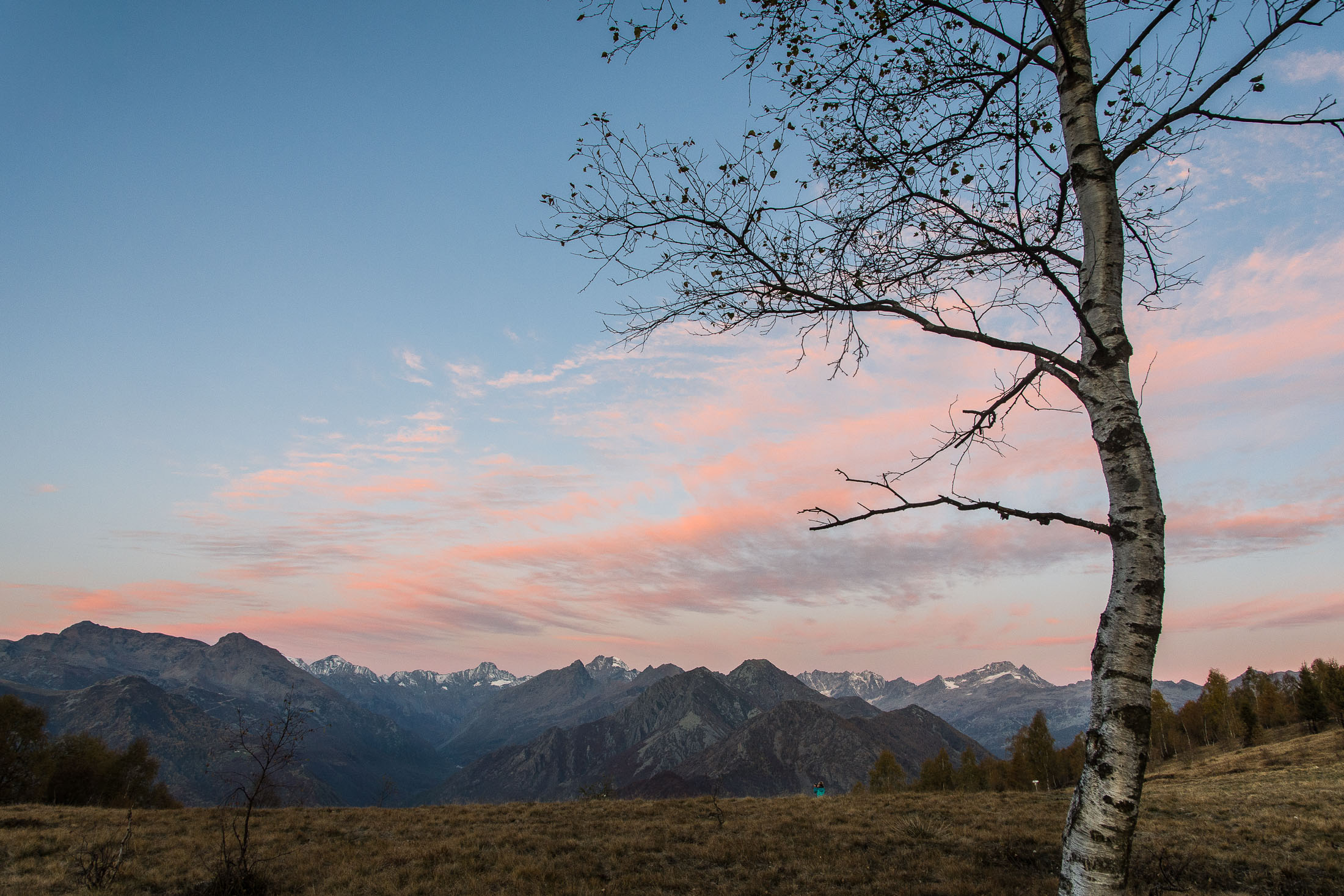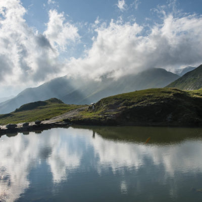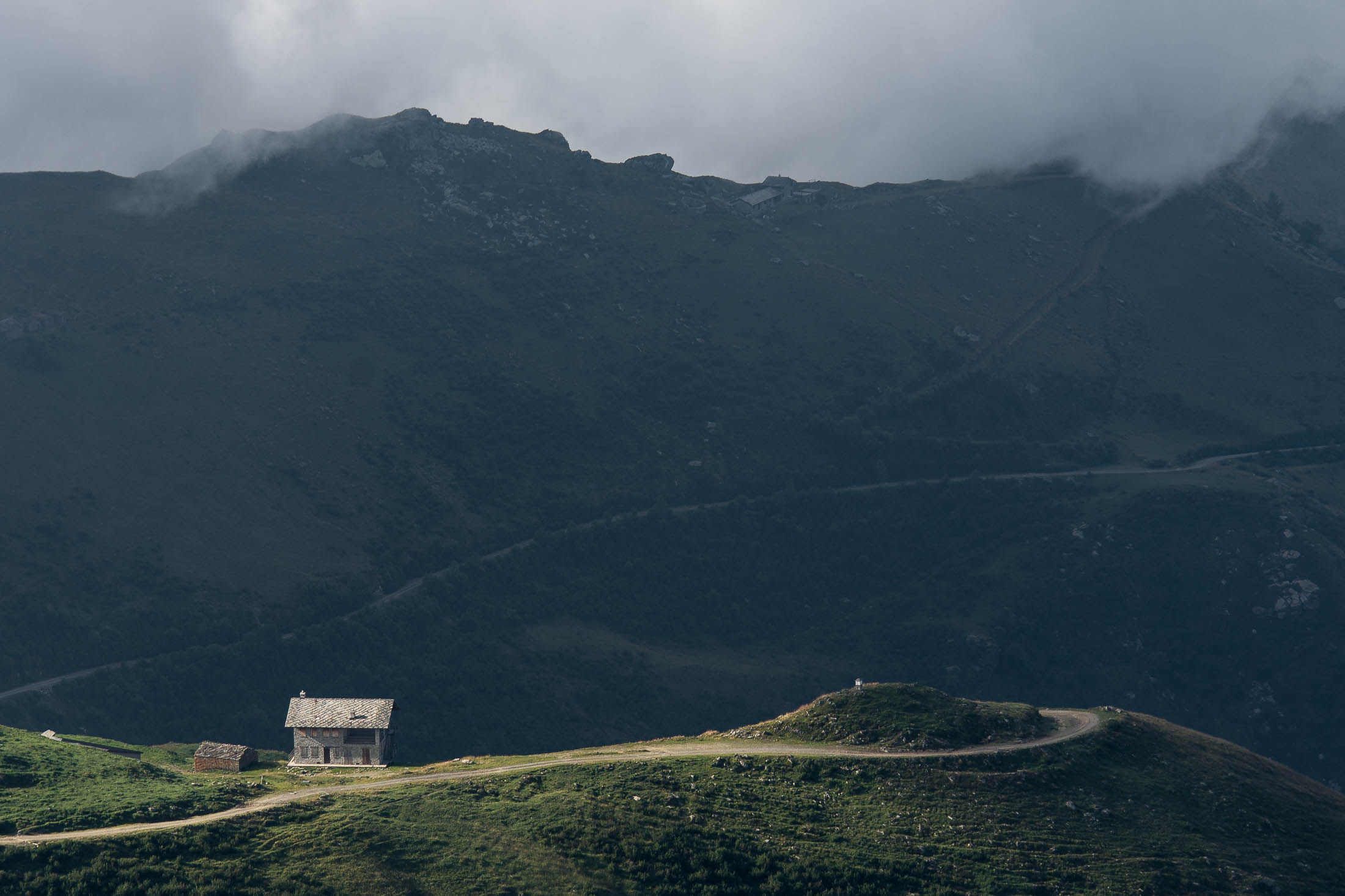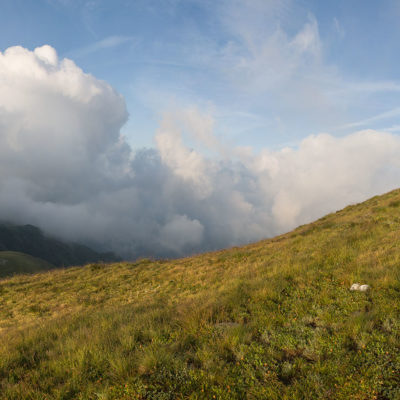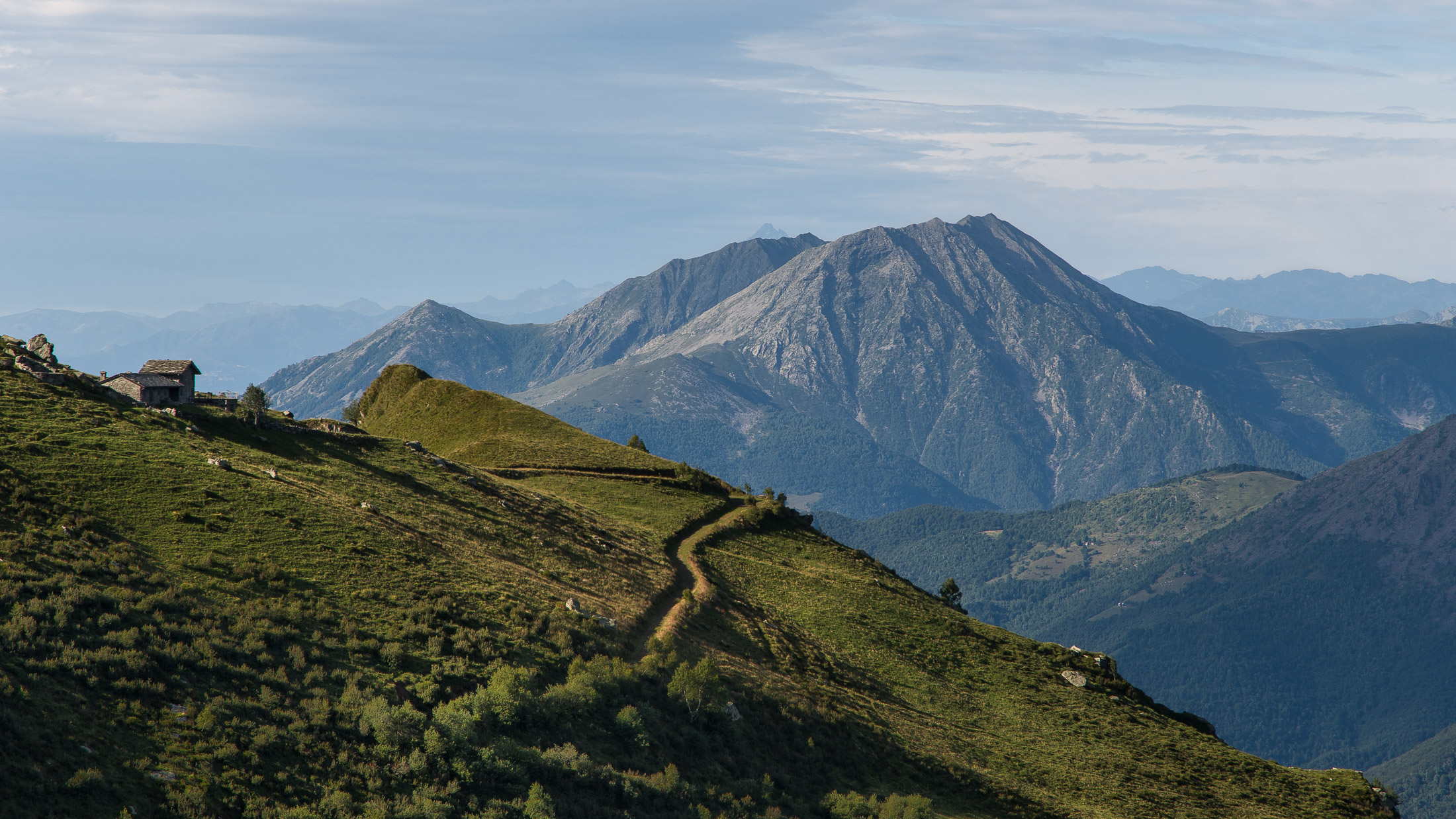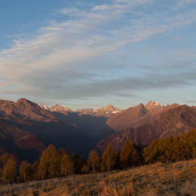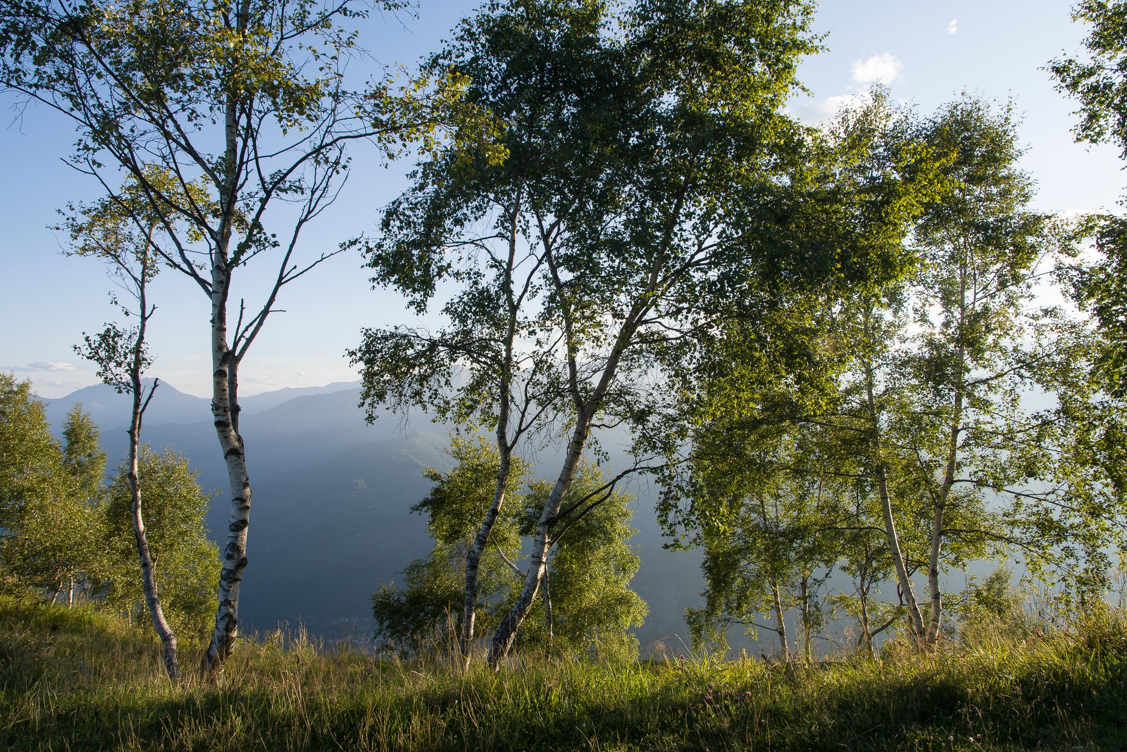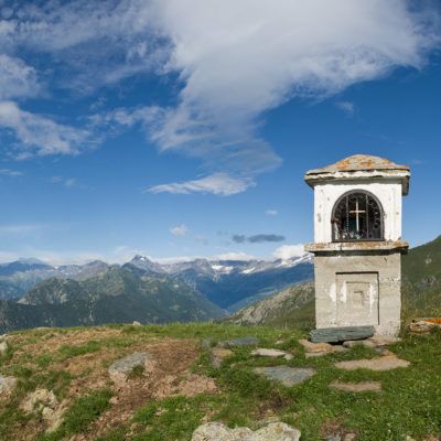 Abmarsch, der Puls ist hoffentlich auf Betriebstemperatur. Das Ziel ist anvisiert, vor einem knapp 1000 Höhenmetern, keine grosse Hürde, aber sie wollen gelaufen werden. Vorfreude ist die beste Motivation. Die ersten Aufstiegsmeter bis zum Colle San Giacomo (1460 m) schlängeln sich durch lichten Birkenwald und sind schnell überwunden, zur Belohnung gibt es ganz viel Aussicht, ein kleiner Vorgeschmack auf all das, was noch kommen mag. Man steht auf einer grasigen Anhöhe zwischen dem Valle Tesso und dem Val Grande di Lanzo, um einen herum weites Land, in der Ferne leuchten die Berge der Valli di Lanzo im Licht der warmen Morgensonne, alle schön in Reih und Glied. Wer früh aufsteht, hat mehr vom Leben. Dieses Motto gilt ganz besonders für diese Tour, vor allem in den Sommermonaten bildet sich bereits ab den Vormittagsstunden in umliegenden Kammlagen häufig Nebel, bedingt durch die feuchtwarmen Luftmassen, die aus der nahen und im Sommer meist brütend heissen Tiefebene aufsteigen. Also, wer was sehen will, macht sich besser zeitig auf den Weg. Ein wenig unterhalb des Passes befindet sich die sehenswerte Cappella di San Giacomo (1414 m), das weiss gekalkte Gotteshaus wird von Einheimischen in ehrenamtlicher Arbeit gepflegt und instandgehalten.