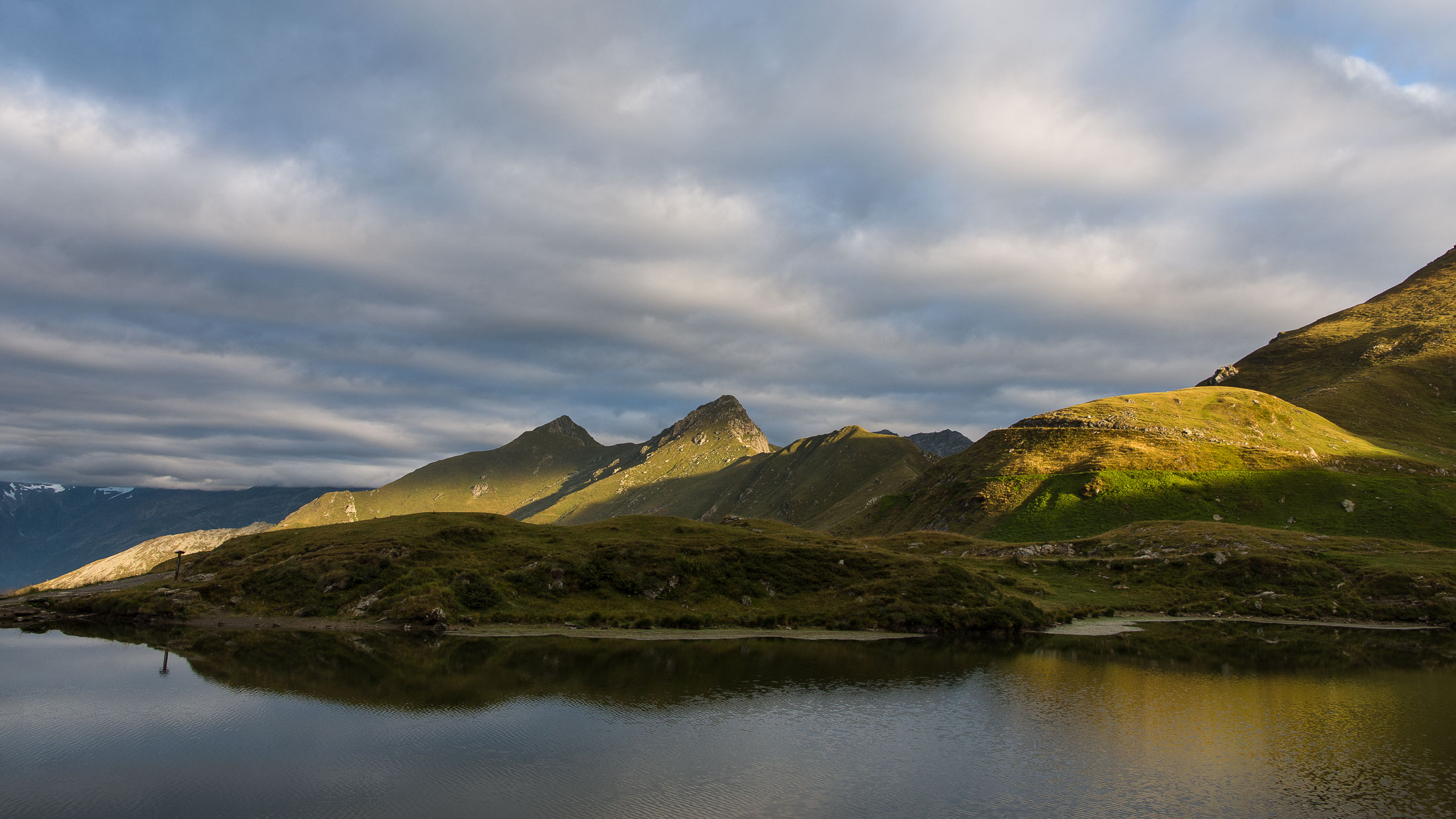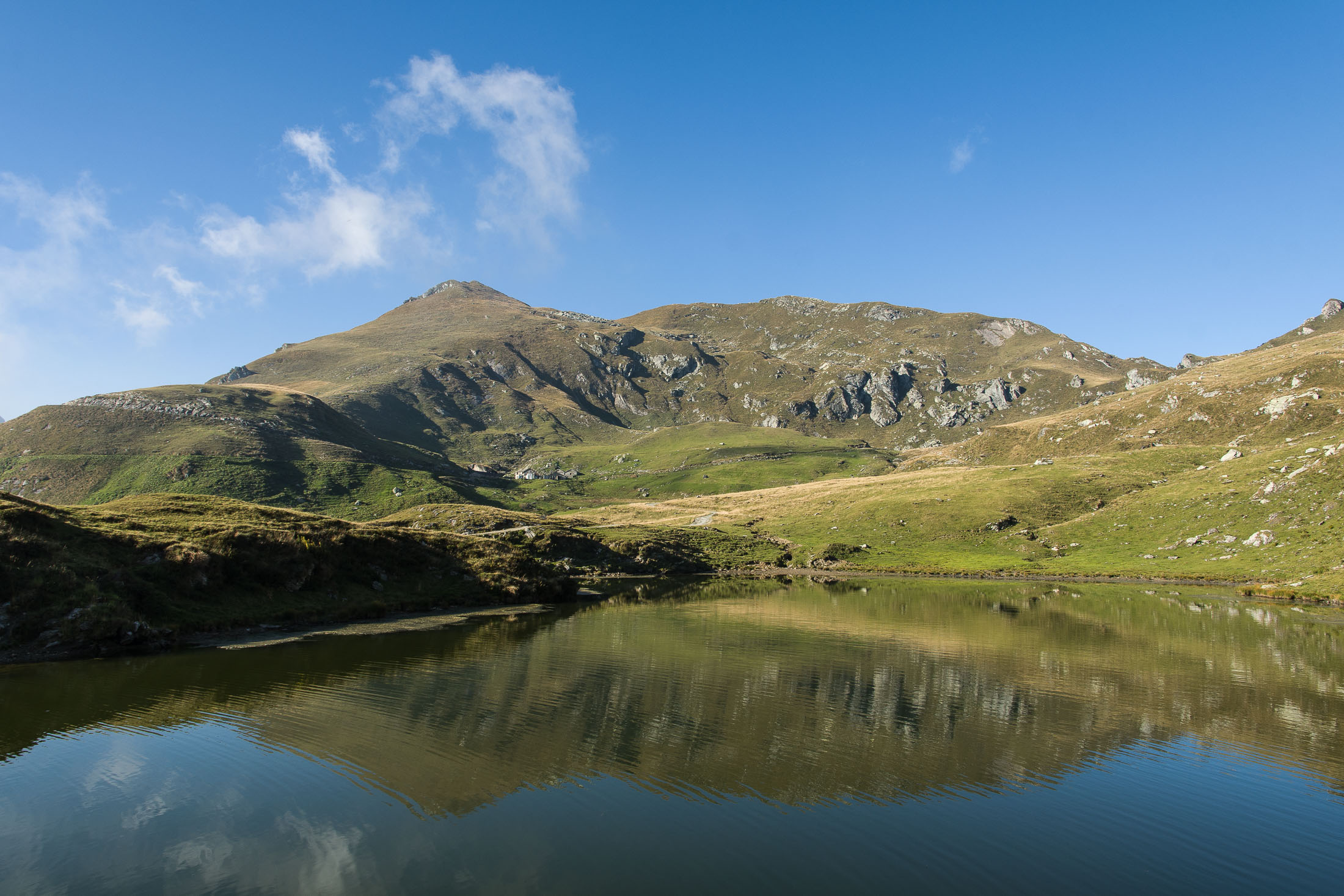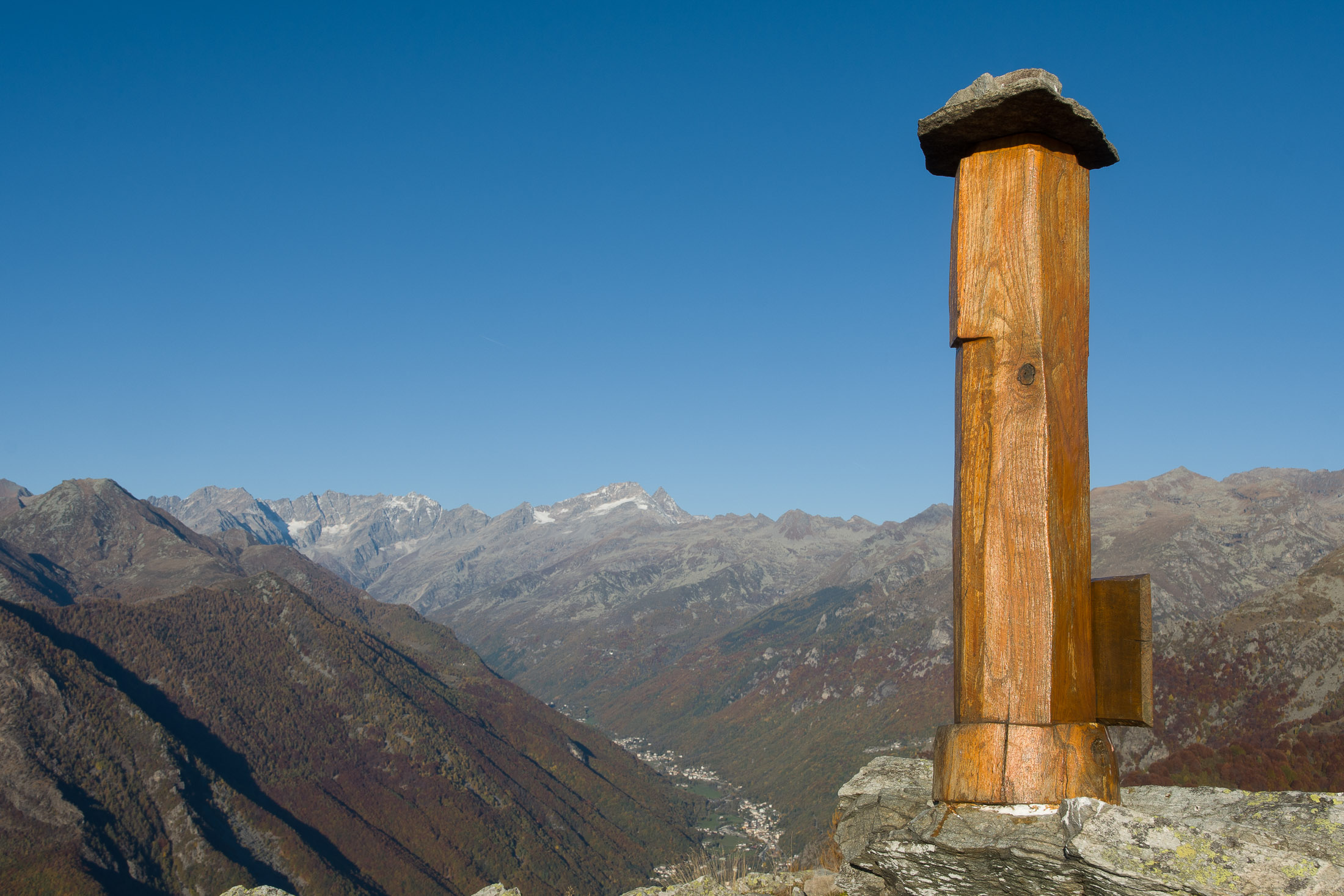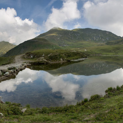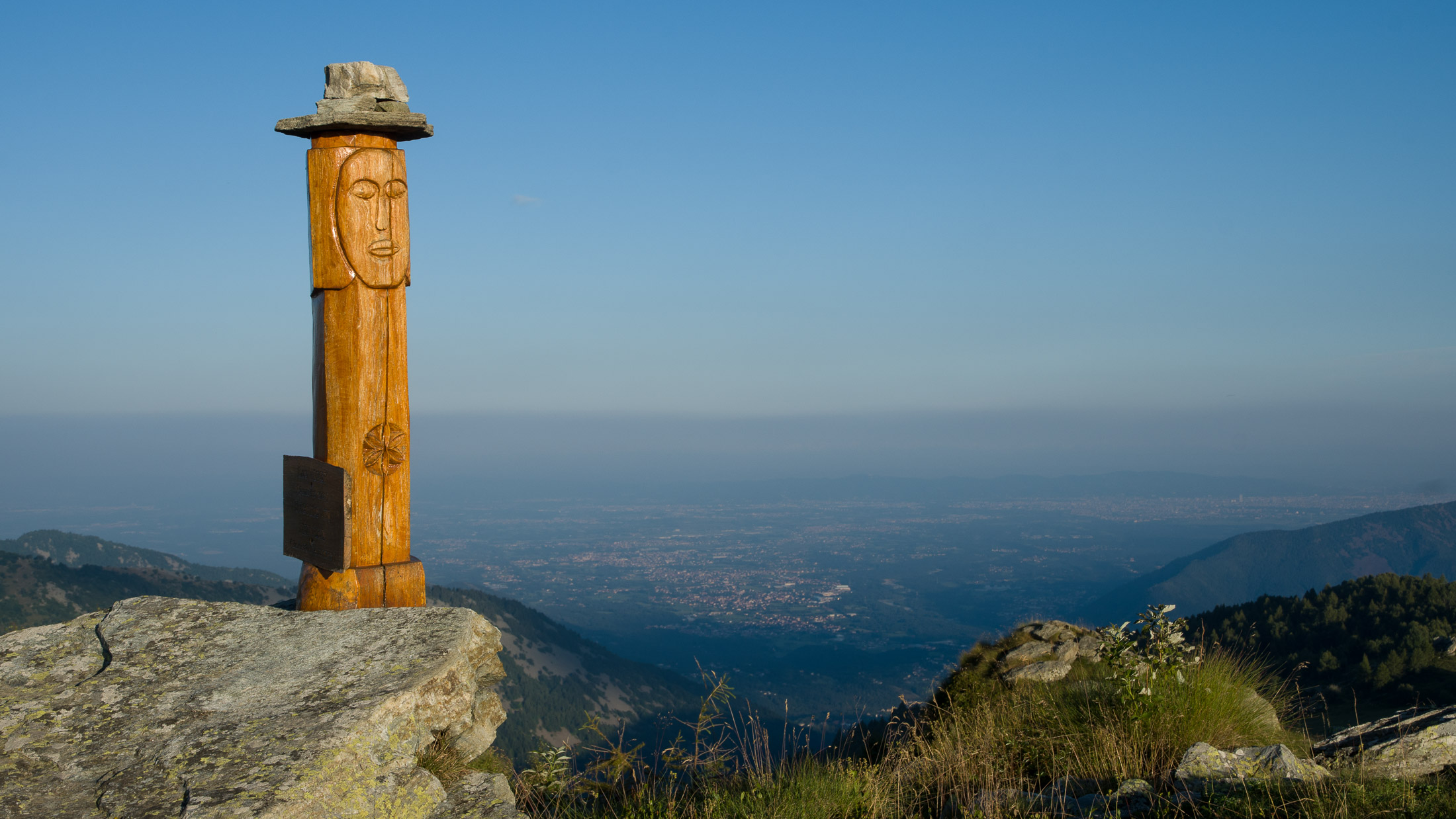 Vom Colle San Giacomo (1460 m) folgt man dem breiten Weg über die Weiden bis zur nahen Alpe Santa Barbara (1504 m). Die Welt ist im Wandel, früher wurde hier das Vieh gemolken, Käse gemacht und Heu gewendet, heute blickt man auf hübsch renovierte Wochenhäuschen. Der Weiterweg führt durch einen lauschigen Birkenwald. Dieser Wald ist noch jung, die Umgebung der Alpe Santa Barbara war einst gerodet, hier weideten über Generationen Kühe, Schafe und Ziegen. Seit der weitgehenden Einstellung der traditionellen Alpwirtschaft hat sich das Landschaftsbild stark verändert, immer mehr Weideflächen veröden und werden von Birken beschlagnahmt. Am Colle della Forchetta (1589 m) mündet der Weg in die geschotterte Zufahrtsstrasse zur Alpe di Monastero. Ein grosser Gedenkstein erinnert an die Gefallenen des Krieges. Weiter oben in einer Kehre zweigt links eine anfangs undeutliche Pfadspur ab, auf dieser erreicht man in Kürze freies Gelände und den grasigen Gratrücken zwischen dem Valle Tesso und dem westlich gelegenen Val Grande di Lanzo. Vorhang auf! Die Aussicht ist bereits von hier atemberaubend. Mitten auf dem einsamen Kamm trohnt der Decollo di Menulla, eine hölzerne Statue zwischen Himmel und Erde, originelle Handwerkskunst mitten im Nirgendwo. Der Weg folgt nun eine Weile dem Gratverlauf, jeder Schritt ist hier ein Genuss. Wenig später kommt man zu einer Gruppe von Alpgebäuden, gleich daneben der Roc del Gal (1693 m), wie dieser pittoresk anmutende Felsklotz hier hingekommen ist, wissen vermutlich nur die Götter. Wenige Minuten später mündet der Weg bei den Hütten der Prati della Fontana (1701 m) erneut in die parallel verlaufende Alpstrasse. Auf dieser kann man nun in der nächsten Stunde gemütlich von sich hintraben. Auf der Alpe di Monastero (1971 m) herrscht rege Betriebsamkeit, zumindest wenn Giovanni da ist, ein sympathischer Mittsiebziger mit sonnengegerbtem faltigem Gesicht und markantem Schnauzer. Sommer für Sommer verbringt er gemeinsam mit seinem Sohn Domenico und seinen Tieren hier oben auf der Alp, bereits sein ganzes Leben. Im August ziehen Giovanni und Domenico mit den Kühen vorübergehend auf die höhengelegenen Weiden der Alpe Costapiana, bevor sie Anfang September wieder zur Alpe di Monastero zurückkehren. Den Rest des Jahres lebt er mit seiner Familie auf seinem Hof, irgendwo weit draussen in der Po-Ebene. Nur einen Steinwurf entfernt ruht der Lago di Monastero (1992 m) friedlich vor sich hin, ein idyllischer Bergsee am Fuss der steilen Westflanke der Punta Gias Vej (2180 m). Anderswo würden sich an einem solch schönen Ort vermutlich Horden von Menschen tümmeln, am Ufer ständen womöglich Bars, Restaurants und Souvenirbuden. Aber wir sind im Piemont, und die Wege führen hier fast immer ins touristische Abseits. Hier könnte man leicht der restlichen Tag in der Sonne verlümmeln, die Verlockung ist gross. Aber der Berg ruft, und er ist bereits in Sichtweite, noch eine Stunde und gut 300 Höhenmeter bis zum Ziel.