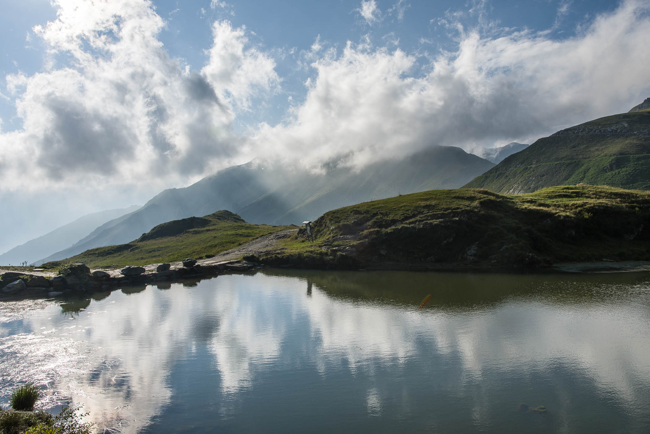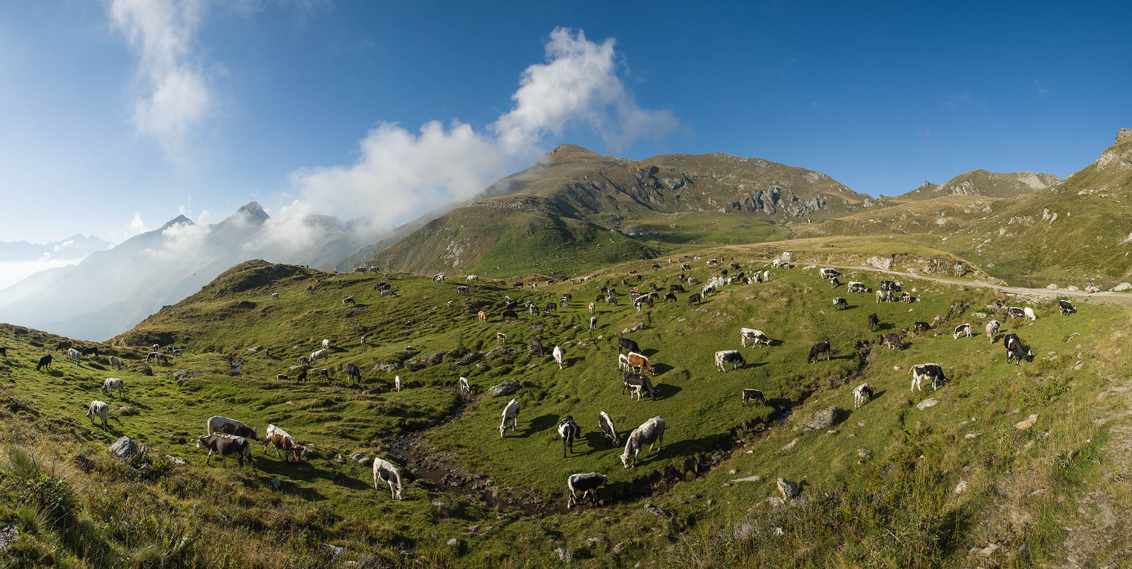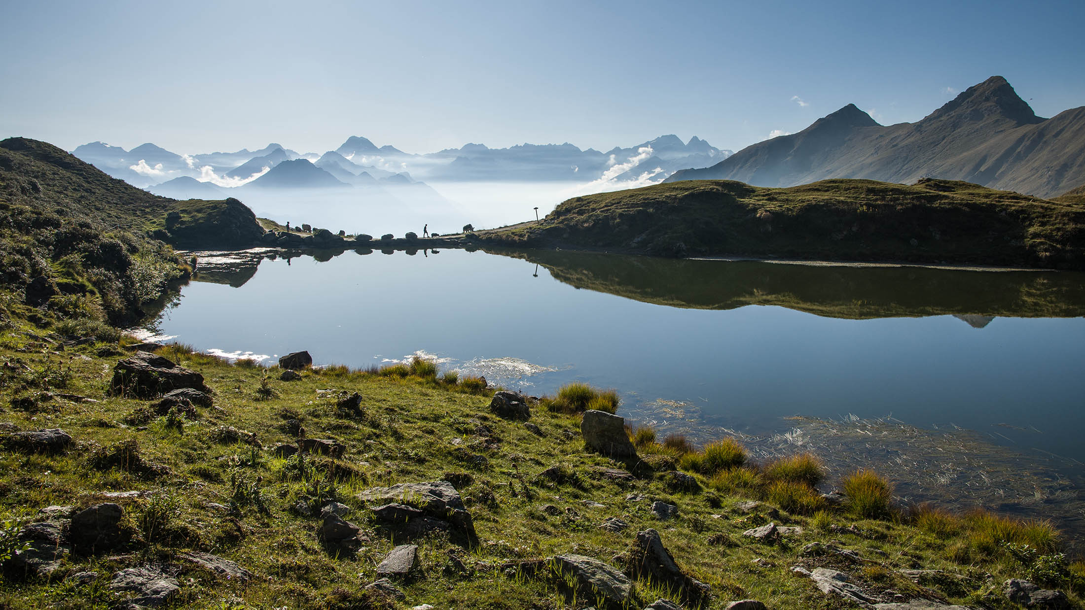 Vom Colle San Giacomo (1460 m) folgt man dem breiten Weg über die Weiden bis zur nahen Alpe Santa Barbara (1504 m). Die Welt ist im Wandel, früher wurde hier das Vieh gemolken, Käse gemacht und Heu gewendet, heute blickt man auf hübsch renovierte Wochenhäuschen. Der Weiterweg führt durch einen lauschigen Birkenwald. Dieser Wald ist noch jung, die Umgebung der Alpe Santa Barbara war einst gerodet, hier weideten über Generationen Kühe, Schafe und Ziegen. Seit der weitgehenden Einstellung der traditionellen Alpwirtschaft hat sich das Landschaftsbild stark verändert, immer mehr Weideflächen veröden und werden von Birken beschlagnahmt. Am Colle della Forchetta (1589 m) mündet der Weg in die geschotterte Zufahrtsstrasse zur Alpe di Monastero. Ein grosser Gedenkstein erinnert an die Gefallenen des Krieges. Weiter oben in einer Kehre zweigt links eine anfangs undeutliche Pfadspur ab, auf dieser erreicht man in Kürze freies Gelände und den grasigen Gratrücken zwischen dem Valle Tesso und dem westlich gelegenen Val Grande di Lanzo. Vorhang auf! Die Aussicht ist bereits von hier atemberaubend. Mitten auf dem einsamen Kamm trohnt der Decollo di Menulla, eine hölzerne Statue zwischen Himmel und Erde, originelle Handwerkskunst mitten im Nirgendwo. Der Weg folgt nun eine Weile dem Gratverlauf, jeder Schritt ist hier ein Genuss. Wenig später kommt man zu einer Gruppe von Alpgebäuden, gleich daneben der Roc del Gal (1693 m), wie dieser pittoresk anmutende Felsklotz hier hingekommen ist, wissen vermutlich nur die Götter. Wenige Minuten später mündet der Weg bei den Hütten der Prati della Fontana (1701 m) erneut in die parallel verlaufende Alpstrasse. Auf dieser kann man nun in der nächsten Stunde gemütlich von sich hintraben. Auf der Alpe di Monastero (1971 m) herrscht rege Betriebsamkeit, zumindest wenn Giovanni da ist, ein sympathischer Mittsiebziger mit sonnengegerbtem faltigem Gesicht und markantem Schnauzer. Sommer für Sommer verbringt er gemeinsam mit seinem Sohn Domenico und seinen Tieren hier oben auf der Alp, bereits sein ganzes Leben. Im August ziehen Giovanni und Domenico mit den Kühen vorübergehend auf die höhengelegenen Weiden der Alpe Costapiana, bevor sie Anfang September wieder zur Alpe di Monastero zurückkehren. Den Rest des Jahres lebt er mit seiner Familie auf seinem Hof, irgendwo weit draussen in der Po-Ebene. Nur einen Steinwurf entfernt ruht der Lago di Monastero (1992 m) friedlich vor sich hin, ein idyllischer Bergsee am Fuss der steilen Westflanke der Punta Gias Vej (2180 m). Anderswo würden sich an einem solch schönen Ort vermutlich Horden von Menschen tümmeln, am Ufer ständen womöglich Bars, Restaurants und Souvenirbuden. Aber wir sind im Piemont, und die Wege führen hier fast immer ins touristische Abseits. Hier könnte man leicht der restlichen Tag in der Sonne verlümmeln, die Verlockung ist gross. Aber der Berg ruft, und er ist bereits in Sichtweite, noch eine Stunde und gut 300 Höhenmeter bis zum Ziel.