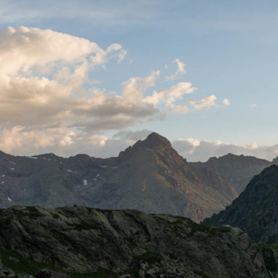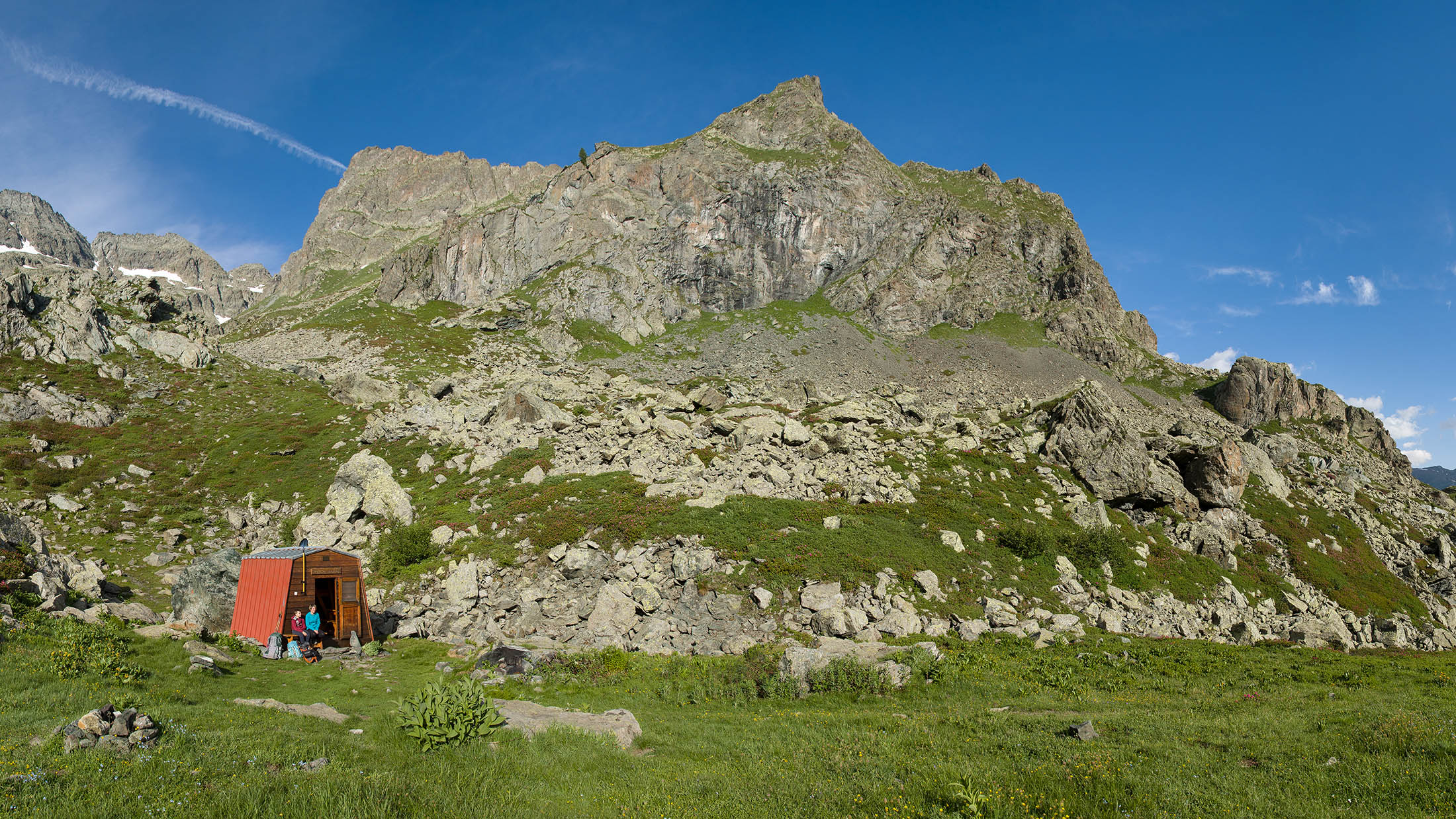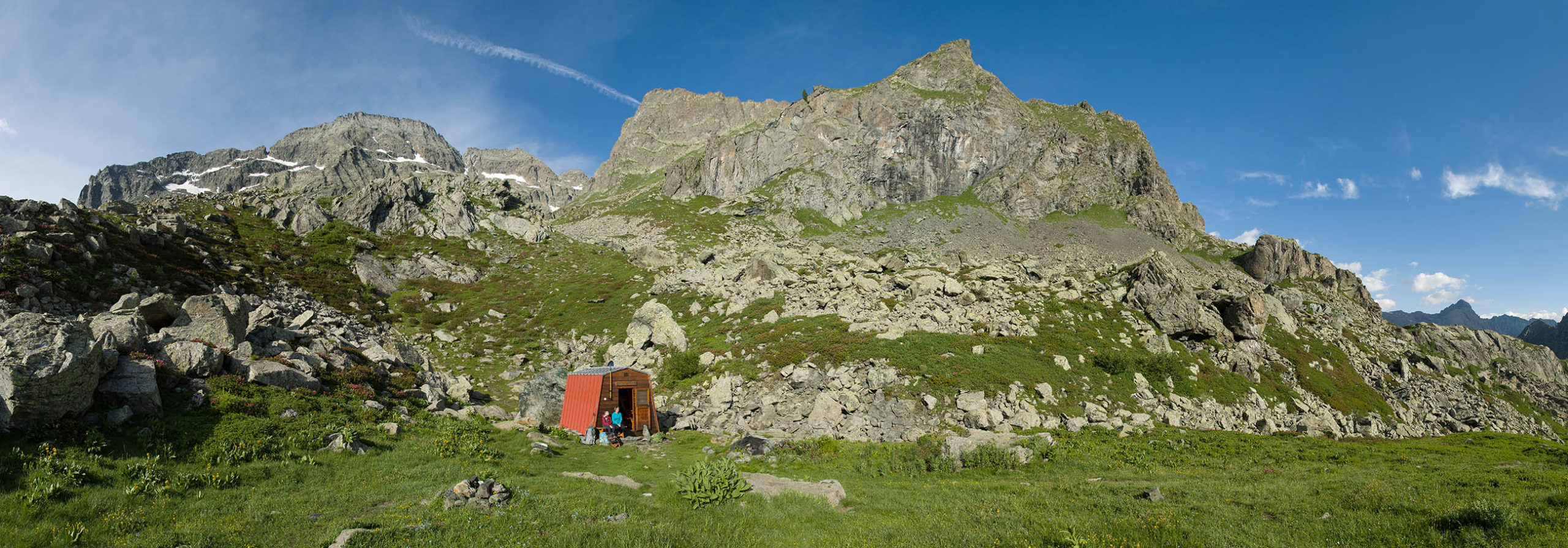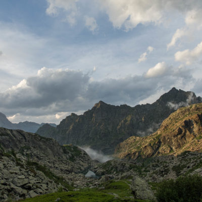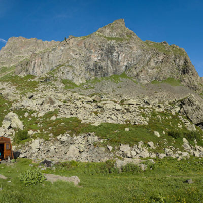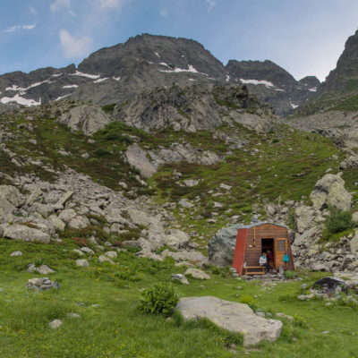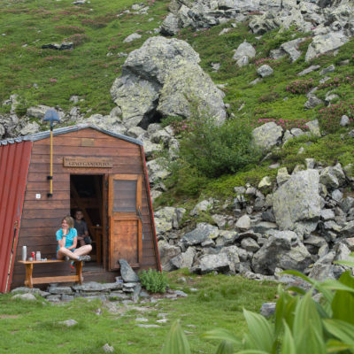 Die zweitägige Wanderung beginnt unterhalb der Häuser von I Frè an der Holzbrücke, die über den Rio Paschiet führt. Der gesamte Aufstieg bis zu den Laghi Verdi führt durch das abgeschiedene und stille Vallone del Paschiet, zunächst über offenes Weideland mit vielen verstreuten Lärchen. Die Einheimischen nennen das Tal auch Val Servin. Nach der Alpe Pian Salè (1588 m) verschwindet der Weg eine Weile im Wald und windet sich hinauf zur Alpe Garavela, ein einzeln stehender Stall am Waldrand mit einem Brunnen (1723 m). Wenige Schritte weiter oben befindet sich ein weiteres Alpgebäude (1744 m), das ebenfalls zur Alpe Garavela gehört. Jenseits der Alp wandert man durch nun offenes Gelände auf der orografisch rechten Seite des Rio Paschiet das in diesem Abschnitt enge und felsige Tal hinauf. Eine Dreiviertelstunde später wird der Weg sanfter und knickt nach Osten ab, vor einem erstreckt sich eine weite Hochfläche mit den verfallenen Hütten der Alpe Pian Buet (2006 m). Ein malerisches Fleckchen, mit tollem Panorama auf die Berge des oberen Val d‘Ala, die gewaltige Ostwand der Bessanese (3604 m) und die Uja di Ciamarella (3676 m) sind hier die markantesten Erhebungen. Durch Erlengebüsch und im Frühsommer blühende Alpenrosen geht es weiterhin bergauf, nach einer guten halben Stunde erreicht man schliesslich den unteren der beiden türkisgrünen Laghi Verdi (2142 m), der sich inmitten eines kargen und von riesigen Felsbrocken übersäten Hochtals befindet. Hier lohnt es sich, ein wenig zu verweilen und die landschaftlich beeindruckende Umgebung zu geniessen. Wenige Minuten später kommt man zu dem oberen der beiden Seen (2168 m), wahrlich eine Perle der Natur, eingebettet von mächtigen Felswänden. Das Ziel des Tages ist von hier bereits zu sehen, der steinige Pfad führt zunächst oberhalb des oberen Sees entlang, dann geht es über verbuschendes Weideland noch wenige Höhenmeter hinauf zum kleinen aber feinen Bivacco Gandolfo-Giuliano (2220 m). Den Rest des Tages kann man hier die Füsse in den Himmel strecken und die Seele baumeln lassen. Die herrliche Gegend in der Umgebung der beiden Bergseen sind hierzu die perfekte Kulisse. Die immer frei zugängliche Selbstversorgerhütte hat acht Schlafplätze und eine kleine Sitzecke, Wasser befindet sich wenige Meter unterhalb an einem Bachlauf.
