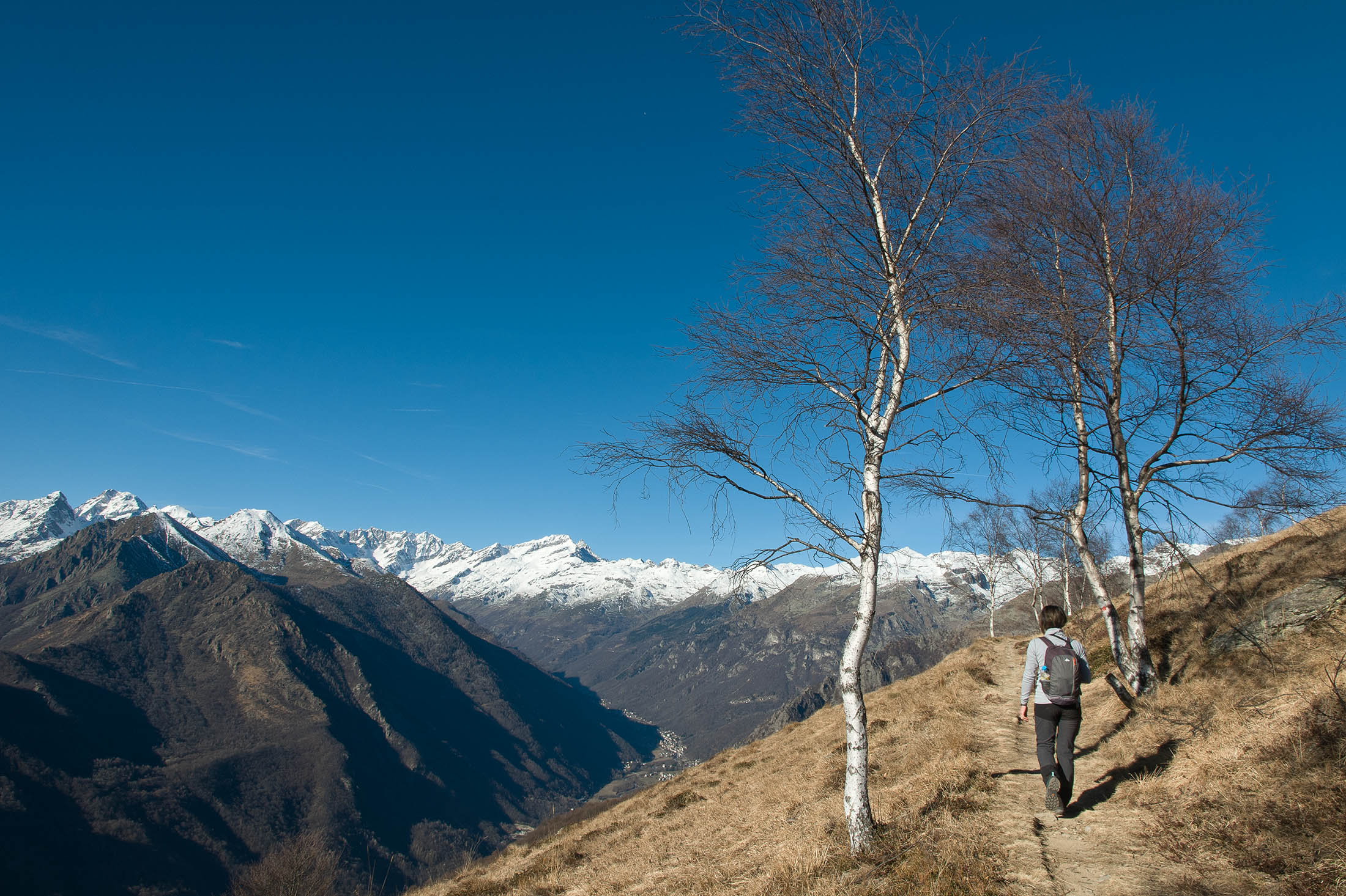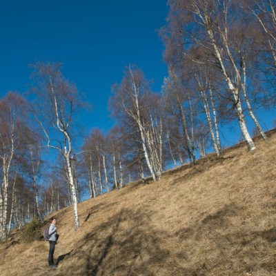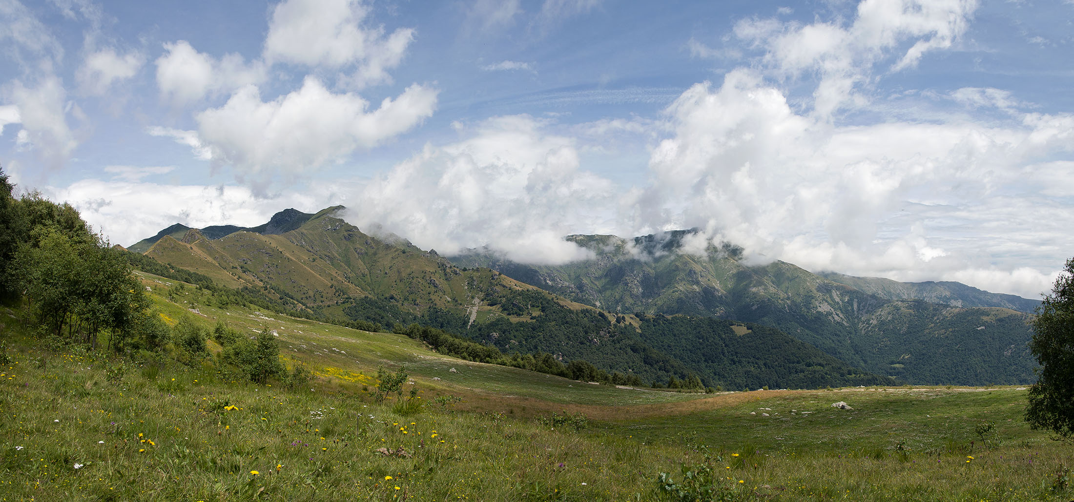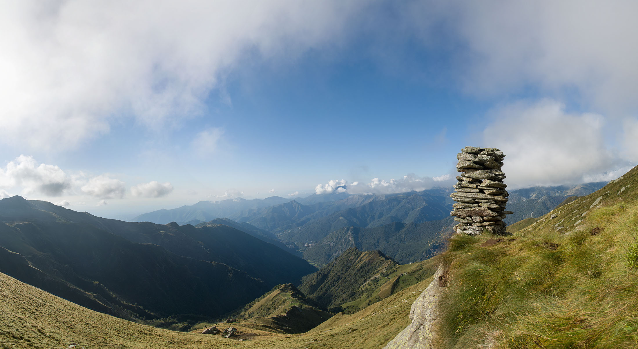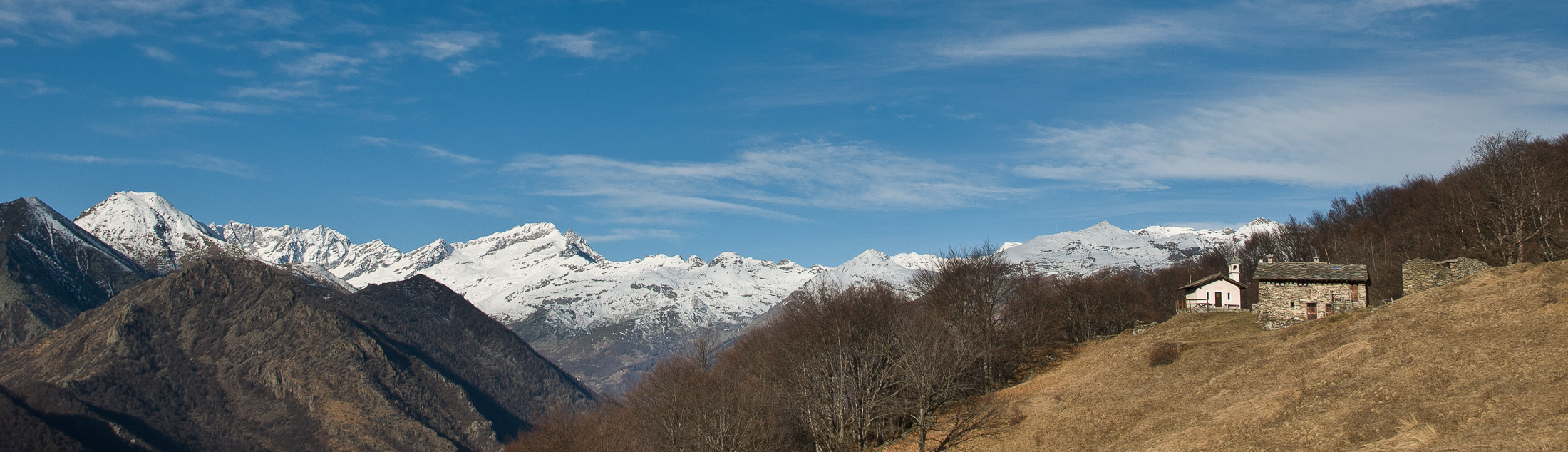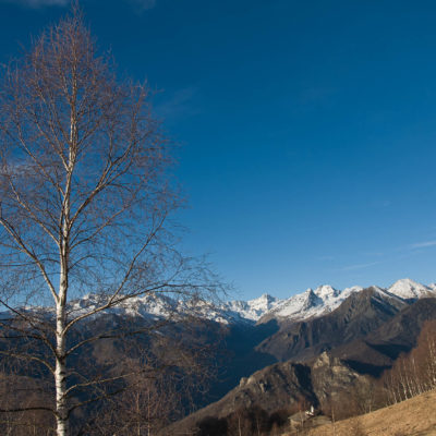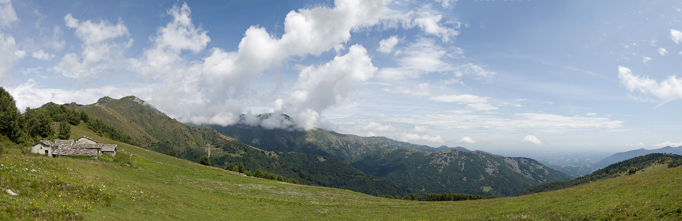Vom Colle San Giacomo (1460 m) folgt man der Wegspur über die Weiden und erreicht in Kürze die Alpe Santa Barbara (1504 m), die beiden ehemaligen Alpgebäude wurden zu Wochenendhäusern umgebaut. Der Weiterweg führt durch einen lauschigen Birkenwald. Die Umgebung der Alpe Santa Barbara war einst gerodet, auf den heute von Birken überwachsenen Flächen weideten über Generationen Kühe, Schafe und Ziegen. Seit der weitgehenden Einstellung der traditionellen Alpwirtschaft hat sich das Landschaftsbild stark verändert, immer mehr Weideflächen liegen brach und verbuschen infolge der Nichtnutzung. Nach einer Weile mündet der Weg in die unbefestigte Zufahrtsstrasse zur Alpe di Monastero und man erreicht den grossen Gedenkstein für die Gefallenen des Krieges am Colle della Forchetta (1589 m). Zwei Kehren weiter oberhalb zweigt links eine anfangs undeutliche Pfadspur ab, auf dieser in Kürze hinauf auf den aussichtsreichen Gratrücken, der das Val Grande di Lanzo vom östlich gelegenene Valle Tesso trennt. Nun folgt ein besonders eindrücklicher Wegabschnitt. Mitten auf dem einsamen Kamm steht der Decollo di Menulla (1663 m), eine originelle handgeschnitzte Holzfigur. Hier liegt einem die Welt zu Füssen, das Panorama auf die Gipfelkulisse der drei Lanzo-Täler ist atemberaubend, bei klarem Wetter blickt man auf die nahe Tiefebene mit der Millionenmetropole von Turin.