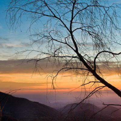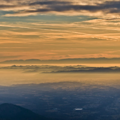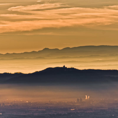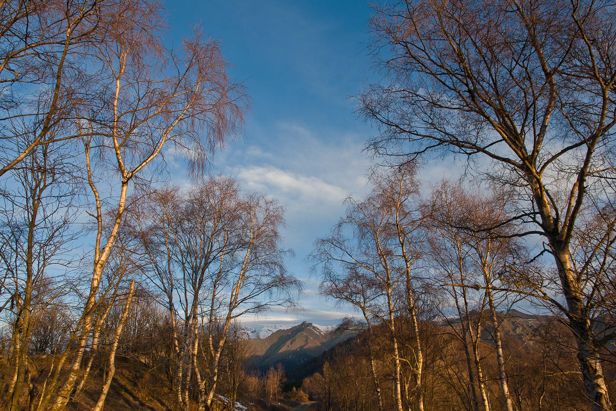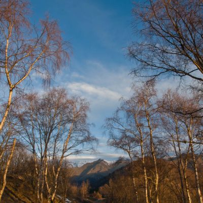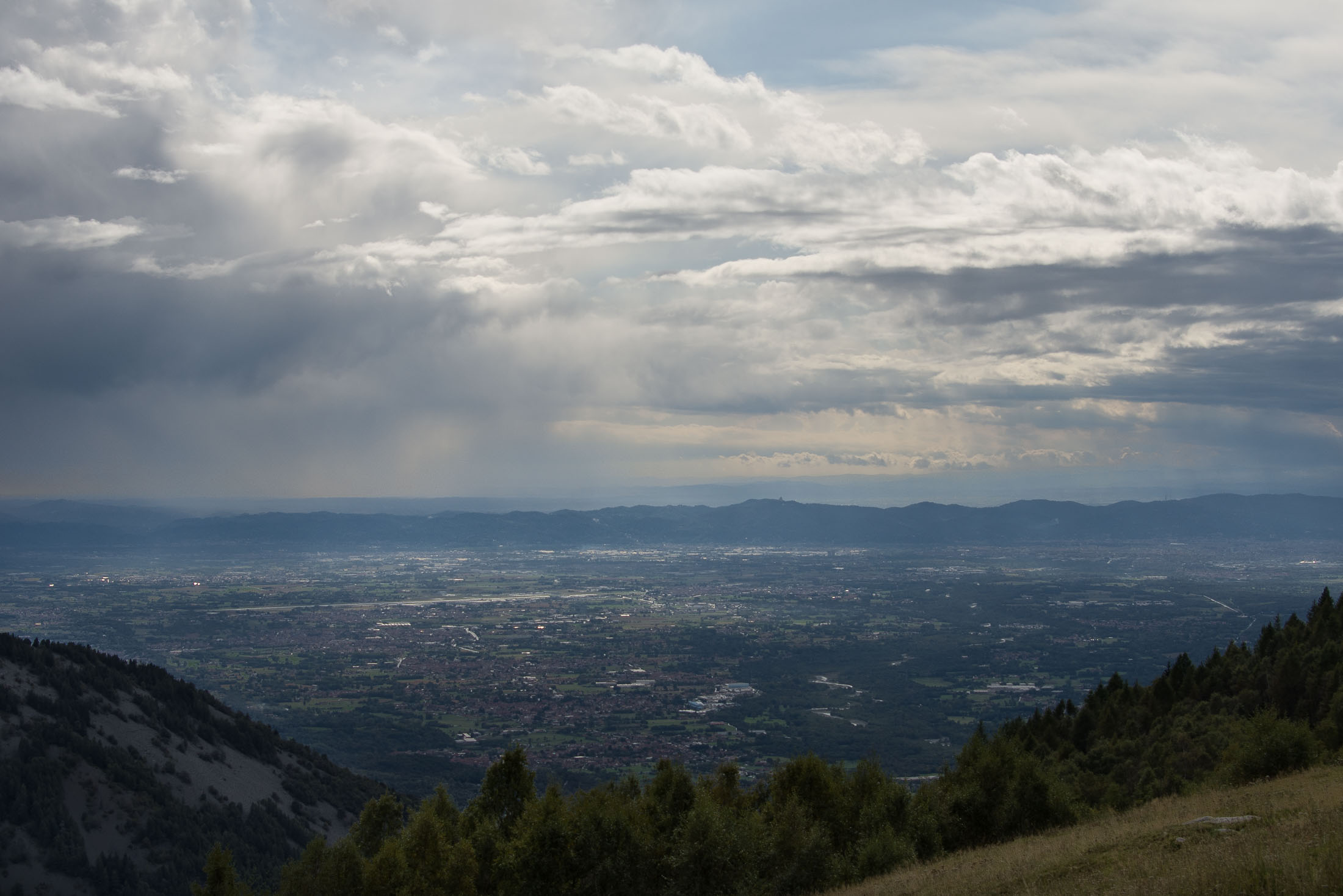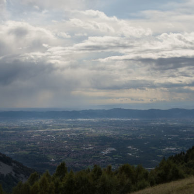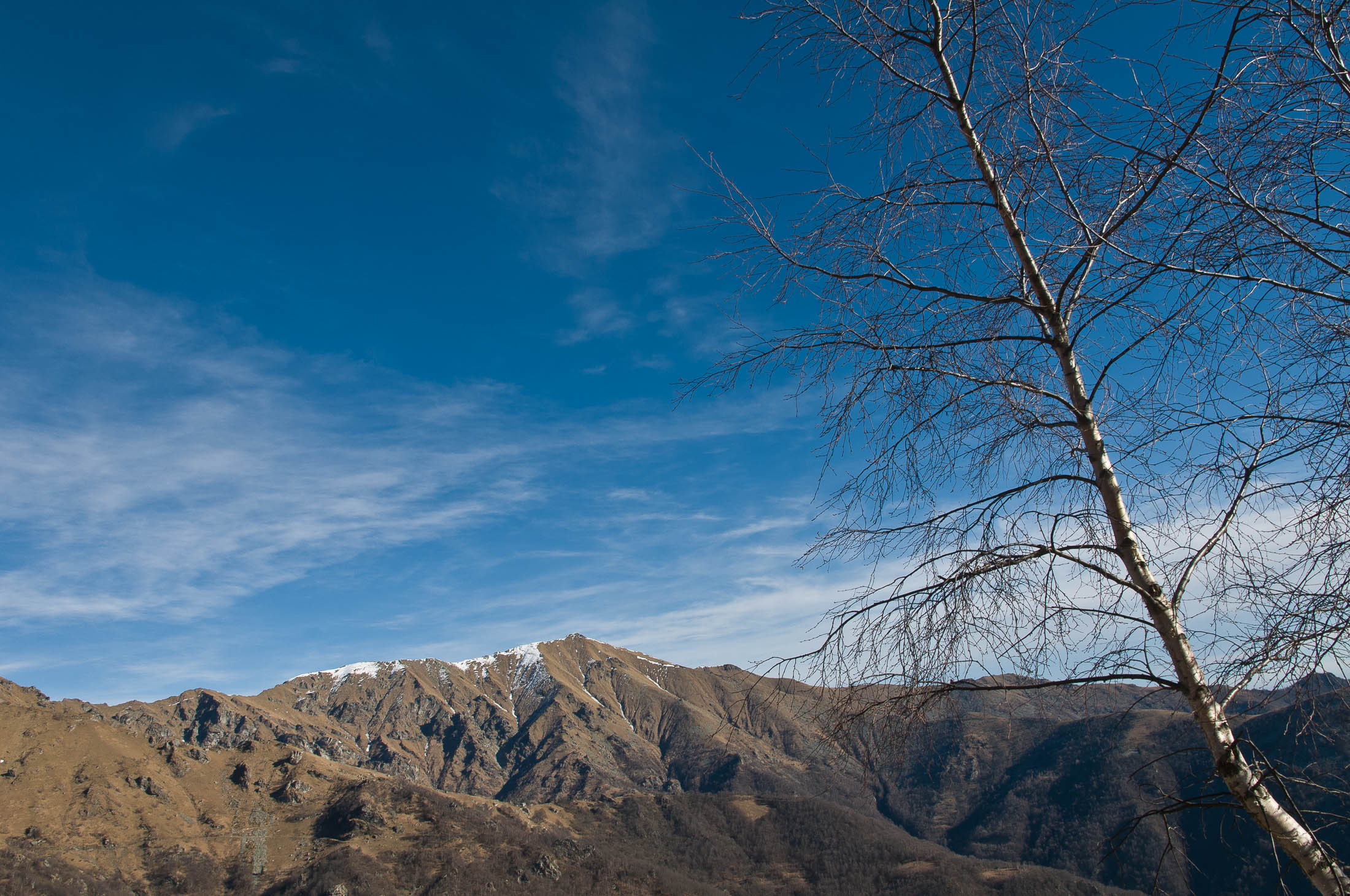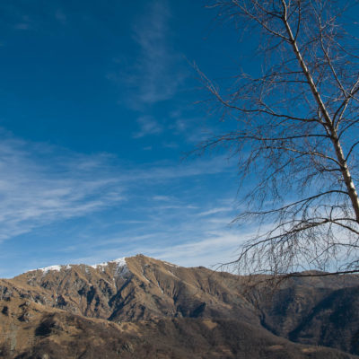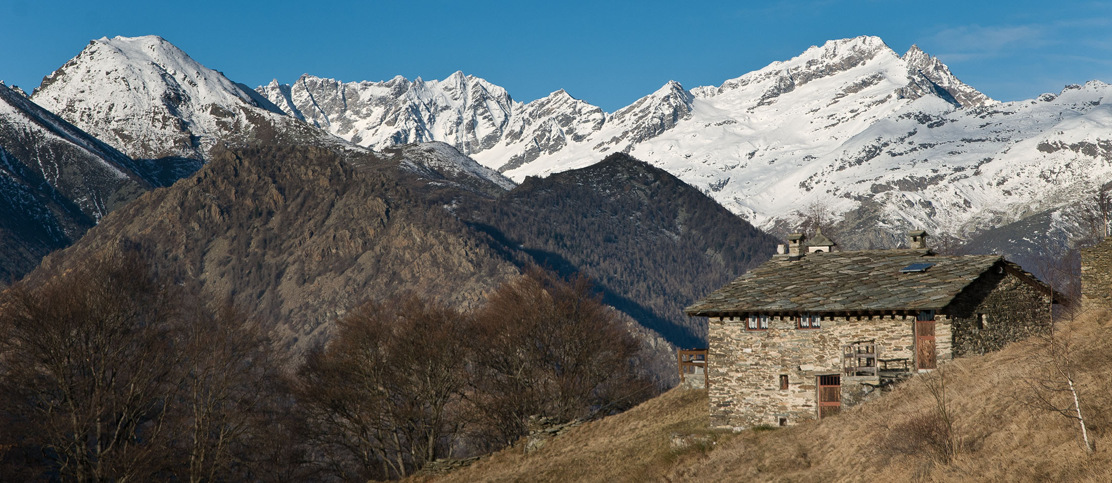 Vom Colle San Giacomo (1460 m) folgt man der Wegspur über die Weiden und erreicht in Kürze die Alpe Santa Barbara (1504 m), die beiden ehemaligen Alpgebäude wurden zu Wochenendhäusern umgebaut. Der Weiterweg führt durch einen lauschigen Birkenwald. Die Umgebung der Alpe Santa Barbara war einst gerodet, auf den heute von Birken überwachsenen Flächen weideten über Generationen Kühe, Schafe und Ziegen. Seit der weitgehenden Einstellung der traditionellen Alpwirtschaft hat sich das Landschaftsbild stark verändert, immer mehr Weideflächen liegen brach und verbuschen infolge der Nichtnutzung. Nach einer Weile mündet der Weg in die unbefestigte Zufahrtsstrasse zur Alpe di Monastero und man erreicht den grossen Gedenkstein für die Gefallenen des Krieges am Colle della Forchetta (1589 m). Zwei Kehren weiter oberhalb zweigt links eine anfangs undeutliche Pfadspur ab, auf dieser in Kürze hinauf auf den aussichtsreichen Gratrücken, der das Val Grande di Lanzo vom östlich gelegenene Valle Tesso trennt. Nun folgt ein besonders eindrücklicher Wegabschnitt. Mitten auf dem einsamen Kamm steht der Decollo di Menulla (1663 m), eine originelle handgeschnitzte Holzfigur. Hier liegt einem die Welt zu Füssen, das Panorama auf die Gipfelkulisse der drei Lanzo-Täler ist atemberaubend, bei klarem Wetter blickt man auf die nahe Tiefebene mit der Millionenmetropole von Turin.