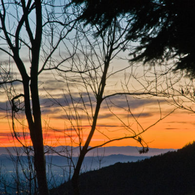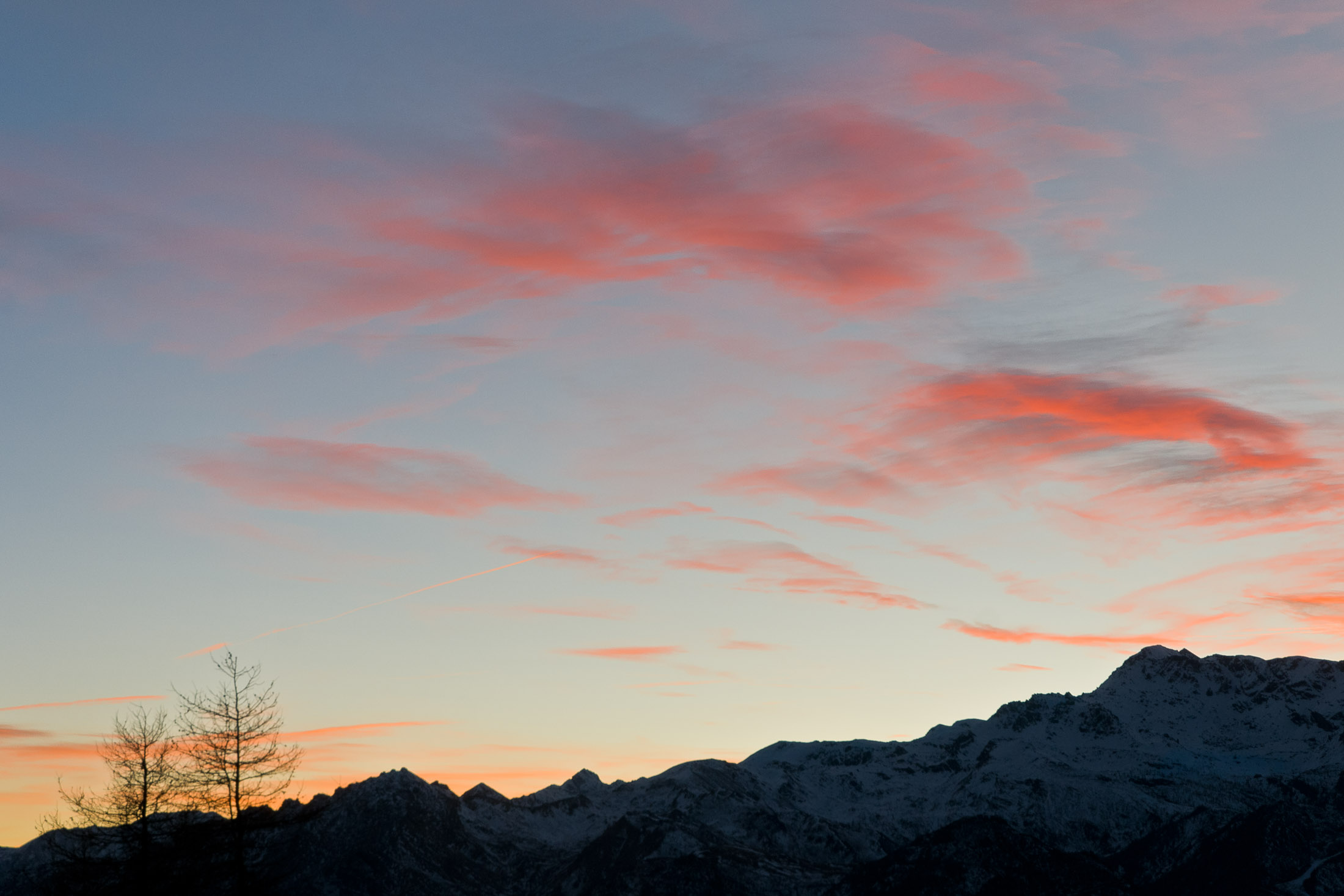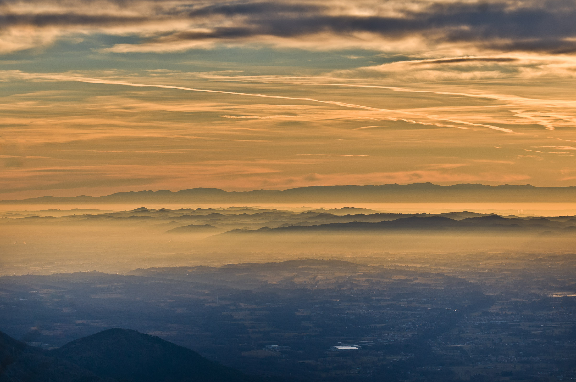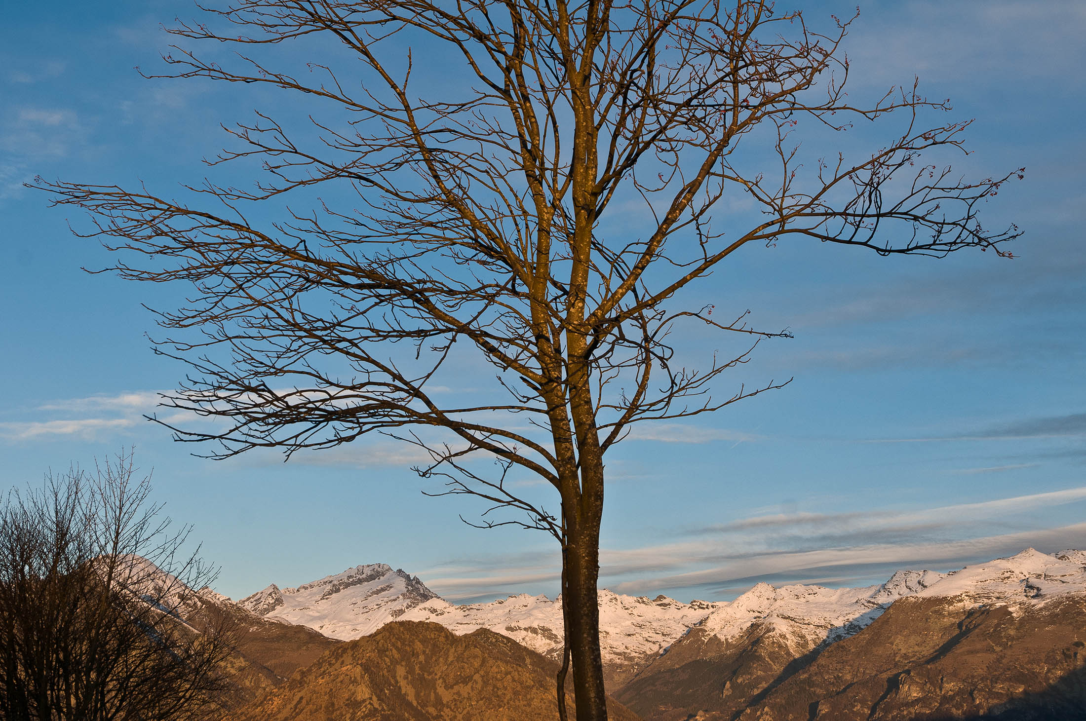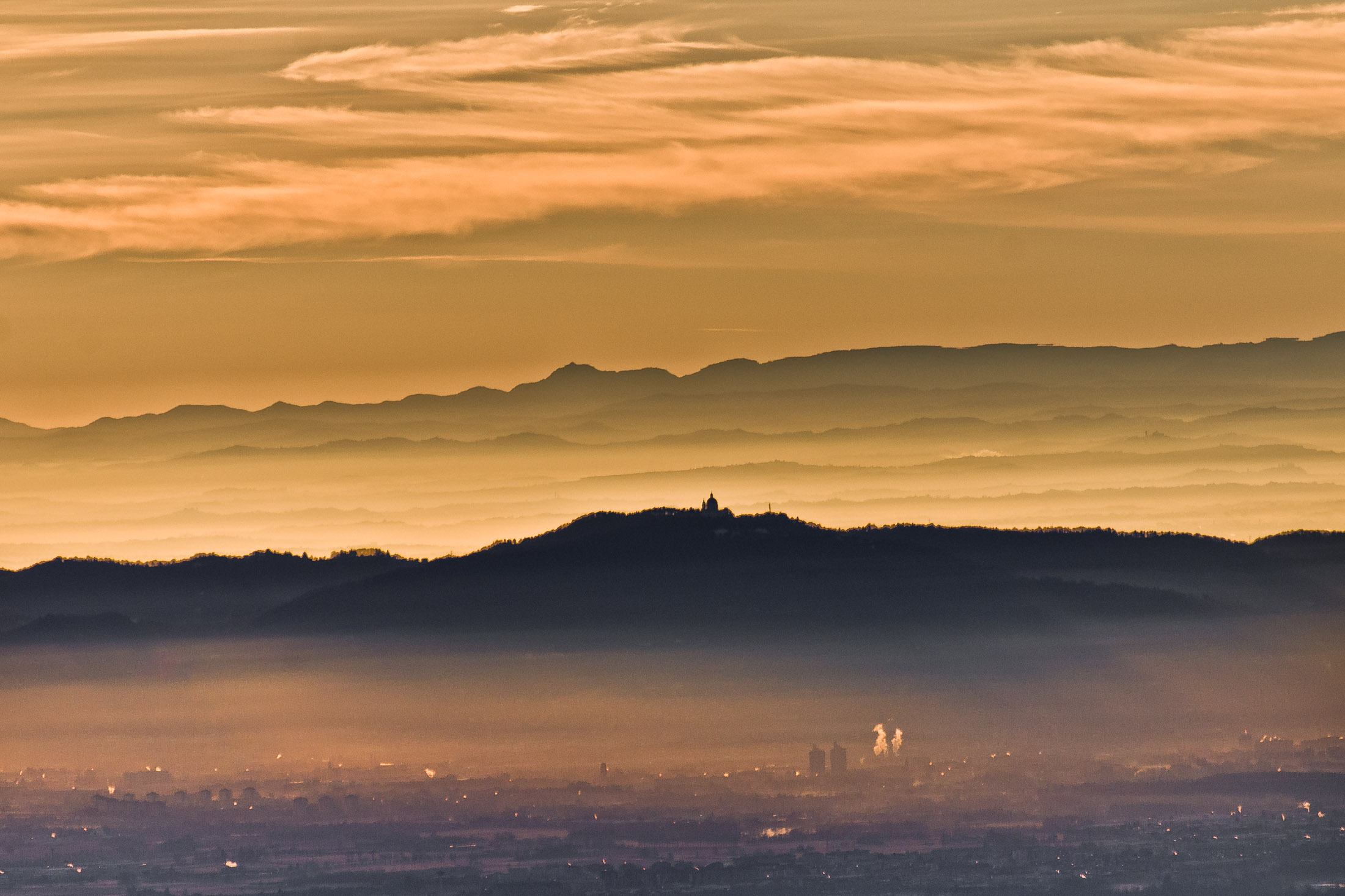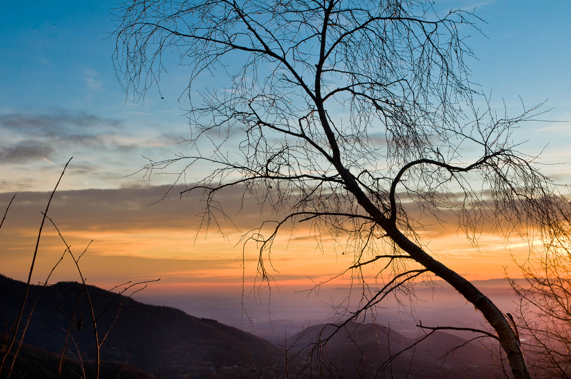 Vom Colle San Giacomo (1460 m) folgt man der Wegspur über die Weiden und erreicht in Kürze die Alpe Santa Barbara (1504 m), die beiden ehemaligen Alpgebäude wurden zu Wochenendhäusern umgebaut. Der Weiterweg führt durch einen lauschigen Birkenwald. Die Umgebung der Alpe Santa Barbara war einst gerodet, auf den heute von Birken überwachsenen Flächen weideten über Generationen Kühe, Schafe und Ziegen. Seit der weitgehenden Einstellung der traditionellen Alpwirtschaft hat sich das Landschaftsbild stark verändert, immer mehr Weideflächen liegen brach und verbuschen infolge der Nichtnutzung. Nach einer Weile mündet der Weg in die unbefestigte Zufahrtsstrasse zur Alpe di Monastero und man erreicht den grossen Gedenkstein für die Gefallenen des Krieges am Colle della Forchetta (1589 m). Zwei Kehren weiter oberhalb zweigt links eine anfangs undeutliche Pfadspur ab, auf dieser in Kürze hinauf auf den aussichtsreichen Gratrücken, der das Val Grande di Lanzo vom östlich gelegenene Valle Tesso trennt. Nun folgt ein besonders eindrücklicher Wegabschnitt. Mitten auf dem einsamen Kamm steht der Decollo di Menulla (1663 m), eine originelle handgeschnitzte Holzfigur. Hier liegt einem die Welt zu Füssen, das Panorama auf die Gipfelkulisse der drei Lanzo-Täler ist atemberaubend, bei klarem Wetter blickt man auf die nahe Tiefebene mit der Millionenmetropole von Turin.