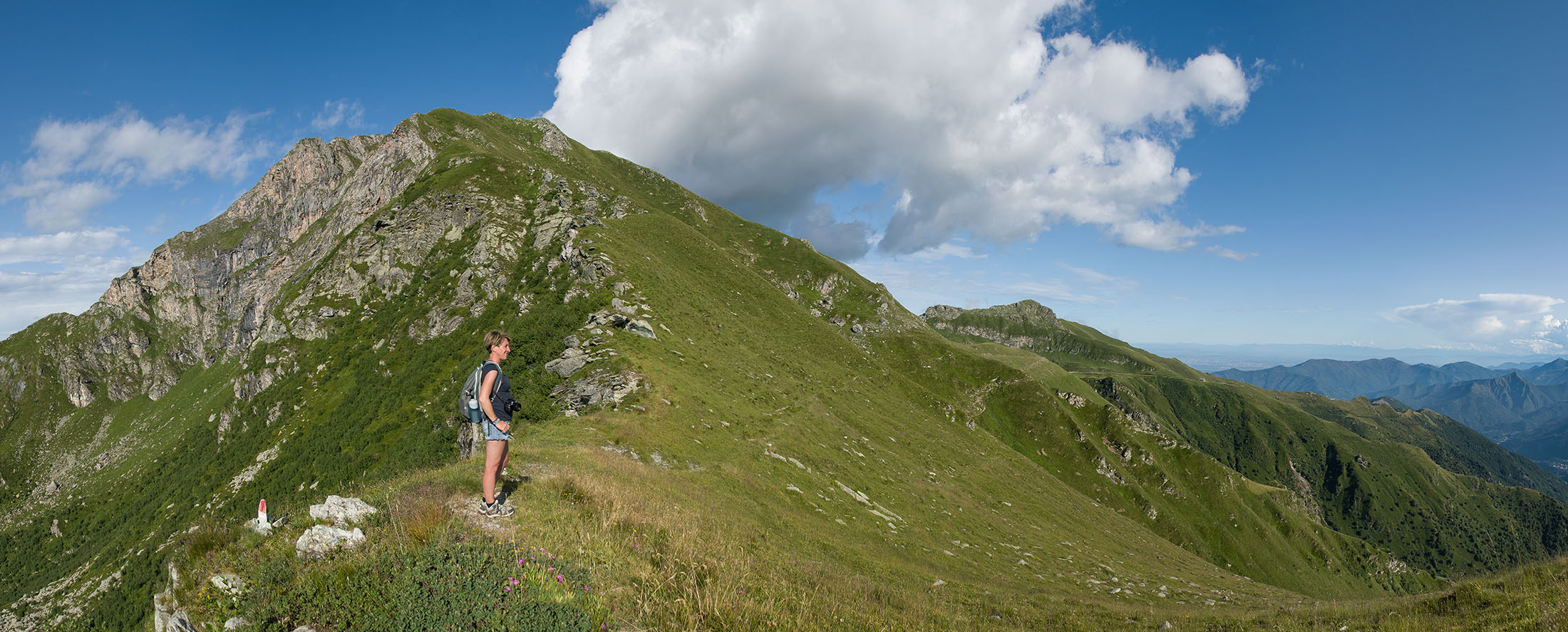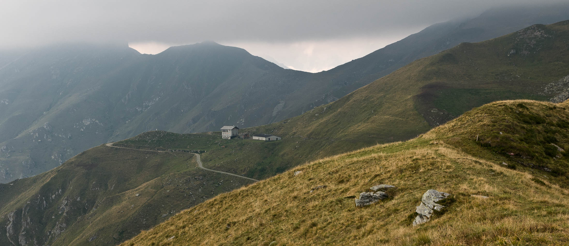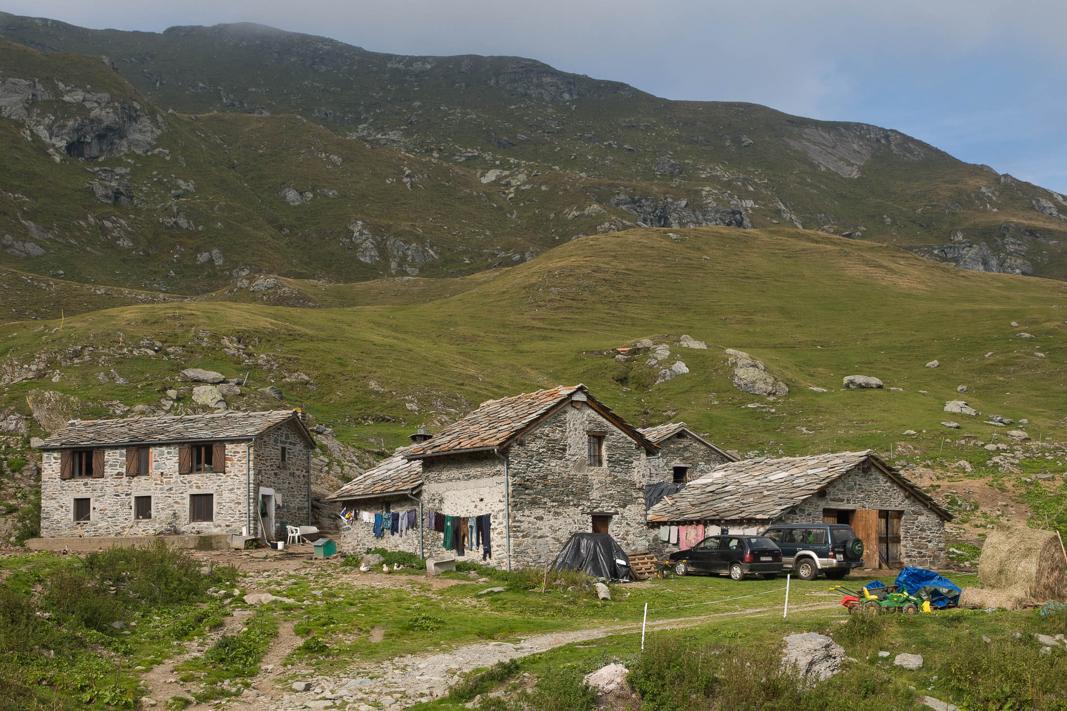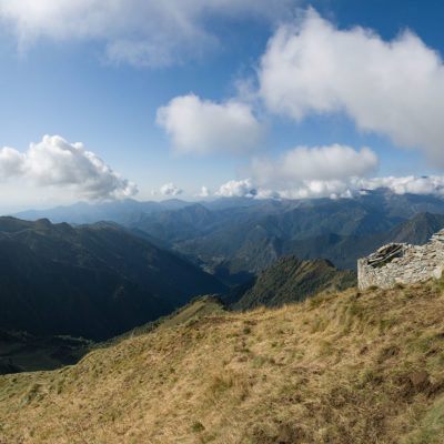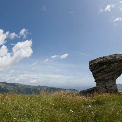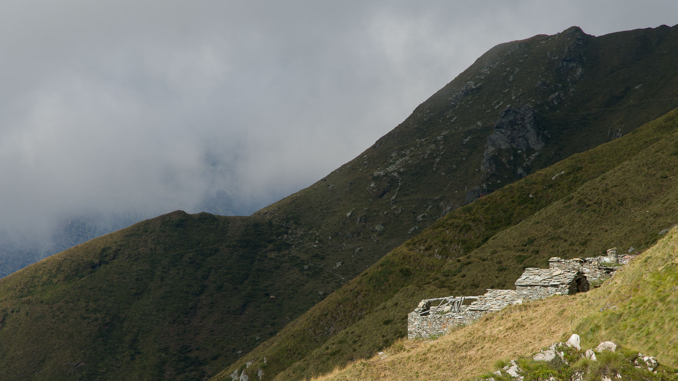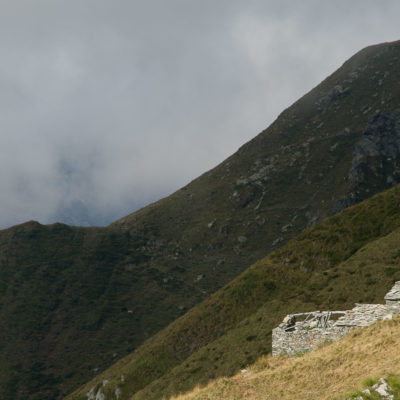 Der Pfad folgt weiterhin dem Gratverlauf, zunächst geht es einige Höhenmeter bergab, vorbei an einer einzelstehenden renovierten Hütte, nach einem kurzen Gegenanstieg kommt man zu den Gebäuden der Alpe Roc del Gal (1693 m, in manchen Karten auch als Alpe Rocca del Gallo bezeichnet). Direkt daneben ein riesiger, bizarr anmutender Felsklotz, der mitten in der endlosen Weite herumsteht. Bei den Hütten der Prati della Fontana (1701 m) mündet der Weg wieder in die parallel verlaufende Alpstrasse. Auf dieser wandert man nun gemütlichen Schrittes in einer knappen Stunde zur Alpe di Monastero (1971 m). Zwischen Juni und Mitte September ist man hier oben nicht alleine, die Alp wird noch bewirtschaftet, von den umliegenden Weiden ertönt die passende Begleitmusik. Giovanni Stabio, ein kantiger Mittsiebziger mit sonnengegerbtem faltigem Gesicht und markantem Schnauzer, schmeisst hier den Laden. Un vero montanaro, ein wahrer Mann der Berge, sympathisch, temperamentvoll, authentisch. Wenn Giovanni lospoltert und lacht, bekommt man eine Gänsehaut. Es ist immer wieder ein Erlebnis, seinen Erzählungen zu lauschen, der Mann scheint mit sich selbst im Reinen zu sein. Sommer für Sommer verbringt er gemeinsam mit seinem Sohn Domenico und seinen Tieren hier oben auf der Alp, bereits sein ganzes Leben. Im August ziehen Giovanni und Domenico mit den Kühen vorübergehend auf die höhengelegenen Weiden der Alpe Costapiana, bevor sie Anfang September wieder zur Alpe di Monastero zurückkehren. Den Rest des Jahres bewirtschaftet er mit seiner Familie seinen Hof, irgendwo weit draussen in der Po-Ebene.