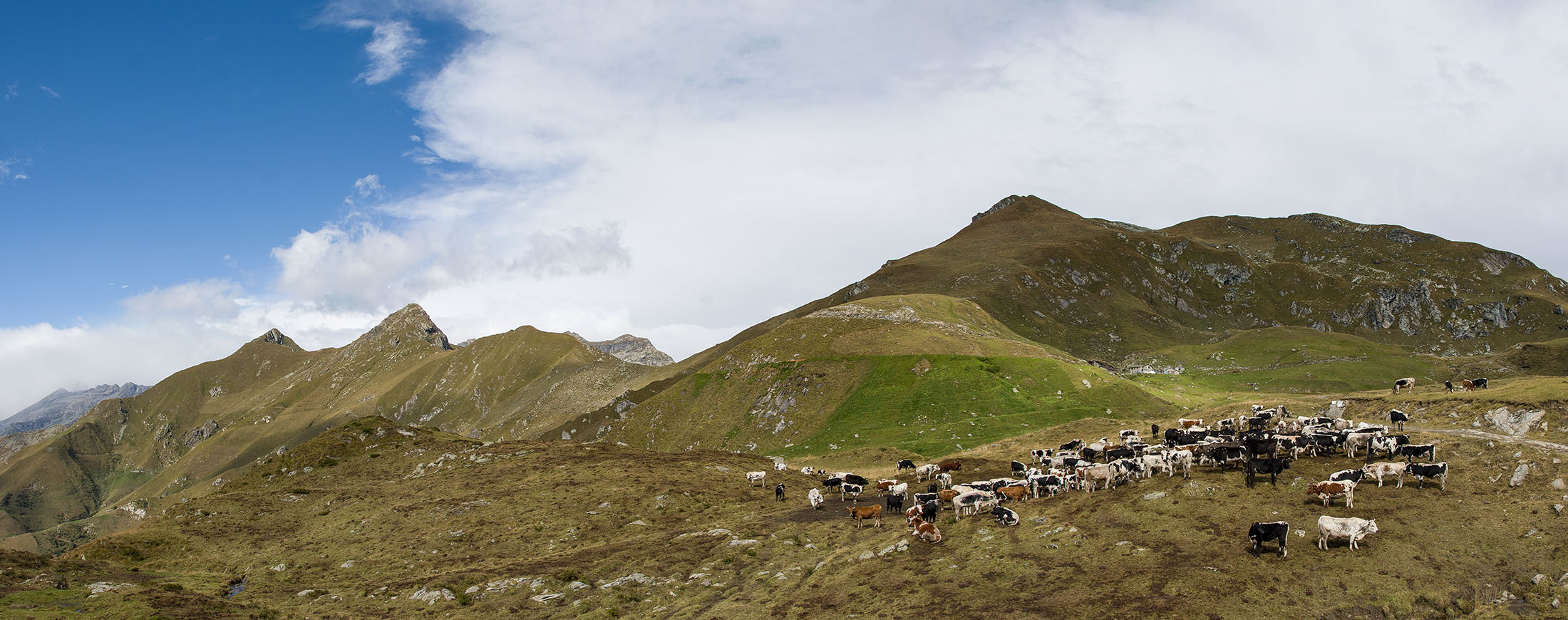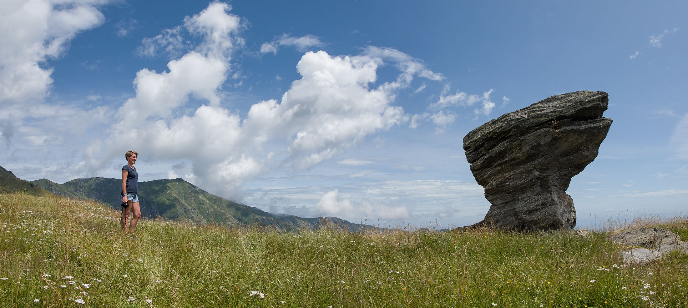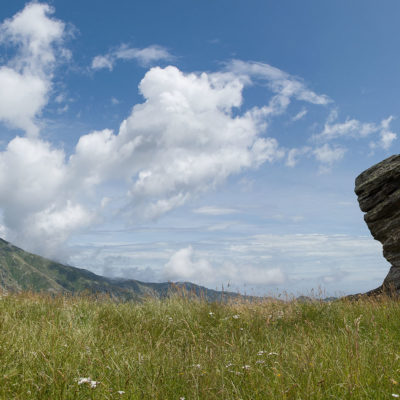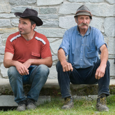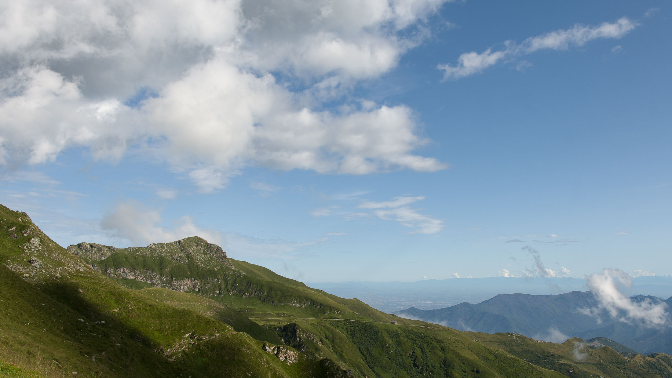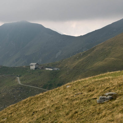 Der Pfad folgt weiterhin dem Gratverlauf, zunächst geht es einige Höhenmeter bergab, vorbei an einer einzelstehenden renovierten Hütte, nach einem kurzen Gegenanstieg kommt man zu den Gebäuden der Alpe Roc del Gal (1693 m, in manchen Karten auch als Alpe Rocca del Gallo bezeichnet). Direkt daneben ein riesiger, bizarr anmutender Felsklotz, der mitten in der endlosen Weite herumsteht. Bei den Hütten der Prati della Fontana (1701 m) mündet der Weg wieder in die parallel verlaufende Alpstrasse. Auf dieser wandert man nun gemütlichen Schrittes in einer knappen Stunde zur Alpe di Monastero (1971 m). Zwischen Juni und Mitte September ist man hier oben nicht alleine, die Alp wird noch bewirtschaftet, von den umliegenden Weiden ertönt die passende Begleitmusik. Giovanni Stabio, ein kantiger Mittsiebziger mit sonnengegerbtem faltigem Gesicht und markantem Schnauzer, schmeisst hier den Laden. Un vero montanaro, ein wahrer Mann der Berge, sympathisch, temperamentvoll, authentisch. Wenn Giovanni lospoltert und lacht, bekommt man eine Gänsehaut. Es ist immer wieder ein Erlebnis, seinen Erzählungen zu lauschen, der Mann scheint mit sich selbst im Reinen zu sein. Sommer für Sommer verbringt er gemeinsam mit seinem Sohn Domenico und seinen Tieren hier oben auf der Alp, bereits sein ganzes Leben. Im August ziehen Giovanni und Domenico mit den Kühen vorübergehend auf die höhengelegenen Weiden der Alpe Costapiana, bevor sie Anfang September wieder zur Alpe di Monastero zurückkehren. Den Rest des Jahres bewirtschaftet er mit seiner Familie seinen Hof, irgendwo weit draussen in der Po-Ebene.