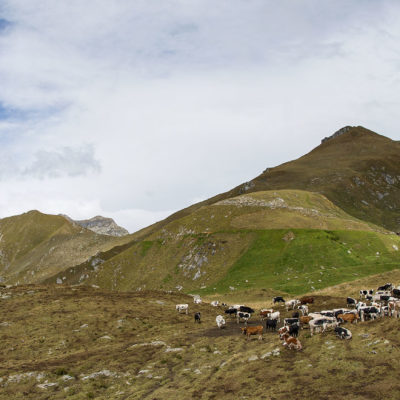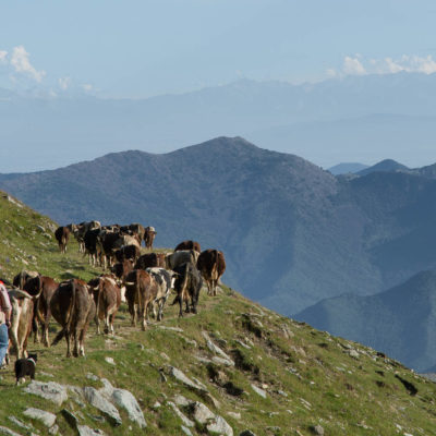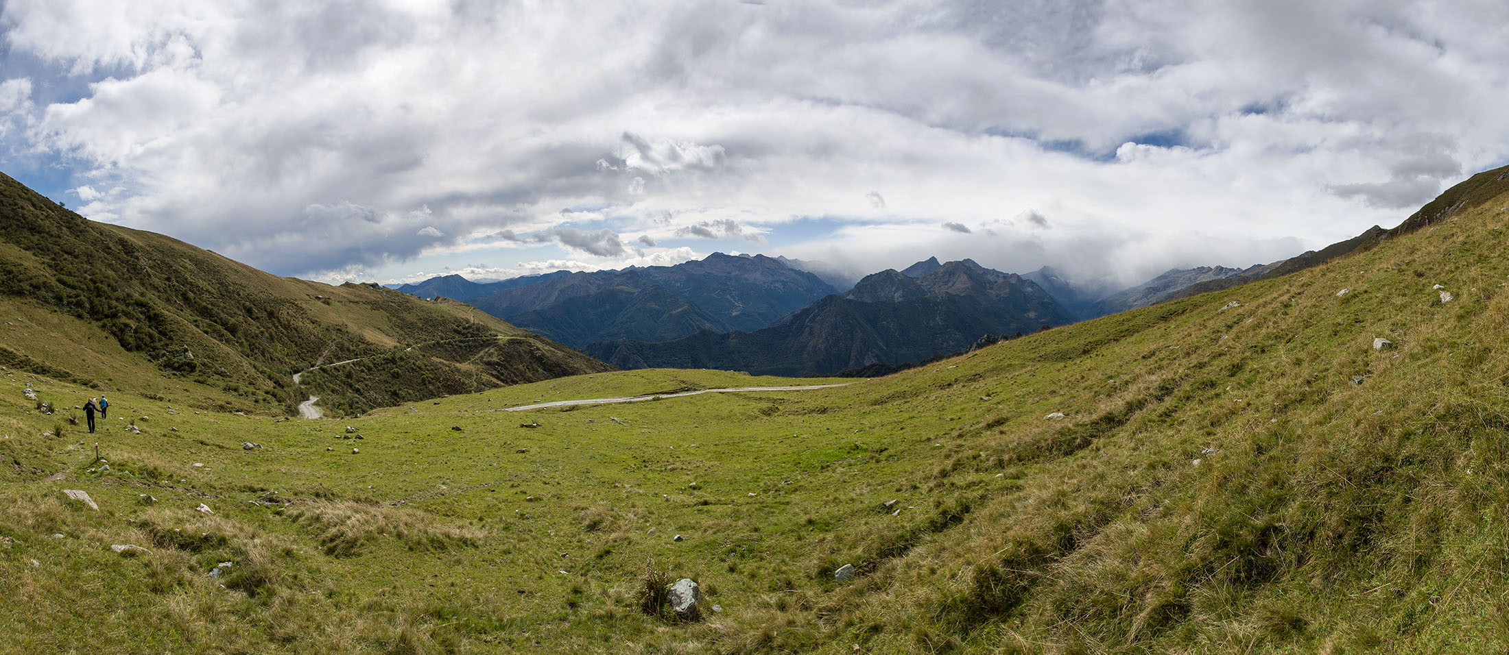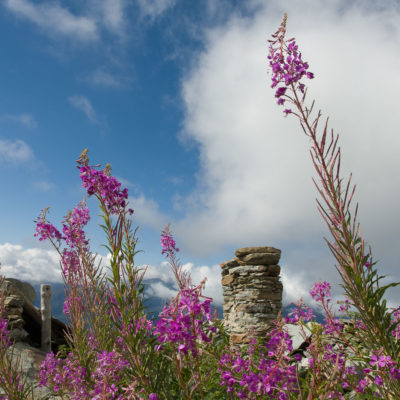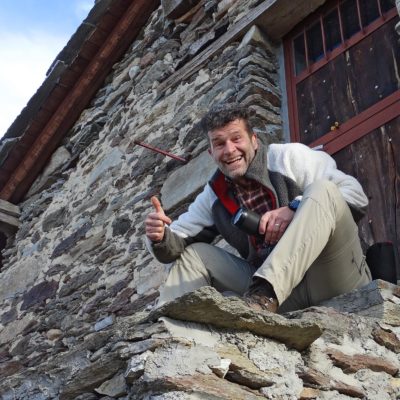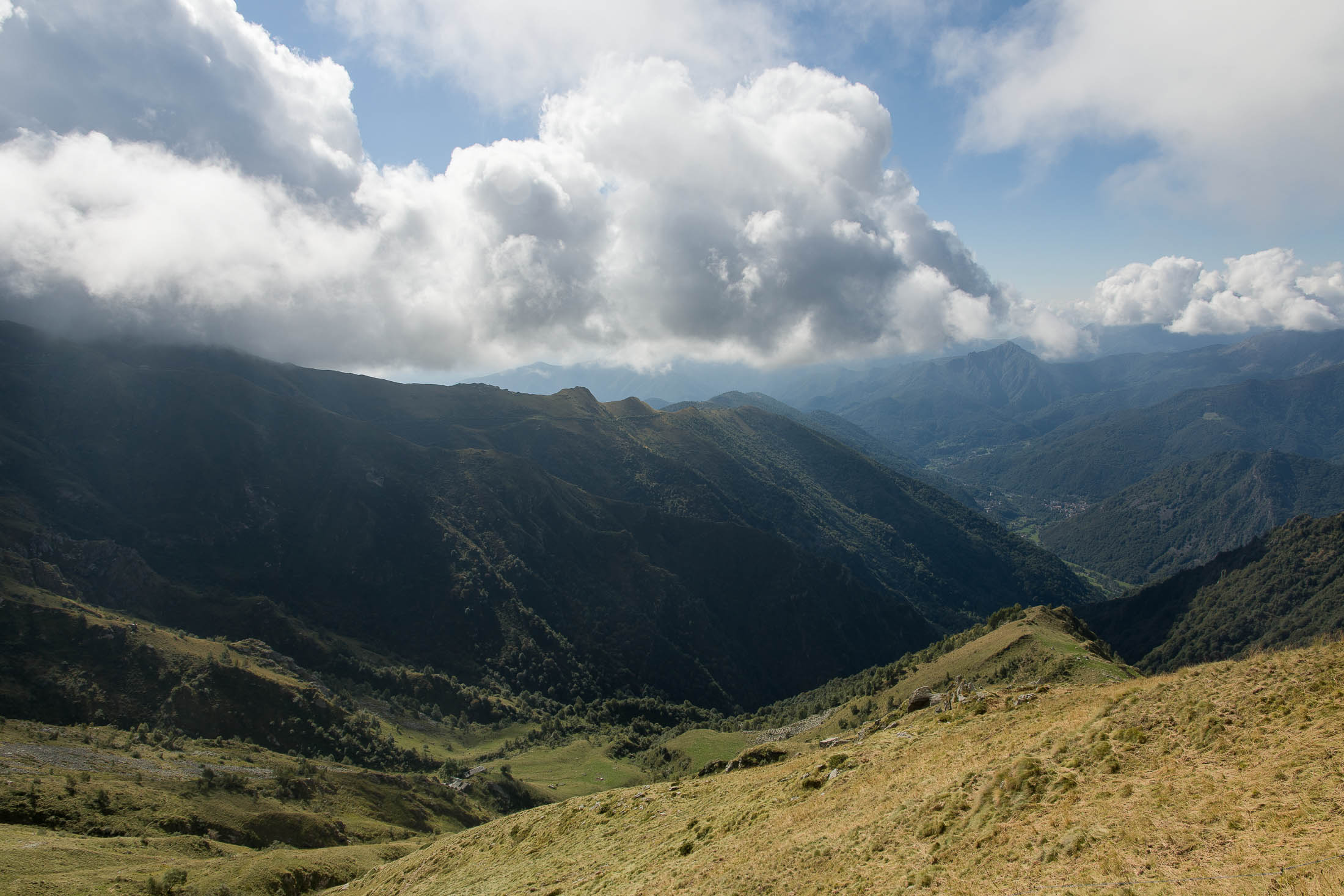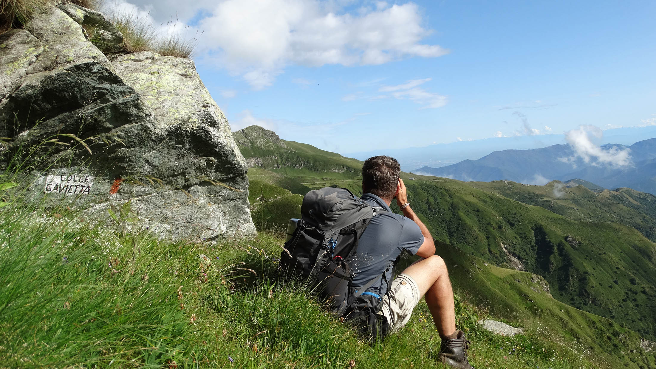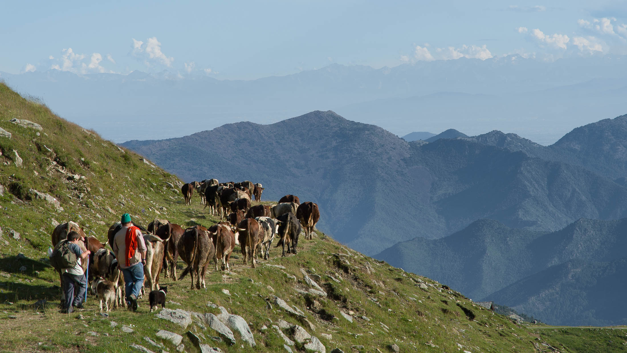 Der Pfad folgt weiterhin dem Gratverlauf, zunächst geht es einige Höhenmeter bergab, vorbei an einer einzelstehenden renovierten Hütte, nach einem kurzen Gegenanstieg kommt man zu den Gebäuden der Alpe Roc del Gal (1693 m, in manchen Karten auch als Alpe Rocca del Gallo bezeichnet). Direkt daneben ein riesiger, bizarr anmutender Felsklotz, der mitten in der endlosen Weite herumsteht. Bei den Hütten der Prati della Fontana (1701 m) mündet der Weg wieder in die parallel verlaufende Alpstrasse. Auf dieser wandert man nun gemütlichen Schrittes in einer knappen Stunde zur Alpe di Monastero (1971 m). Zwischen Juni und Mitte September ist man hier oben nicht alleine, die Alp wird noch bewirtschaftet, von den umliegenden Weiden ertönt die passende Begleitmusik. Giovanni Stabio, ein kantiger Mittsiebziger mit sonnengegerbtem faltigem Gesicht und markantem Schnauzer, schmeisst hier den Laden. Un vero montanaro, ein wahrer Mann der Berge, sympathisch, temperamentvoll, authentisch. Wenn Giovanni lospoltert und lacht, bekommt man eine Gänsehaut. Es ist immer wieder ein Erlebnis, seinen Erzählungen zu lauschen, der Mann scheint mit sich selbst im Reinen zu sein. Sommer für Sommer verbringt er gemeinsam mit seinem Sohn Domenico und seinen Tieren hier oben auf der Alp, bereits sein ganzes Leben. Im August ziehen Giovanni und Domenico mit den Kühen vorübergehend auf die höhengelegenen Weiden der Alpe Costapiana, bevor sie Anfang September wieder zur Alpe di Monastero zurückkehren. Den Rest des Jahres bewirtschaftet er mit seiner Familie seinen Hof, irgendwo weit draussen in der Po-Ebene.
