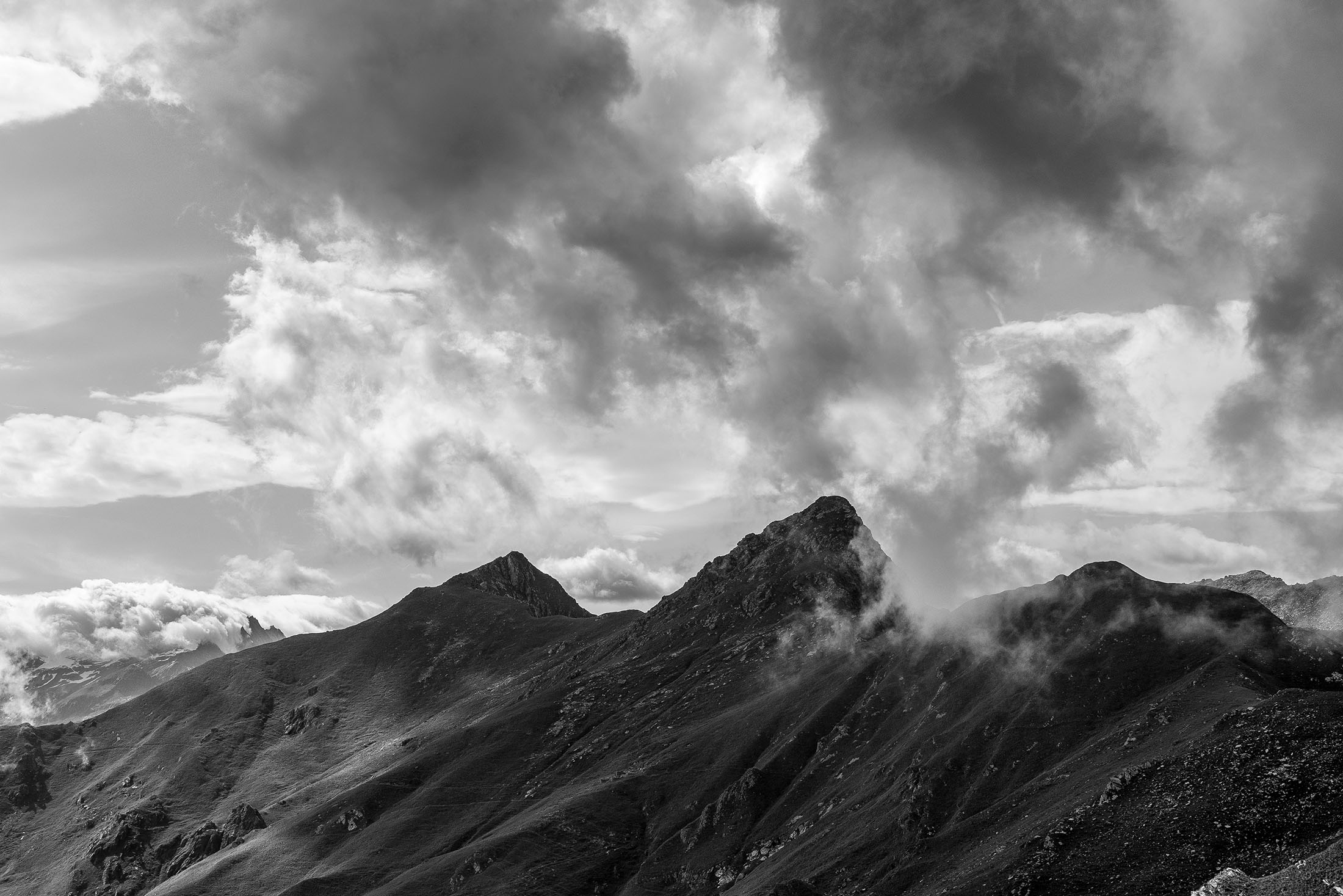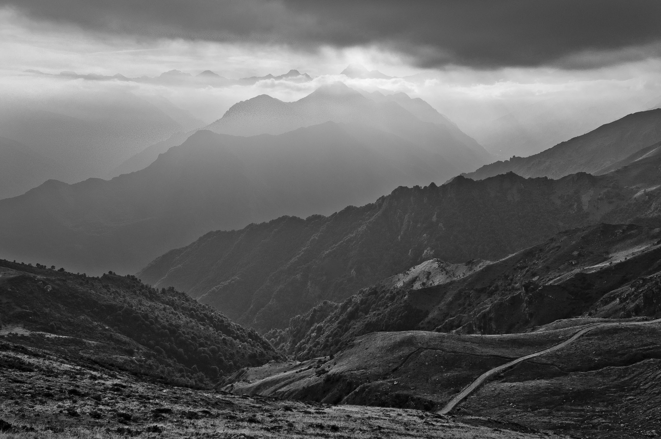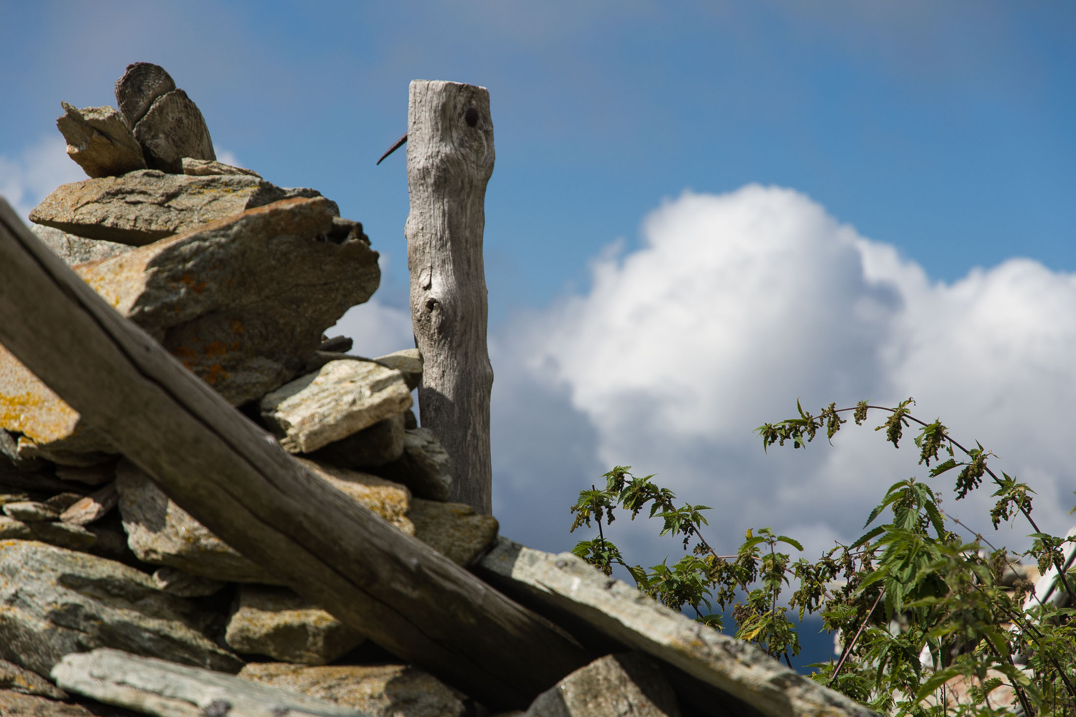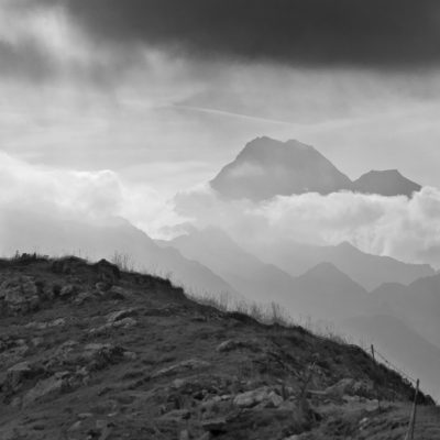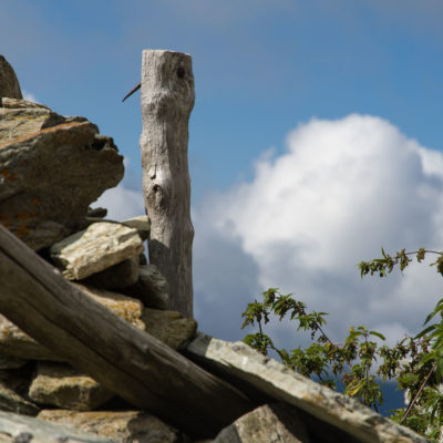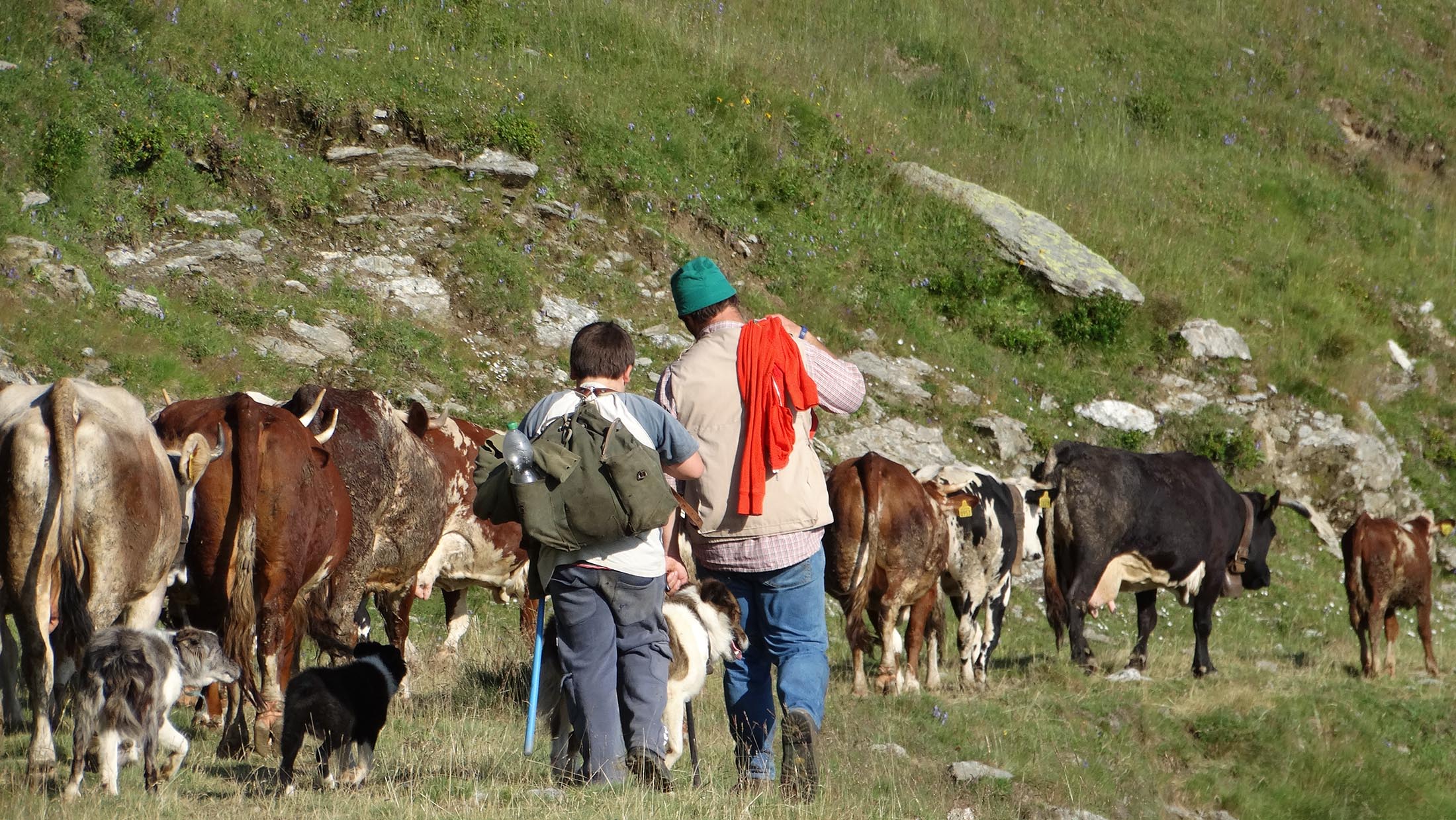 Der Pfad folgt weiterhin dem Gratverlauf, zunächst geht es einige Höhenmeter bergab, vorbei an einer einzelstehenden renovierten Hütte, nach einem kurzen Gegenanstieg kommt man zu den Gebäuden der Alpe Roc del Gal (1693 m, in manchen Karten auch als Alpe Rocca del Gallo bezeichnet). Direkt daneben ein riesiger, bizarr anmutender Felsklotz, der mitten in der endlosen Weite herumsteht. Bei den Hütten der Prati della Fontana (1701 m) mündet der Weg wieder in die parallel verlaufende Alpstrasse. Auf dieser wandert man nun gemütlichen Schrittes in einer knappen Stunde zur Alpe di Monastero (1971 m). Zwischen Juni und Mitte September ist man hier oben nicht alleine, die Alp wird noch bewirtschaftet, von den umliegenden Weiden ertönt die passende Begleitmusik. Giovanni Stabio, ein kantiger Mittsiebziger mit sonnengegerbtem faltigem Gesicht und markantem Schnauzer, schmeisst hier den Laden. Un vero montanaro, ein wahrer Mann der Berge, sympathisch, temperamentvoll, authentisch. Wenn Giovanni lospoltert und lacht, bekommt man eine Gänsehaut. Es ist immer wieder ein Erlebnis, seinen Erzählungen zu lauschen, der Mann scheint mit sich selbst im Reinen zu sein. Sommer für Sommer verbringt er gemeinsam mit seinem Sohn Domenico und seinen Tieren hier oben auf der Alp, bereits sein ganzes Leben. Im August ziehen Giovanni und Domenico mit den Kühen vorübergehend auf die höhengelegenen Weiden der Alpe Costapiana, bevor sie Anfang September wieder zur Alpe di Monastero zurückkehren. Den Rest des Jahres bewirtschaftet er mit seiner Familie seinen Hof, irgendwo weit draussen in der Po-Ebene.