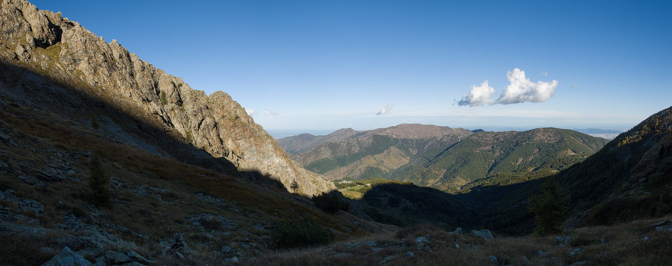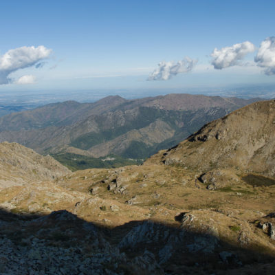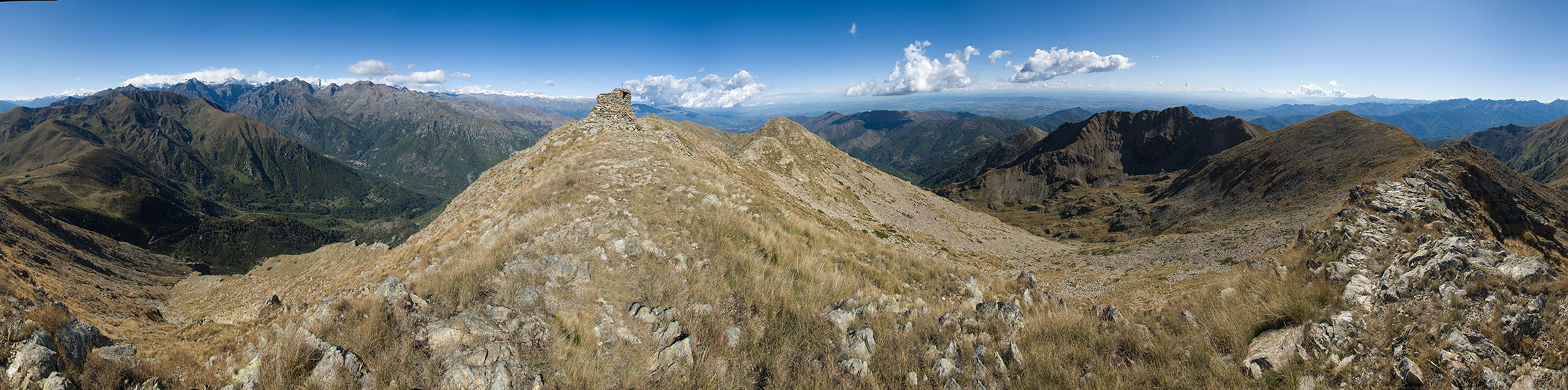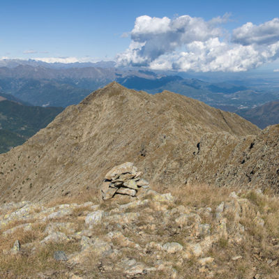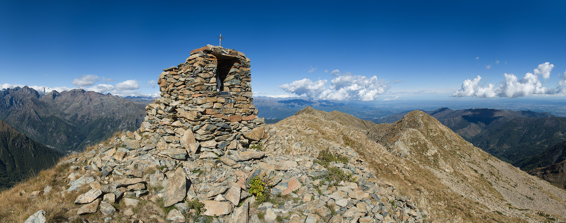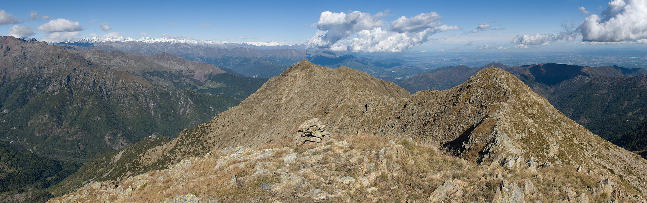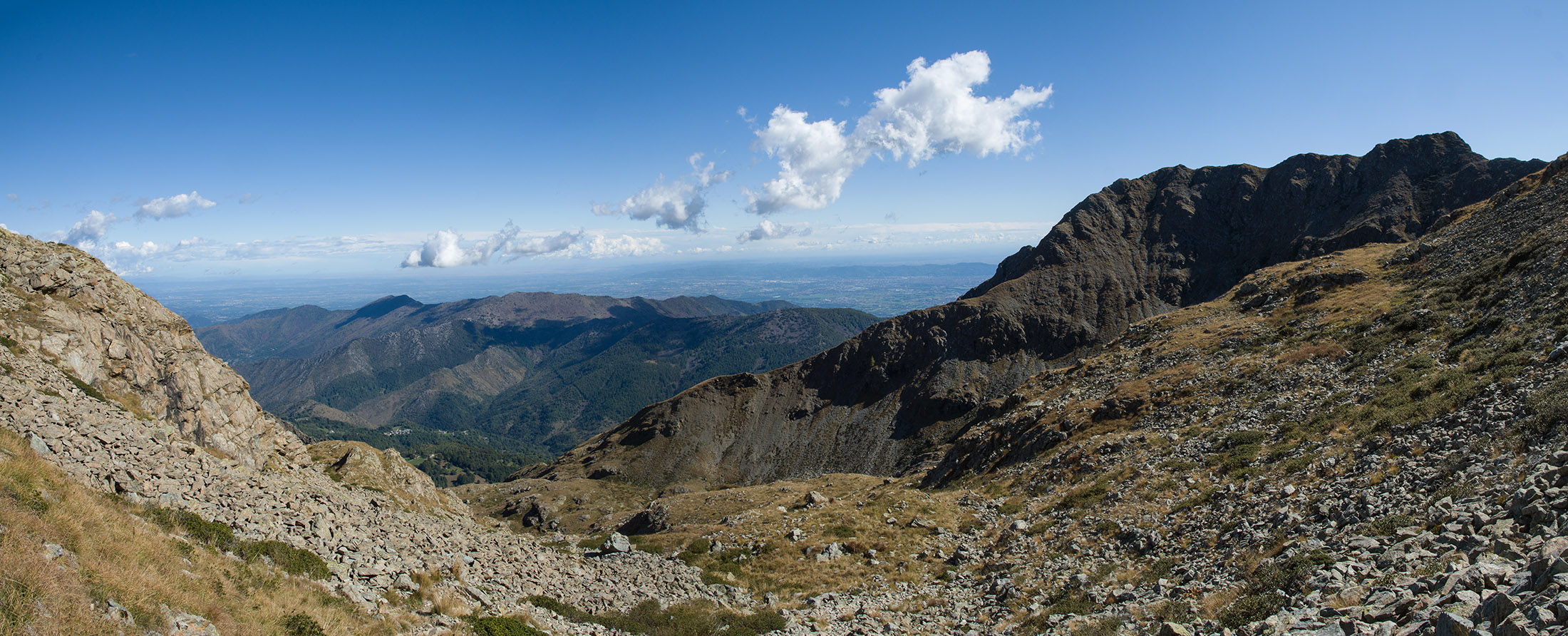 Jenseits des Dorfes verschwindet der Weg alsbald im Wald, durch verwildertes Kulturland geht es zunächst gemächlich bergauf. Bei den Ruinen der Muande Costassa (1295 m) erreicht man eine kleine Hochebene, vor einem liegt das menschenleere Vallone del Civrari, durch das der weitere Aufstiegsweg führt. Zunächst macht der Weg jedoch einen Schlenker Richtung Süden, zwischen verstreuten Birken wandert man durch Weideland hinauf zur Alpe Frestè (1431 m), die sich auf einer aussichtsreichen Alphochfläche befindet. Das Gebimmel der Kuhglocken begrüsst einen schon von weitem. Die bellenden Hütehunde erledigen prompt die „Anmeldung“ bei der hier in den Sommermonaten lebenden Familie. Eine wunderbare Begegnung mit freundlichen und aufgeschlossenen Menschen. Nach einer gemütlichen Rast lässt man die Zivilisation hinter sich, die Marschrichtung der nächsten Stunden lautet bergwärts. Der Weg windet sich durch zunächst lichten Birkenwald nach oben, das Ziel bereits vor Augen, der lange flache Gipfelgrat des Monte Civrari. Aber bis dahin ist noch gutes Stück des Weges. Jenseits der Baumgrenze wird der Weg steiler und steiniger, an einigen Stellen führt er über schräge Felsplatten, die bei Nässe rutschig sind. Nach etwa zwei Stunden erreicht man eine weite Hochfläche mit dem idyllischen Laghetto del Civrari (1956 m). Der Weg knickt Richtung Westen ab und schraubt sich in unzähligen Kehren durch viel Geröll in einer weiteren Stunde hinauf zur Punta Imperatoria, dem Westgipfel des Monte Civrari (2302 m). Von hier oben sieht man die Welt, wie bereits eingangs erwähnt. Im Norden der Gran Paradiso (4061 m), im Westen der Alpenhauptkamm vom Rocciamelone (3538 m) bis zur Bessanese (3604 m), im Nordosten zeigt sich das Monte Rosa-Massiv (4634 m). Im Osten erstreckt sich die piemontesische Tiefebene, mit etwas Glück sieht man die Millionenmetropole von Turin. Im Süden grüsst der Monviso (3841 m), bei klarem Wetter reicht der Blick bis in die Seealpen.