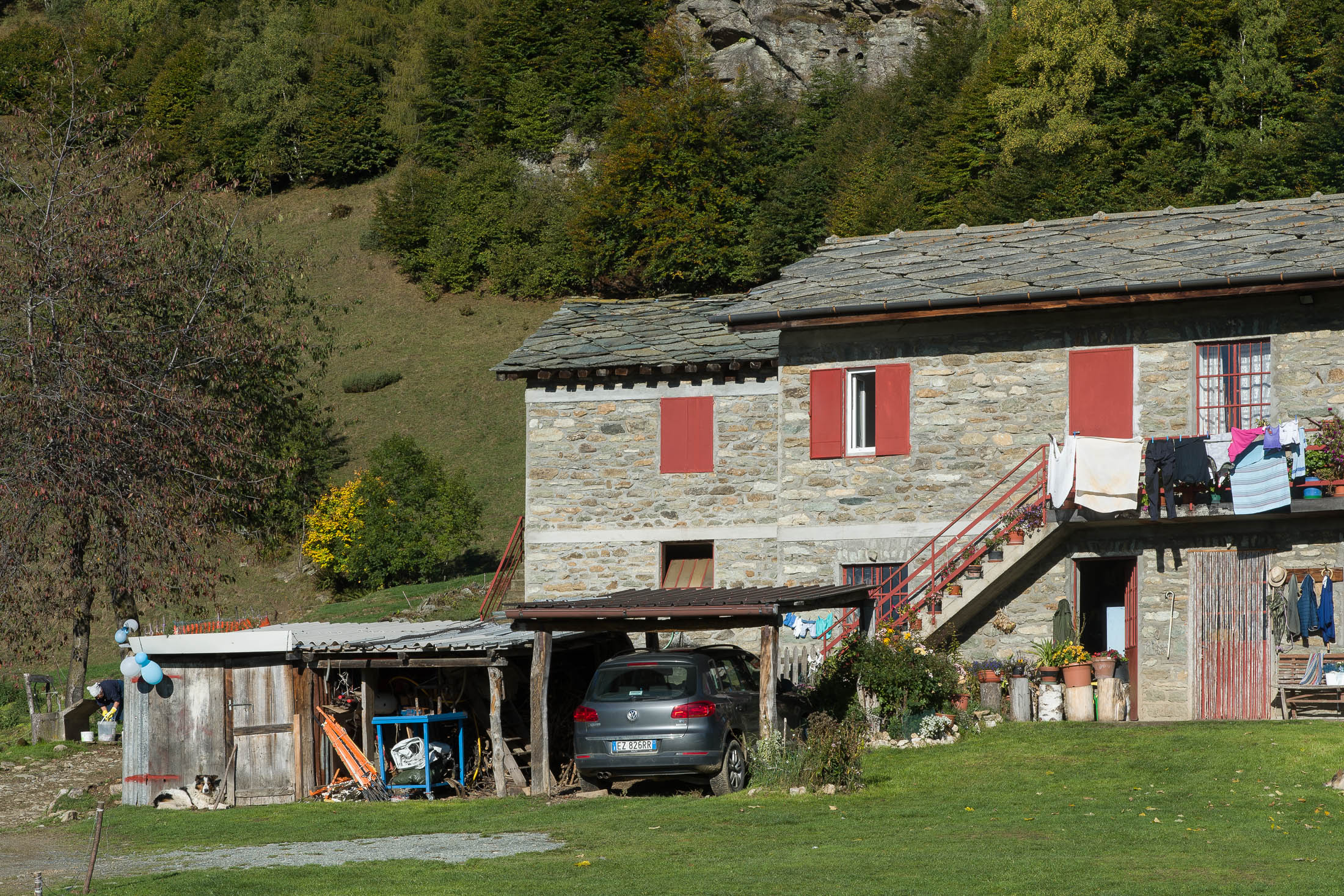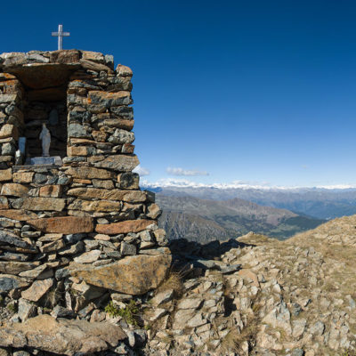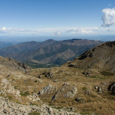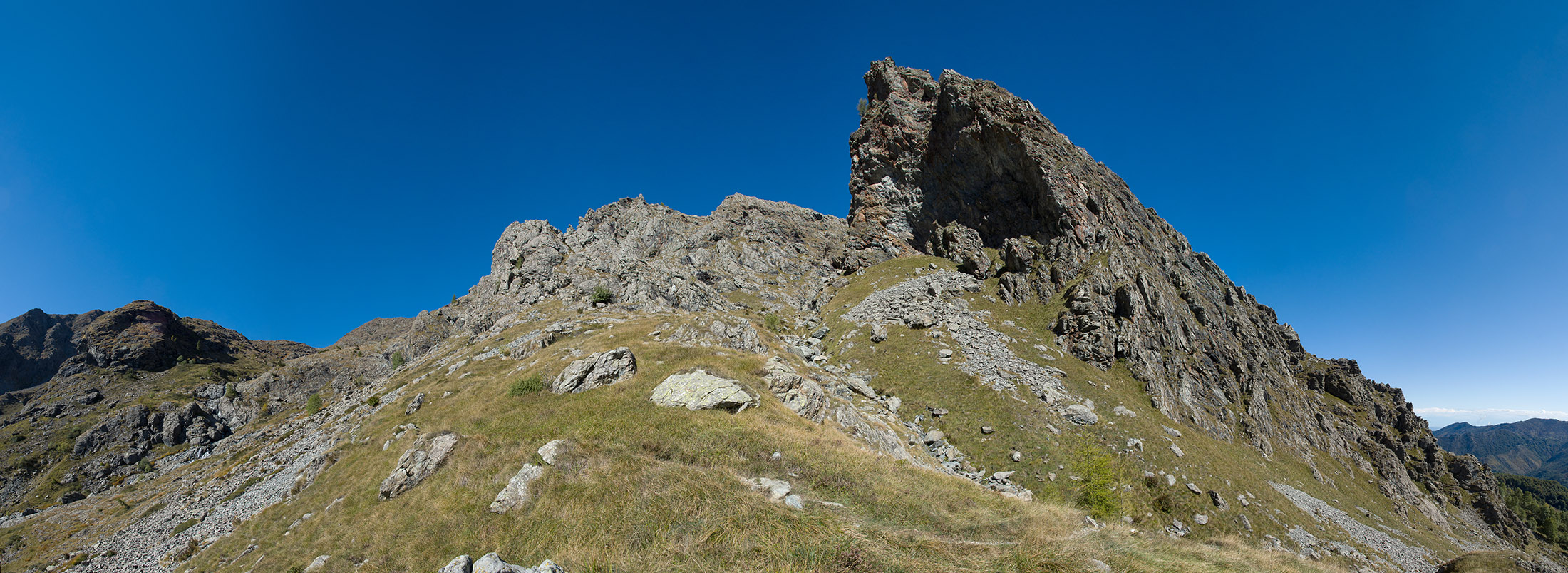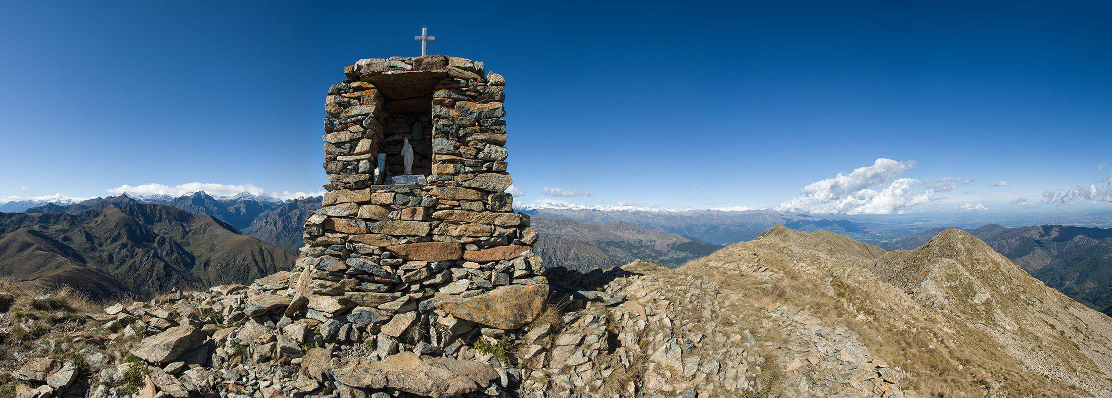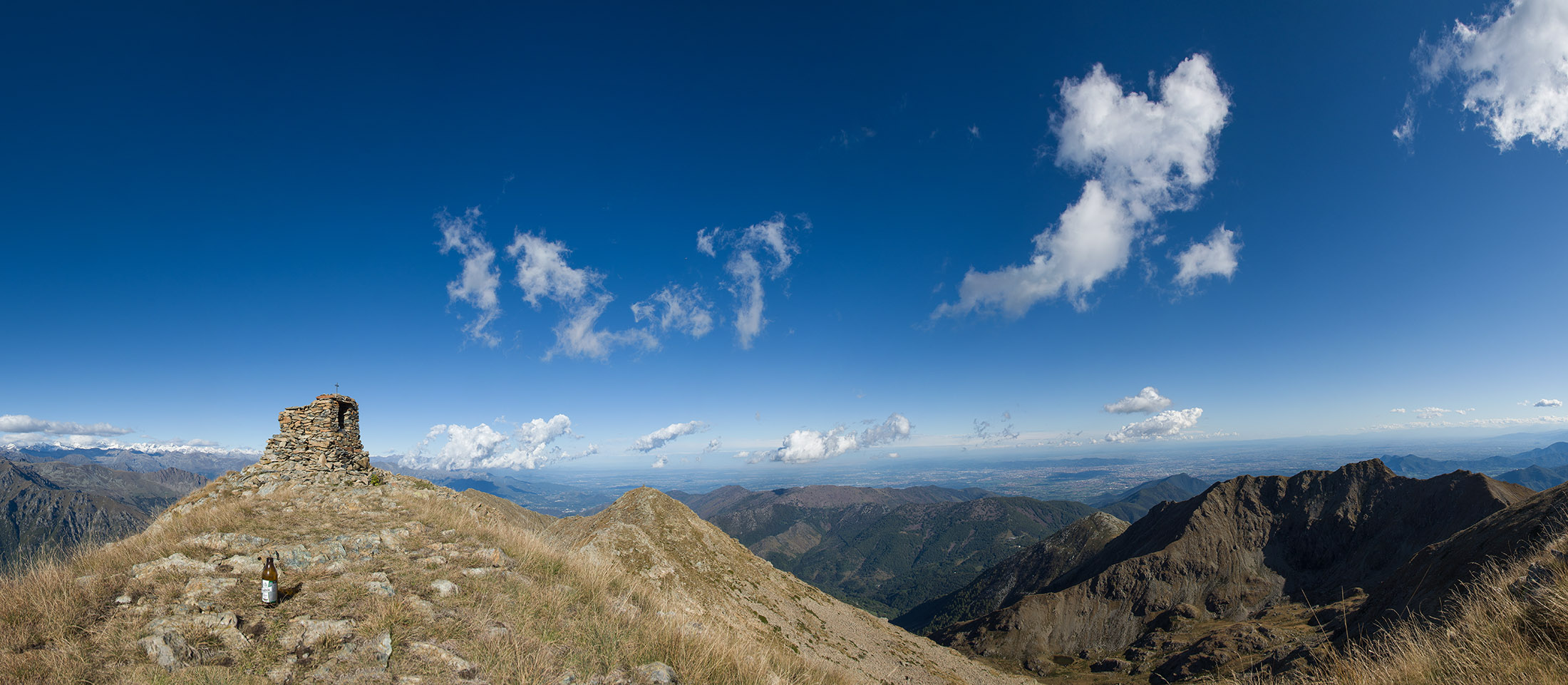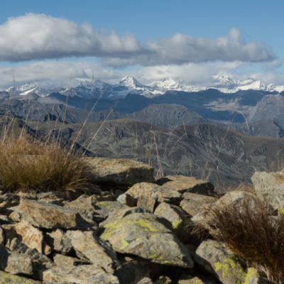 Jenseits des Dorfes verschwindet der Weg alsbald im Wald, durch verwildertes Kulturland geht es zunächst gemächlich bergauf. Bei den Ruinen der Muande Costassa (1295 m) erreicht man eine kleine Hochebene, vor einem liegt das menschenleere Vallone del Civrari, durch das der weitere Aufstiegsweg führt. Zunächst macht der Weg jedoch einen Schlenker Richtung Süden, zwischen verstreuten Birken wandert man durch Weideland hinauf zur Alpe Frestè (1431 m), die sich auf einer aussichtsreichen Alphochfläche befindet. Das Gebimmel der Kuhglocken begrüsst einen schon von weitem. Die bellenden Hütehunde erledigen prompt die „Anmeldung“ bei der hier in den Sommermonaten lebenden Familie. Eine wunderbare Begegnung mit freundlichen und aufgeschlossenen Menschen. Nach einer gemütlichen Rast lässt man die Zivilisation hinter sich, die Marschrichtung der nächsten Stunden lautet bergwärts. Der Weg windet sich durch zunächst lichten Birkenwald nach oben, das Ziel bereits vor Augen, der lange flache Gipfelgrat des Monte Civrari. Aber bis dahin ist noch gutes Stück des Weges. Jenseits der Baumgrenze wird der Weg steiler und steiniger, an einigen Stellen führt er über schräge Felsplatten, die bei Nässe rutschig sind. Nach etwa zwei Stunden erreicht man eine weite Hochfläche mit dem idyllischen Laghetto del Civrari (1956 m). Der Weg knickt Richtung Westen ab und schraubt sich in unzähligen Kehren durch viel Geröll in einer weiteren Stunde hinauf zur Punta Imperatoria, dem Westgipfel des Monte Civrari (2302 m). Von hier oben sieht man die Welt, wie bereits eingangs erwähnt. Im Norden der Gran Paradiso (4061 m), im Westen der Alpenhauptkamm vom Rocciamelone (3538 m) bis zur Bessanese (3604 m), im Nordosten zeigt sich das Monte Rosa-Massiv (4634 m). Im Osten erstreckt sich die piemontesische Tiefebene, mit etwas Glück sieht man die Millionenmetropole von Turin. Im Süden grüsst der Monviso (3841 m), bei klarem Wetter reicht der Blick bis in die Seealpen.
