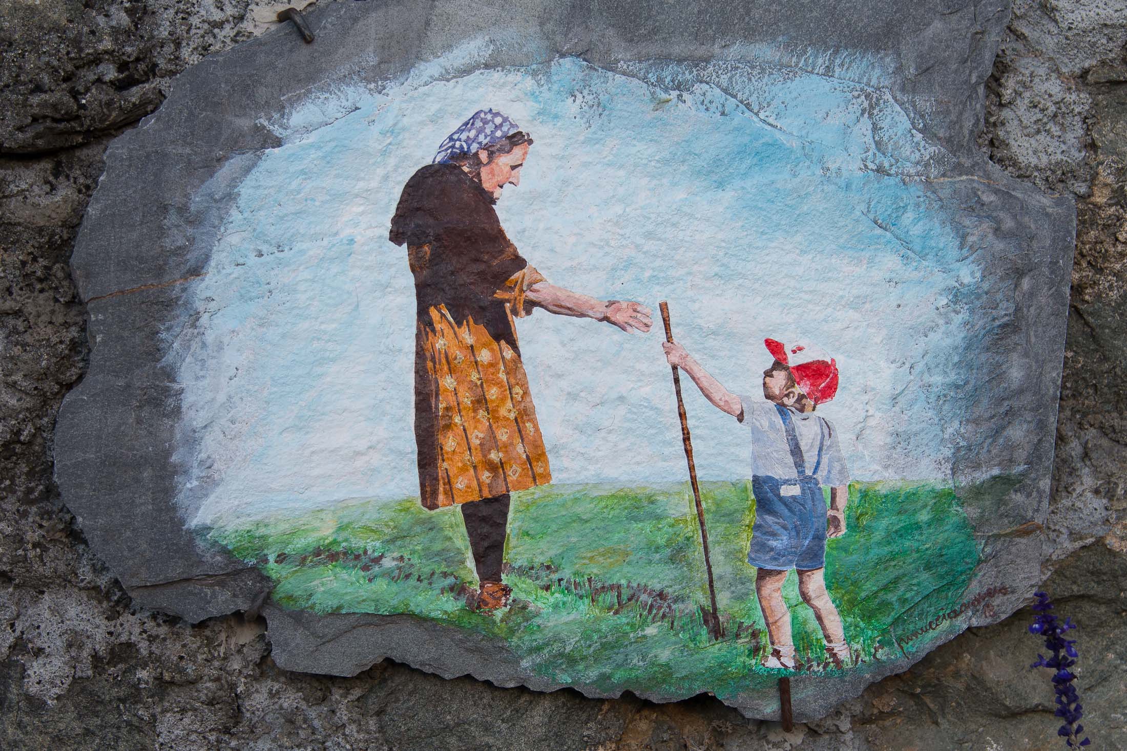 Die Wanderung beginnt in Niquidetto (1185 m), ein abgelegenes Dorf mit nur wenigen Einwohnern unweit des Colle del Lys. Bevor man sich auf den langen Weg macht, sollte man sich einen Moment Zeit nehmen und ein wenig durch die Gassen des kleinen Dorfes schlendern. Niquidetto bezeichnet man als das Dorf der bemalten Dachplatten (il borgo delle lose dipinte), 22 kleine Kunstwerke an den Wänden der Häuser, eines schöner als das andere, jedes der Motive ist einzigartig, wahrlich eine originelle und kreative Idee.