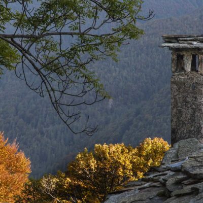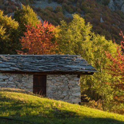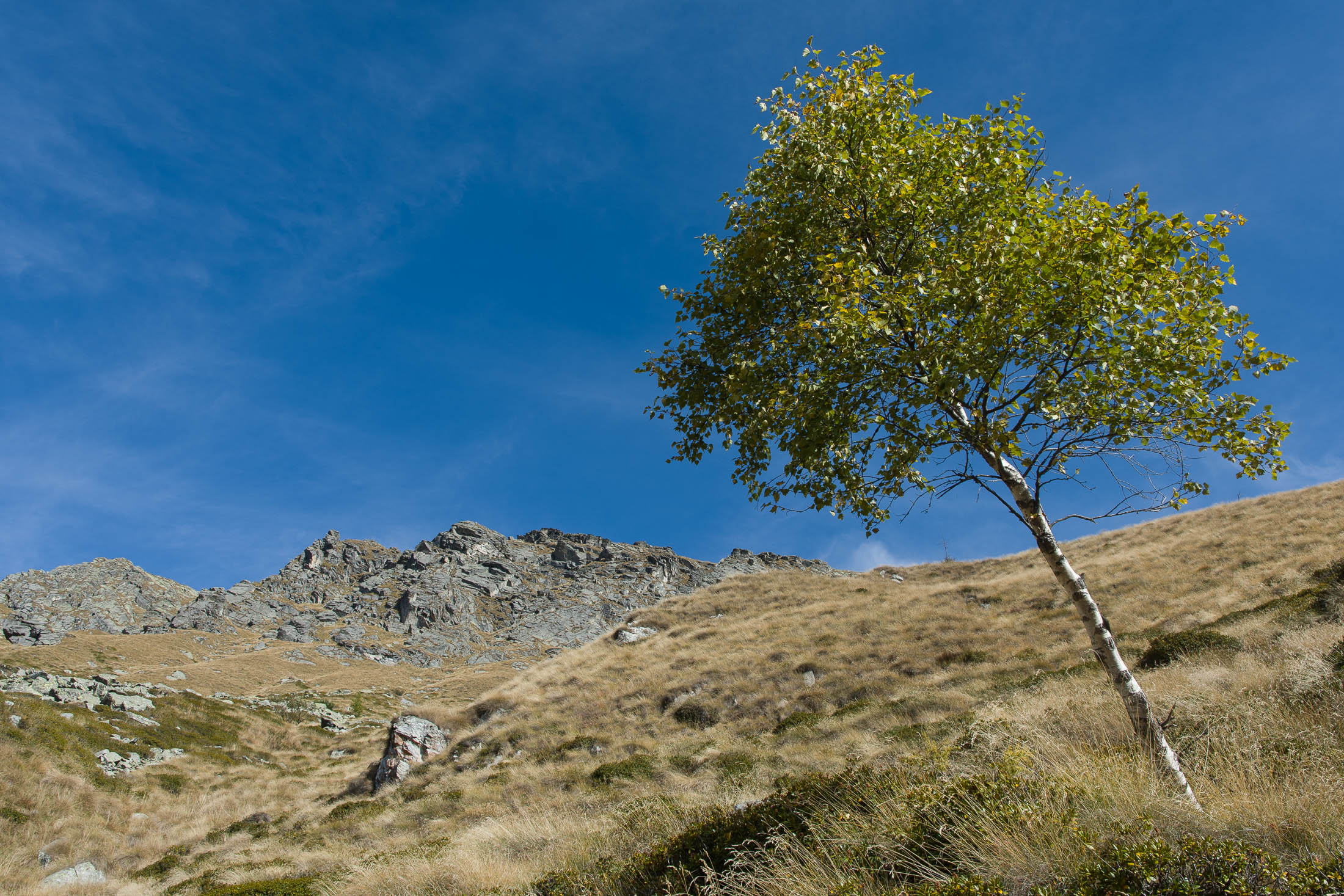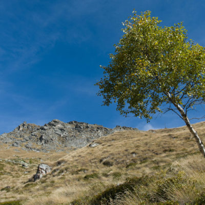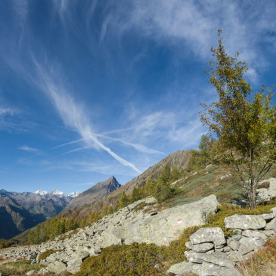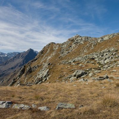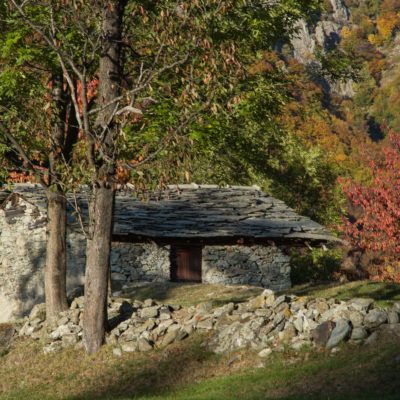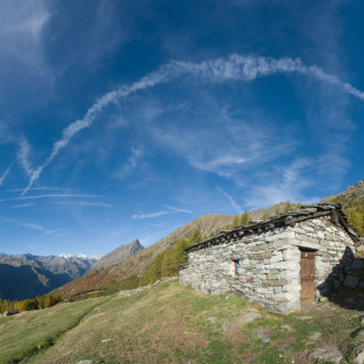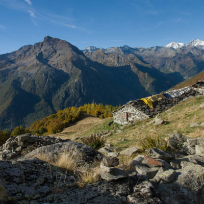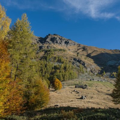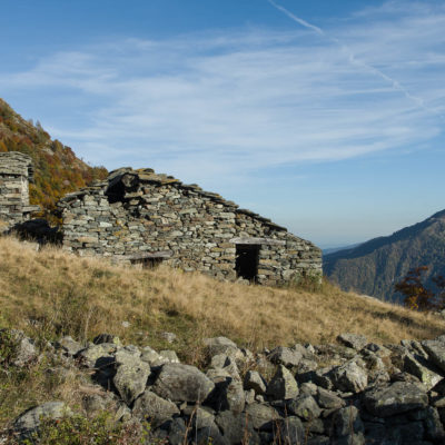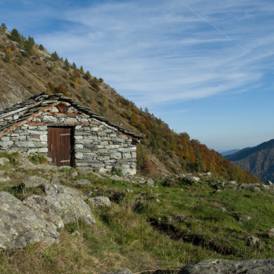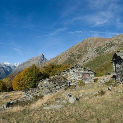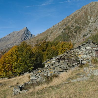 Vom Ortskern von Ala di Stura (1075 m) geht es zunächst etwa 500 m auf der Strasse talaufwärts bis zu einem restaurierten Bildstock, dort beginnt ein unmarkierter breiter Saumweg. Bereits nach wenigen Schritten liegt die Zivilisation hinter einem, Stille macht sich breit. Nach einer Viertelstunde kommt man zu einer sonnigen Lichtung mit den Häusern von Lombarda (1182 m). Man blickt auf jahrhundertealte Gemäuer, die bereits vor vielen Jahrzehnten aufgegeben und verlassen wurden, vor den Fenstern und Türen wuchern Brennnesseln und Unkraut. Lediglich der grosse und gepflegte Hof, der sich etwas unterhalb der Gebäudegruppe befindet, scheint noch dauerhaft bewohnt zu sein, zumindest verrät ein beharrlich kläffender Hund, dass dort jemand zu Hause ist. Hinter den Häusern mündet der Weg in ein unbefestigtes Alpsträsschen, der man in der nächsten Viertelstunde folgt. Bei einem Wegweiser zweigt ein wunderschöner, teils gepflasterter alter Saumweg (ital. = Mulattiera) ab, der entlang von Trockensteinmauern in Kürze hinauf nach Chiottero führt. Chiottero, im lokalen Dialekt auch Ciautè genannt, ist eine ehemalige Temporärsiedlung, das Kirchlein und ein kleines Anwesen sind noch gut erhalten, die anderen Gebäude wurden jedoch aufgegeben oder liegen bereits in Trümmern.