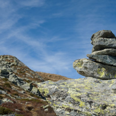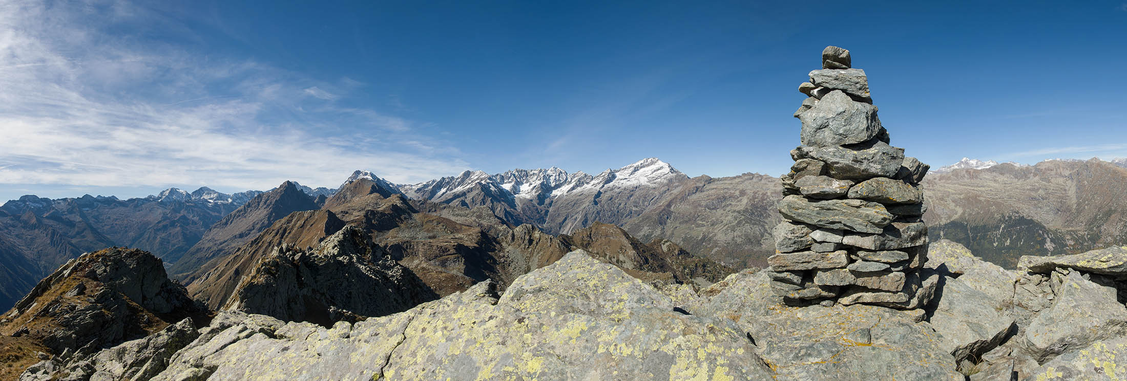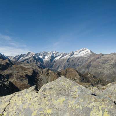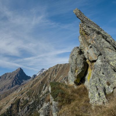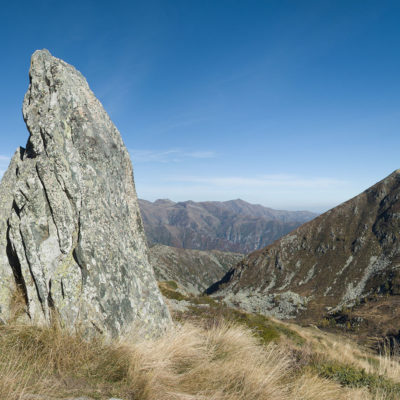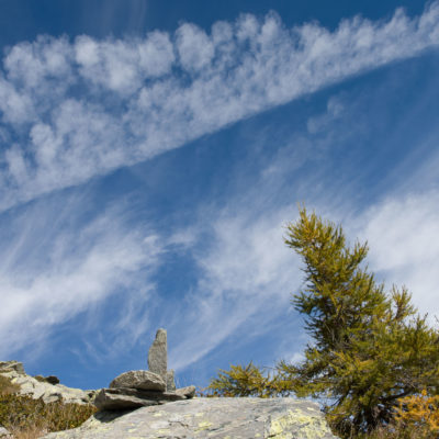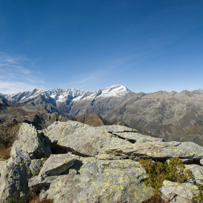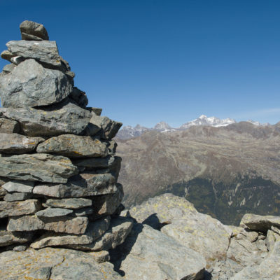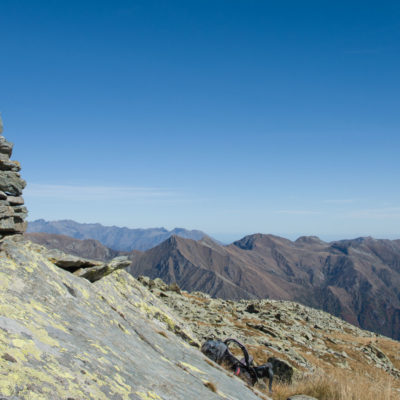 Der weitere Aufstieg verläuft entlang der Südflanke des Monte Doubia durch teils verbuschendes Weideland, am Wegesrand verstreute Birken, Alpenrosen und Heidelbeeren. Hier und da windet sich die Pfad durch hohes Gras, bei warmem Sommerwetter ziemlich schweisstreibend. Nach einer guten Stunde und weiteren 360 Höhenmetern erreicht man den Colle d‘Attia (2104 m). Am Pass verlässt man bei einem auffälligen freistehenden Felsbrocken den markierten Weg. Der Schlussanstieg durch die grasige Südostflanke des Monte Doubia ist steil und abschnittsweise mühsam, Steinmännchen weisen den richtigen Weg. Zwischendurch müssen eine paar kleinere Blockfelder überquert werden, ab und zu benötigt man die Hände zur Hilfe, hier ist Trittsicherheit erforderlich. Weiter oben erwartet einen ein aprupter Landschaftswechsel, vor einem das weite und sanft gewellte Gipfelplateau des Monte Doubia. Die restlichen Meter bis zum eigentlichen Gipfel sind eindeutig und bei normalen Sichtverhältnissen leicht zu finden. Als Orientierungshilfe dient der riesige Steinmann auf dem nördlich einer von Steinen und Felsbrocken übersäten Hochfläche befindlichen langen Grat, den man in einer weiteren Viertelstunde ohne weitere Schwierigkeiten erreicht. 2463 m Seehöhe. Ein Ort zwischen Himmel und Erde, wohltuende Stille, die Gedanken sind frei. Das Panorama auf die Gipfelkulisse der Valli di Lanzo ist umfassend und eindrücklich. Im Westen der Alpenhauptkamm, auf dem die Grenze zwischen Italien und Frankreich verläuft, im Norden erhebt sich die Gran-Paradiso-Gruppe (4061 m). Im Süden zeigt sich der Monviso (3841 m), der höchste Berg der Südalpen. Bei klarem Wetter blickt man bis in die Po-Ebene und in die Seealpen.