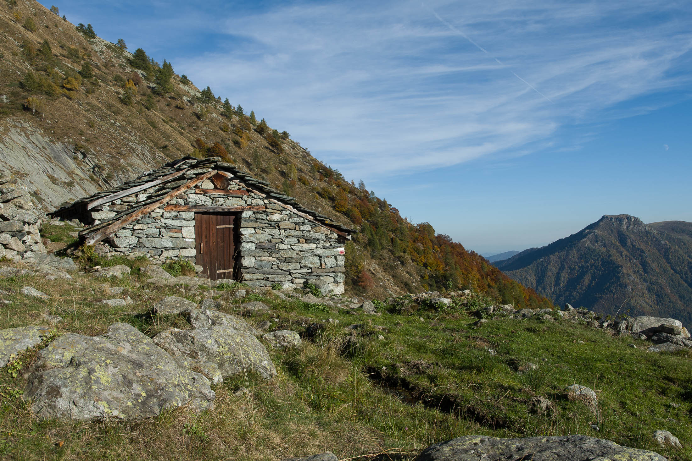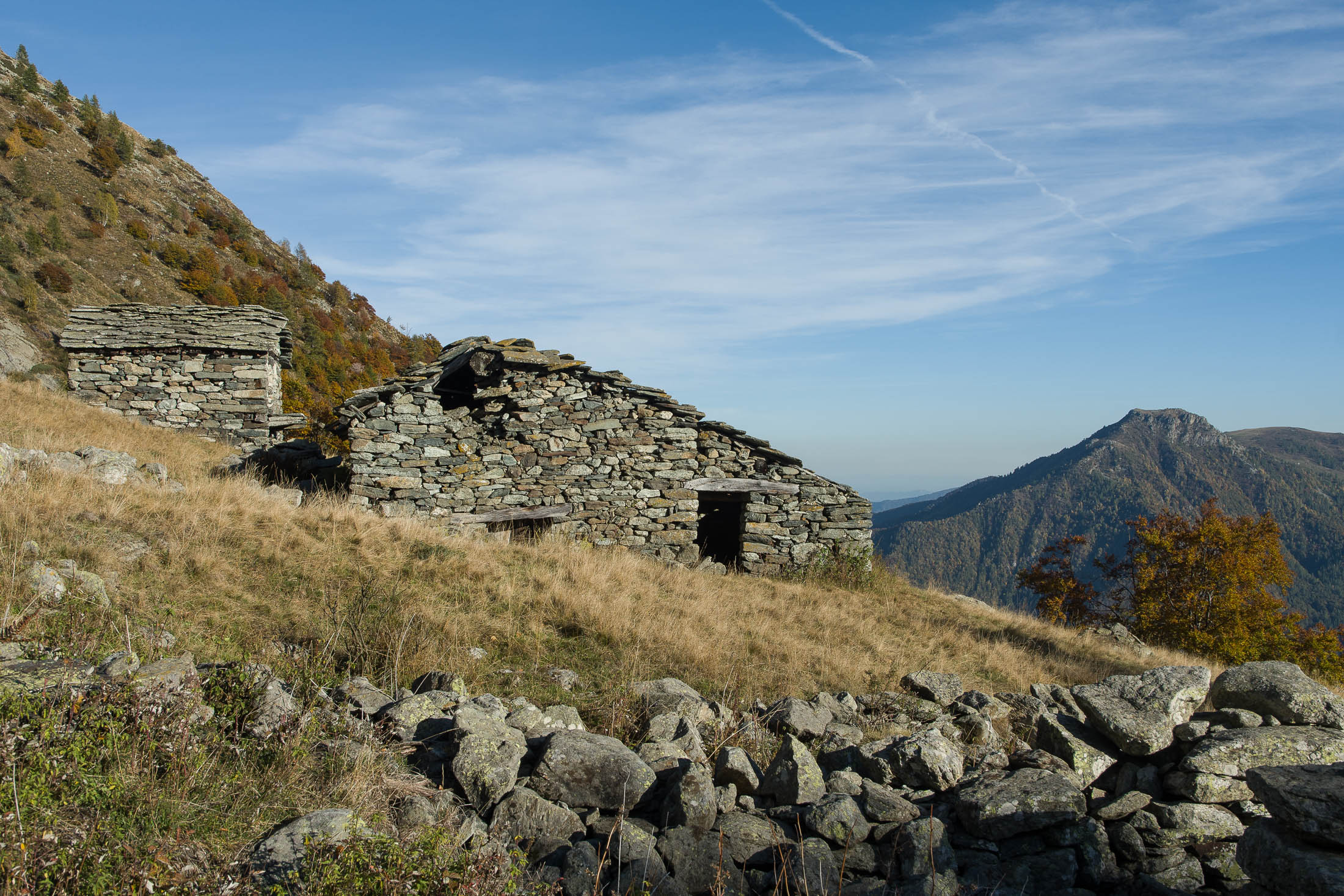 Weiter geht es mit dem Aufstieg, bis zum Gipfelziel wartet noch ein gutes Stück des Weges. Am oberen Rand der Weiden von Chiottero verschwindet die Mulattiera wieder für eine Weile im Buchenwald. Eine halbe Stunde später kommt man zu der grossen Lichtung auf dem Pian d‘Attia (1382 m), eine weitere Temporärsiedlung mit einigen Alpgebäuden am Rande einer kleinen Hochfläche. Einige der uralten Häuser, Hütten und Ställe werden noch instandgehalten und als Wochenendhäuschen genutzt, andere wiederum sind dem Verfall preisgegeben. Oberhalb der kleinen Siedlung befindet sich eine unbeschilderte Weggabelung, wo man geradeaus (Richtung Norden) weitergeht, der Abzweig nach links zum Pianfè bleibt unbeachtet. Der Weg wird steiler, in der nächsten Stunde wandert man durch schattigen Buchenwald. Auf etwa 1680 m ist die Waldgrenze erreicht, vor einem eine riesige Weide mit den Hütten der Alpe d‘Attia (1740 m). Ein malerisches Fleckchen, genau der richtige Ort für eine aussichtsreiche Rast. Der Brunnen plätschert gemächlich vor sich hin, aus der Ferne vernimmt man Kuhgebimmel und bellende Hütehunde, von Juli bis Mitte September ist man hier oben nicht alleine. Die obere der beiden Gebäudegruppen ist noch intakt und wird heute noch in den Sommermonaten von einer sympathischen Familie aus dem Tal bewirtschaftet.