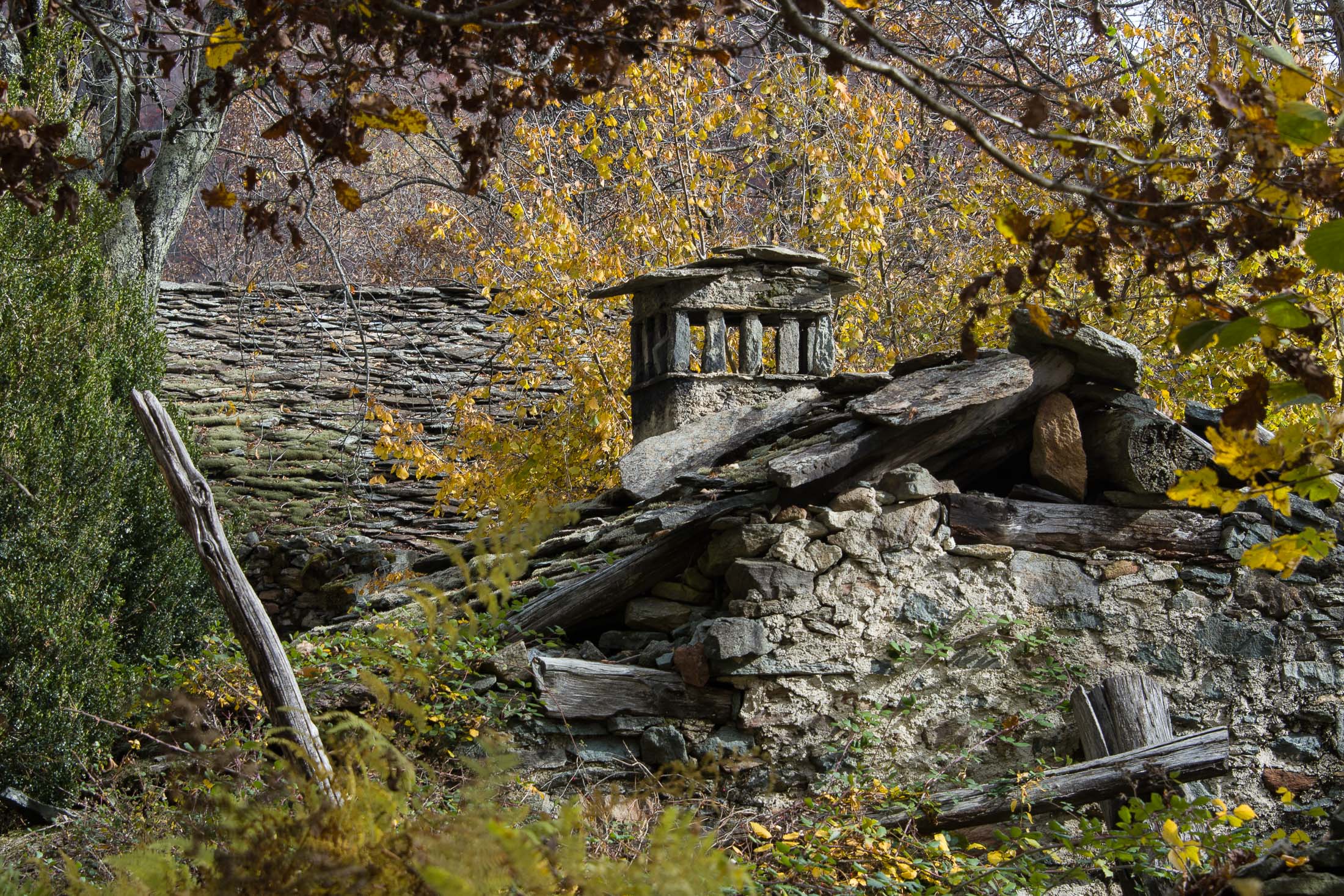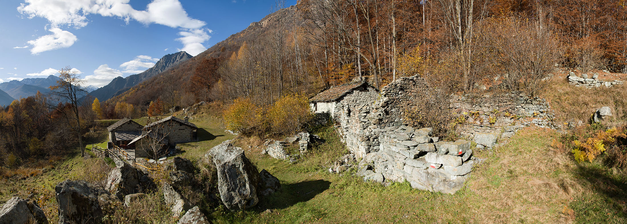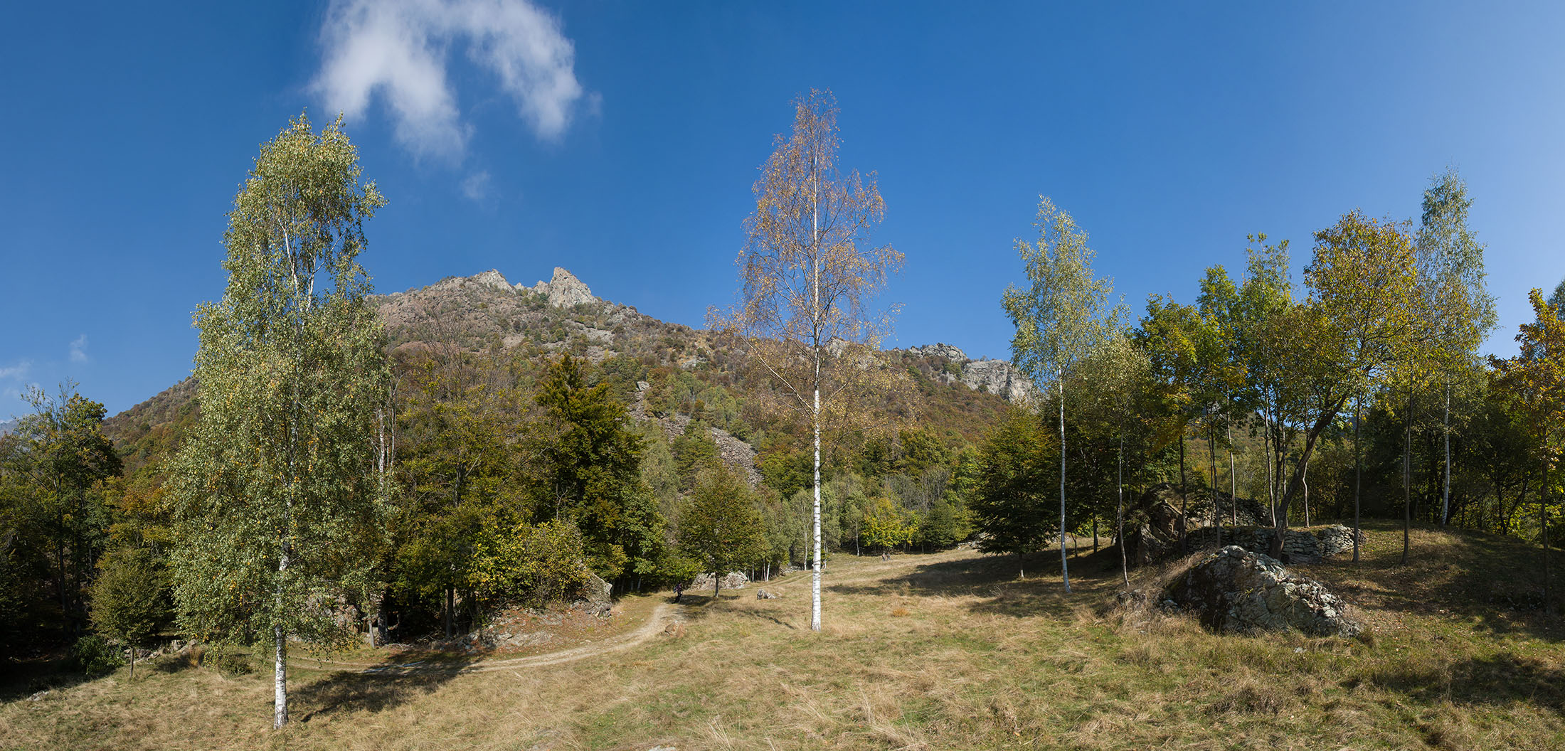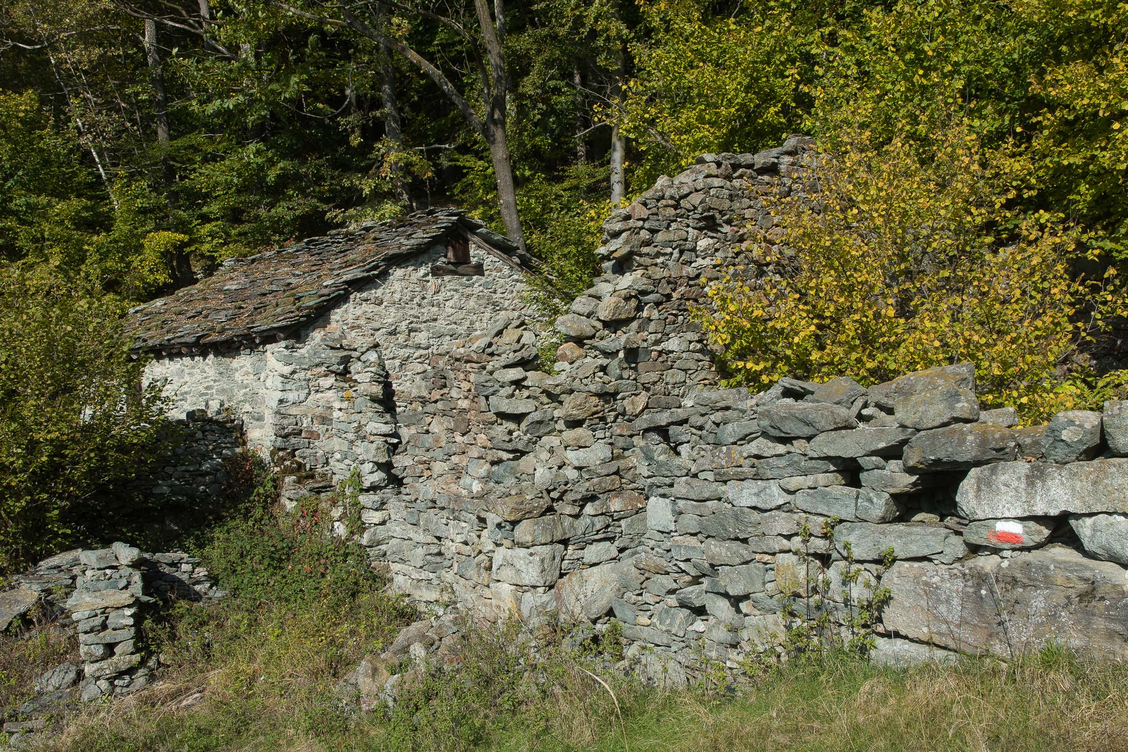 Die erste Stunde kann man gemütlich vor sich hintraben, auf einem unbefestigten Forstweg geht es zunächst durch einen Kastanienhain hinauf nach Monterosso (1090 m), ein verlassener kleiner Weiler. Eine handvoll Häuser und Ställe, die meisten davon liegen heute in Ruinen. Man blickt auf bröckelndes Gemäuer und morsche Dachbalken, dazwischen wuchern meterhoch die Brennnesseln und noch viel mehr Gestrüpp. Die Zeit ist hier stehengeblieben, nur eine kleine Madonnina und die stählernen Kreuze eines Kunsthandwerkers halten beharrlich die Stellung. Wenig später erreicht man eine grössere Lichtung, der unbefestigte Fahrweg endet bei den Hütten von Case Belfe (1146 m), eine früher in den Sommermonaten bewohnte Alpsiedlung, mit schöner Aussicht auf die Berge des Val d‘Ala. Einige der historischen Gebäude wurden vor einigen Jahren wieder aufgebaut und hübsch renoviert, sie werden heute von den Einheimischen als Wochenendhäuschen genutzt. Die traditionelle Alpwirtschaft wurde hier schon vor vielen Jahrzehnten eingestellt, die nicht mehr genutzten Weideflächen in der Umgebung verbuschen im Laufe der Zeit und werden allmählich vom Wald zurückerobert.