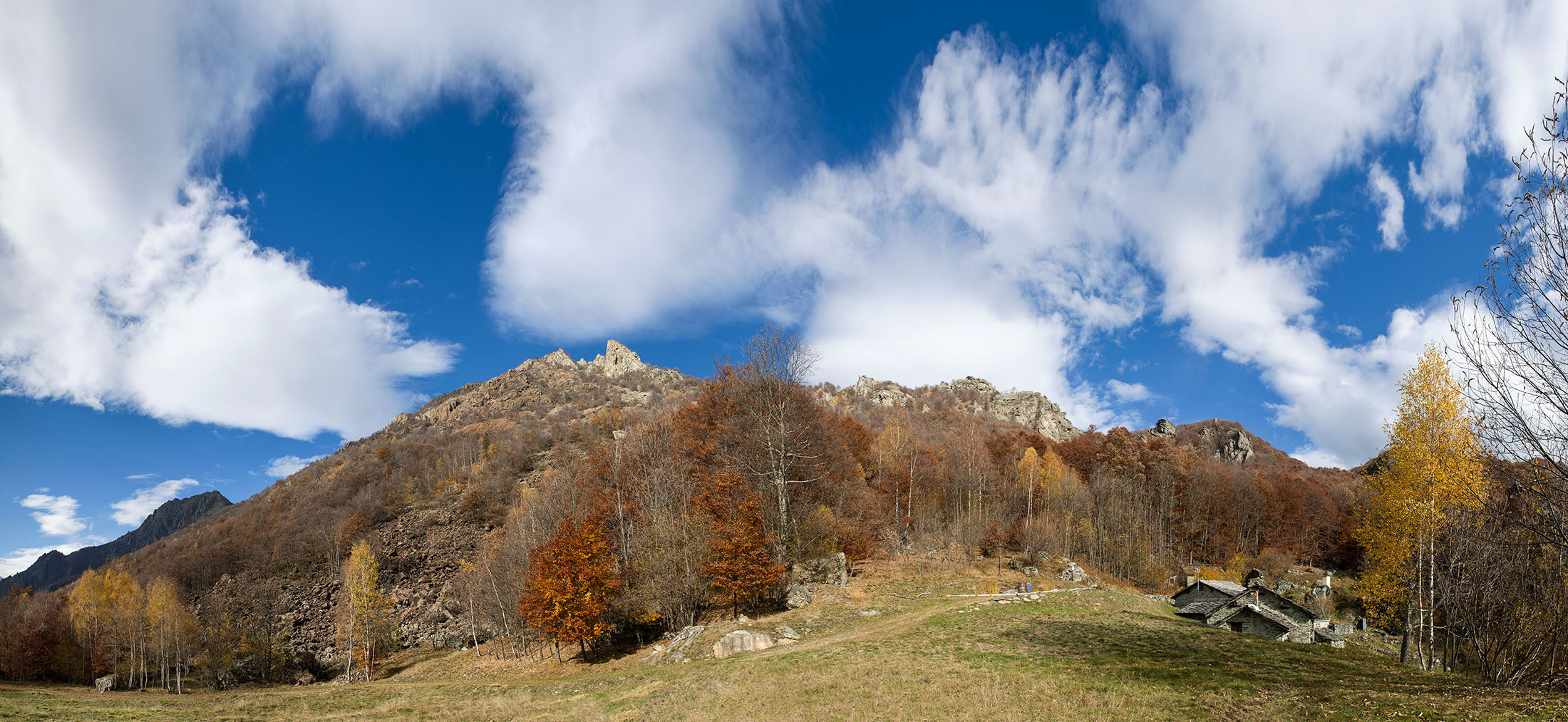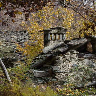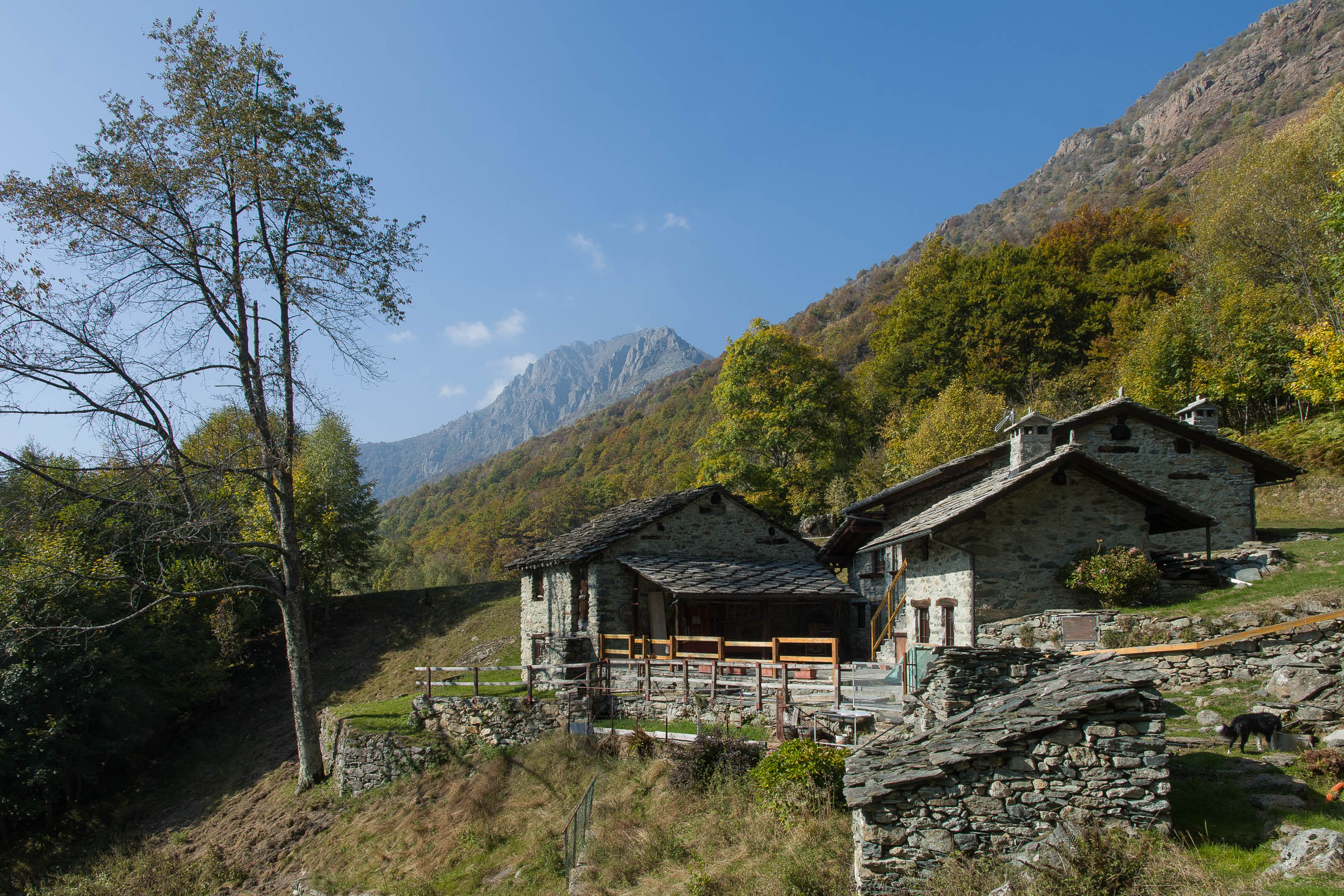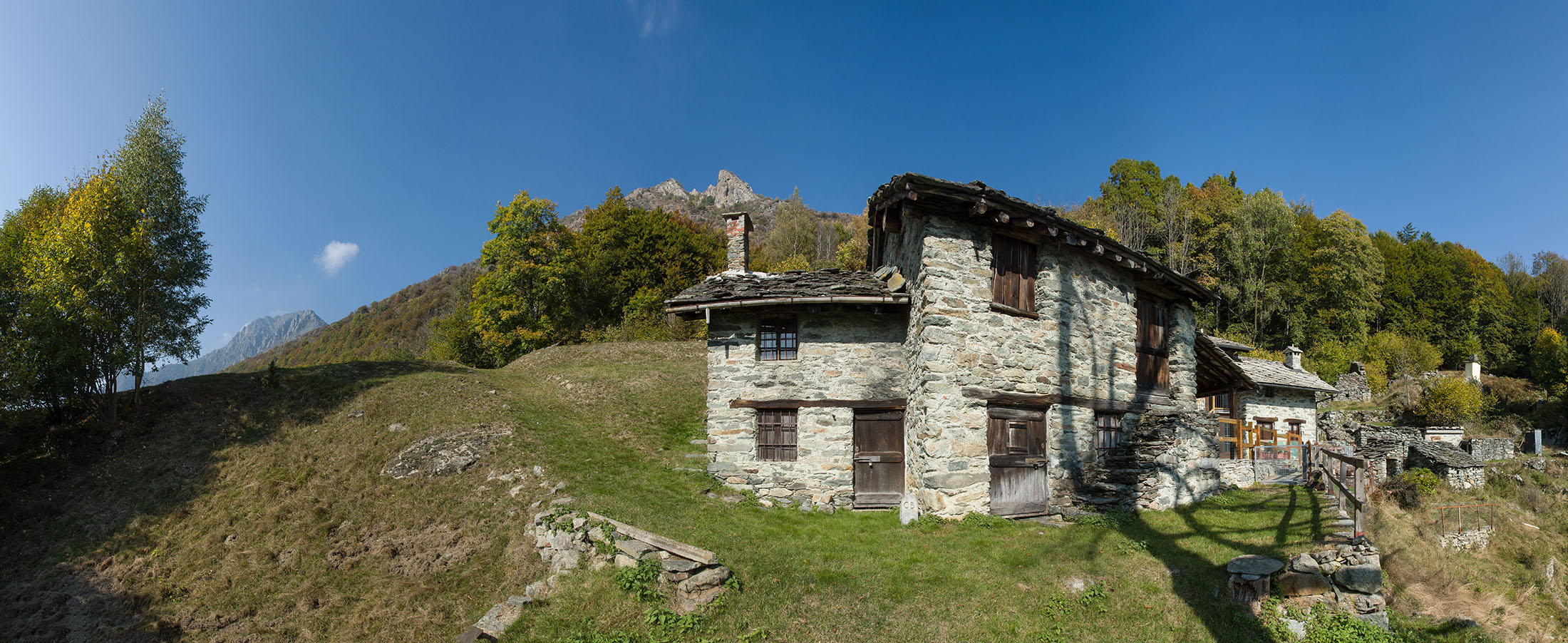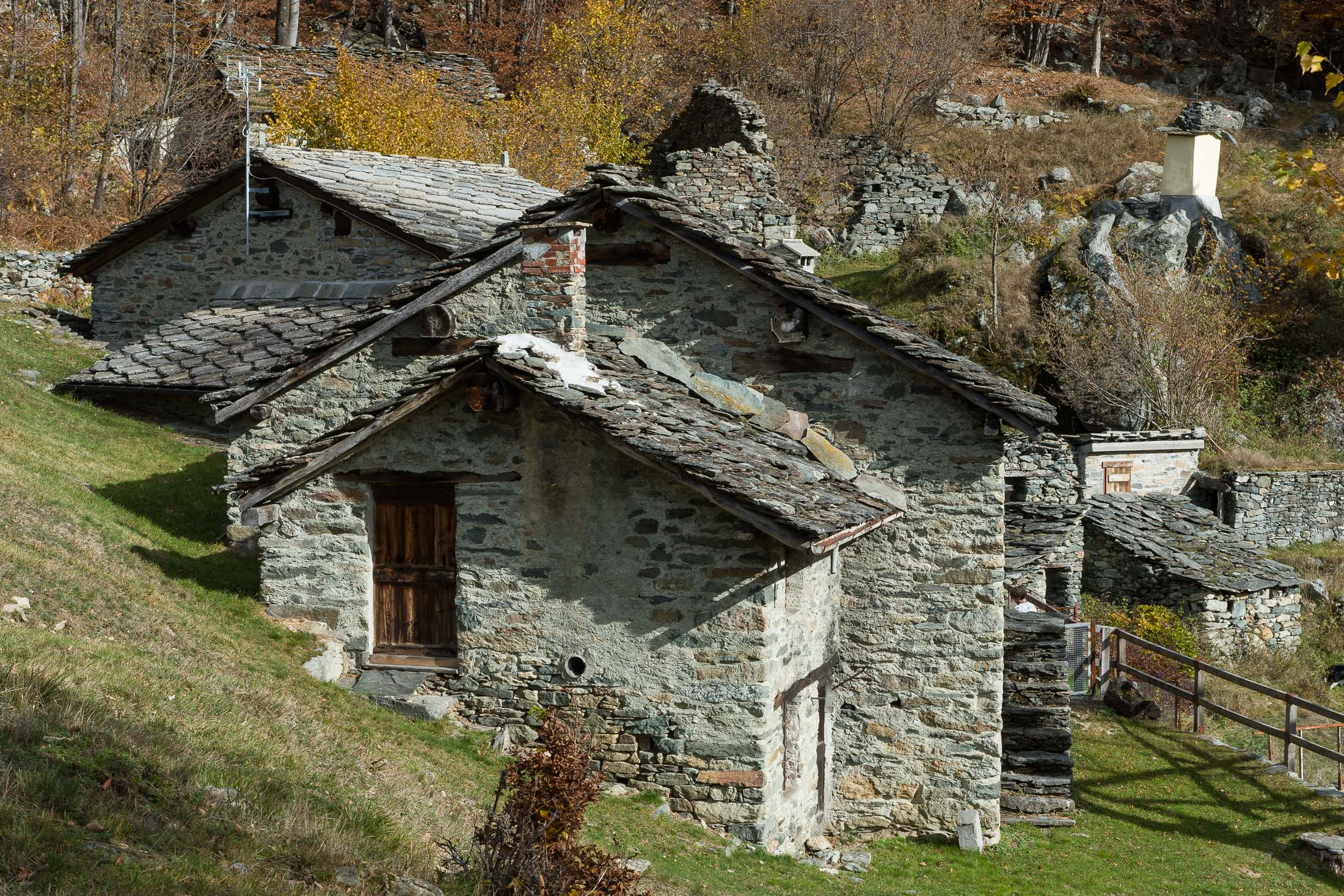 Die erste Stunde kann man gemütlich vor sich hintraben, auf einem unbefestigten Forstweg geht es zunächst durch einen Kastanienhain hinauf nach Monterosso (1090 m), ein verlassener kleiner Weiler. Eine handvoll Häuser und Ställe, die meisten davon liegen heute in Ruinen. Man blickt auf bröckelndes Gemäuer und morsche Dachbalken, dazwischen wuchern meterhoch die Brennnesseln und noch viel mehr Gestrüpp. Die Zeit ist hier stehengeblieben, nur eine kleine Madonnina und die stählernen Kreuze eines Kunsthandwerkers halten beharrlich die Stellung. Wenig später erreicht man eine grössere Lichtung, der unbefestigte Fahrweg endet bei den Hütten von Case Belfe (1146 m), eine früher in den Sommermonaten bewohnte Alpsiedlung, mit schöner Aussicht auf die Berge des Val d‘Ala. Einige der historischen Gebäude wurden vor einigen Jahren wieder aufgebaut und hübsch renoviert, sie werden heute von den Einheimischen als Wochenendhäuschen genutzt. Die traditionelle Alpwirtschaft wurde hier schon vor vielen Jahrzehnten eingestellt, die nicht mehr genutzten Weideflächen in der Umgebung verbuschen im Laufe der Zeit und werden allmählich vom Wald zurückerobert.