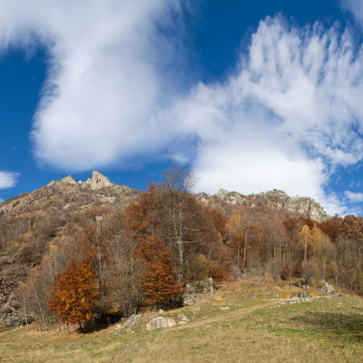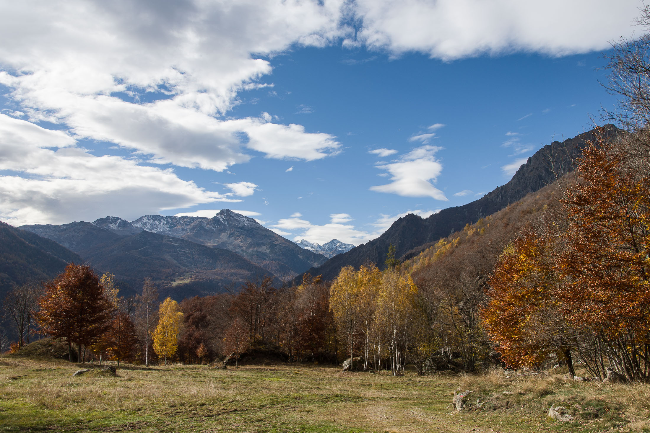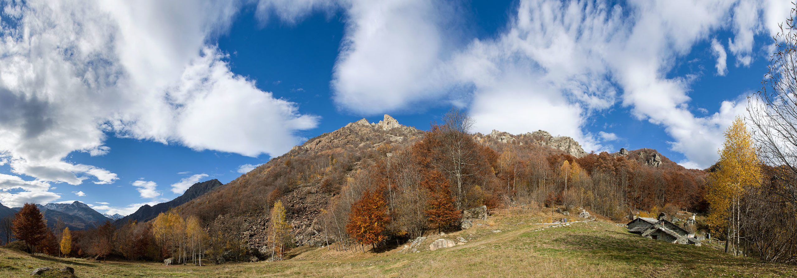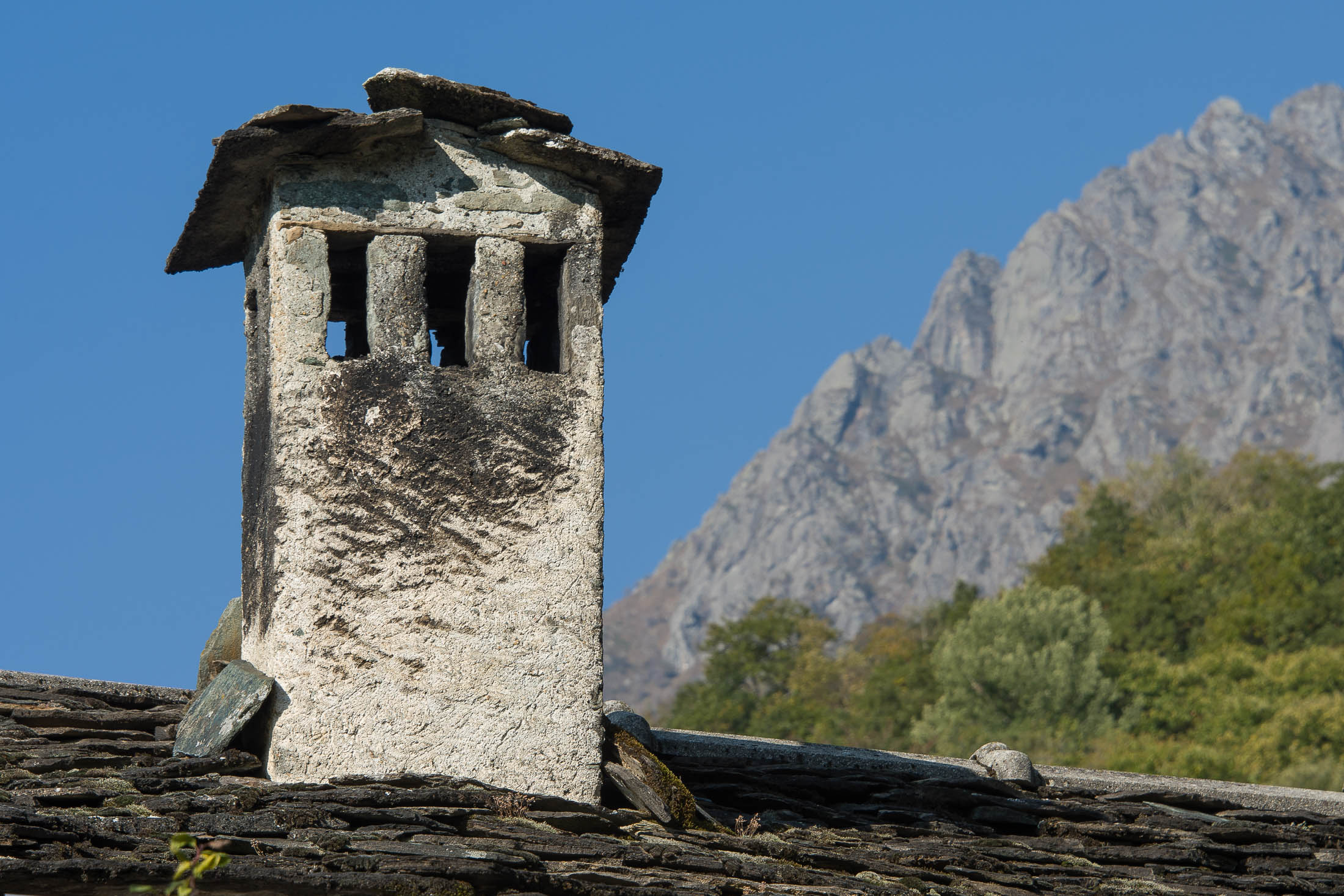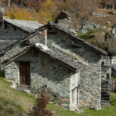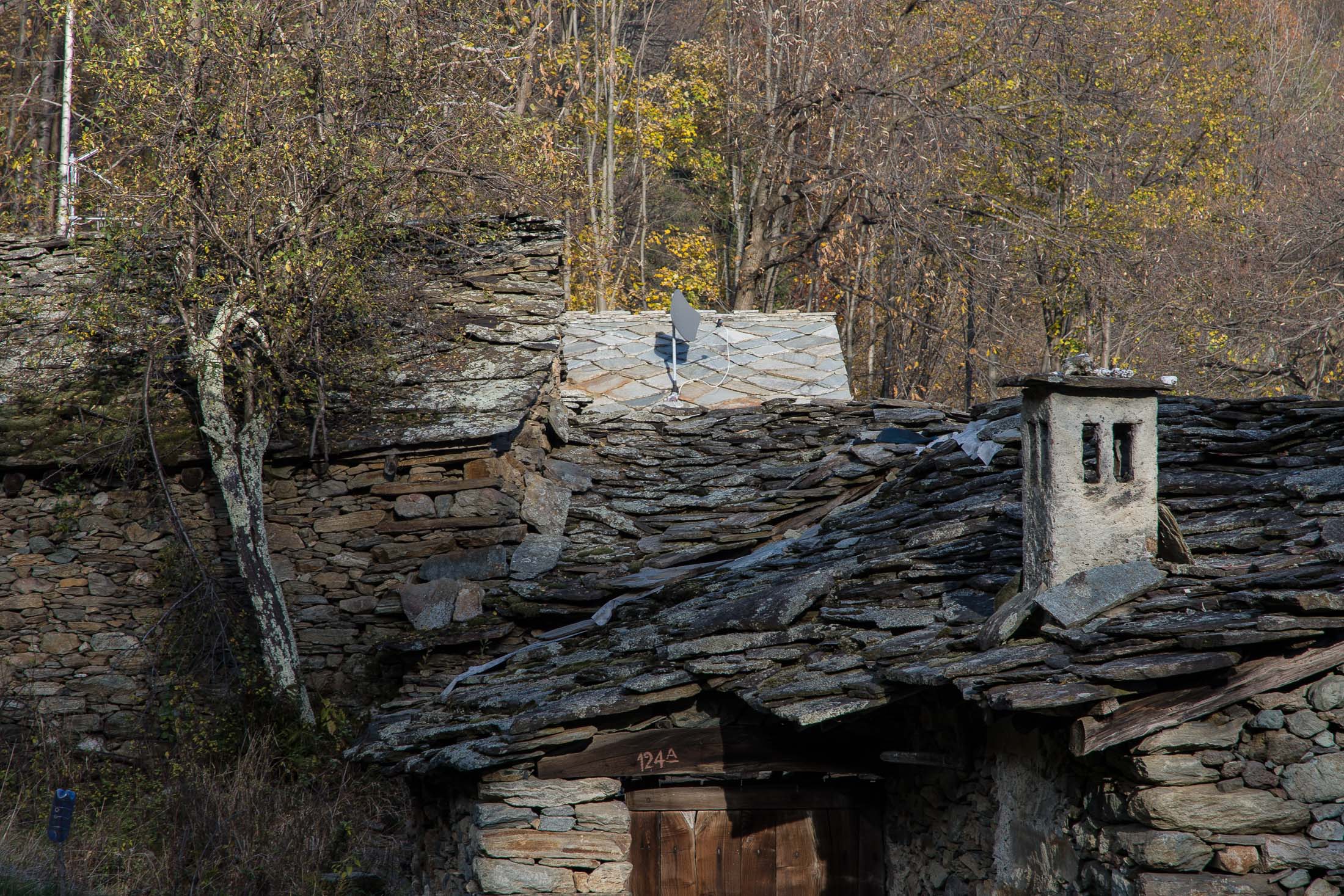 Die erste Stunde kann man gemütlich vor sich hintraben, auf einem unbefestigten Forstweg geht es zunächst durch einen Kastanienhain hinauf nach Monterosso (1090 m), ein verlassener kleiner Weiler. Eine handvoll Häuser und Ställe, die meisten davon liegen heute in Ruinen. Man blickt auf bröckelndes Gemäuer und morsche Dachbalken, dazwischen wuchern meterhoch die Brennnesseln und noch viel mehr Gestrüpp. Die Zeit ist hier stehengeblieben, nur eine kleine Madonnina und die stählernen Kreuze eines Kunsthandwerkers halten beharrlich die Stellung. Wenig später erreicht man eine grössere Lichtung, der unbefestigte Fahrweg endet bei den Hütten von Case Belfe (1146 m), eine früher in den Sommermonaten bewohnte Alpsiedlung, mit schöner Aussicht auf die Berge des Val d‘Ala. Einige der historischen Gebäude wurden vor einigen Jahren wieder aufgebaut und hübsch renoviert, sie werden heute von den Einheimischen als Wochenendhäuschen genutzt. Die traditionelle Alpwirtschaft wurde hier schon vor vielen Jahrzehnten eingestellt, die nicht mehr genutzten Weideflächen in der Umgebung verbuschen im Laufe der Zeit und werden allmählich vom Wald zurückerobert.