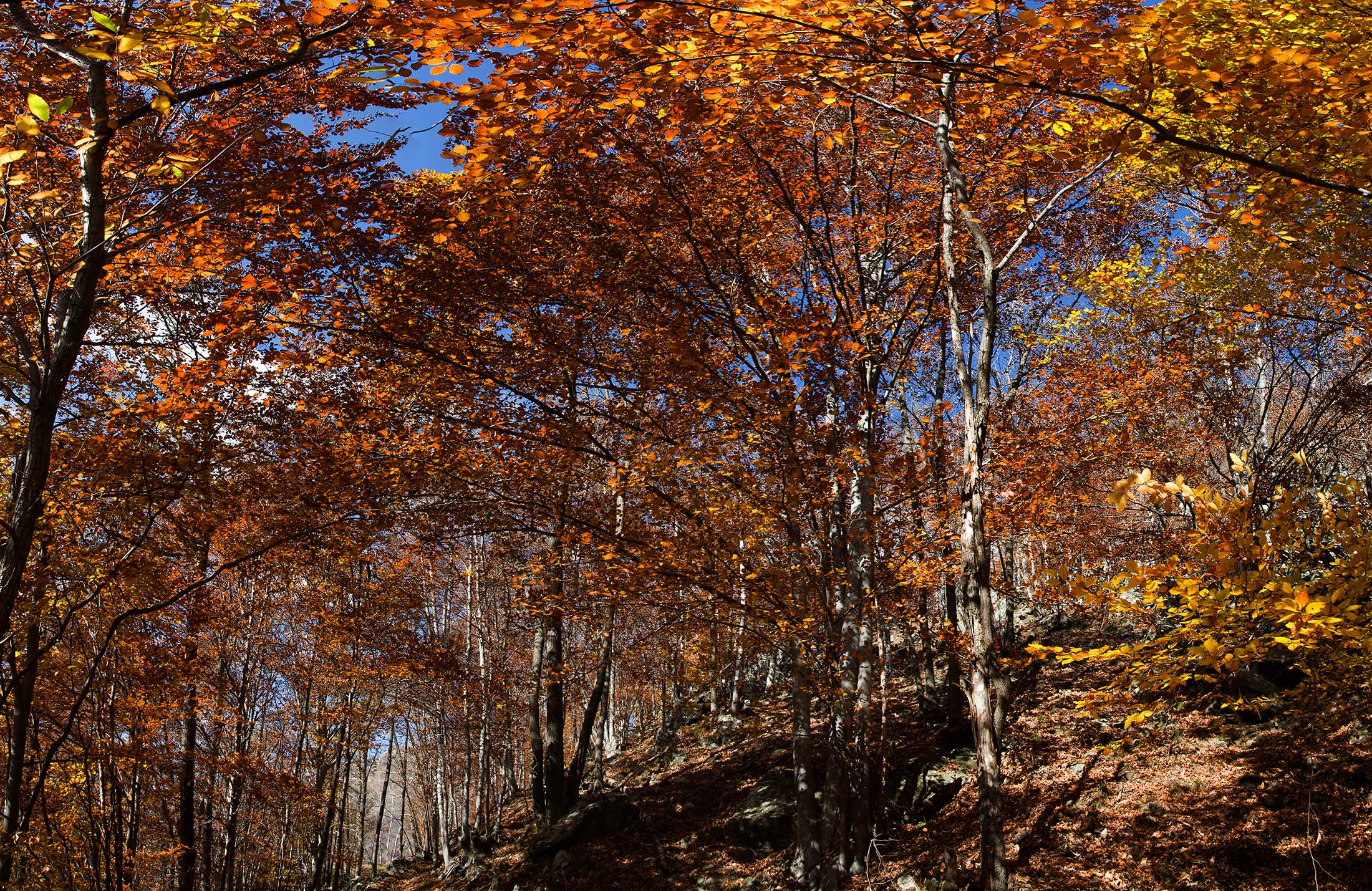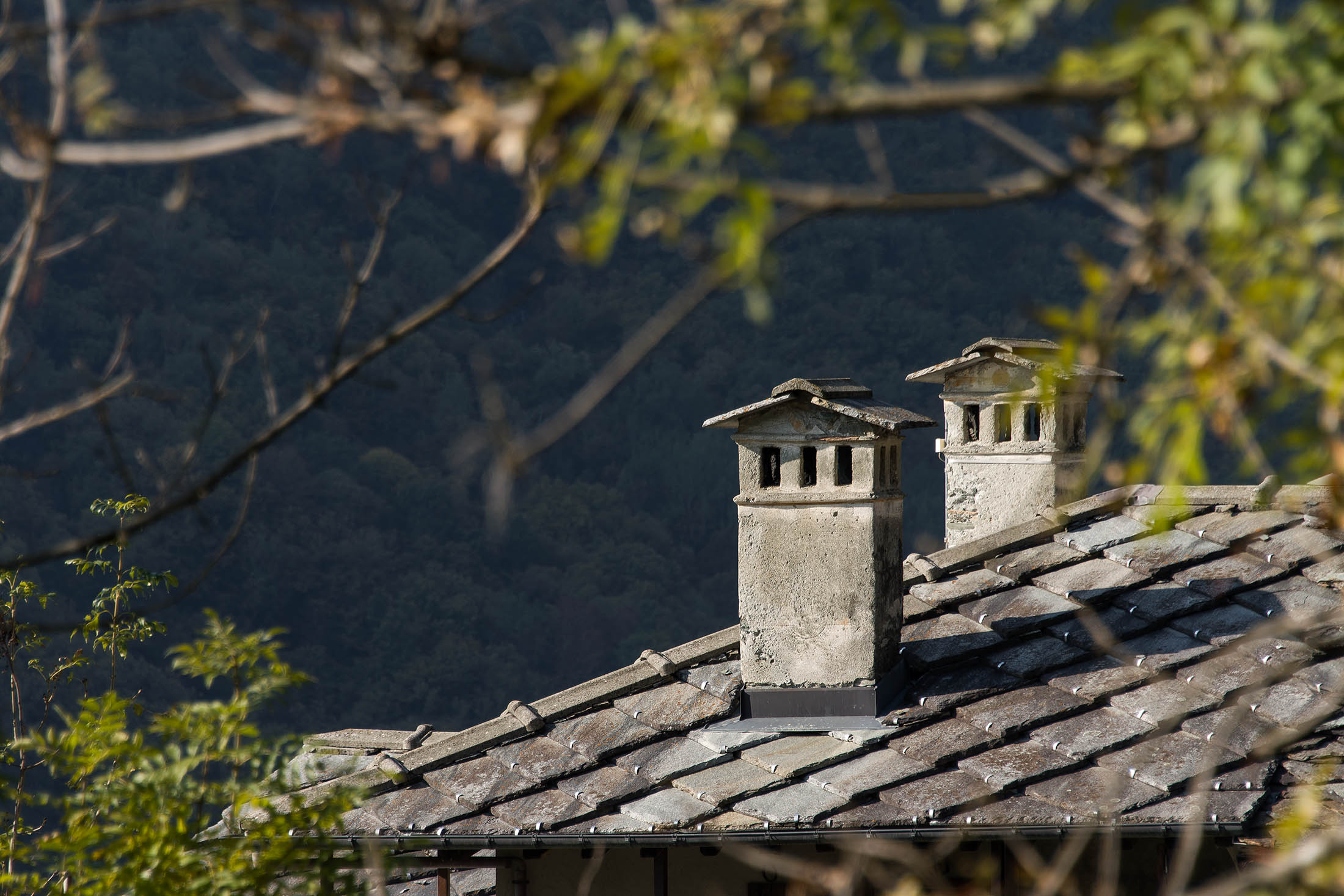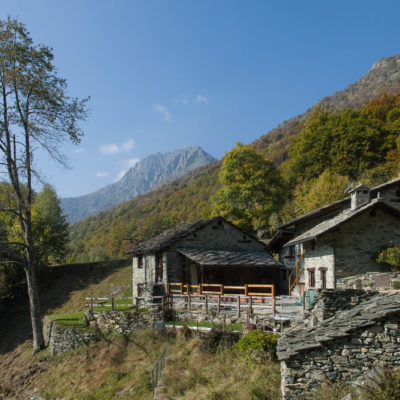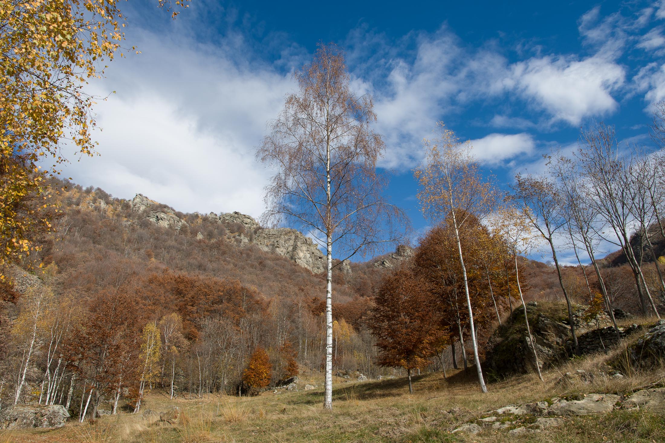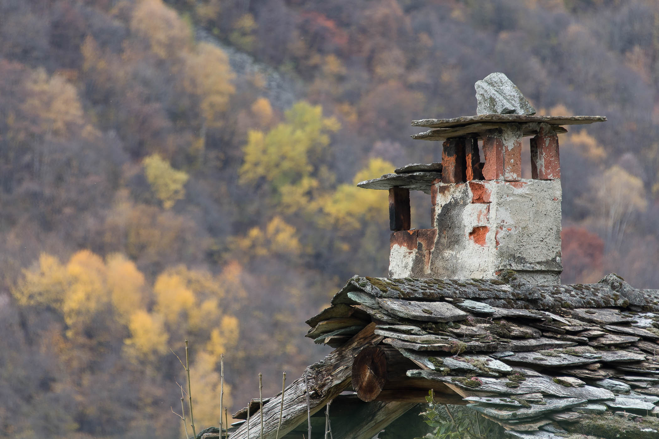 Die erste Stunde kann man gemütlich vor sich hintraben, auf einem unbefestigten Forstweg geht es zunächst durch einen Kastanienhain hinauf nach Monterosso (1090 m), ein verlassener kleiner Weiler. Eine handvoll Häuser und Ställe, die meisten davon liegen heute in Ruinen. Man blickt auf bröckelndes Gemäuer und morsche Dachbalken, dazwischen wuchern meterhoch die Brennnesseln und noch viel mehr Gestrüpp. Die Zeit ist hier stehengeblieben, nur eine kleine Madonnina und die stählernen Kreuze eines Kunsthandwerkers halten beharrlich die Stellung. Wenig später erreicht man eine grössere Lichtung, der unbefestigte Fahrweg endet bei den Hütten von Case Belfe (1146 m), eine früher in den Sommermonaten bewohnte Alpsiedlung, mit schöner Aussicht auf die Berge des Val d‘Ala. Einige der historischen Gebäude wurden vor einigen Jahren wieder aufgebaut und hübsch renoviert, sie werden heute von den Einheimischen als Wochenendhäuschen genutzt. Die traditionelle Alpwirtschaft wurde hier schon vor vielen Jahrzehnten eingestellt, die nicht mehr genutzten Weideflächen in der Umgebung verbuschen im Laufe der Zeit und werden allmählich vom Wald zurückerobert.