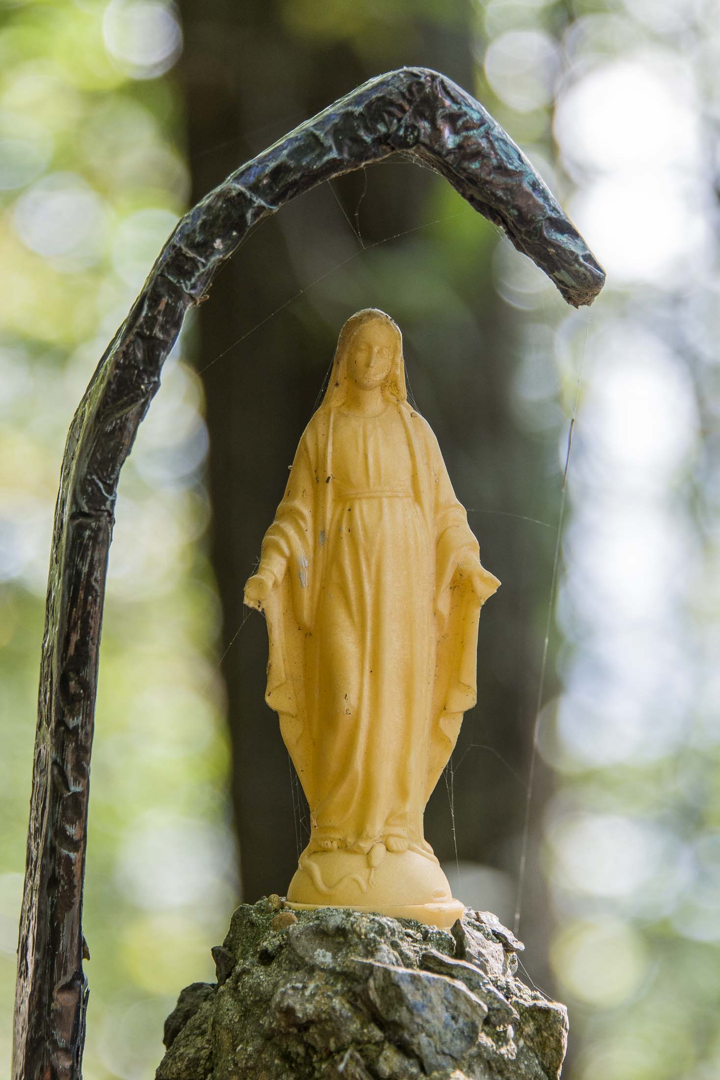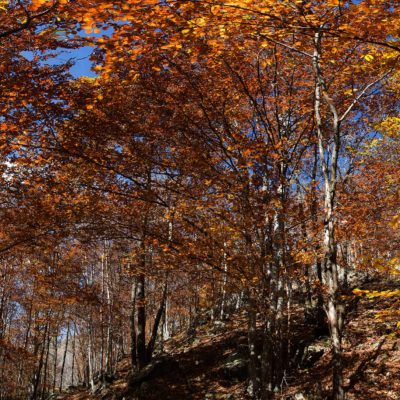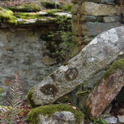 Jenseits der Hütten beginnt ein wunderschöner, teils mit Steinplatten gepflasterter alter Saumweg, der sich in leichtem Auf und Ab durch den Buchenwald schlängelt. Eine Viertelstunde später bleibt der Abzweig zur Rocca Ginepro unbeachtet. Wenig später eine weitere beschilderte Abzweigung, hier lohnt ein kurzer Abstecher nach Belmonte (1096 m), eine aufgegebene kleine Sommersiedlung, die man nach wenigen Minuten erreicht. Lost-Place-Liebhaber kommen hier ganz auf ihre Kosten, man betritt einen gottverlassenen Ort, der nur aus wenigen Häusern und Ställen besteht, die meisten davon fristen ihr unaufhaltsames Schicksal oder liegen mittlerweile danieder. Ein Blick durch eine der offenen Türen offenbart Vergängliches, zurückgelassenes Mobilar und Werkzeuge, ein hölzerner Tisch, ein alter Melkschemel, eine rostige Mistgabel, Überbleibsel aus einer längst vergangenen Zeit. Nur der Brunnen ist noch intakt und plätschert gemächlich vor sich hin, unübersehbar darauf verewigt ist die Jahreszahl 1935. Wann der Ort endgültig verlassen wurde, war nirgendwo zu erfahren. Es ist davon auszugehen, dass das erst in den Jahren nach dem zweiten Weltkrieg geschah, als die traditionelle Bergland- und Alpwirtschaft vielerorts eingestellt wurde. Meist betraf es zu allererst die besonders abgelegenen Siedlungen, die schlecht erreichbar bzw. nicht ans Strassennetz angeschlossen waren. Die Umgebung von Belmonte war früher gerodet und kultiviert, sehr auffällig sind hier die unzähligen ehemaligen, in die steilen Hänge gemauerten Ackerbauterrassen, die heute, viele Jahrzehnte nach ihrer Nutzungsaufgabe, inzwischen wiederbewaldet sind. Ein stimmungsvolles Fleckchen inmitten der Einsamkeit, es ist faszinierend und bedrückend zugleich, durch diesen nahezu verfallenen Ort zu spazieren.