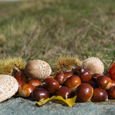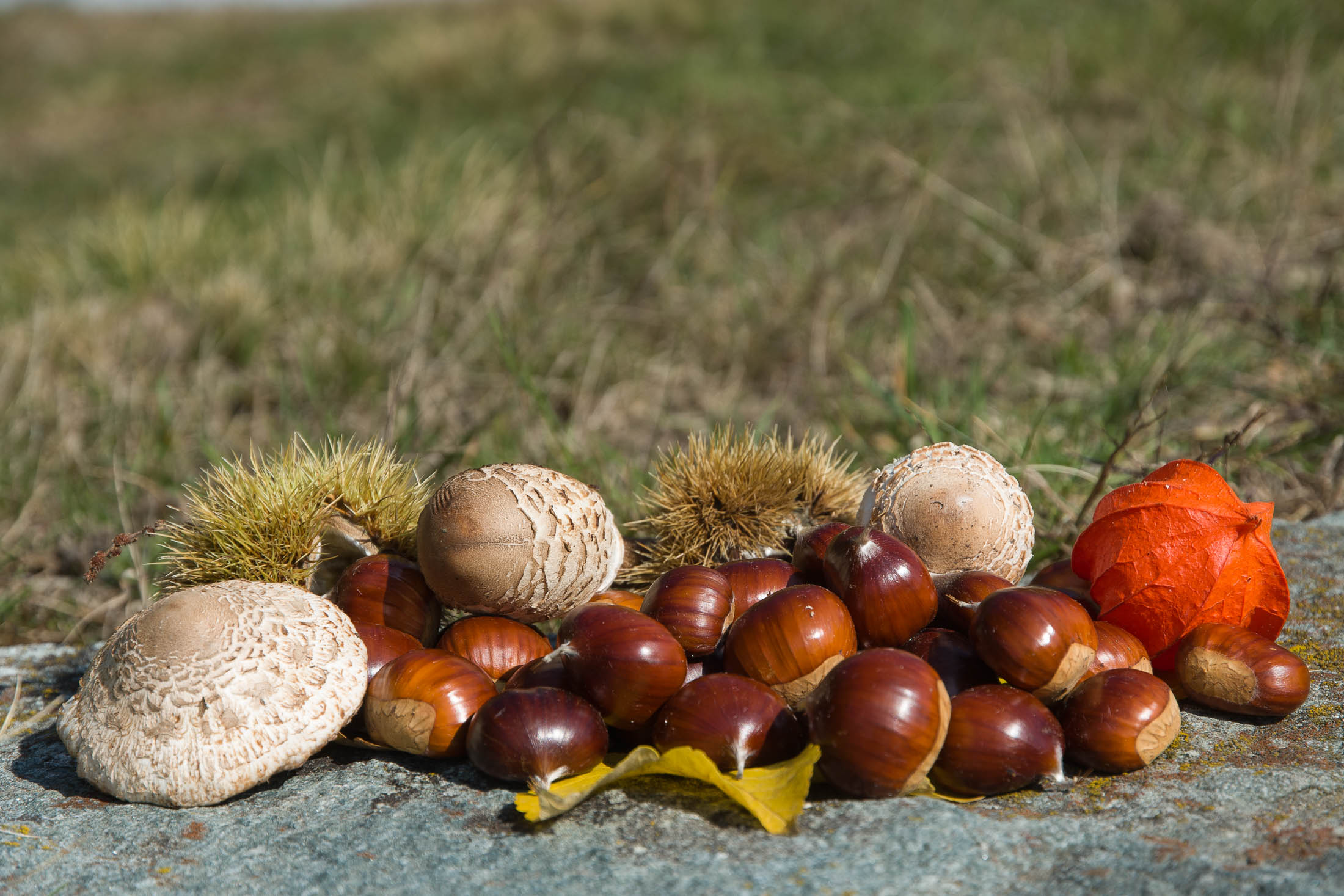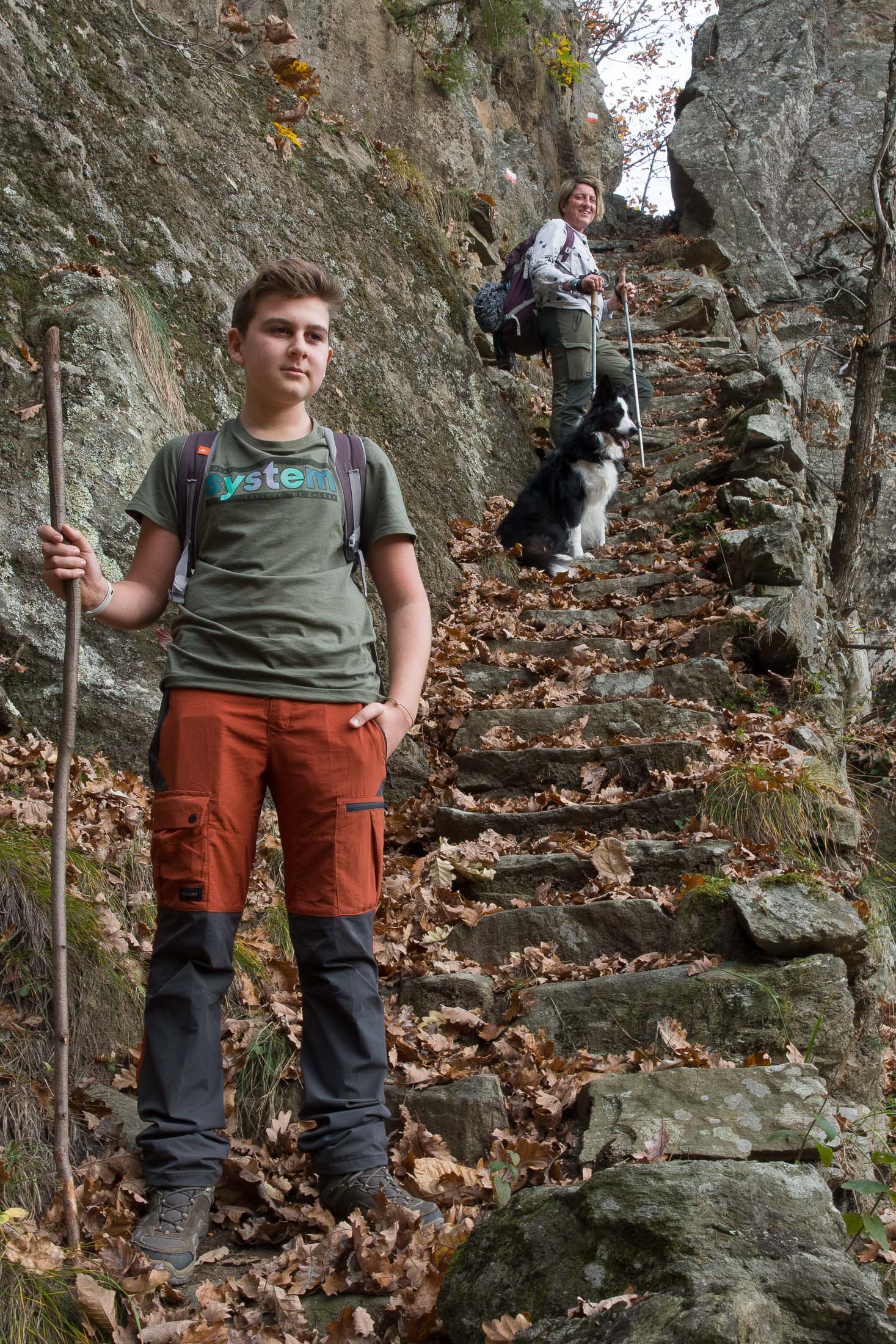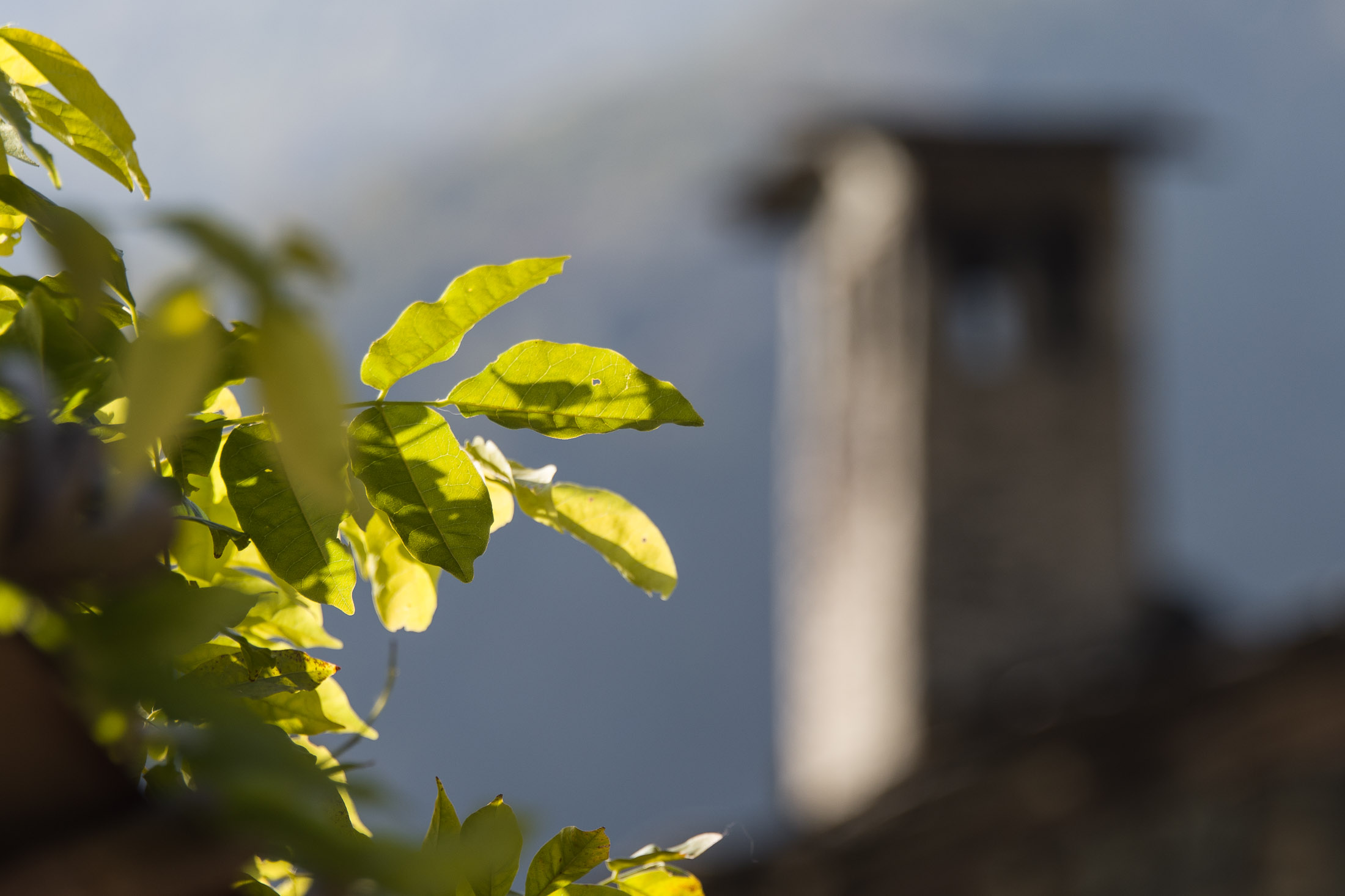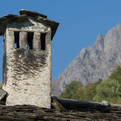 Von Belmonte geht es zunächst wieder zurück zu der erwähnten Abzweigung, der Weiterweg ist nach wie vor gut markiert und nicht zu verfehlen. Der alte Saumpfad ist jedoch nicht besonders gepflegt, einige wenige Abschnitte sind etwas mühsam, mitunter stapft man durch riesige Laubmassen. An einer Stelle sind die seitlichen Stützmauern und in der Folge der halbe Weg weggebrochen, vor allem bei Nässe ist kann es hier und da ziemlich rutschig sein. Man kommt zu einer Gedenktafel auf einem herumliegenden grossen Felsbrocken, die einem verunglückten Jäger gewidmet ist. Von dort schlängelt sich der bisweilen steile Pfad durch herrlichen Kastanienwald hinab zu den westlichen Häusern von Monti di Voragno (973 m). Eine weitere Gebäudegruppe befindet sich nur wenige Schritte entfernt, um dort hinzugelangen folgt man einfach dem grasigen breiten Fahrweg. Monti di Voragno ist eine ehemalige Temporärsiedlung auf einer grossen sonnigen Lichtung über dem unteren Val d‘Ala. Die meisten Anwesen wurden teils aufwendig renoviert und werden heute als Wochenend- oder Feriendomizil genutzt, andere wiederum sind nicht mehr bewohnt und verfallen. Man blickt auf gepflegte Gärten und gemähte Wiesen, vor den Türen und Fenstern stehen Blumentöpfe und allerlei Dekoratives. Mittendrin steht ein kleines Kirchlein mit einer recht eigenwilligen Architektur, kurzum, einfach ein wunderschöner Ort zum Entschleunigen. Bei der westlichen Gebäudegruppe von Monti di Voragno beginnt bei einem Wegweiser der verbleibende Rückweg. Nach einem kurzen Gegenanstieg überwindet der der alte Saumweg eine felsige Steilstufe im Wald auf einer kunstvoll angelegten historischen Treppe. Dann geht es kontinuierlich abwärts, hier und da ist der Pfad ein wenig überwachsen, nach etwa 45 Minuten erreicht man die grosse Wiese am östlichen Ortsrand von Bracchiello.