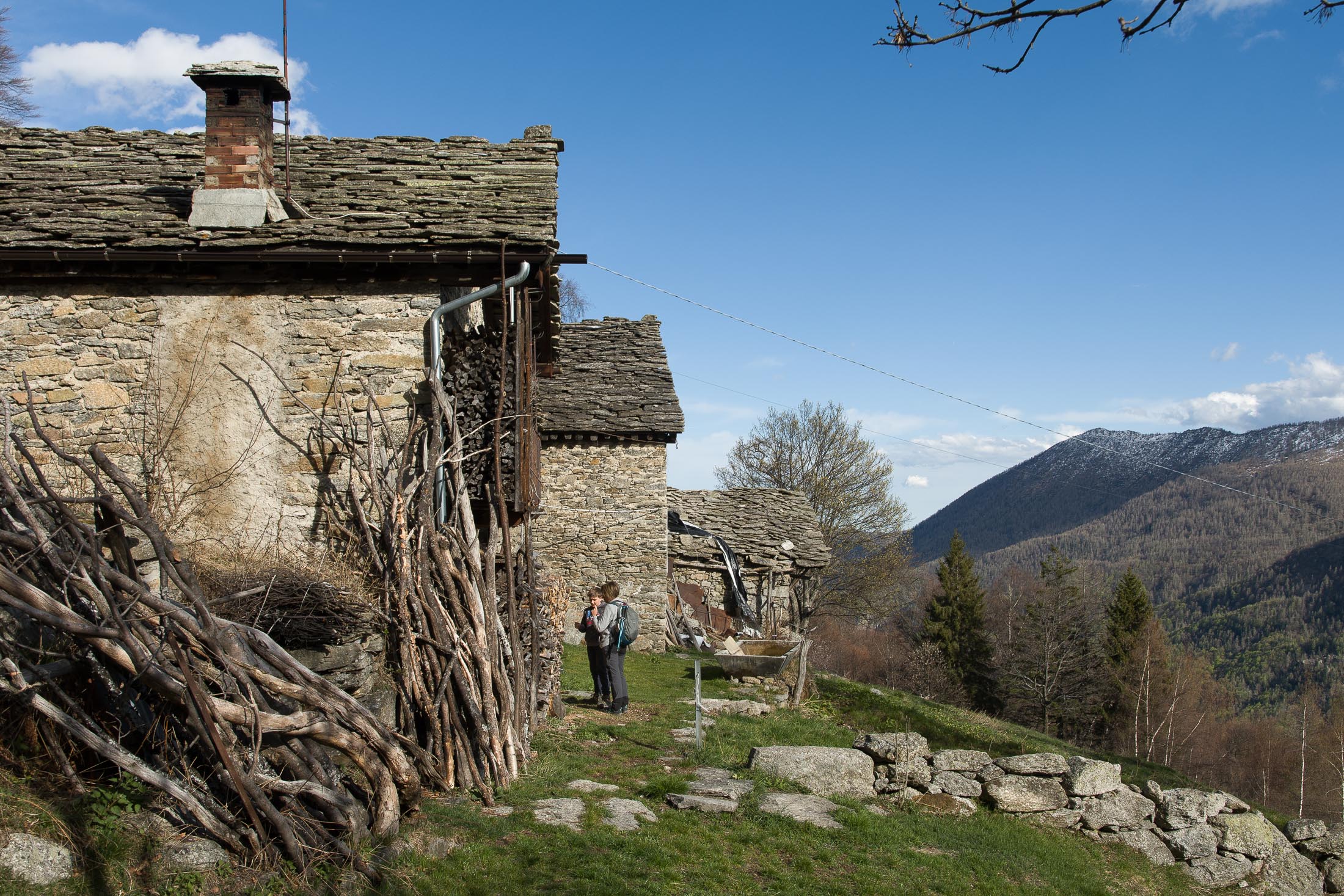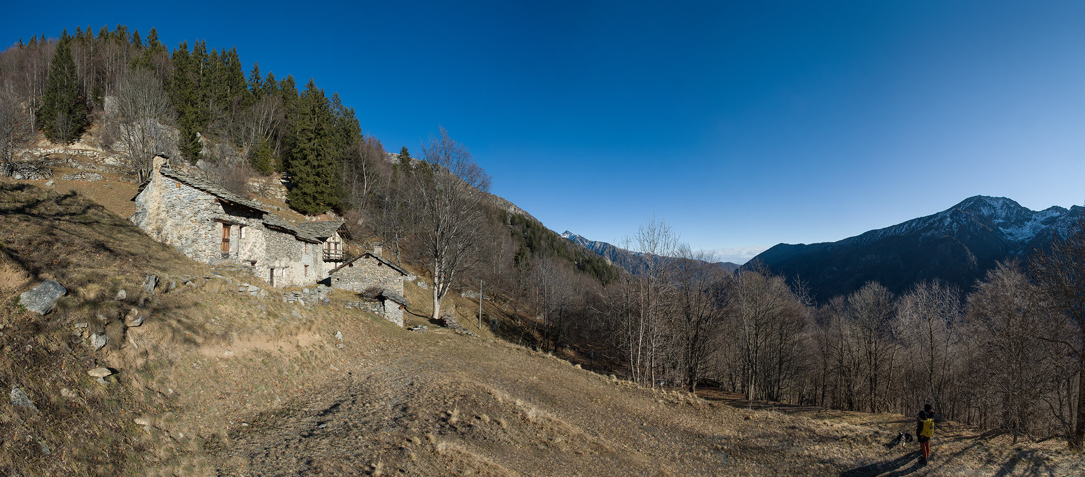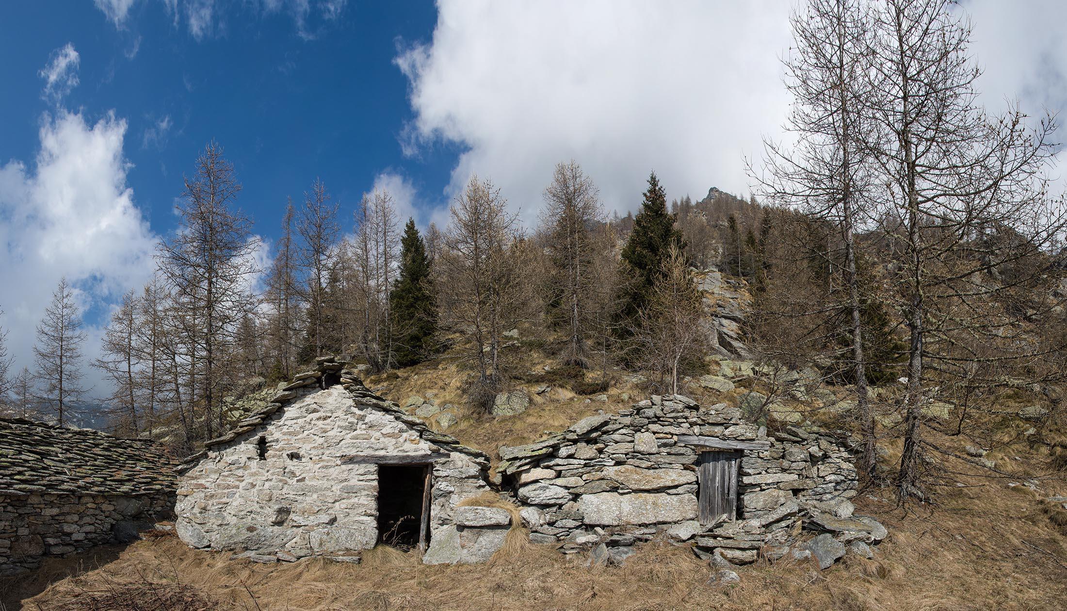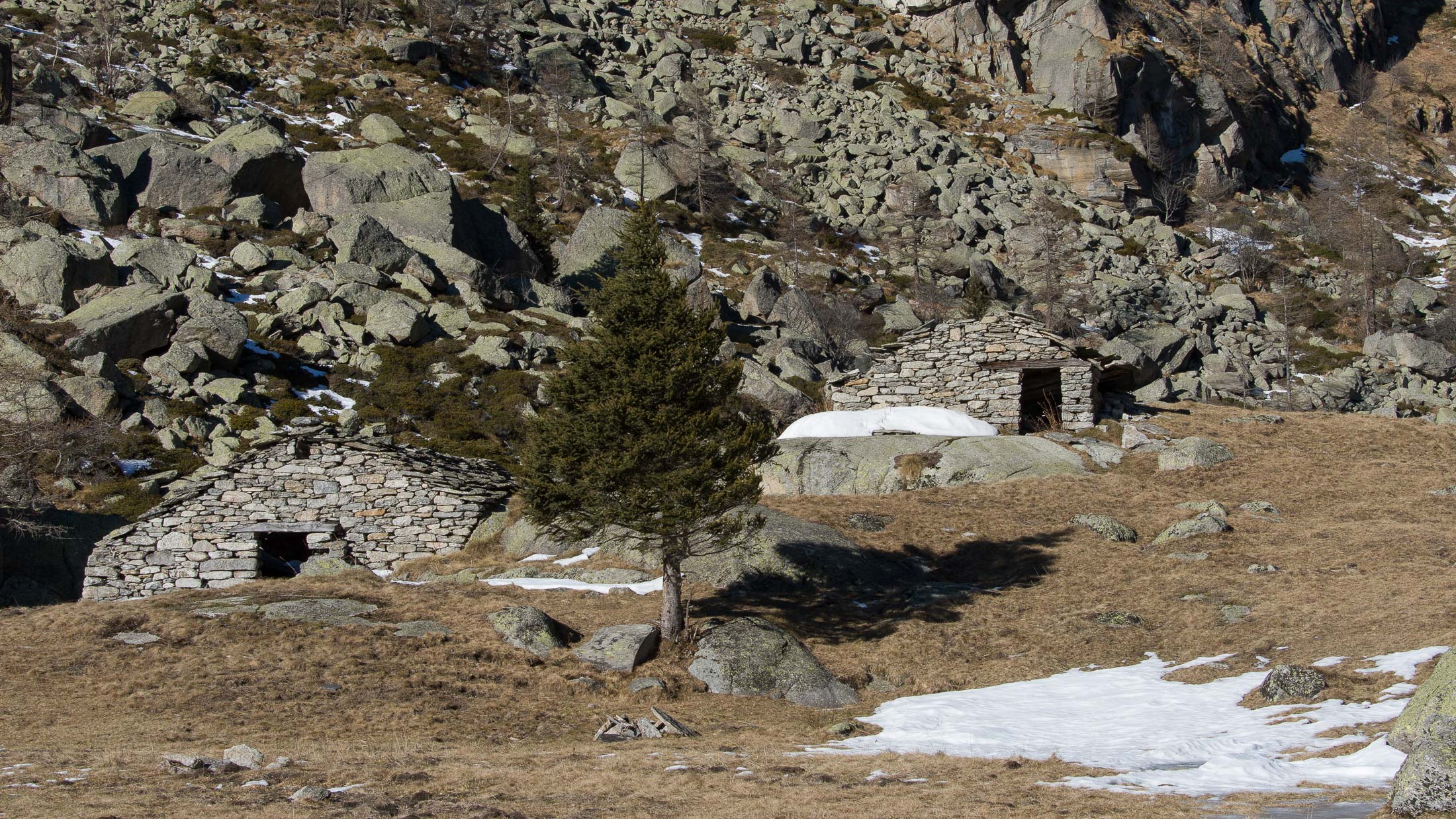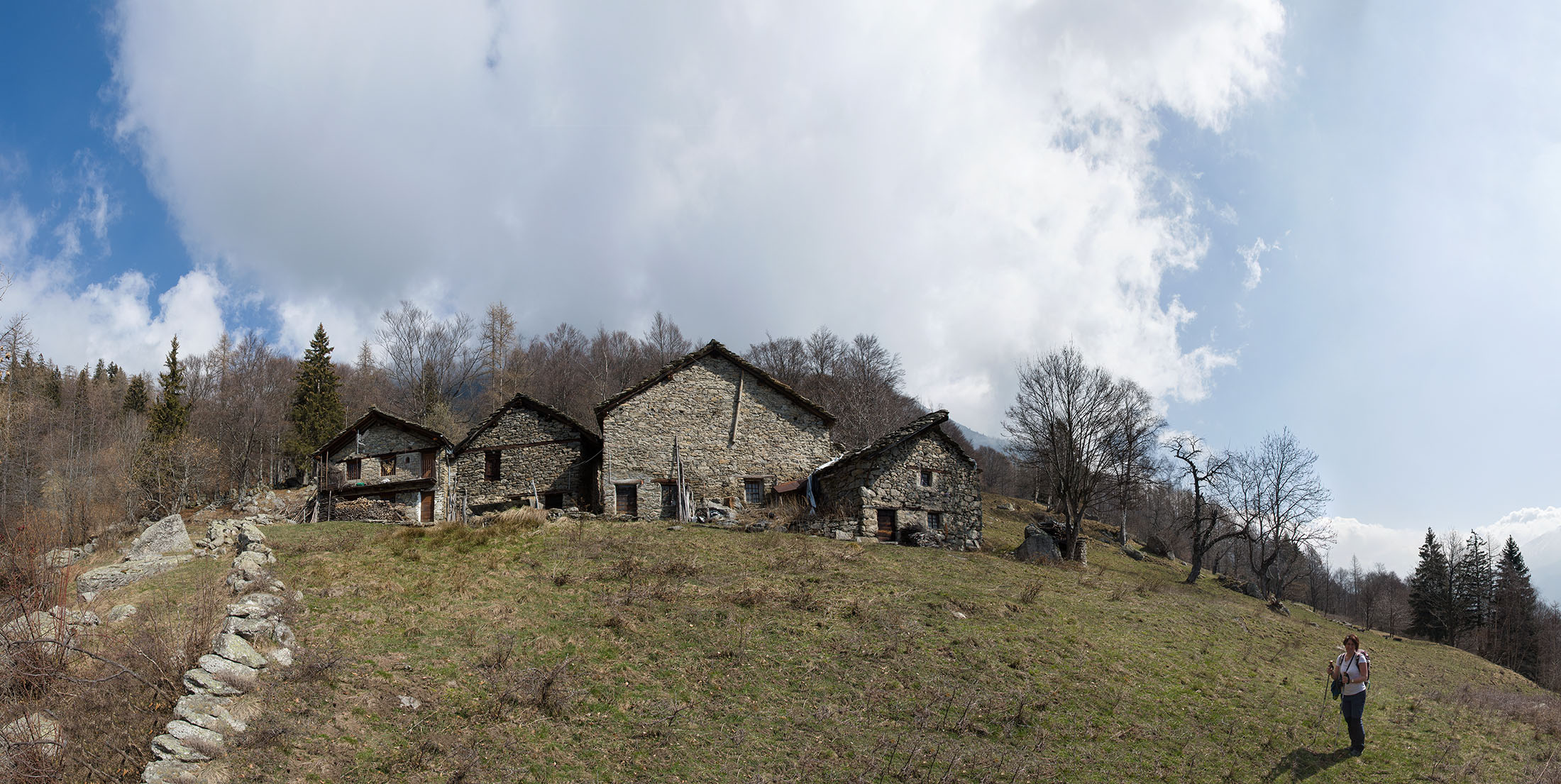 Los gehts am grossen Brunnen am ehemaligen Waschhaus am Ende der Fahrstrasse. Der ausgeschilderte Weg Richtung Mea bleibt unbeachtet, es geht den Hang hinauf, vorbei an einem einzelstehenden Haus. Nach einer Viertelstunde durch schattigen Buchenwald kommt man zu einer Lichtung, hier verlässt man den markierten Weg und geht über die Wiese zu den bereits sichtbaren Hütten von Piane di sotto (1520 m). Zwischen den alten Mauern weilt noch der gute Geist von Domenico, der hier bis zum Jahr 2020 lebte, Sommer für Sommer. Ein Urgestein der Berge, freundlich, aufgeschlossen, authentisch, leider verstarb er ein Jahr später im Alter von 87 Jahren. Die Tür ist abgeschlossen, davor liegt fein säuberlich gestapeltes Brennholz, daneben ein rostiger Eimer, an der Wand ein hölzerner Rechen. Der Brunnen plätschert wie immer friedlich vor sich hin, alles ist noch so, wie es war. Jenseits der Hütten geht es durch eine Lücke zwischen den stämmigen Buchen weiter aufwärts, weiter oben überquert man eine grosse Weide und erreicht einen unbefestigten Fahrweg. Auf diesem trabt man gemütlich weiter bis Vaccheria (1630 m), die Alpgebäude werden noch instandgehalten und genutzt. Von hier schraubt sich ein ein schöner Alpweg den Kiefernwald hinauf, dann weiter auf Treppenstufen durch eine schmale Lichtung entlang einer steilen Felswand bis zu einem Bildstock. Man erreicht einen grasigen Geländerücken (1742 m) mit verstreuten Lärchen und Birken, mittendrin ruhen ein paar verfallene Hütten und Ställe. Keiner mehr da, das einzige, was bleibt, sind die Erinnerungen, trotzdem ein lauschiges Plätzchen. Bis auf den nahen Felsbuckel sind es nur wenige Schritte, zur Belohnung gibts tolle Aussicht.
