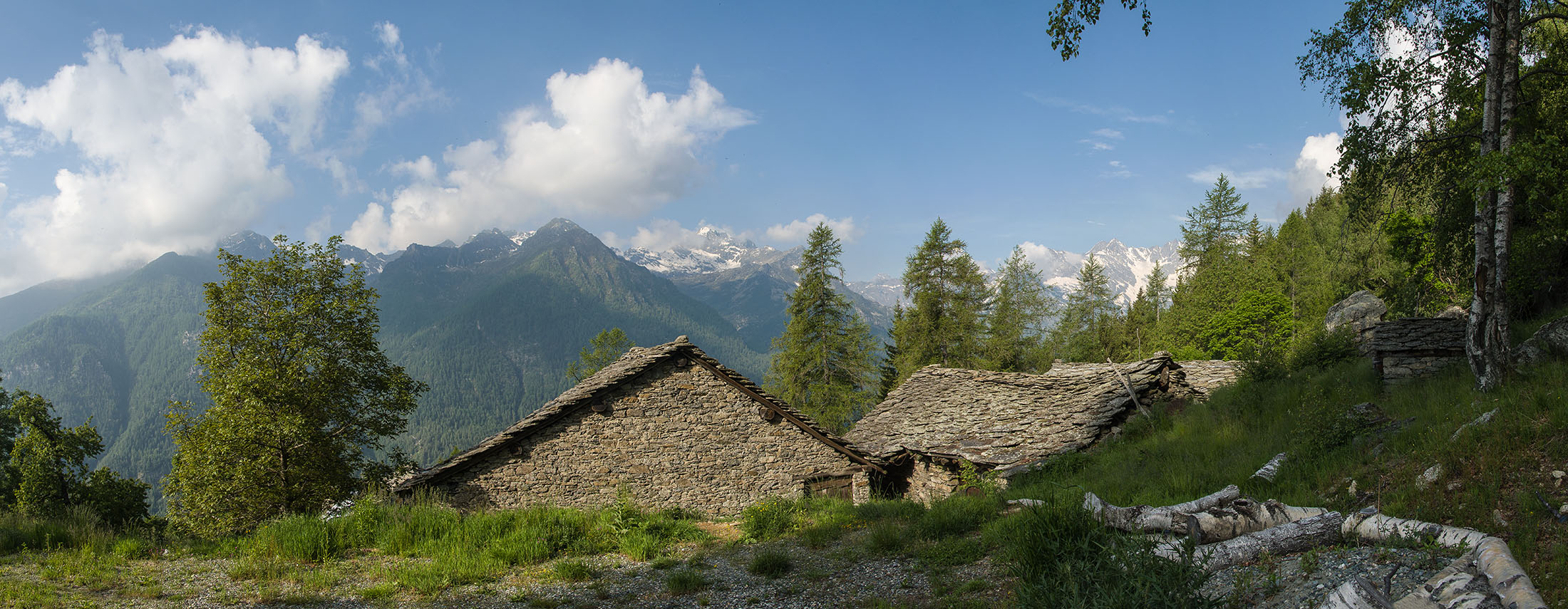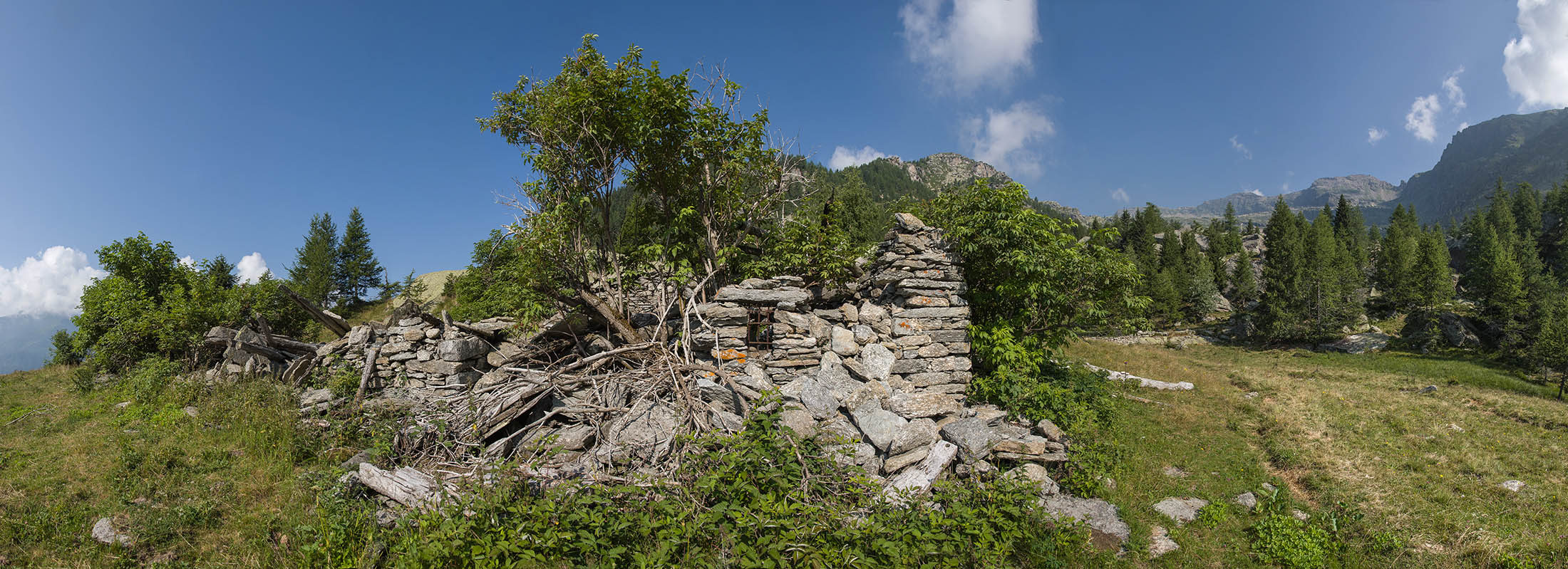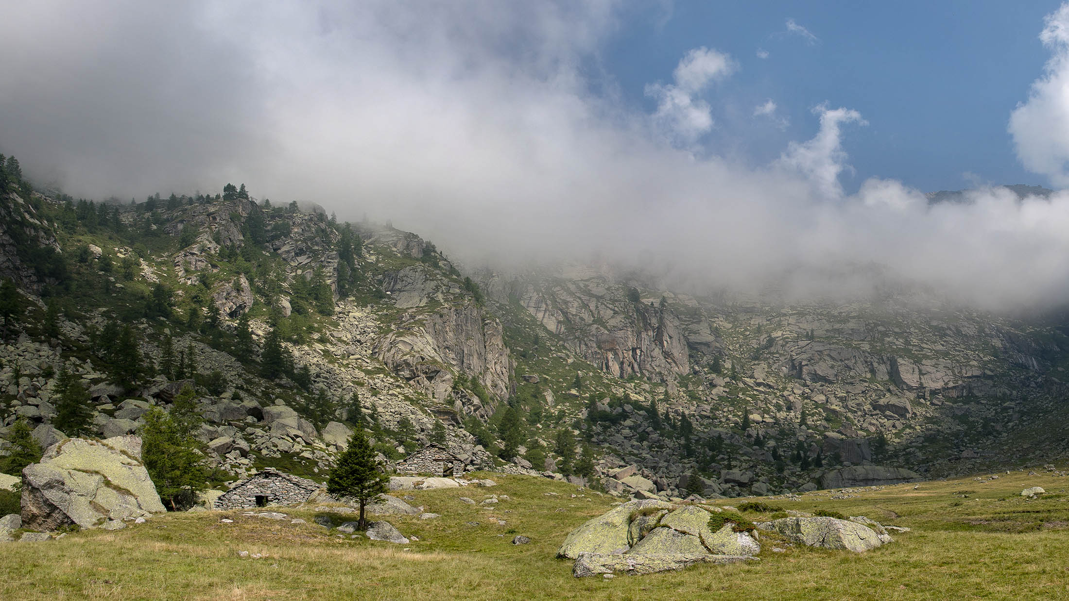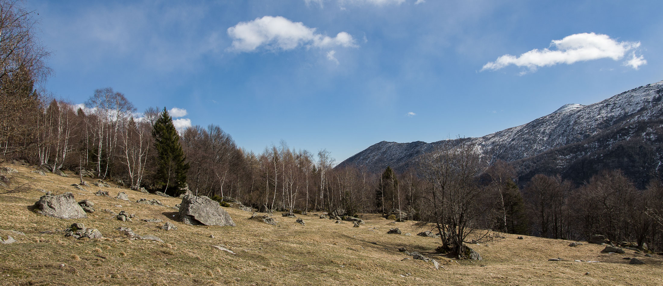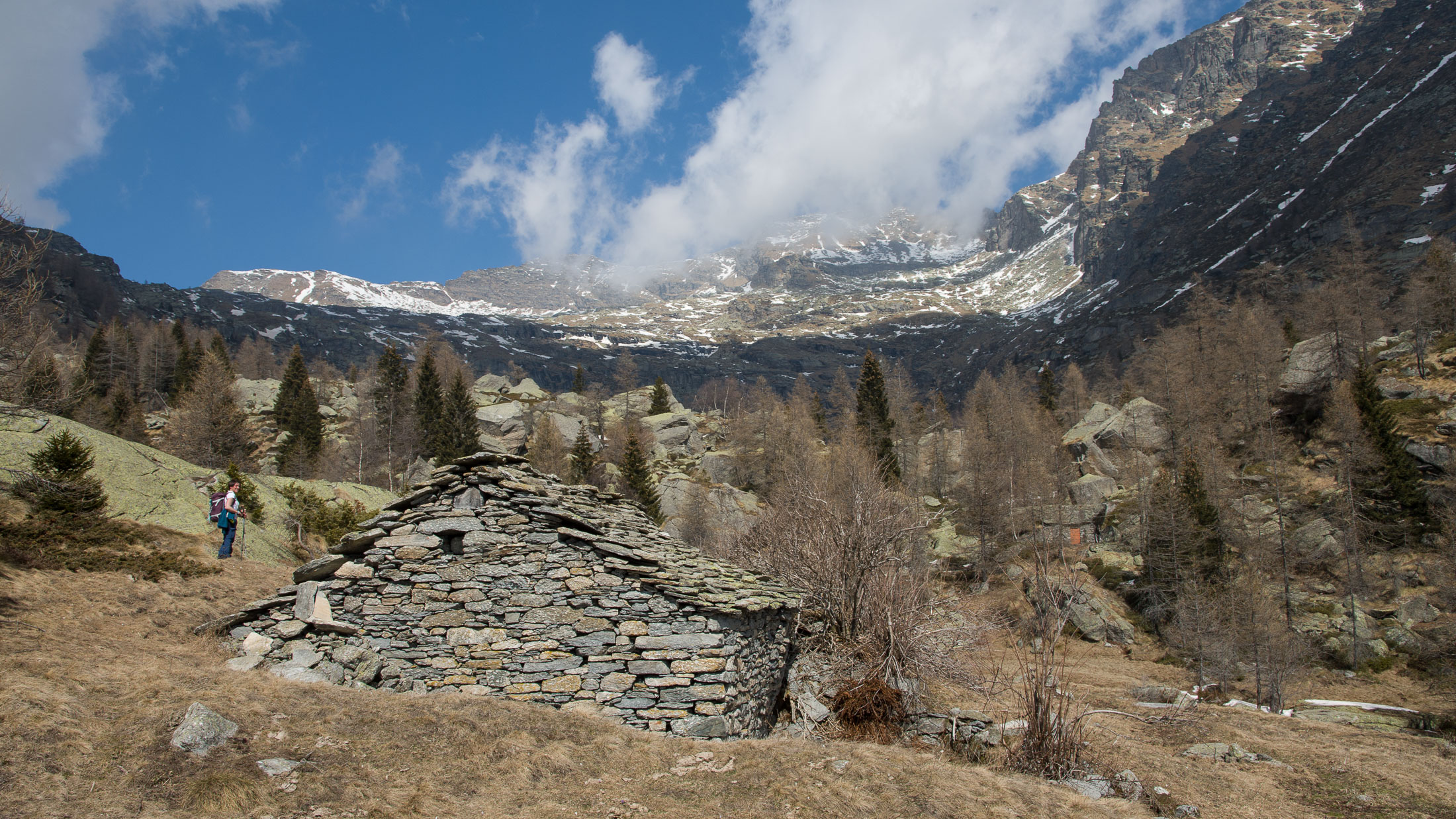 Los gehts am grossen Brunnen am ehemaligen Waschhaus am Ende der Fahrstrasse. Der ausgeschilderte Weg Richtung Mea bleibt unbeachtet, es geht den Hang hinauf, vorbei an einem einzelstehenden Haus. Nach einer Viertelstunde durch schattigen Buchenwald kommt man zu einer Lichtung, hier verlässt man den markierten Weg und geht über die Wiese zu den bereits sichtbaren Hütten von Piane di sotto (1520 m). Zwischen den alten Mauern weilt noch der gute Geist von Domenico, der hier bis zum Jahr 2020 lebte, Sommer für Sommer. Ein Urgestein der Berge, freundlich, aufgeschlossen, authentisch, leider verstarb er ein Jahr später im Alter von 87 Jahren. Die Tür ist abgeschlossen, davor liegt fein säuberlich gestapeltes Brennholz, daneben ein rostiger Eimer, an der Wand ein hölzerner Rechen. Der Brunnen plätschert wie immer friedlich vor sich hin, alles ist noch so, wie es war. Jenseits der Hütten geht es durch eine Lücke zwischen den stämmigen Buchen weiter aufwärts, weiter oben überquert man eine grosse Weide und erreicht einen unbefestigten Fahrweg. Auf diesem trabt man gemütlich weiter bis Vaccheria (1630 m), die Alpgebäude werden noch instandgehalten und genutzt. Von hier schraubt sich ein ein schöner Alpweg den Kiefernwald hinauf, dann weiter auf Treppenstufen durch eine schmale Lichtung entlang einer steilen Felswand bis zu einem Bildstock. Man erreicht einen grasigen Geländerücken (1742 m) mit verstreuten Lärchen und Birken, mittendrin ruhen ein paar verfallene Hütten und Ställe. Keiner mehr da, das einzige, was bleibt, sind die Erinnerungen, trotzdem ein lauschiges Plätzchen. Bis auf den nahen Felsbuckel sind es nur wenige Schritte, zur Belohnung gibts tolle Aussicht.