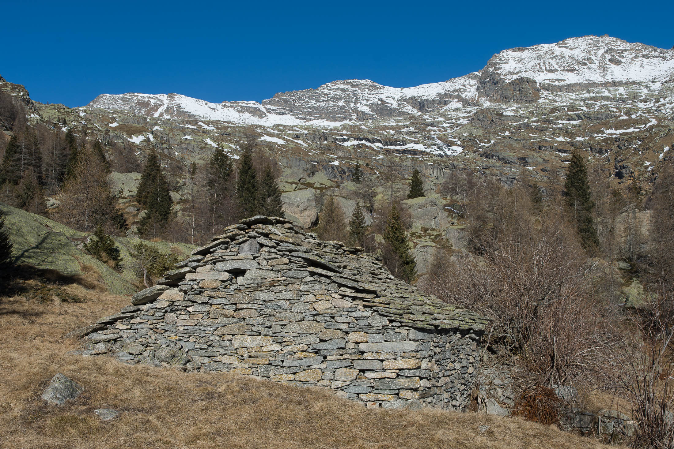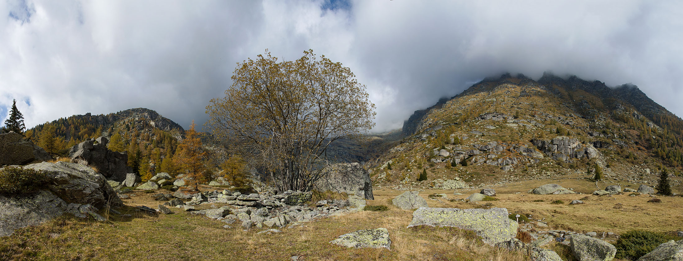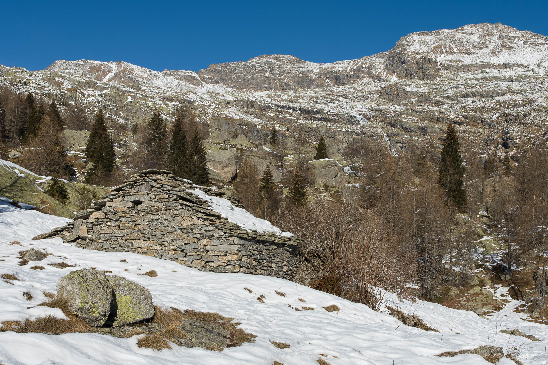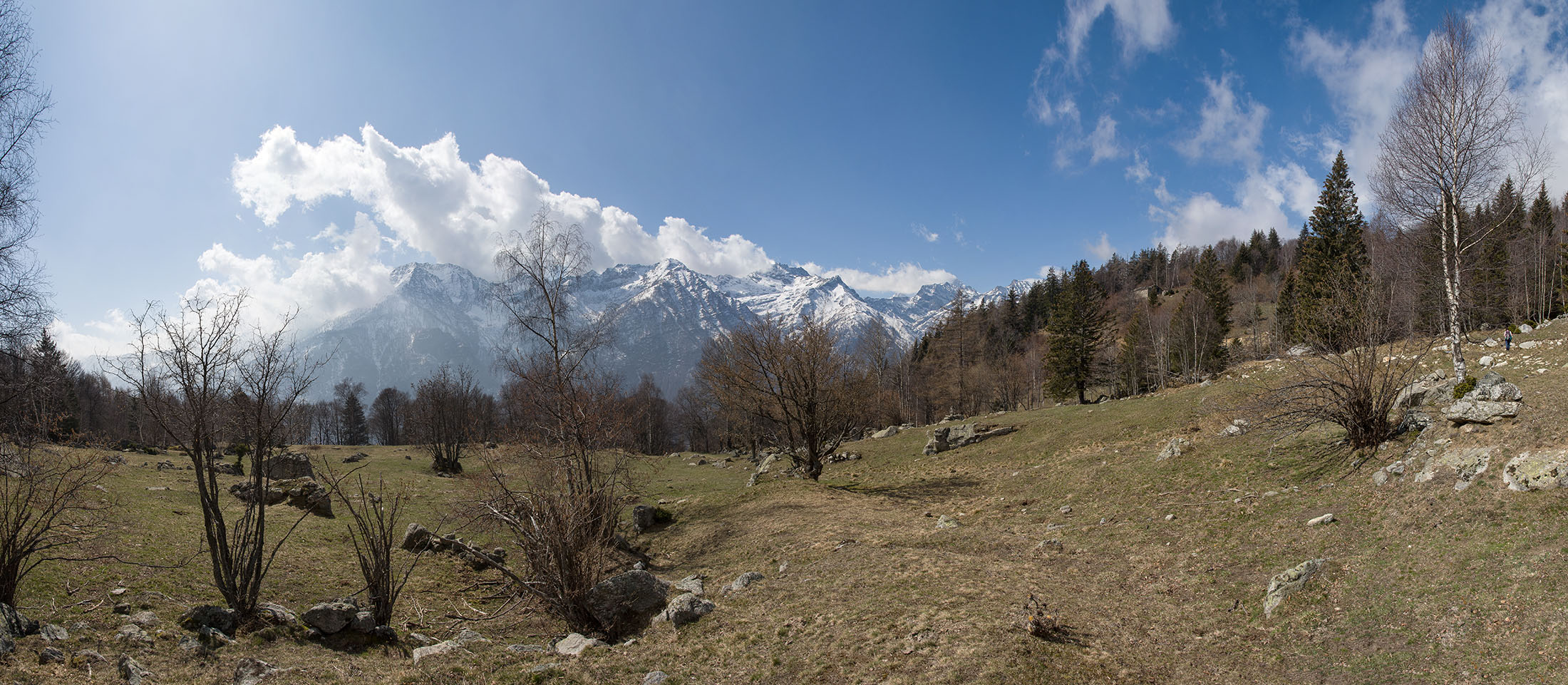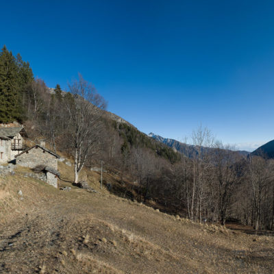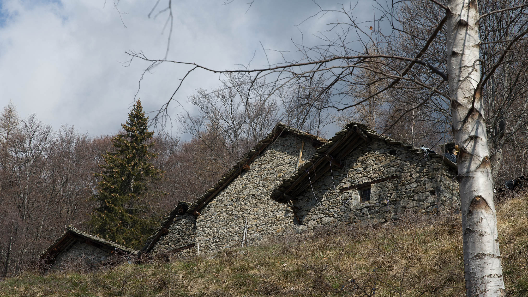 Los gehts am grossen Brunnen am ehemaligen Waschhaus am Ende der Fahrstrasse. Der ausgeschilderte Weg Richtung Mea bleibt unbeachtet, es geht den Hang hinauf, vorbei an einem einzelstehenden Haus. Nach einer Viertelstunde durch schattigen Buchenwald kommt man zu einer Lichtung, hier verlässt man den markierten Weg und geht über die Wiese zu den bereits sichtbaren Hütten von Piane di sotto (1520 m). Zwischen den alten Mauern weilt noch der gute Geist von Domenico, der hier bis zum Jahr 2020 lebte, Sommer für Sommer. Ein Urgestein der Berge, freundlich, aufgeschlossen, authentisch, leider verstarb er ein Jahr später im Alter von 87 Jahren. Die Tür ist abgeschlossen, davor liegt fein säuberlich gestapeltes Brennholz, daneben ein rostiger Eimer, an der Wand ein hölzerner Rechen. Der Brunnen plätschert wie immer friedlich vor sich hin, alles ist noch so, wie es war. Jenseits der Hütten geht es durch eine Lücke zwischen den stämmigen Buchen weiter aufwärts, weiter oben überquert man eine grosse Weide und erreicht einen unbefestigten Fahrweg. Auf diesem trabt man gemütlich weiter bis Vaccheria (1630 m), die Alpgebäude werden noch instandgehalten und genutzt. Von hier schraubt sich ein ein schöner Alpweg den Kiefernwald hinauf, dann weiter auf Treppenstufen durch eine schmale Lichtung entlang einer steilen Felswand bis zu einem Bildstock. Man erreicht einen grasigen Geländerücken (1742 m) mit verstreuten Lärchen und Birken, mittendrin ruhen ein paar verfallene Hütten und Ställe. Keiner mehr da, das einzige, was bleibt, sind die Erinnerungen, trotzdem ein lauschiges Plätzchen. Bis auf den nahen Felsbuckel sind es nur wenige Schritte, zur Belohnung gibts tolle Aussicht.