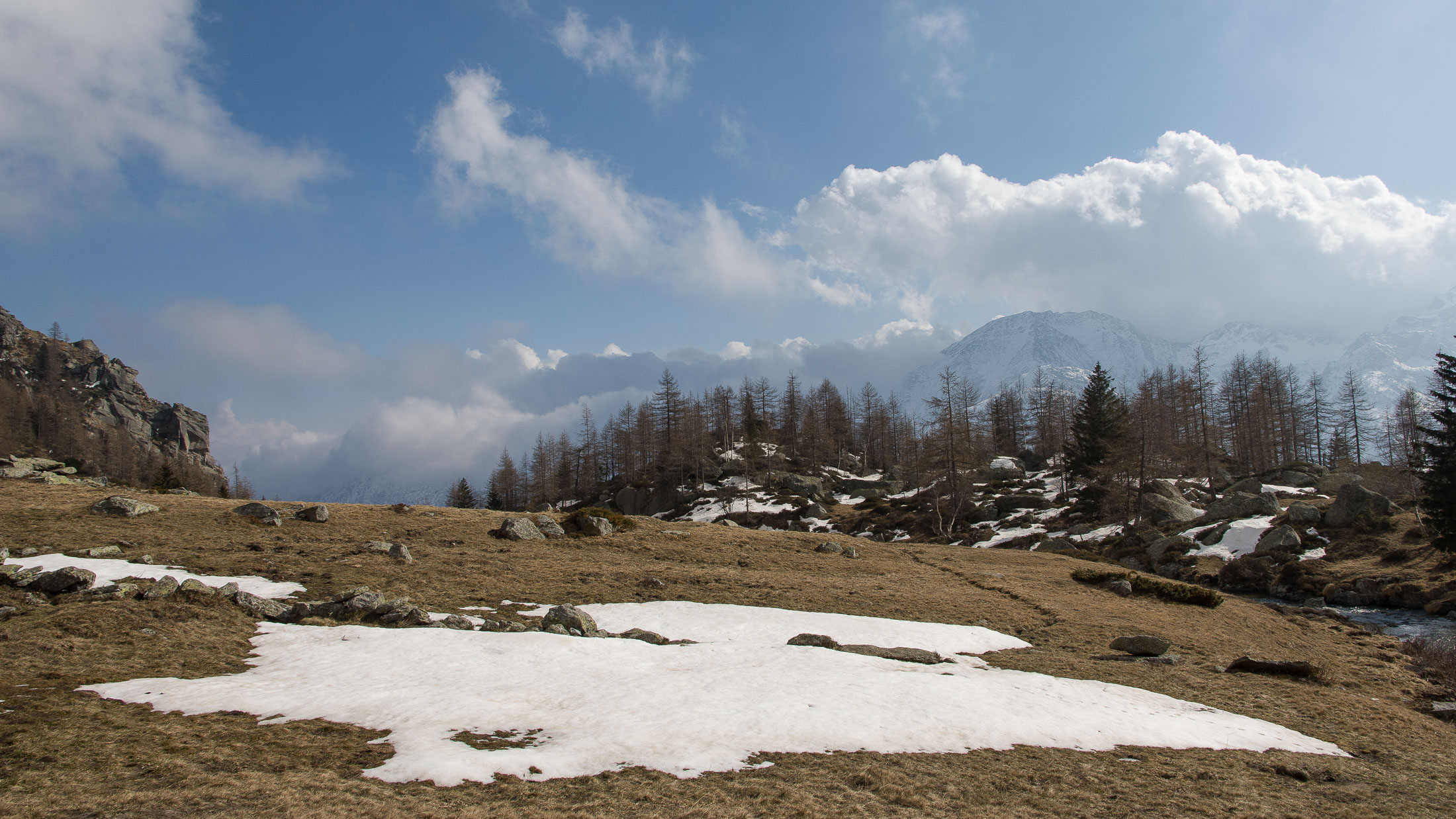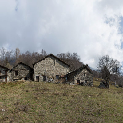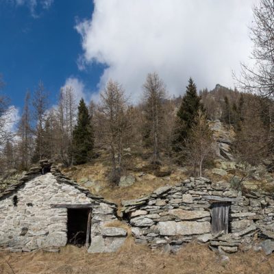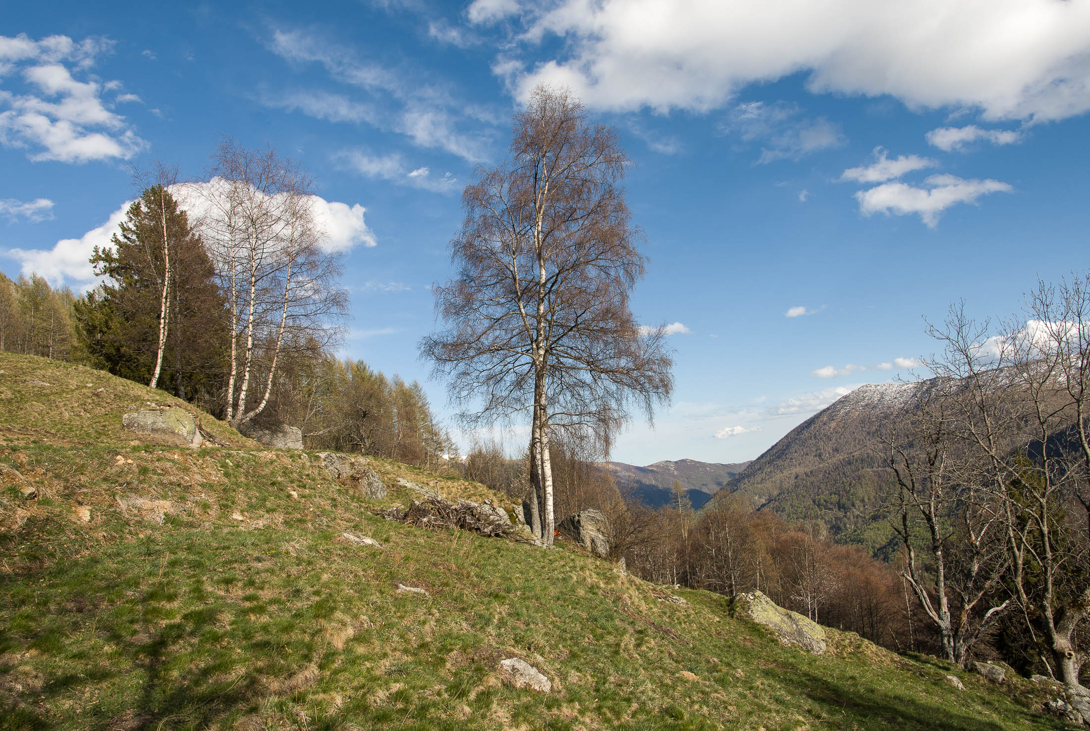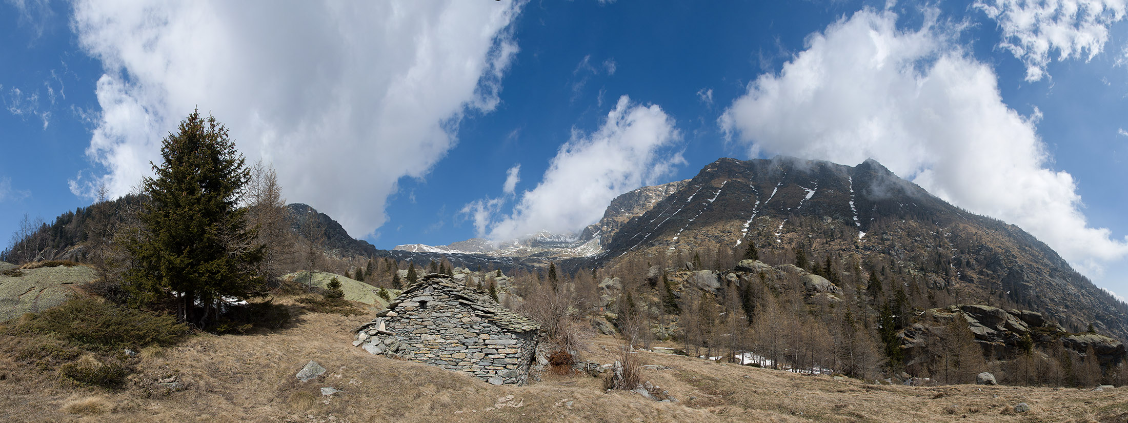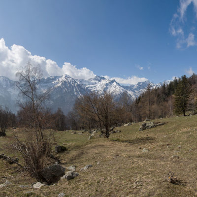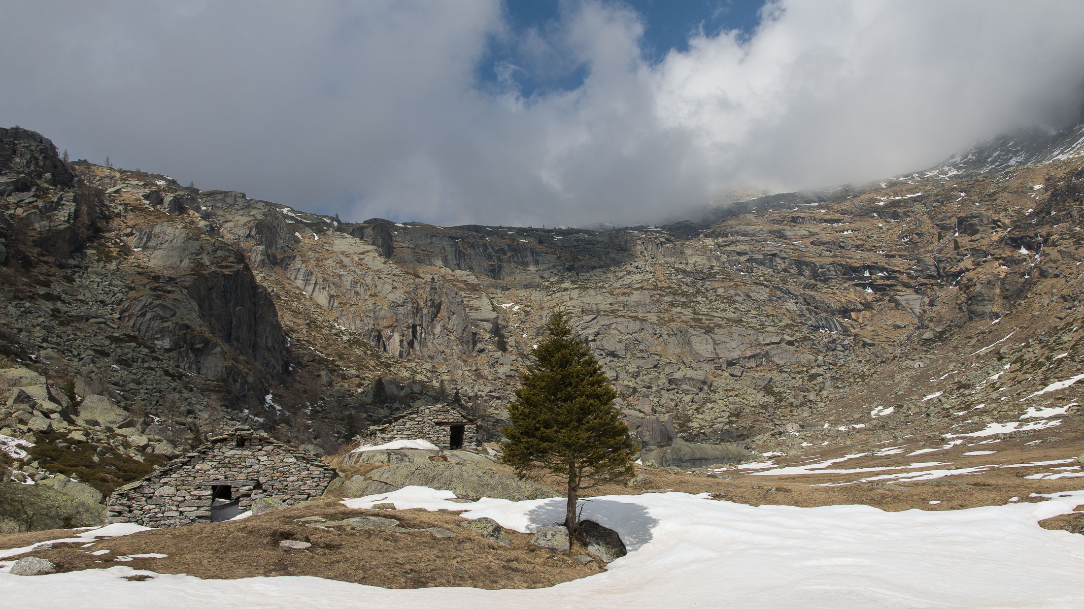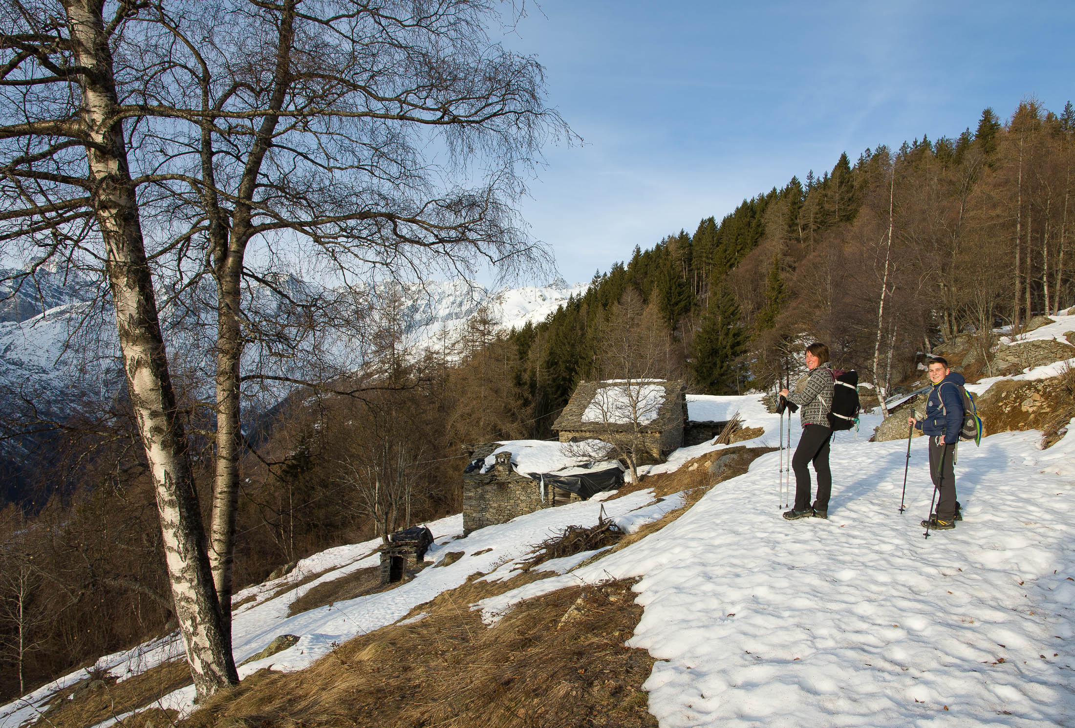 Los gehts am grossen Brunnen am ehemaligen Waschhaus am Ende der Fahrstrasse. Der ausgeschilderte Weg Richtung Mea bleibt unbeachtet, es geht den Hang hinauf, vorbei an einem einzelstehenden Haus. Nach einer Viertelstunde durch schattigen Buchenwald kommt man zu einer Lichtung, hier verlässt man den markierten Weg und geht über die Wiese zu den bereits sichtbaren Hütten von Piane di sotto (1520 m). Zwischen den alten Mauern weilt noch der gute Geist von Domenico, der hier bis zum Jahr 2020 lebte, Sommer für Sommer. Ein Urgestein der Berge, freundlich, aufgeschlossen, authentisch, leider verstarb er ein Jahr später im Alter von 87 Jahren. Die Tür ist abgeschlossen, davor liegt fein säuberlich gestapeltes Brennholz, daneben ein rostiger Eimer, an der Wand ein hölzerner Rechen. Der Brunnen plätschert wie immer friedlich vor sich hin, alles ist noch so, wie es war. Jenseits der Hütten geht es durch eine Lücke zwischen den stämmigen Buchen weiter aufwärts, weiter oben überquert man eine grosse Weide und erreicht einen unbefestigten Fahrweg. Auf diesem trabt man gemütlich weiter bis Vaccheria (1630 m), die Alpgebäude werden noch instandgehalten und genutzt. Von hier schraubt sich ein ein schöner Alpweg den Kiefernwald hinauf, dann weiter auf Treppenstufen durch eine schmale Lichtung entlang einer steilen Felswand bis zu einem Bildstock. Man erreicht einen grasigen Geländerücken (1742 m) mit verstreuten Lärchen und Birken, mittendrin ruhen ein paar verfallene Hütten und Ställe. Keiner mehr da, das einzige, was bleibt, sind die Erinnerungen, trotzdem ein lauschiges Plätzchen. Bis auf den nahen Felsbuckel sind es nur wenige Schritte, zur Belohnung gibts tolle Aussicht.